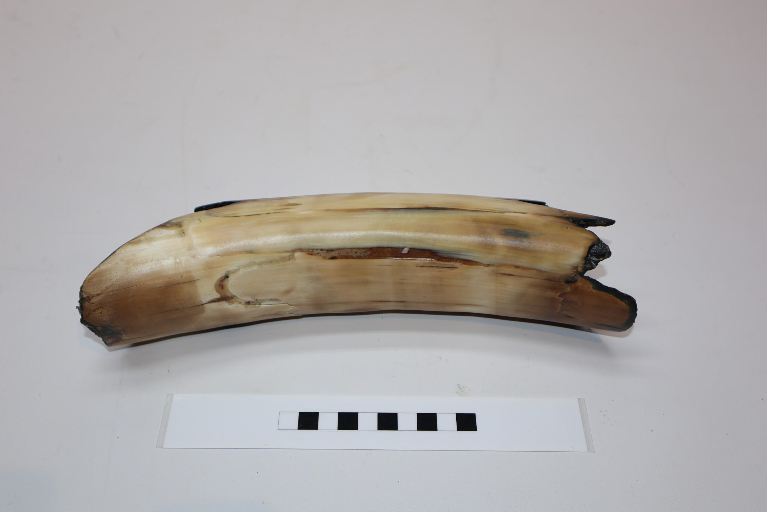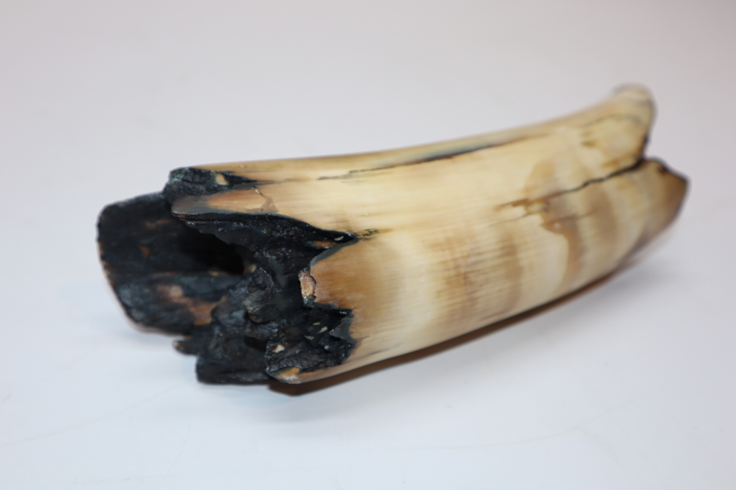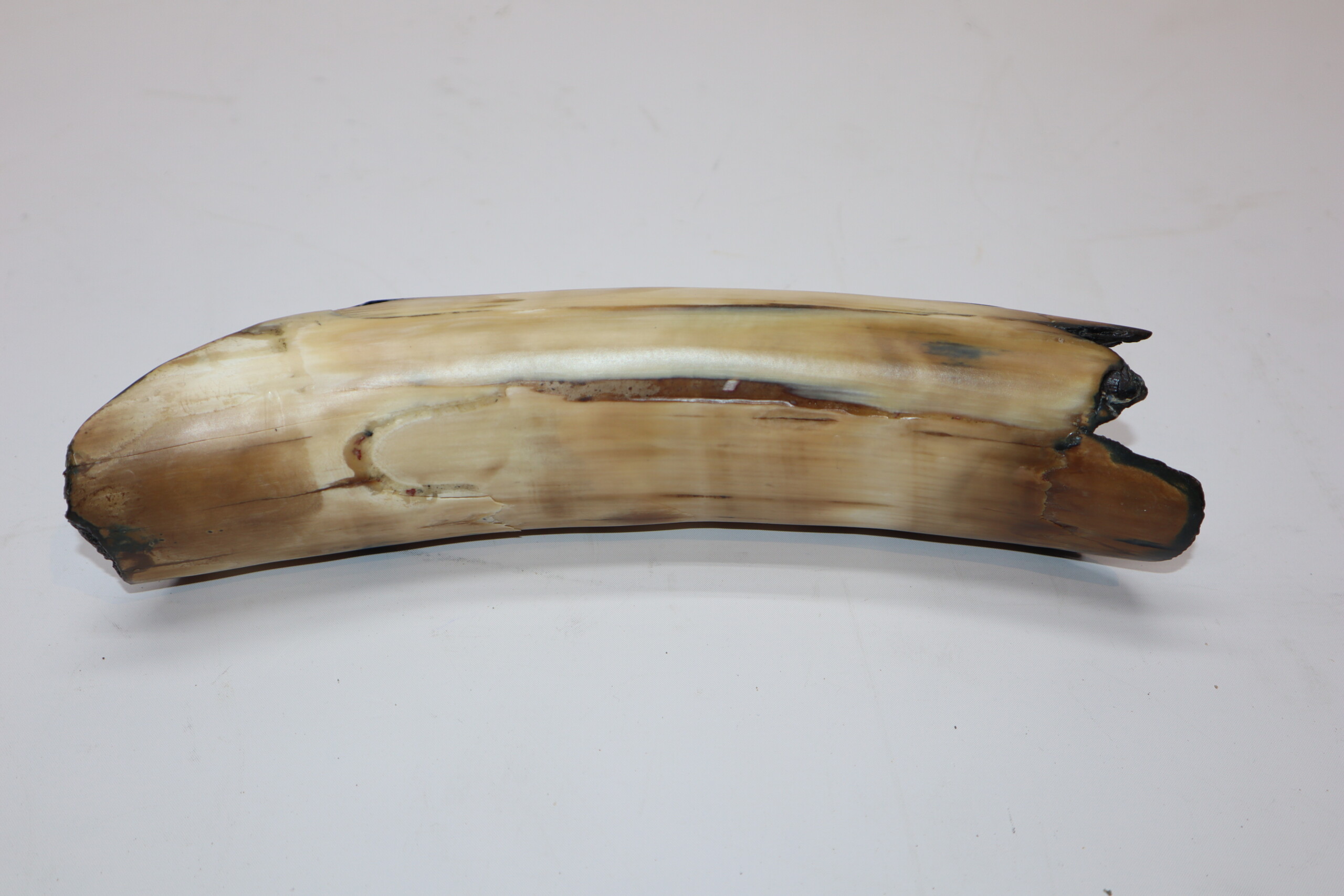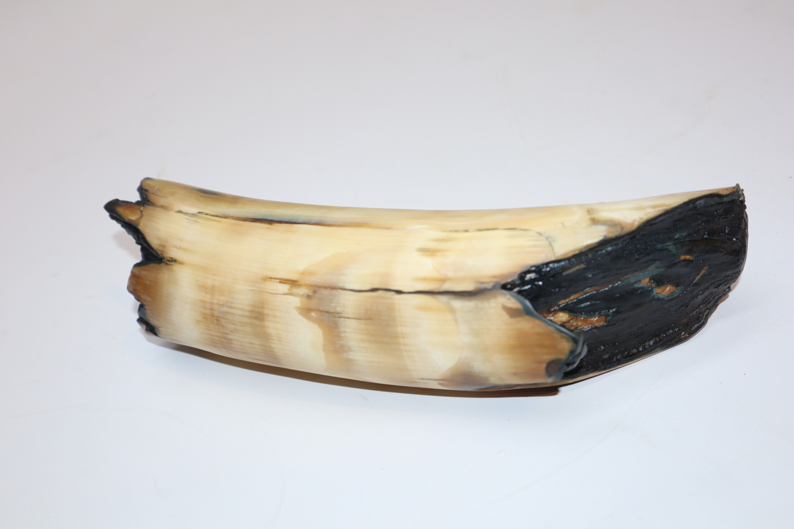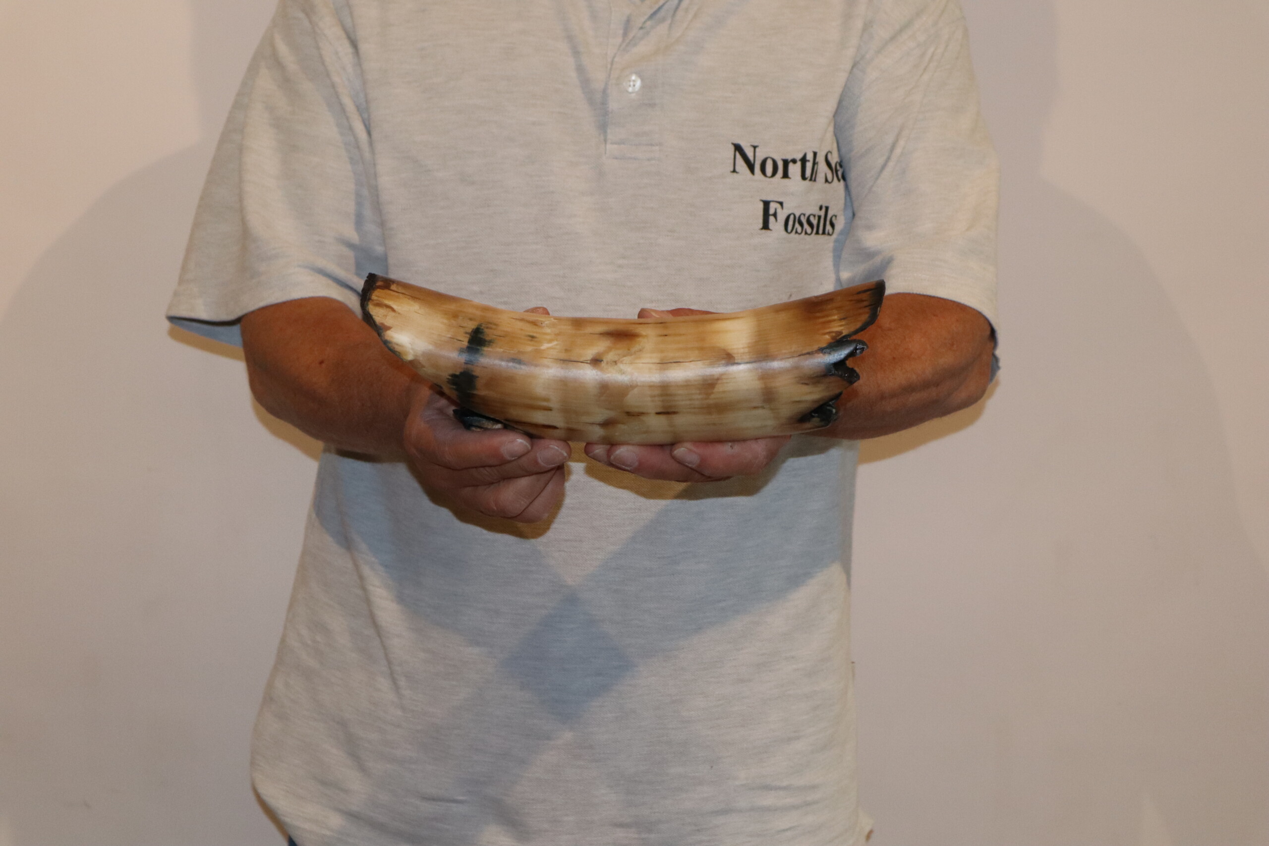 On offer is a gorgeous piece of tusk of a Woolly Mammoth from the Pleistocene era. This is the middle part of the tusk, the base and tip are missing, but otherwise it is in excellent state of preservation, as seen in the images. No restoration whatsoever. This tusk piece is of beautiful colouring of white, gold and grey ivory and beautiful contrasts of colour. The black and white section of the ruler in the image represents 10 cm / 3.9 inch. Judging from the circumference, this would have belonged to a female Mammoth. This piece has been applied with a matt finish, but it is also possible to order it with a glossy finish.