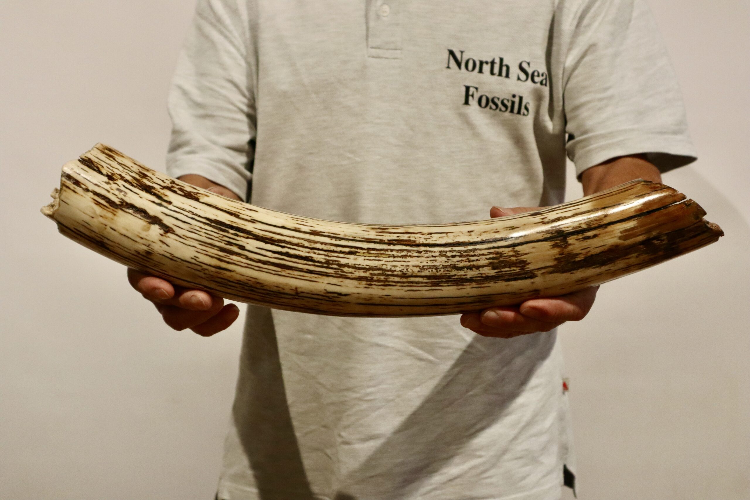 On offer is a gorgeous piece of tusk of a Woolly Mammoth from the Pleistocene era. This is the middle part of the tusk, the base and tip are missing, but otherwise it is in excellent state of preservation, as seen in the images. No restoration whatsoever. This tusk piece is of beautiful colouring of white, gold and grey ivory and beautiful contrasts of colour and patterning. The black and white section of the ruler in the image represents 10 cm / 3.9 inch. Judging from the circumference, this would have belonged to a female Mammoth. This piece has been applied with a matt finish, but it is also possible to order it with a glossy finish.
