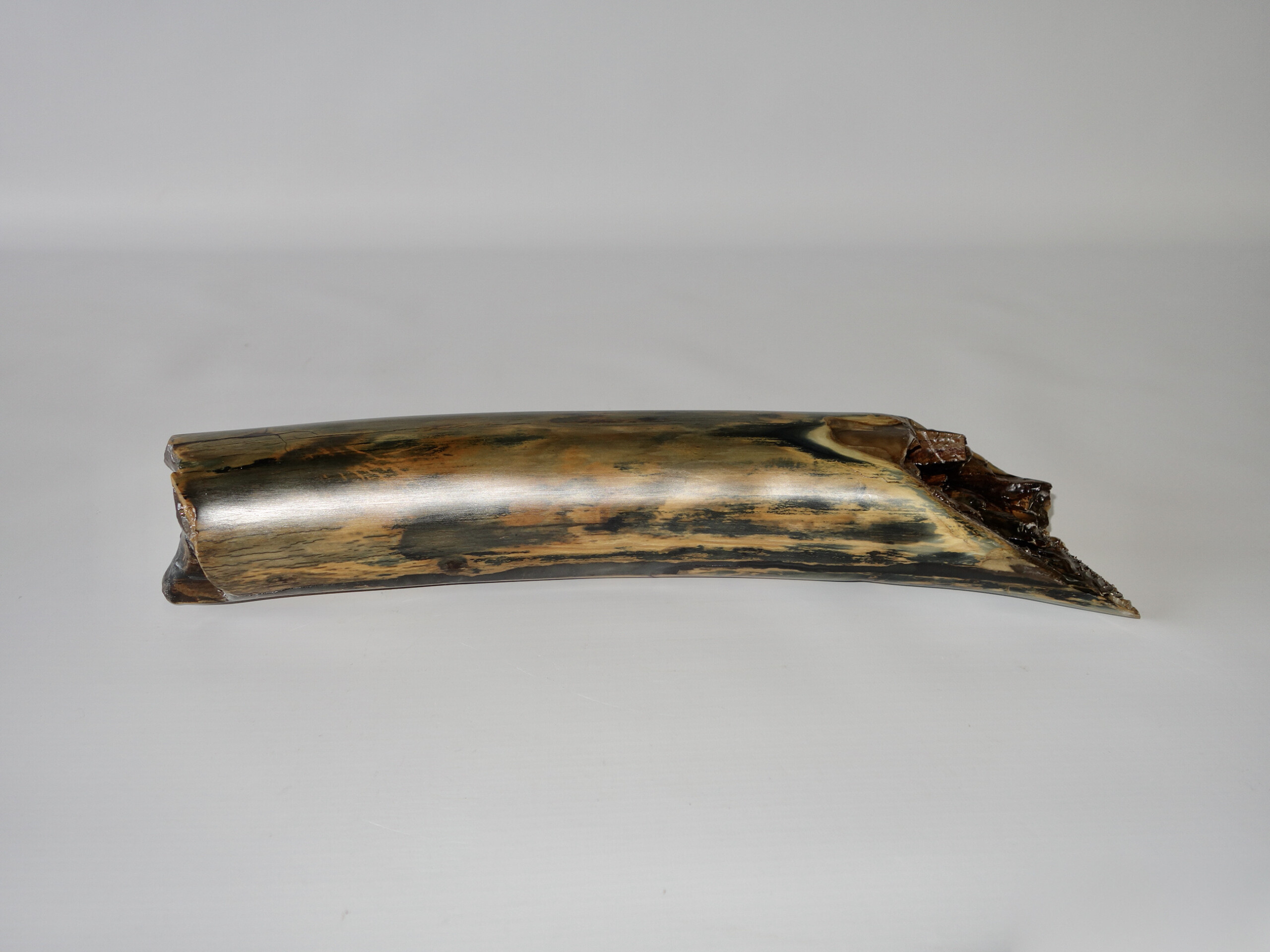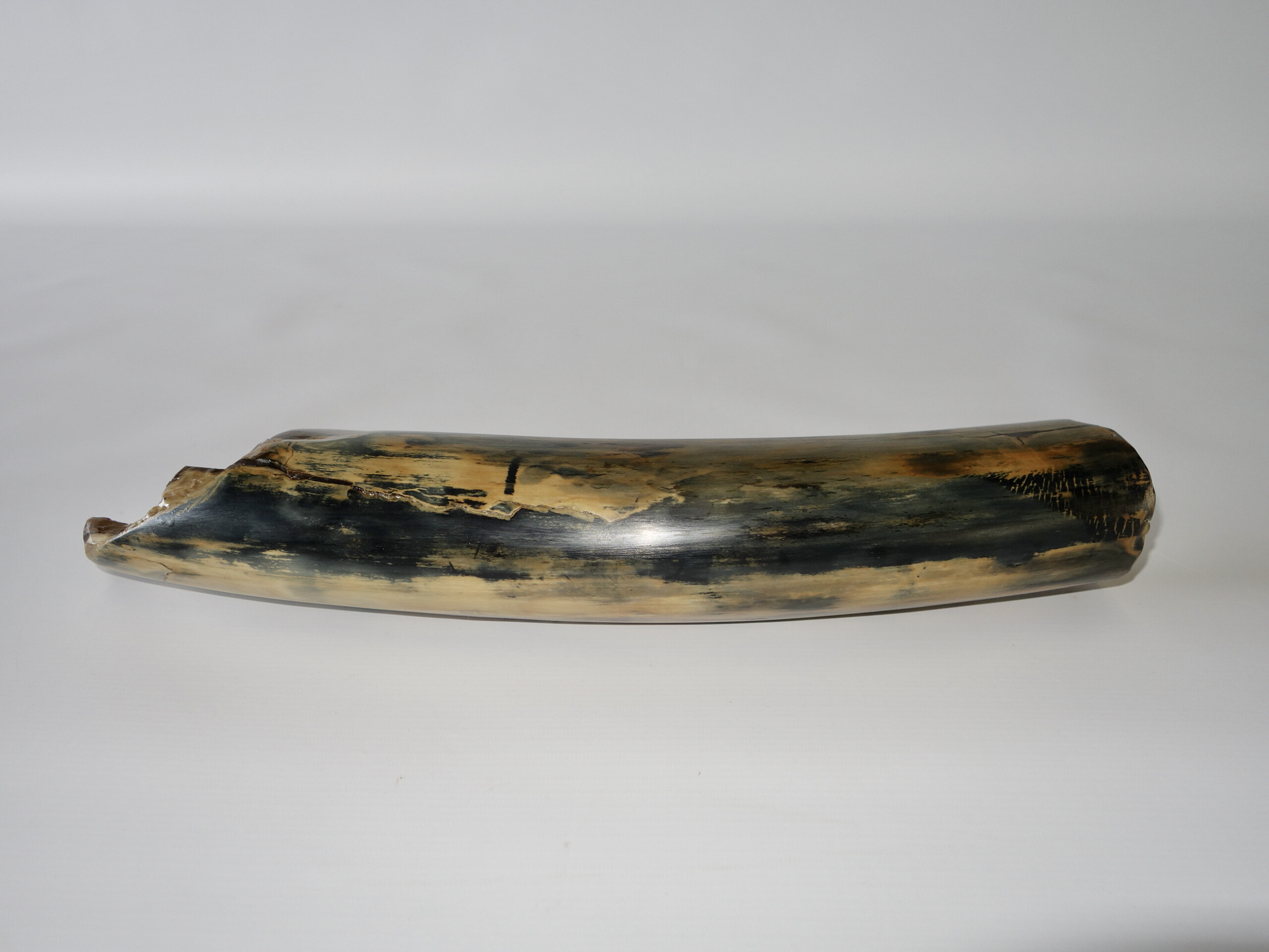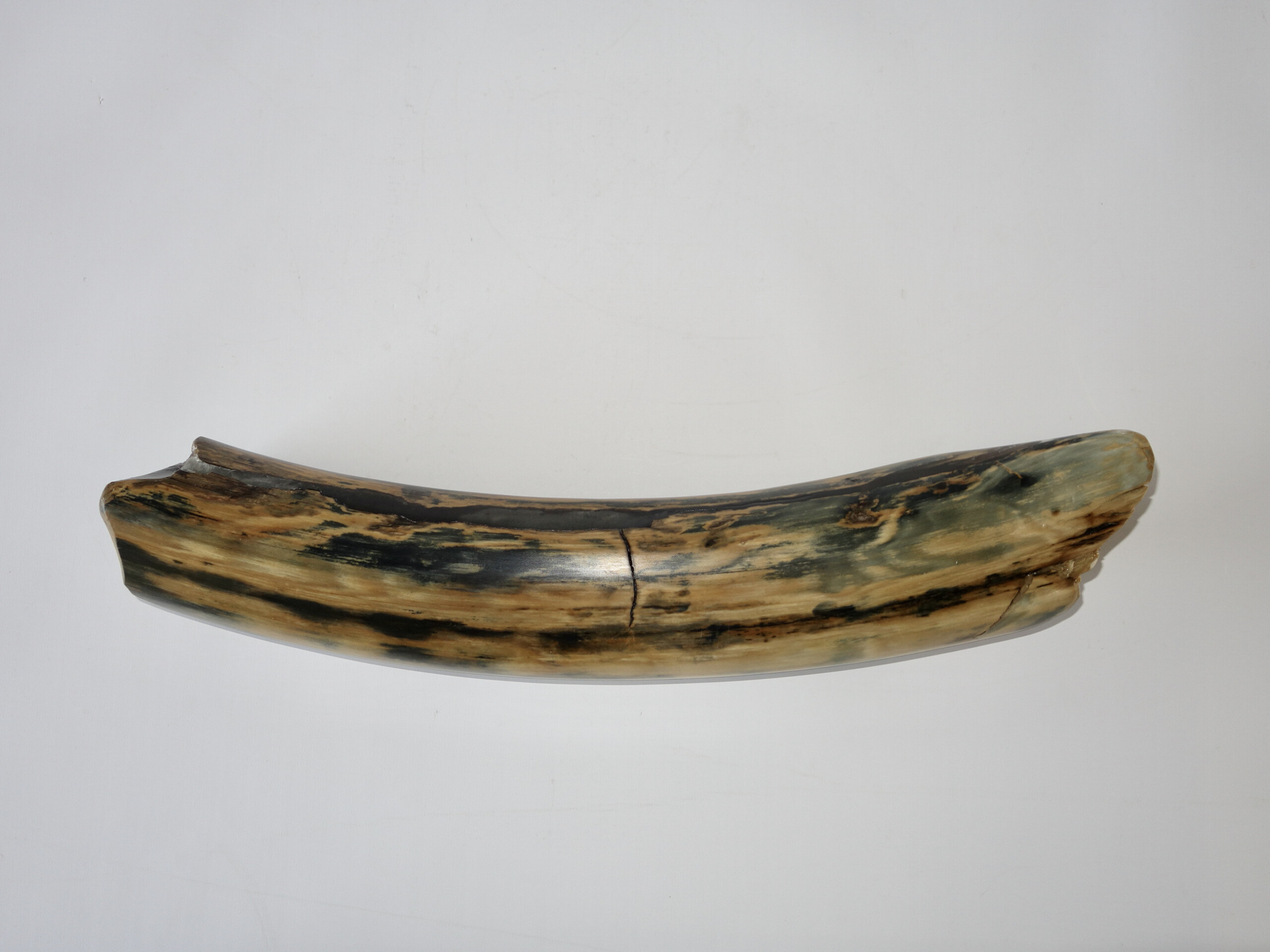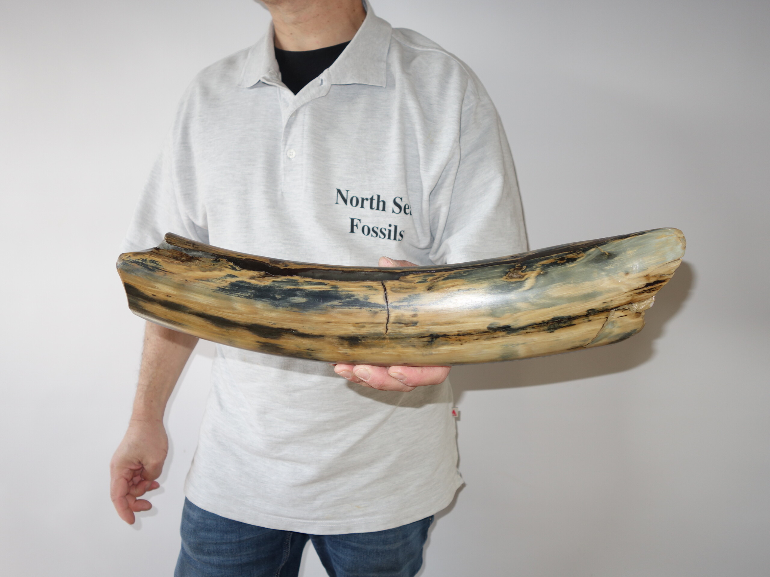On offer is a gorgeous and large piece of tusk of a Woolly Mammoth from the Pleistocene era. This is the middle part of the tusk, the base and tip are missing, but otherwise it is in excellent state of preservation, as seen in the images. No restoration whatsoever. This tusk piece is of beautiful colouring of mainly white, gold, brown, grey and black ivory, and with absolutely stunning patterning. The black and white section of the ruler in the image represents 10 cm / 3.9 inch. Judging from the circumference, this would have belonged to a female Mammoth. This piece has been applied with a matt finish, but it is also possible to order it with a glossy finish.