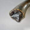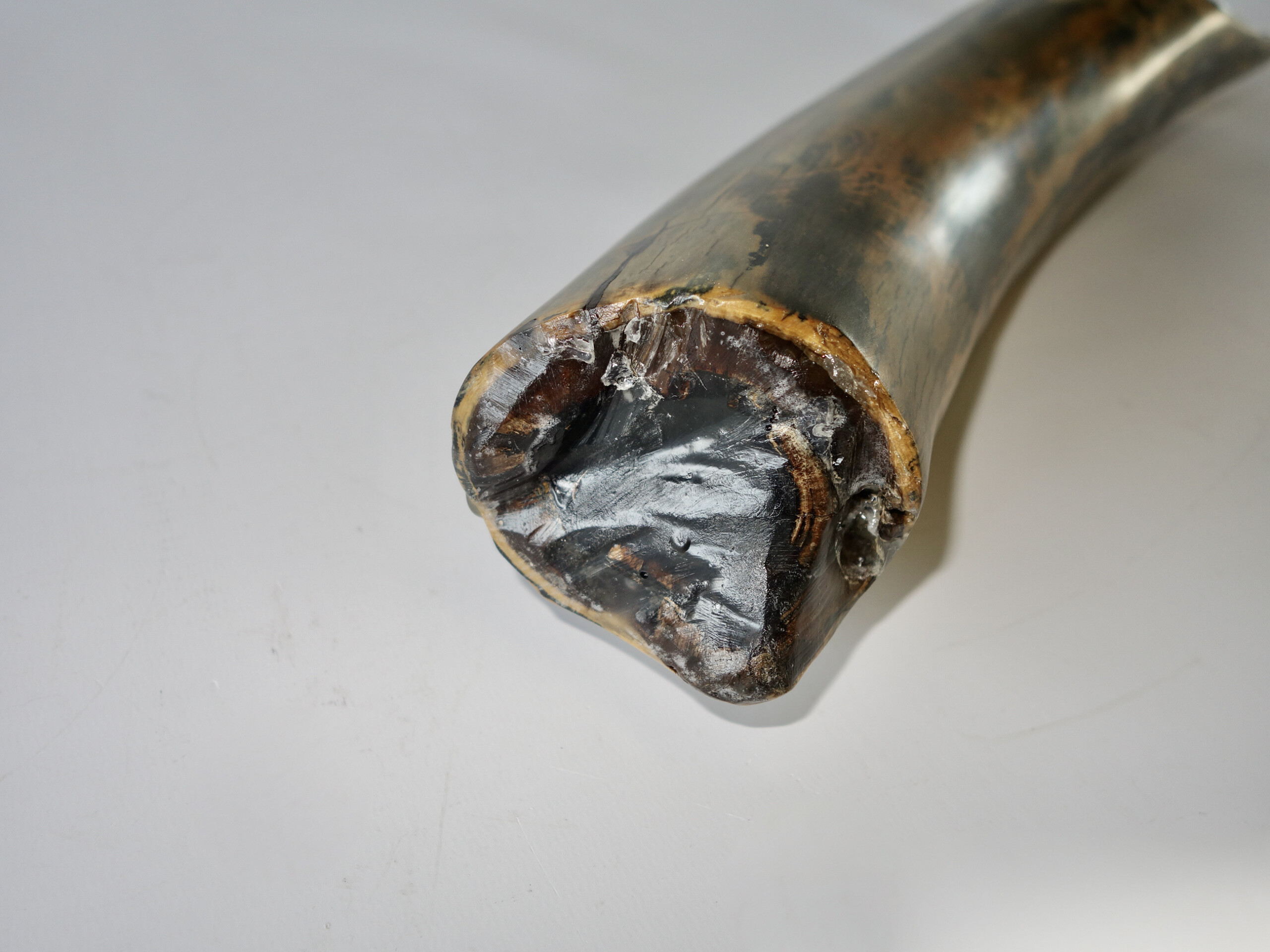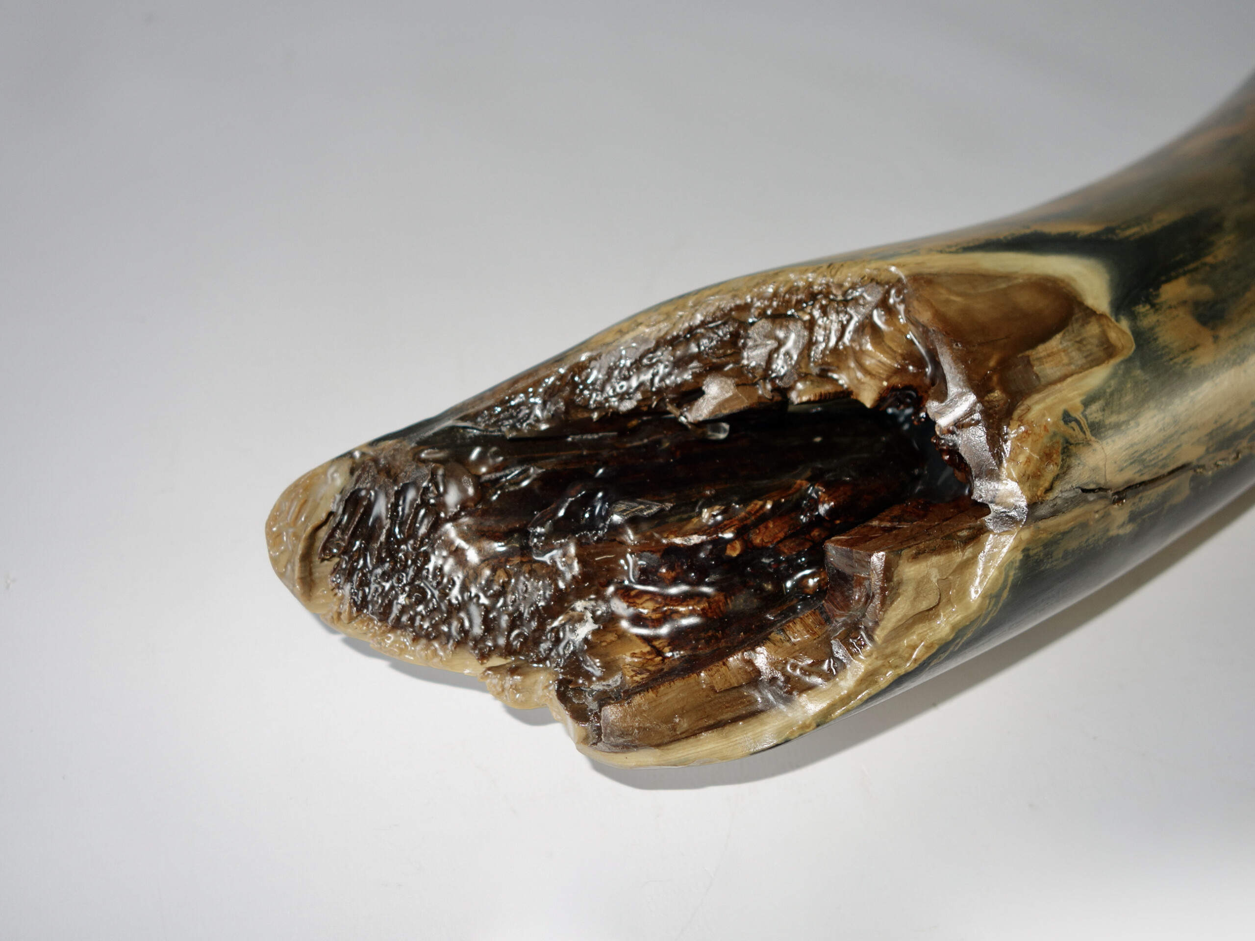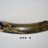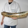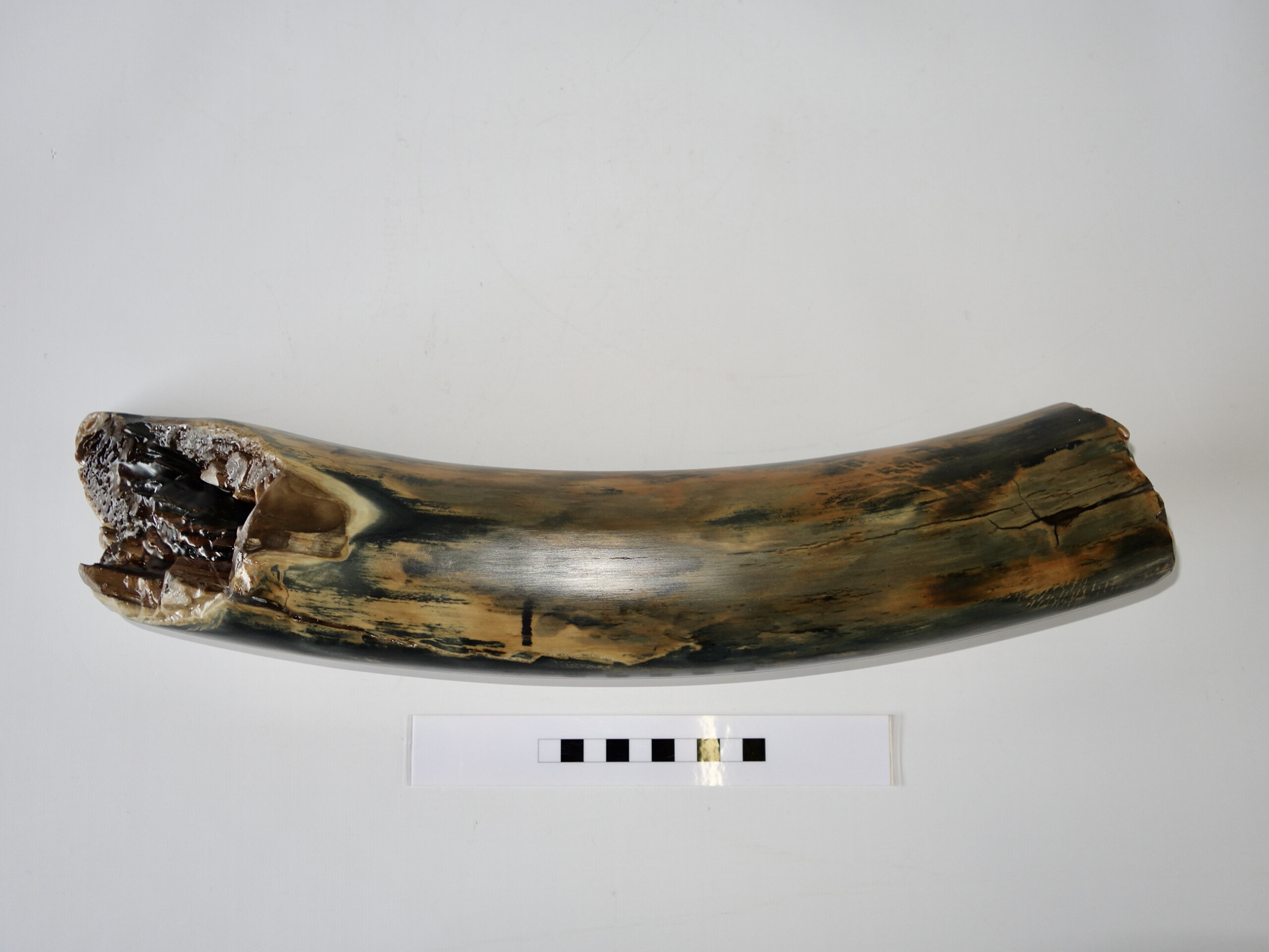 On offer is a gorgeous and large piece of tusk of a Woolly Mammoth from the Pleistocene era. This is the middle part of the tusk, the base and tip are missing, but otherwise it is in excellent state of preservation, as seen in the images. No restoration whatsoever. This tusk piece is of beautiful colouring of mainly white, gold, brown, grey and black ivory, and with absolutely stunning patterning. The black and white section of the ruler in the image represents 10 cm / 3.9 inch. Judging from the circumference, this would have belonged to a female Mammoth. This piece has been applied with a matt finish, but it is also possible to order it with a glossy finish.