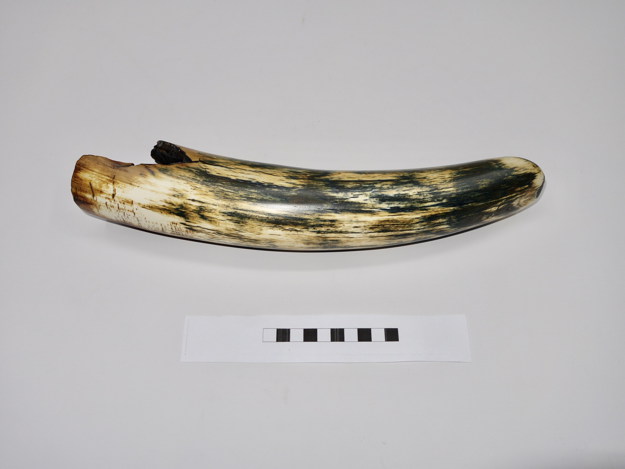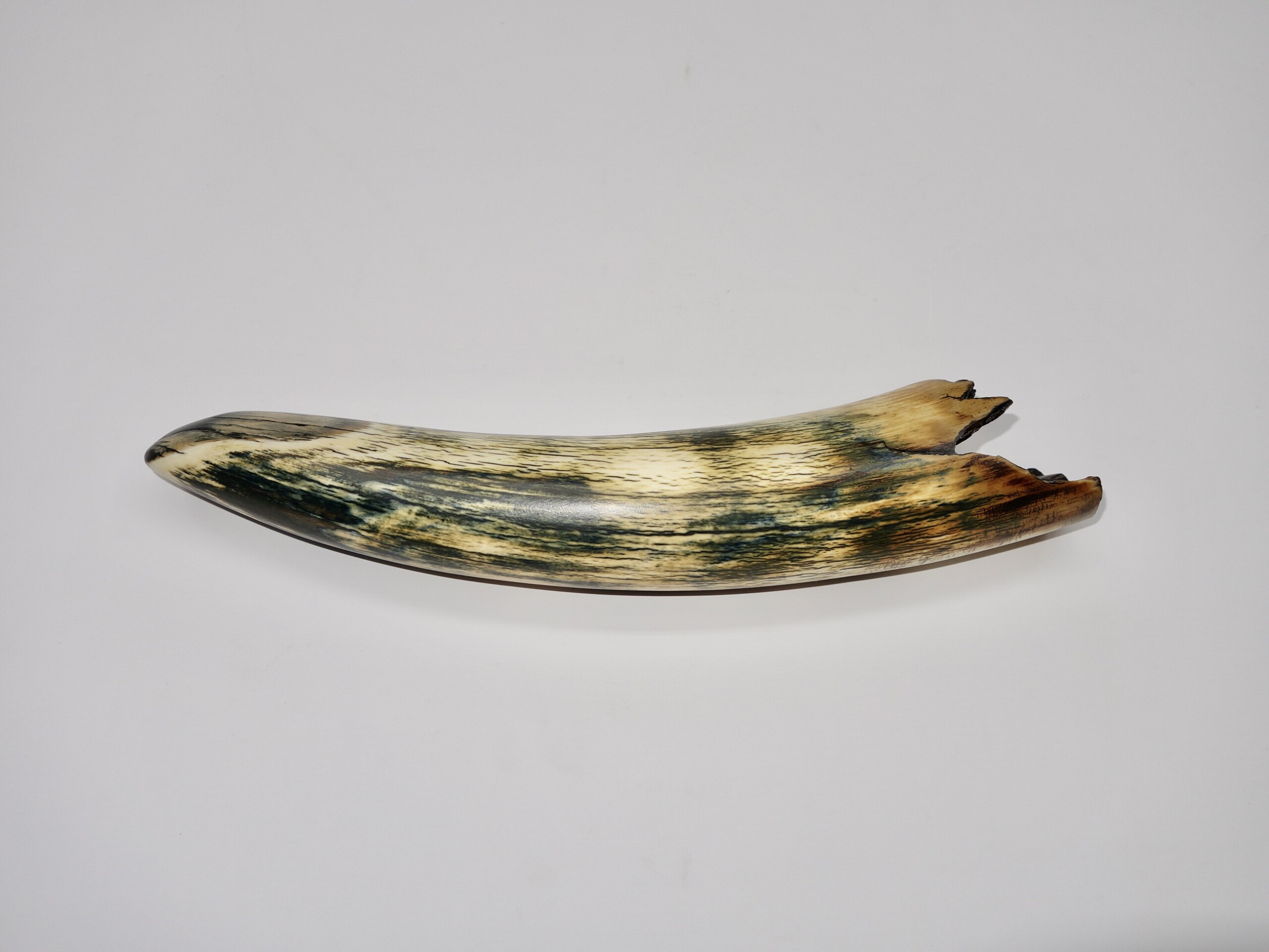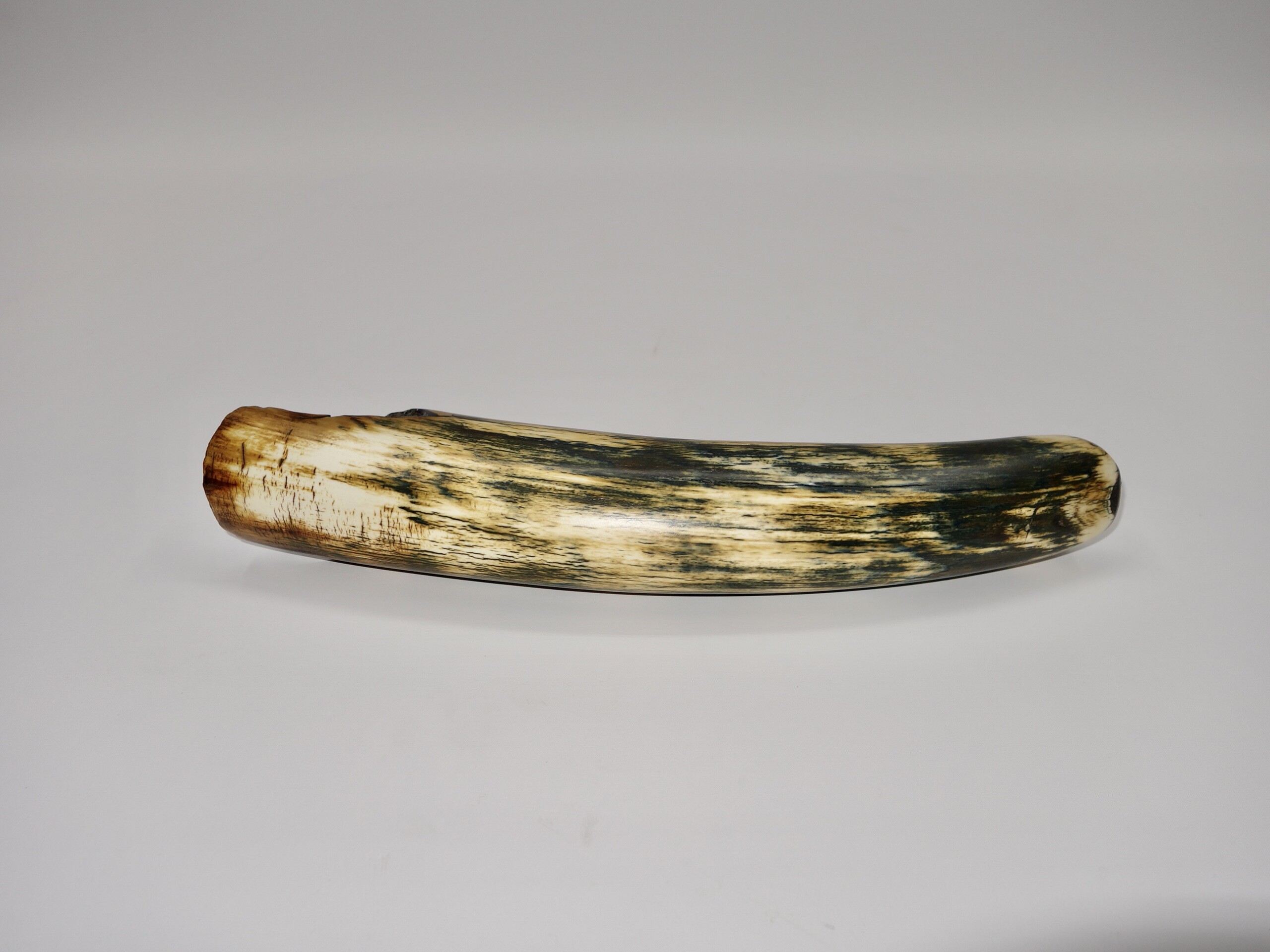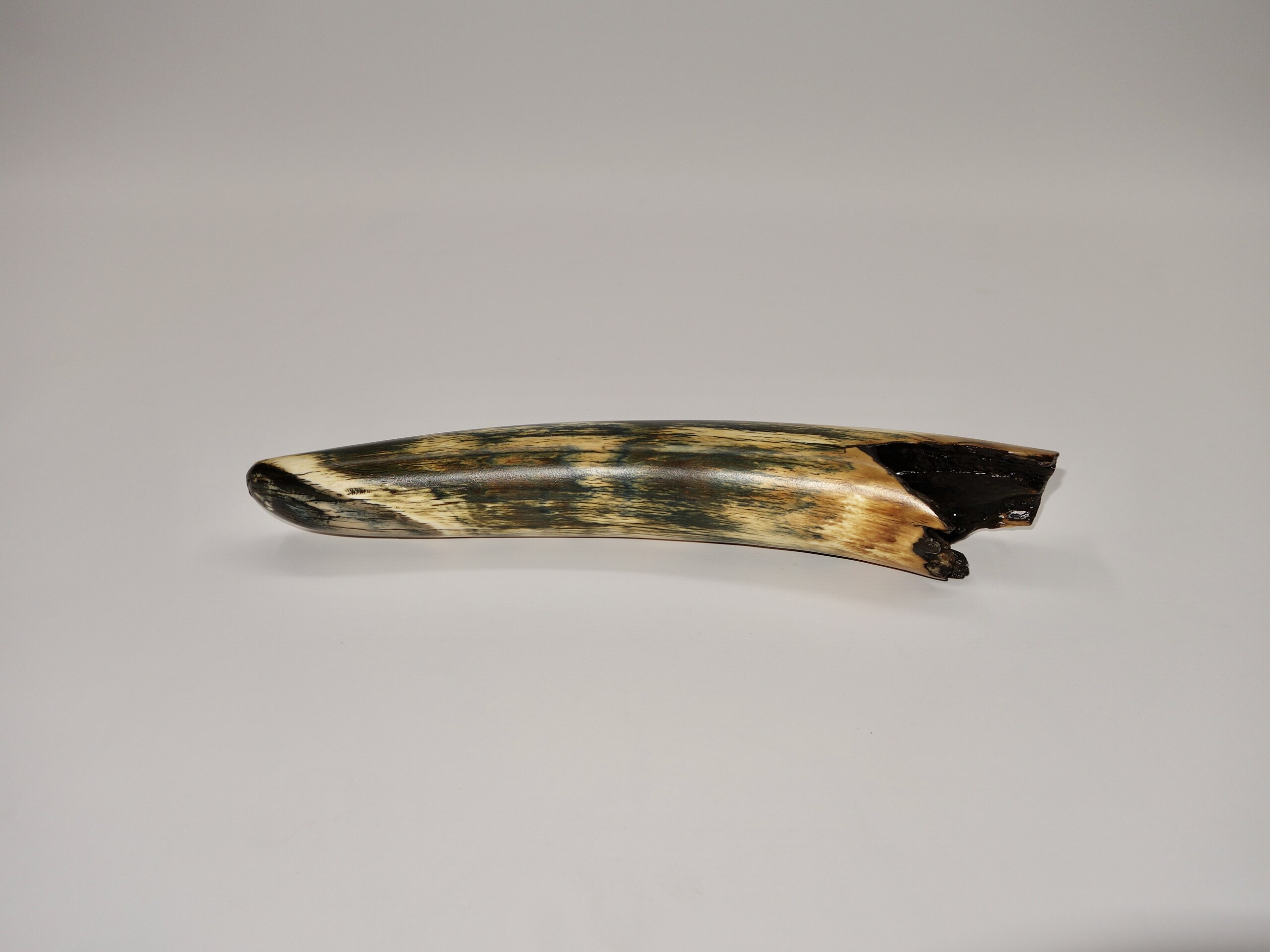 On offer is a gorgeous and well preserved tip of a tusk of a Woolly Mammoth. It is of beautiful colouring of mainly brown, white, grey and gold ivory and with stunning patterning. Beautiful piece and in excellent condition, as seen in the images. No restoration whatsoever. Much nicer in the flesh than the photos can convey, and highly recommended. The black-and-white section of the ruler in the image represents 10 cm / 3.9 inch. This belonged to an adult female Mammoth. This piece has been applied with a matt finish, but it is also possible to order it with a glossy finish.