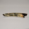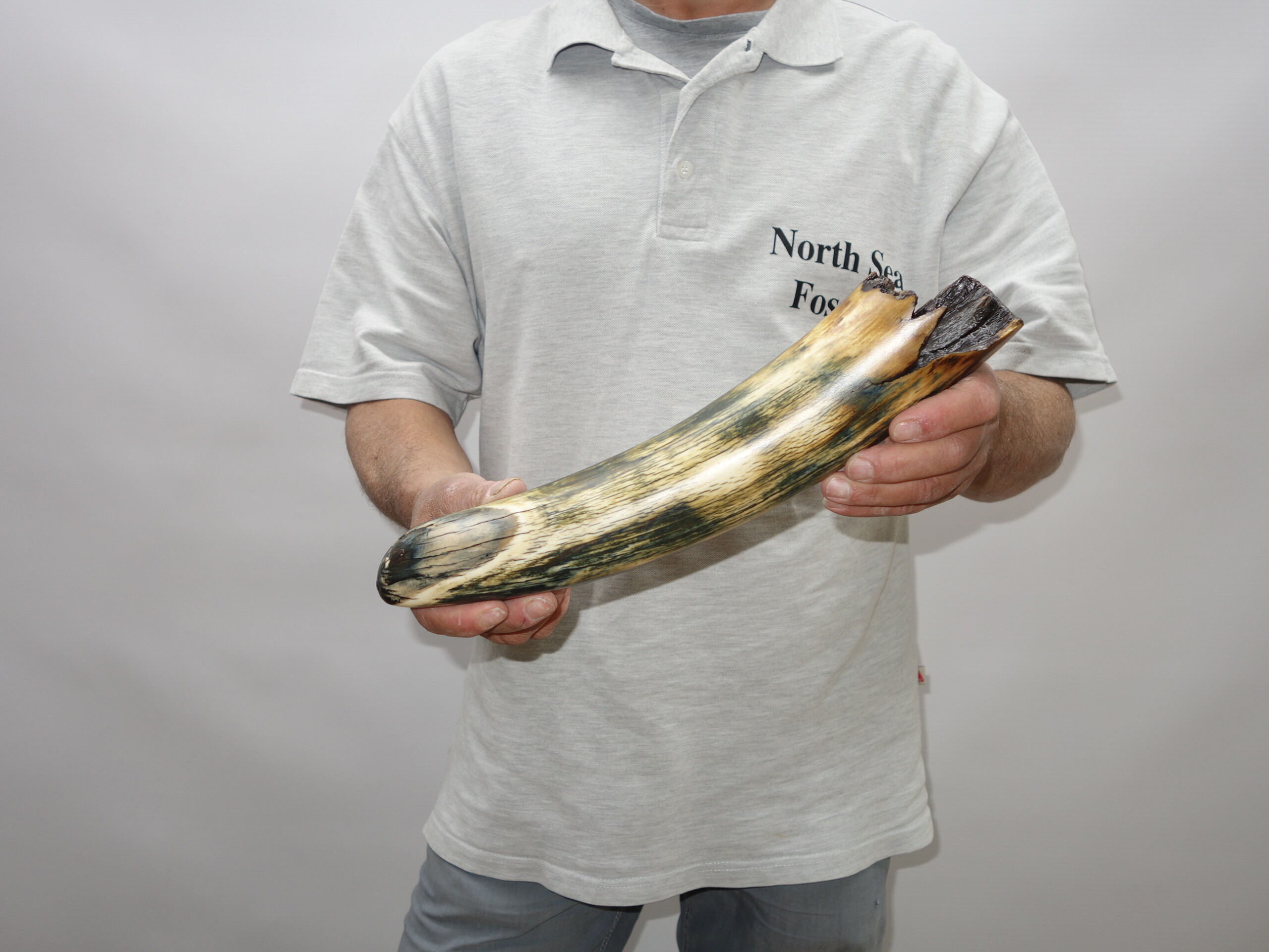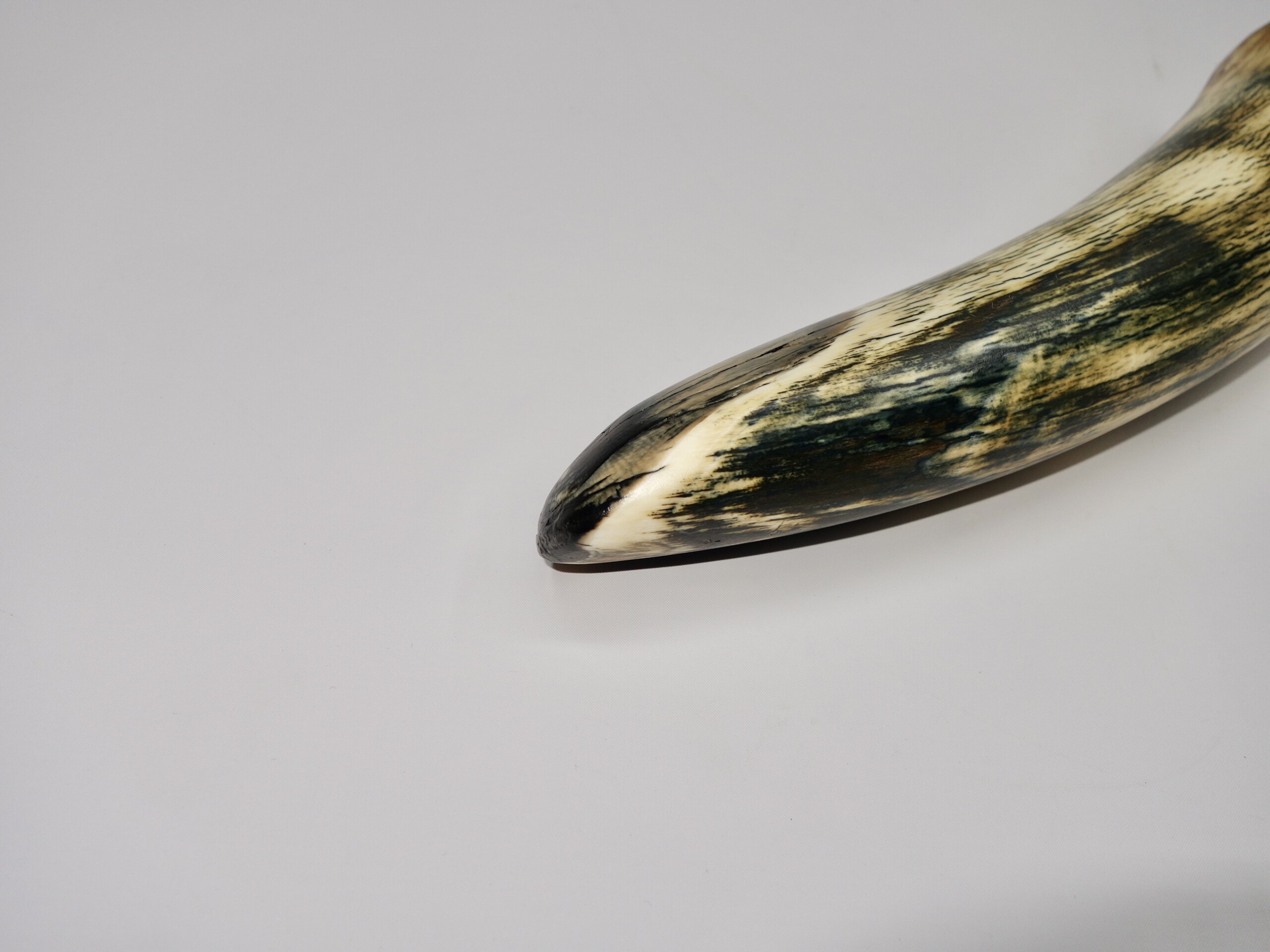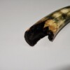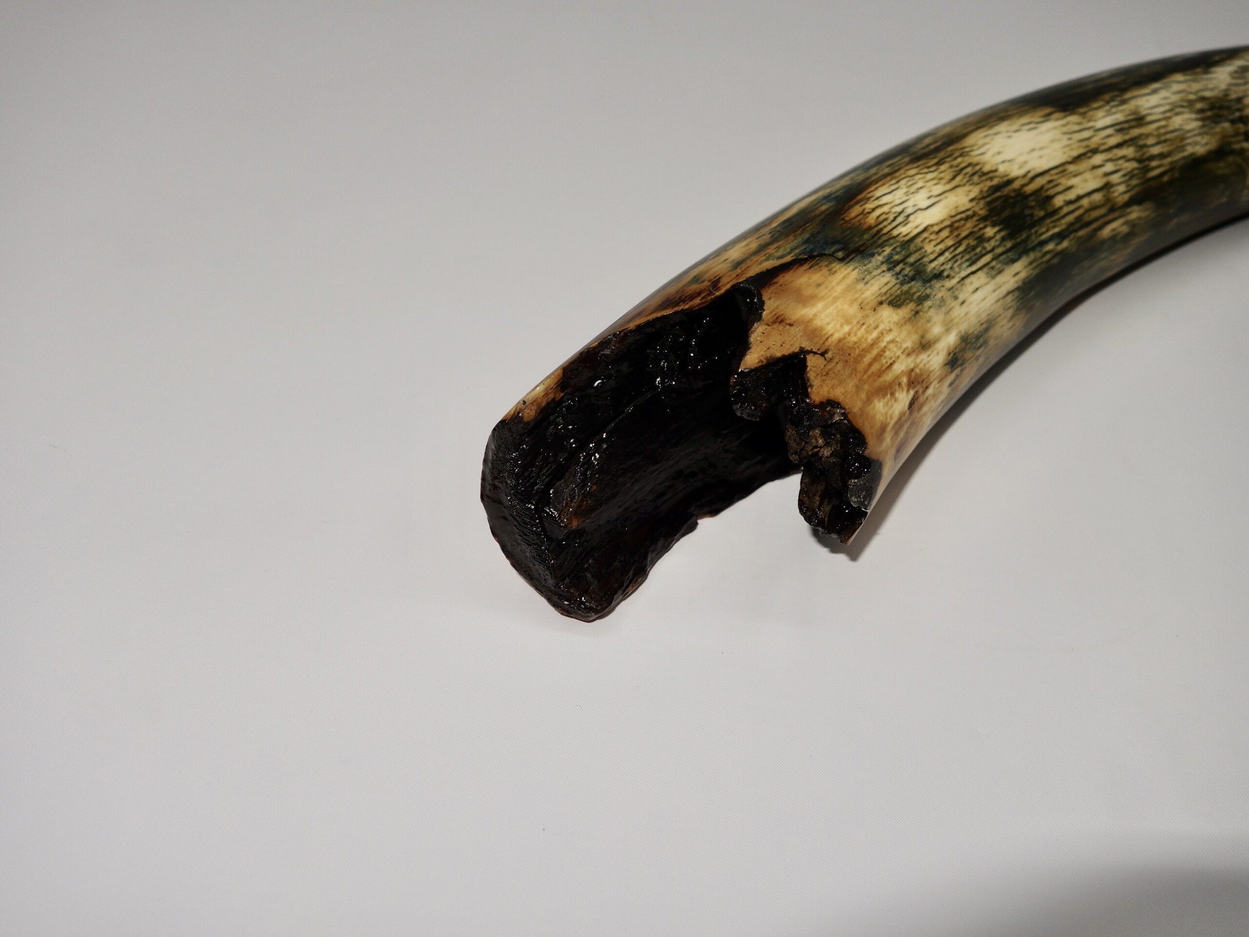 On offer is a gorgeous and well preserved tip of a tusk of a Woolly Mammoth. It is of beautiful colouring of mainly brown, white, grey and gold ivory and with stunning patterning. Beautiful piece and in excellent condition, as seen in the images. No restoration whatsoever. Much nicer in the flesh than the photos can convey, and highly recommended. The black-and-white section of the ruler in the image represents 10 cm / 3.9 inch. This belonged to an adult female Mammoth. This piece has been applied with a matt finish, but it is also possible to order it with a glossy finish.