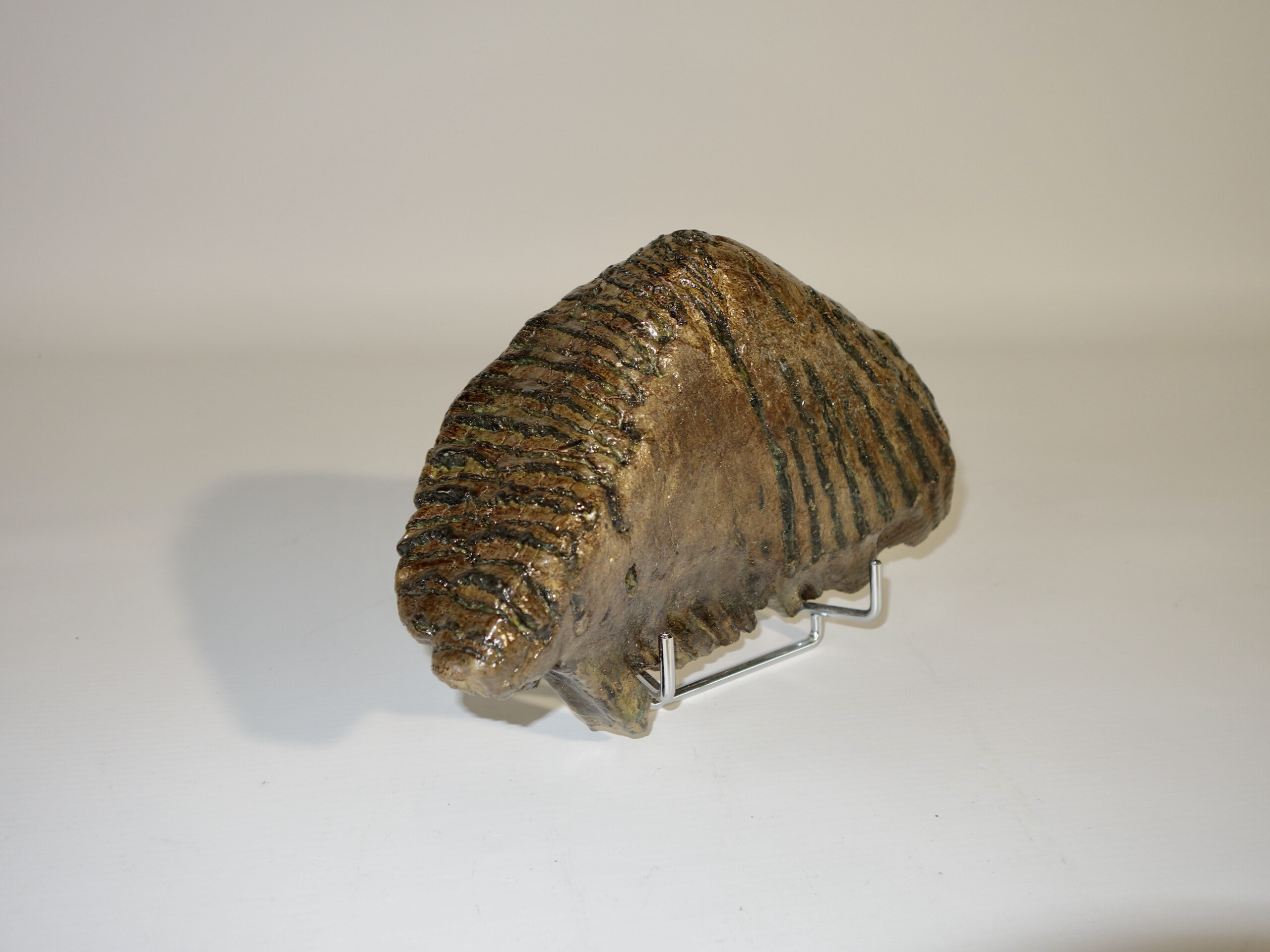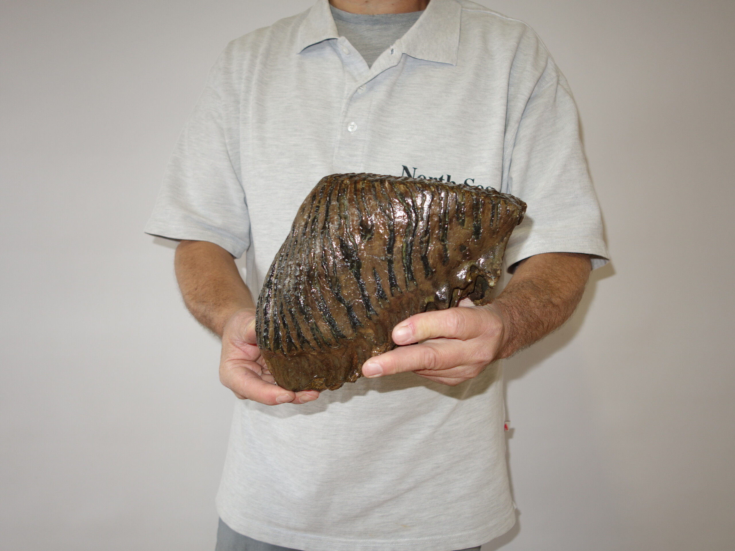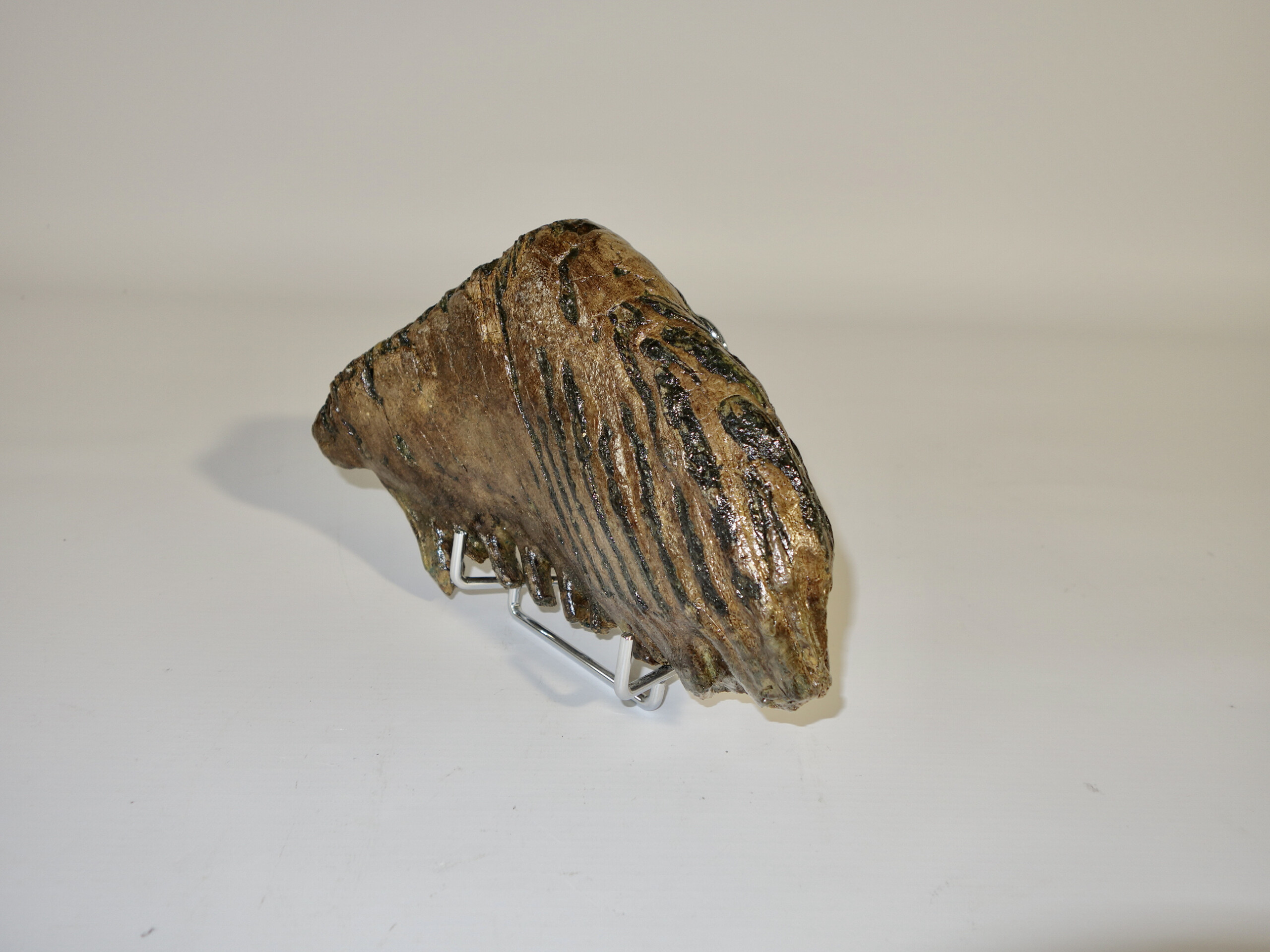 On offer is a gorgeous and large M3 molar of an adult Woolly Mammoth from the Pleistocene era. This molar comes from the left upper jaw. Fantastic quality tooth with beautiful chewing surface. Wonderful state of preservation, as seen in the images, and no restoration whatsoever. The black and white section of the ruler in the image represents 10 cm / 3.9 inch. Highly recommended museum quality Mammoth molar, and much more impressive in reality than the photos can convey.