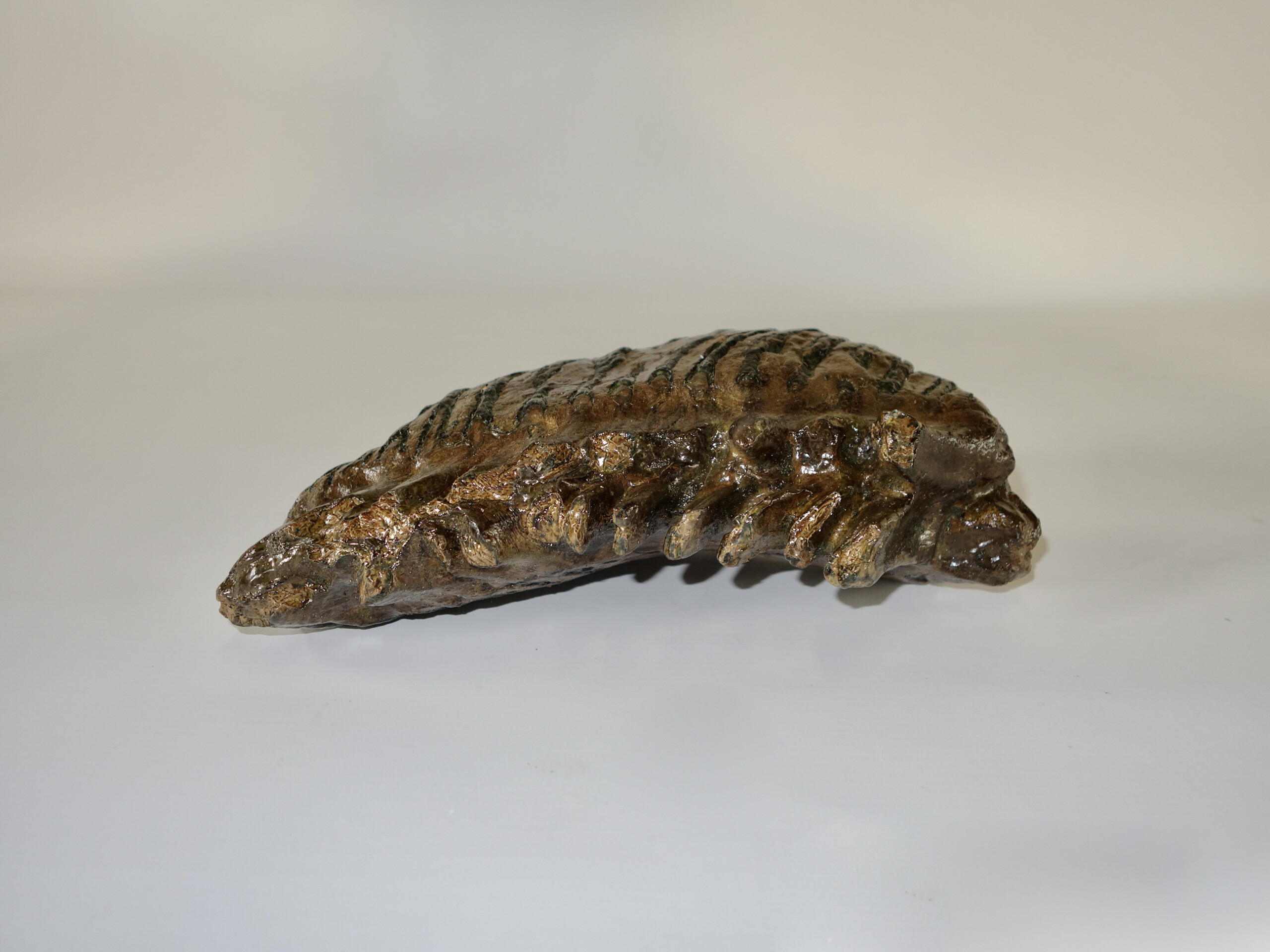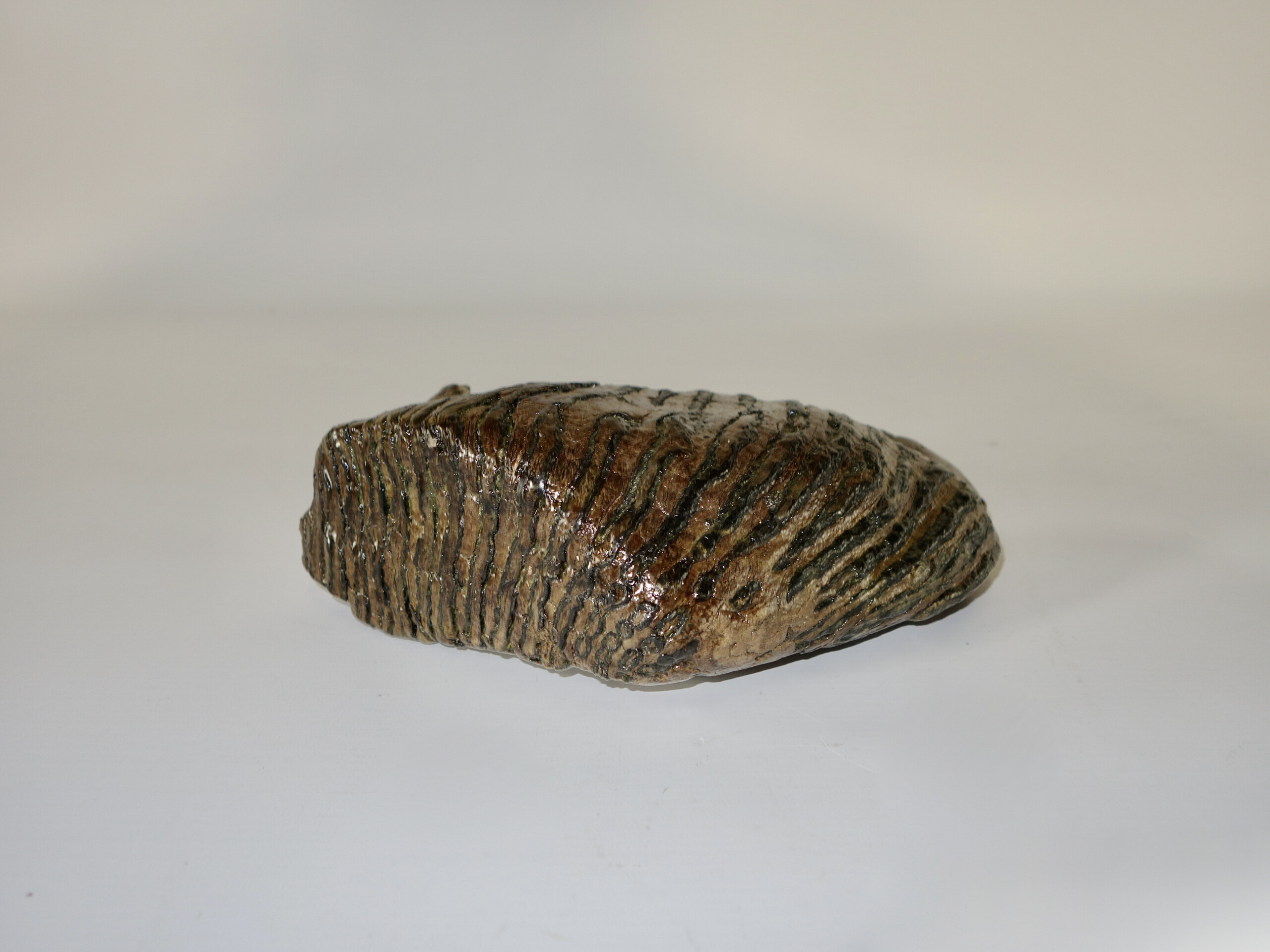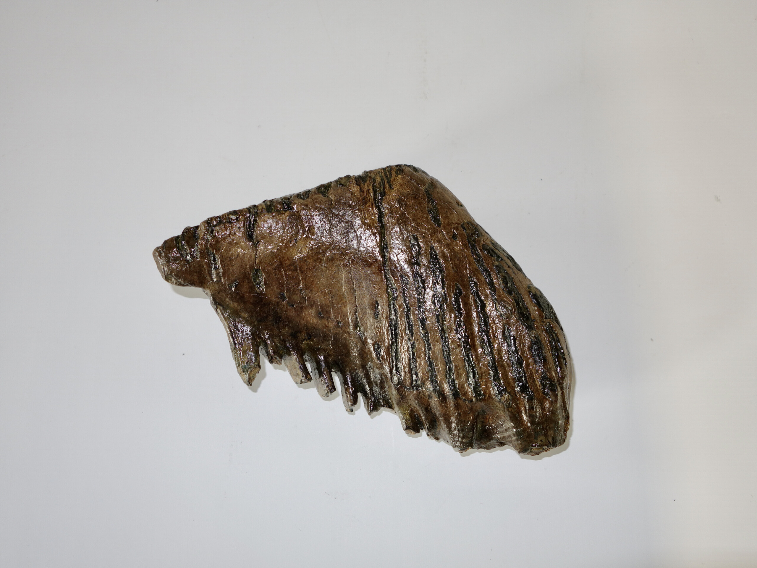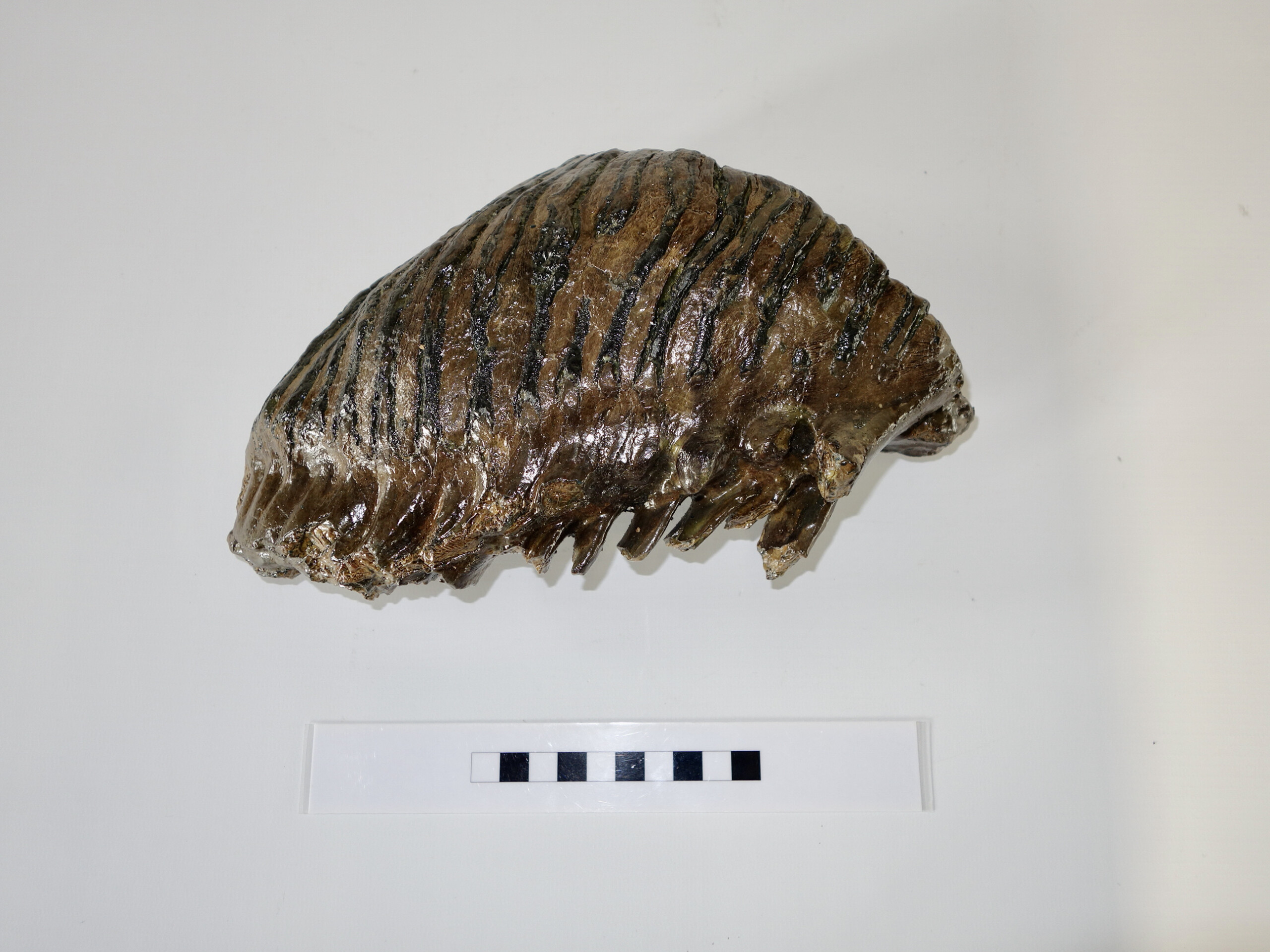 On offer is a gorgeous and large M3 molar of an adult Woolly Mammoth from the Pleistocene era. This molar comes from the left upper jaw. Fantastic quality tooth with beautiful chewing surface. Wonderful state of preservation, as seen in the images, and no restoration whatsoever. The black and white section of the ruler in the image represents 10 cm / 3.9 inch. Highly recommended museum quality Mammoth molar, and much more impressive in reality than the photos can convey.