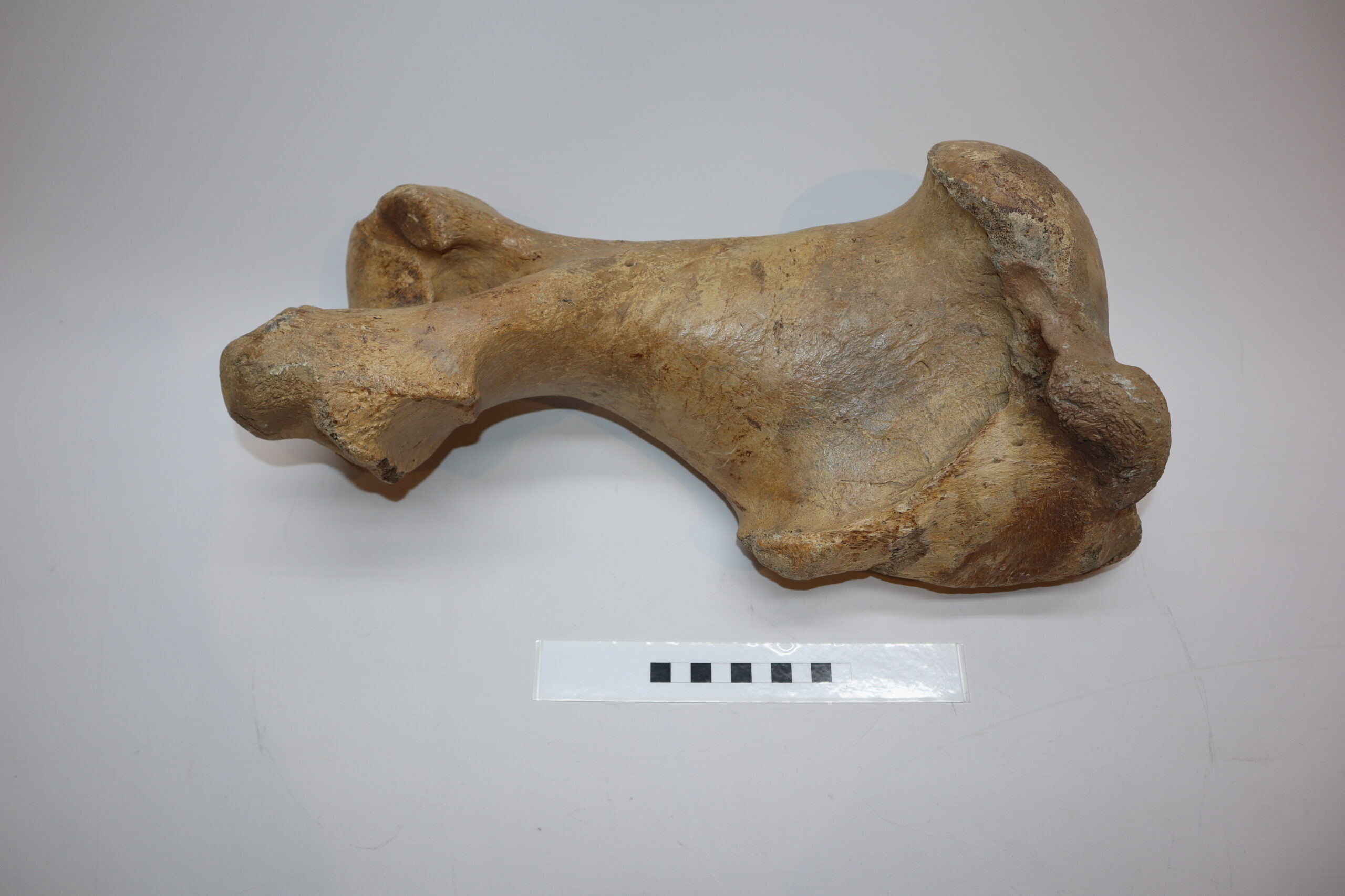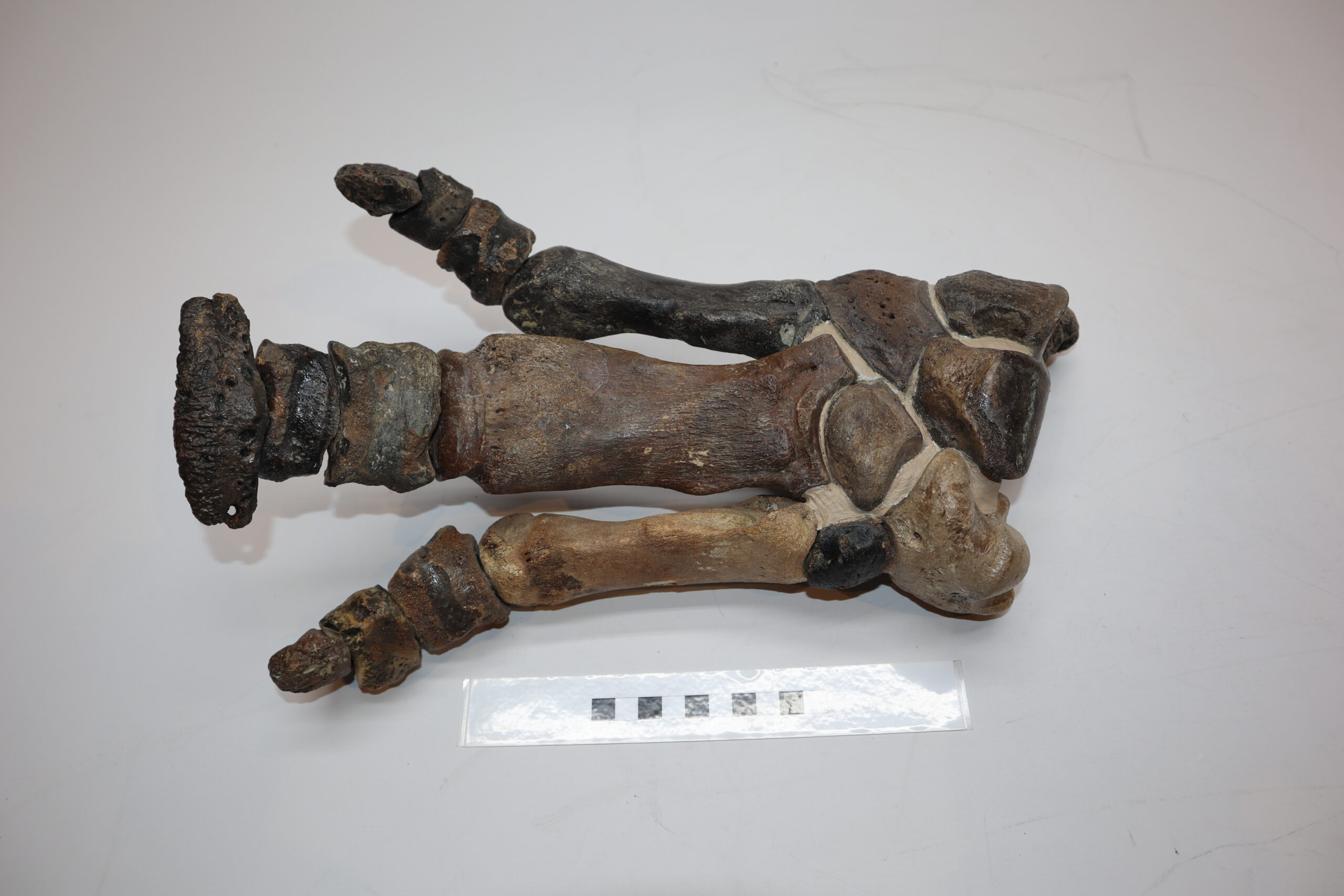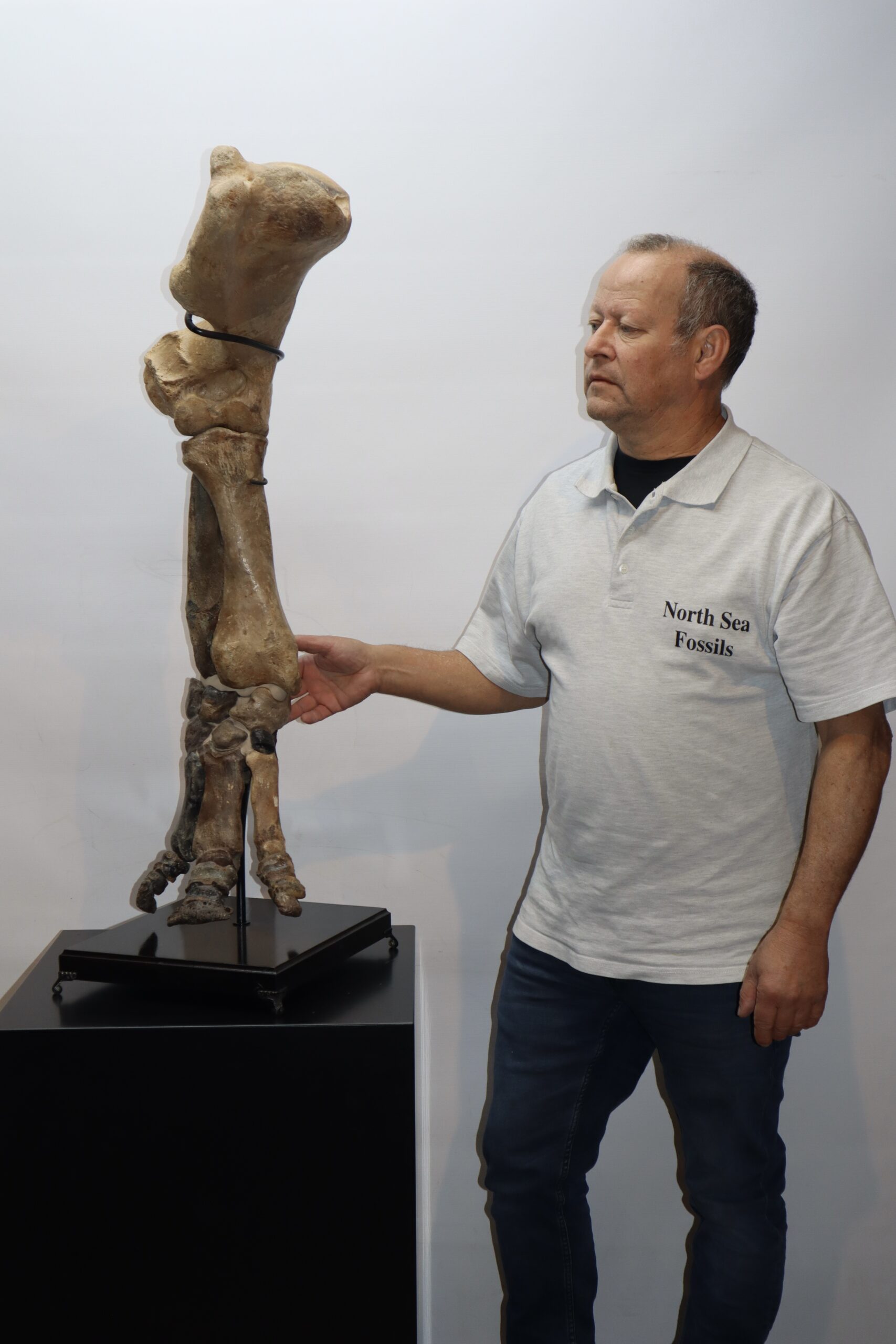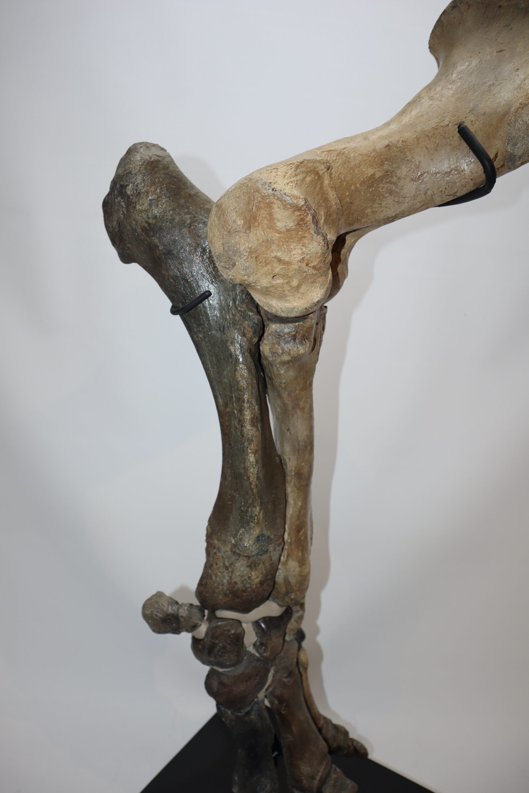 We are proud to present this excessively rare and most stunningly preserved right side forelimb of a Pleistocene Woolly Rhinoceros. Highly recommended for advanced collectors and museum and university collections. In many years of collecting and dealing we have almost never seen a Rhino forelimb like this one! Truly a unique fossil. It is very rare and special for its truly magnificent state of preservation, preserving small details of anatomy. This piece consists of a fantastic humerus, radius/ulna and the manus, consisting of the various footbones, all assembled according to the latest scientific consensus. Worthy of any museum collection. The black and white section of the ruler in the image represents 10 cm / 3.9 inch.