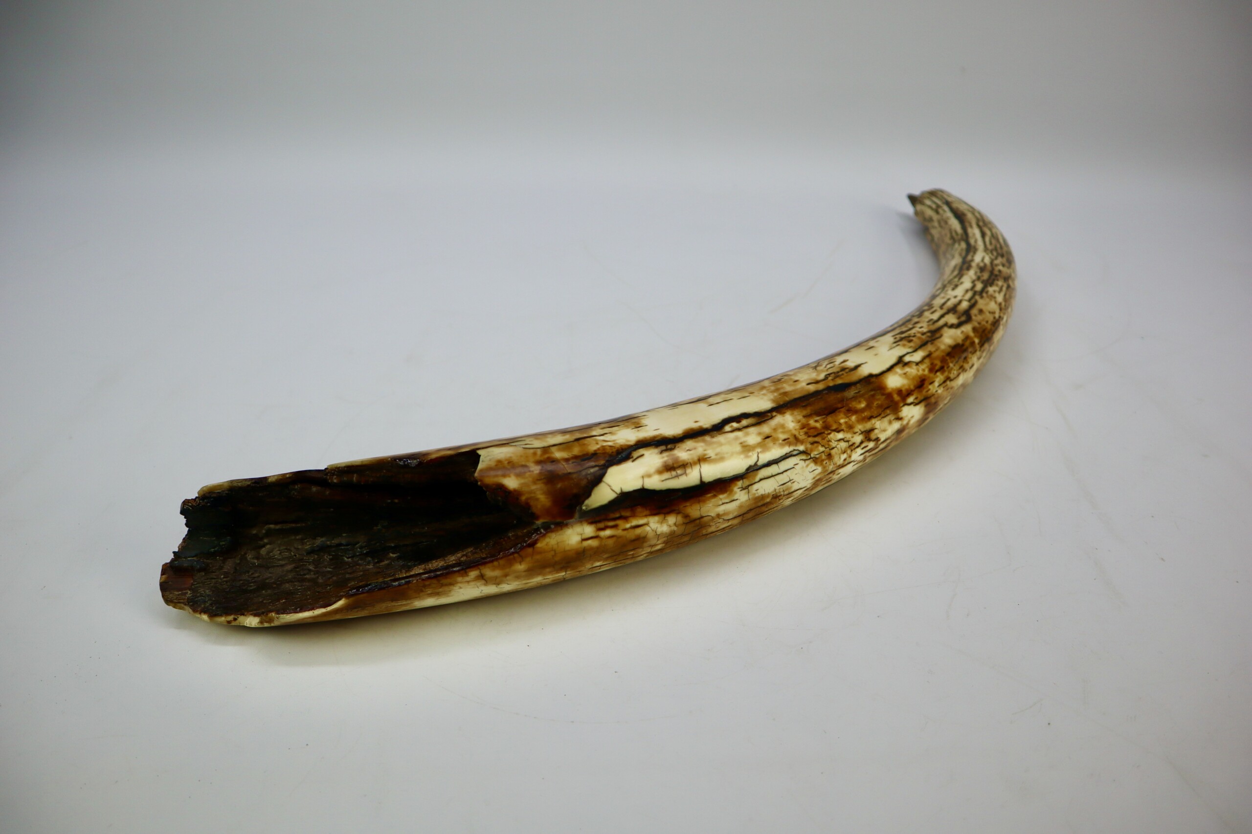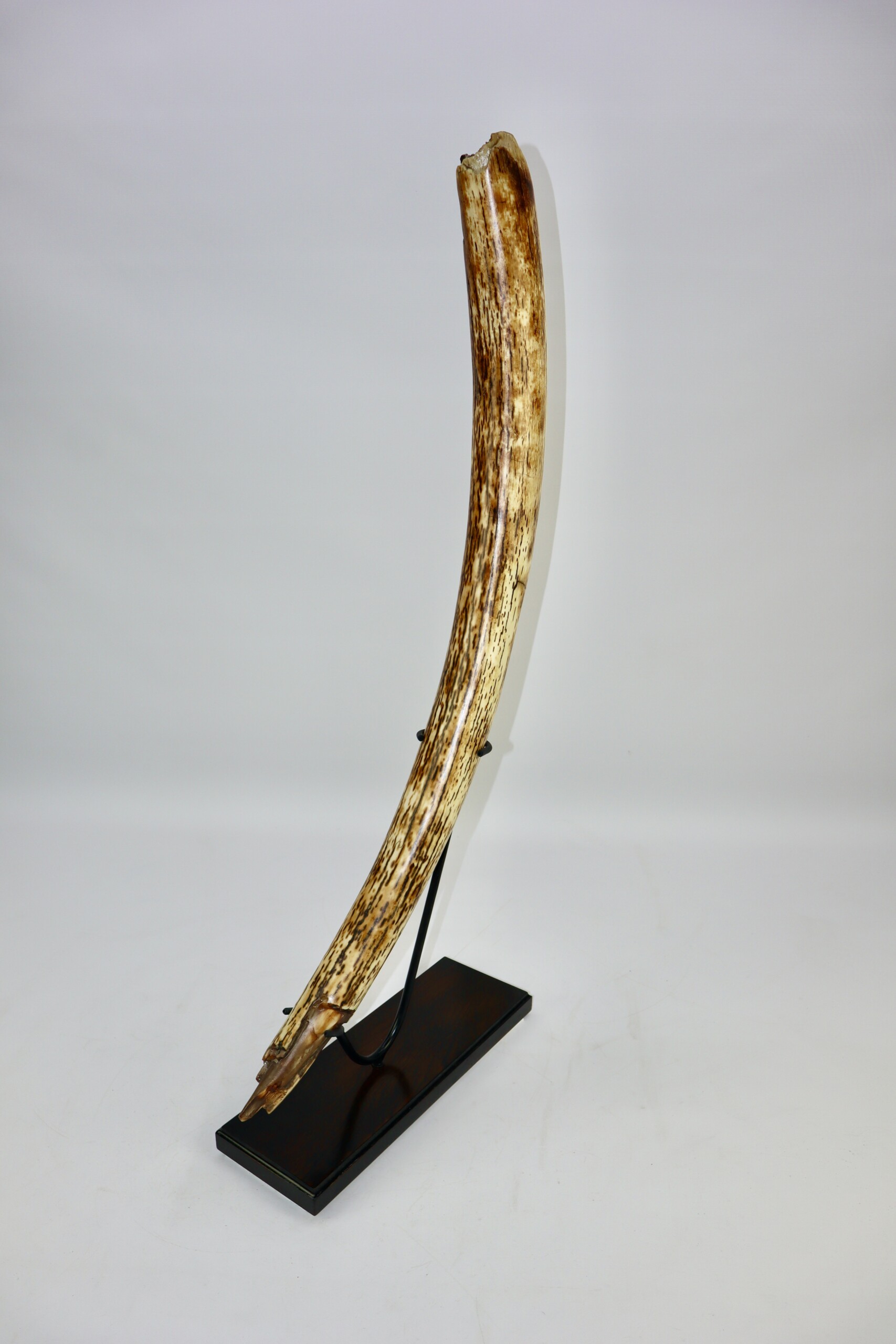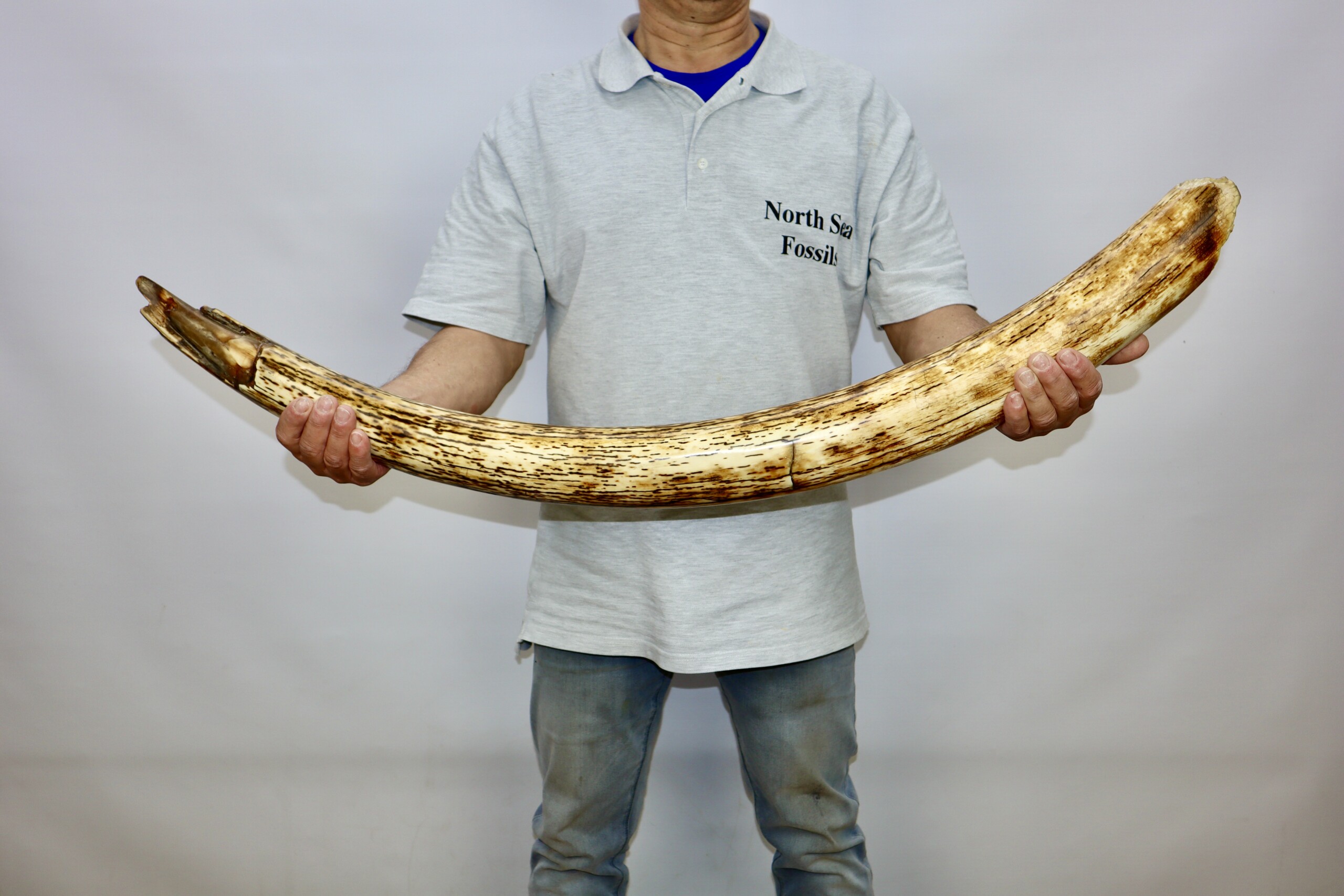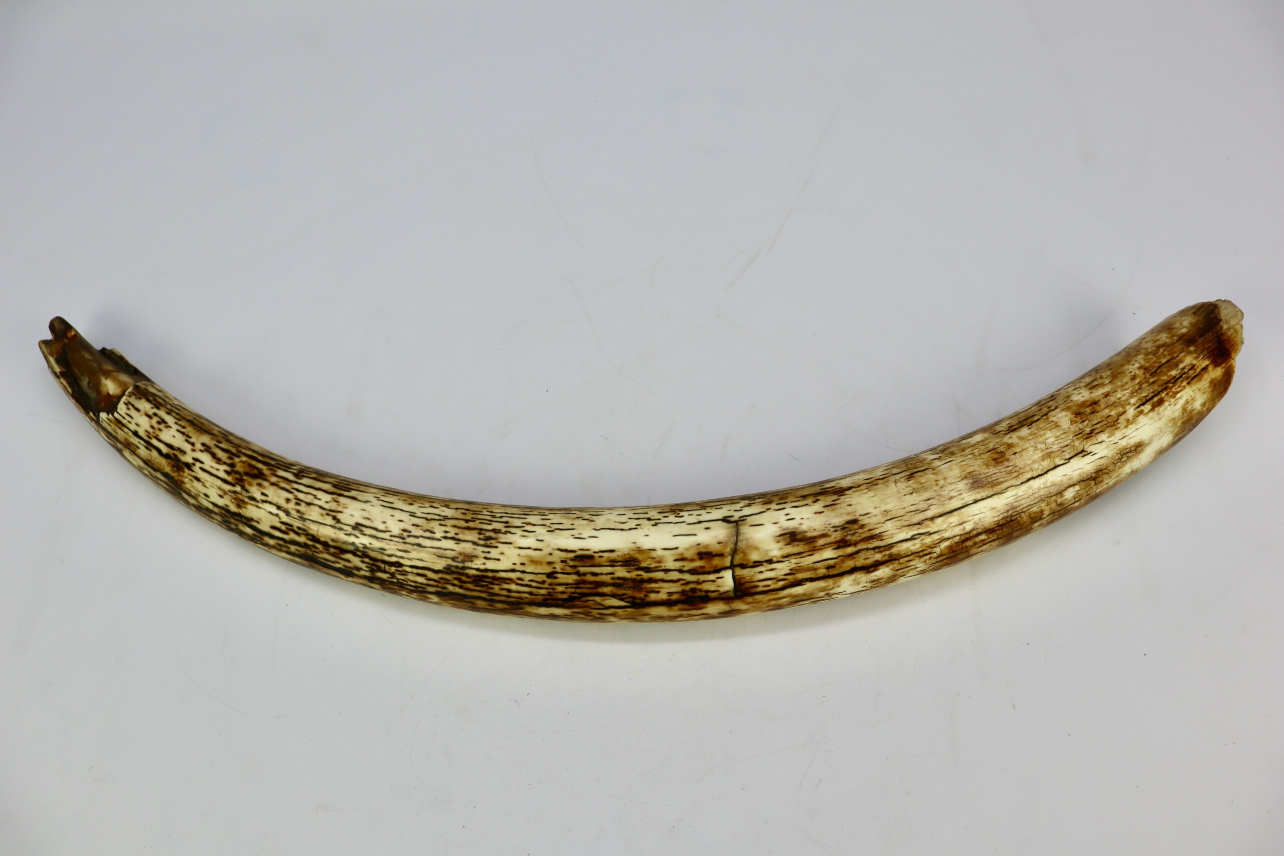 On offer is a fantastic half tusk of a female Woolly Mammoth from the Pleistocene era. Although it is only a half tusk, otherwise it is in excellent condition as seen in the images. This is the middle part of the tusk, the base and tip are missing. A crack has been professionally repaired, otherwise no restoration whatsoever. This tusk piece is of beautiful ivory of mainly white, gold, grey andย brown ivory, and with stunning patterning. Fantastic piece and highly recommended. The black and white section of the ruler in the image represents 10 cm / 3.9 inch. This piece has been applied with a matt finish, but it is also possible to order it with a glossy finish.