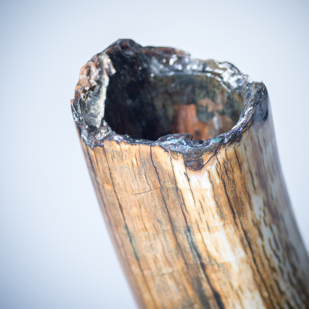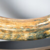 On offer is a magnificent base of an absolutely massive tusk of a very large adult alpha male Woolly Mammoth from the Pleistocene era. This is the tusk piece where it attached to the animal’s skull, hence the hollow part. This tusk base is is in excellent condition, as can be seen in the images. There is no restoration to this piece whatsoever. Beautiful colouring of mainly black, brown white and gold, and with stunning patterning. Judging from the circumference this would have belonged to a huge adult alpha male Woolly Mammoth. This piece has been applied with a matt finish, but it is also possible to order it with a glossy finish.