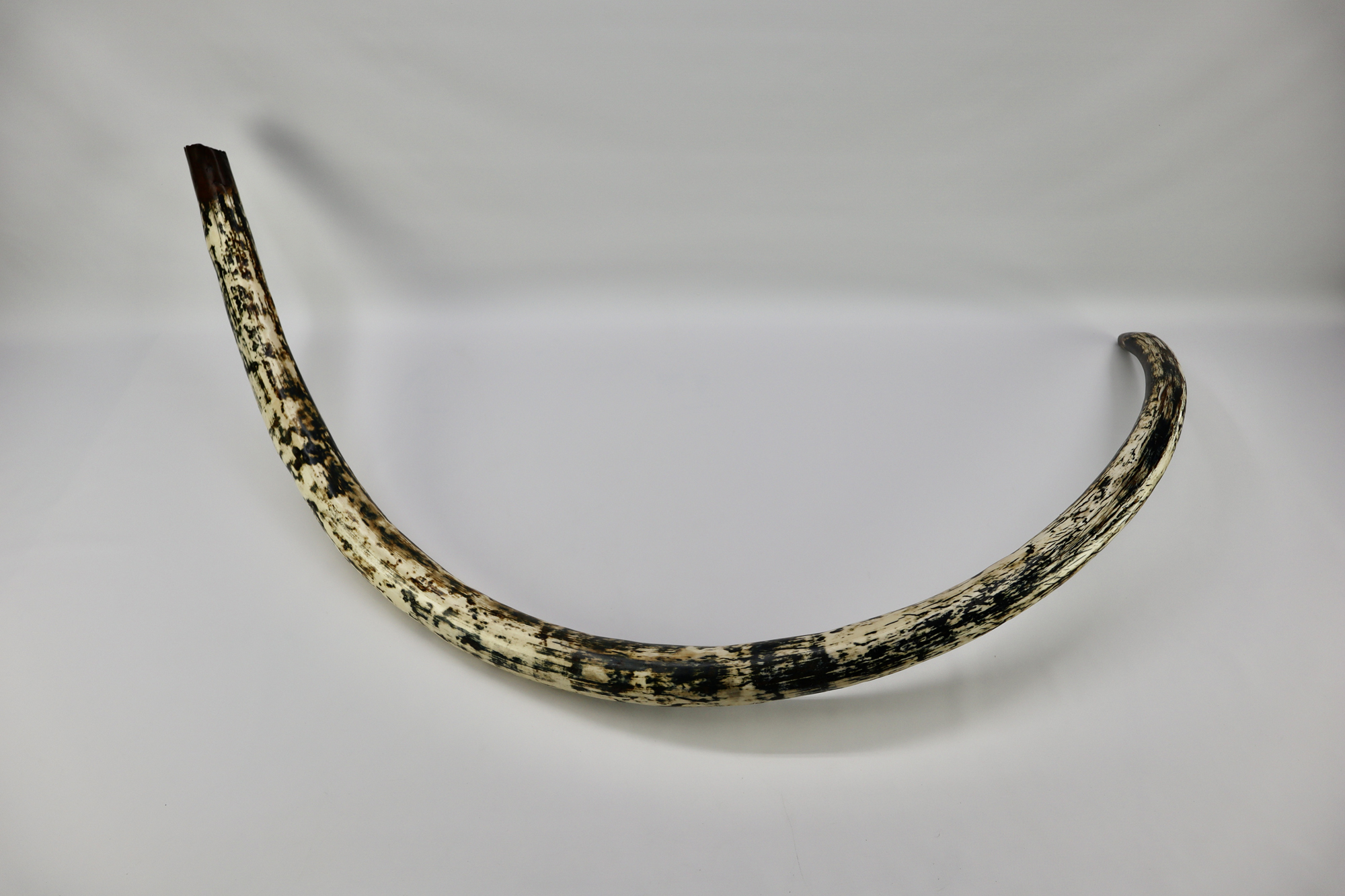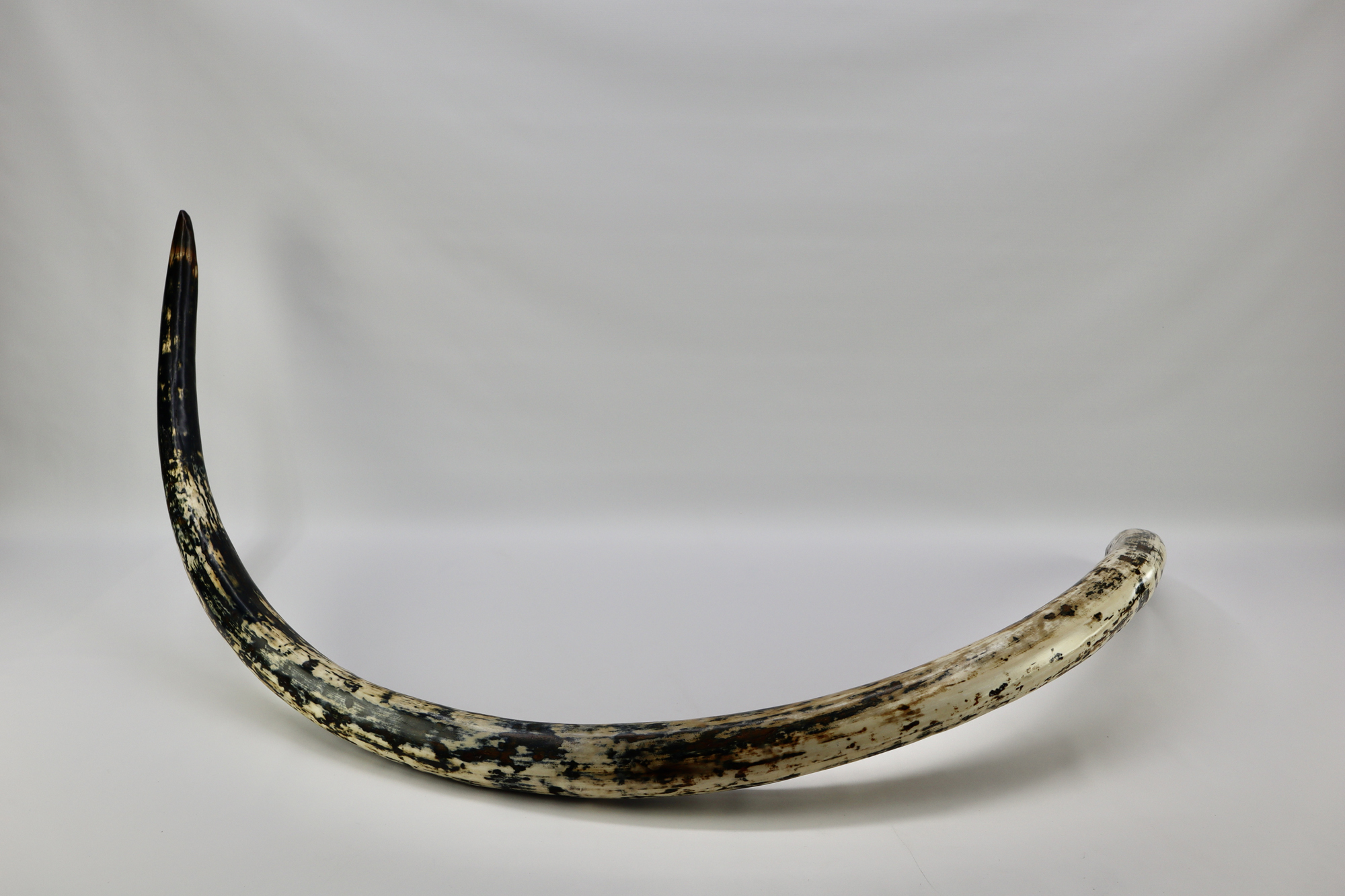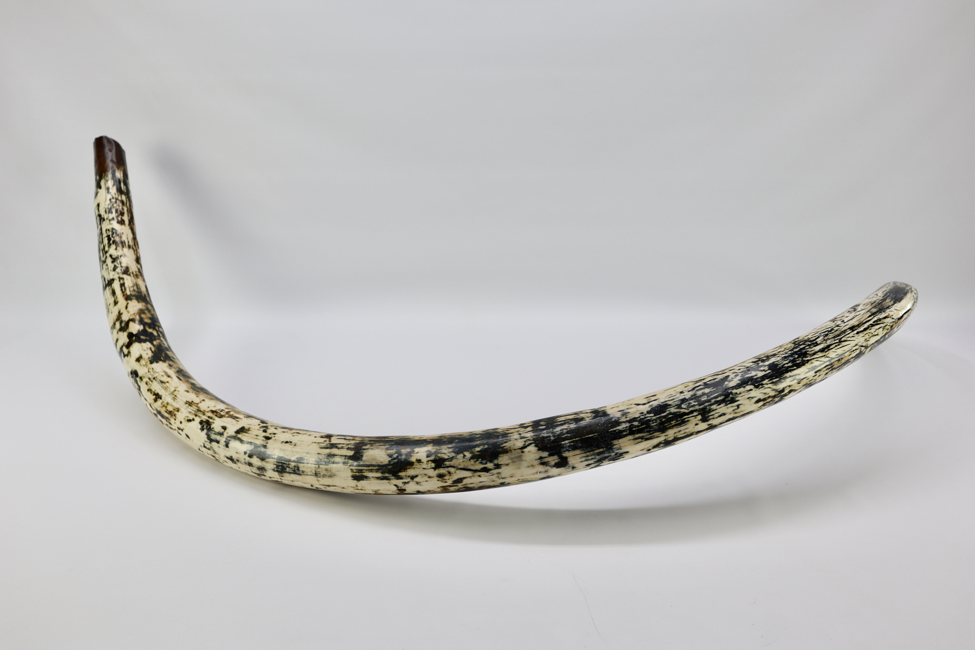 On offer is a complete, superb and very beautiful tusk of a Woolly Mammoth from the Pleistocene era. The tusk measures over 264ย cm (103.8 in) over the curve and is an exceptionally large and truly marvellous piece. The item has a beautiful curve and on top of that has some absolutely stunning white, grey, brown, gold and even some very beautiful and rare blue colouring and stunning patterning. The item will not only be the jewel of your collection, but will also make for a very impressive addition to your home. The pictures speak for themselves! This tusk would have belonged to an adult female Mammoth which was around 60 years of age at the time of death, and is in truly remarkable intact condition. No restoration whatsoever. Most interesting piece. This piece is truly exceptional and of great beauty which makes this a museum quality tusk. A matt finish has been applied to this piece, but it is also possible to order it with a glossy finish.