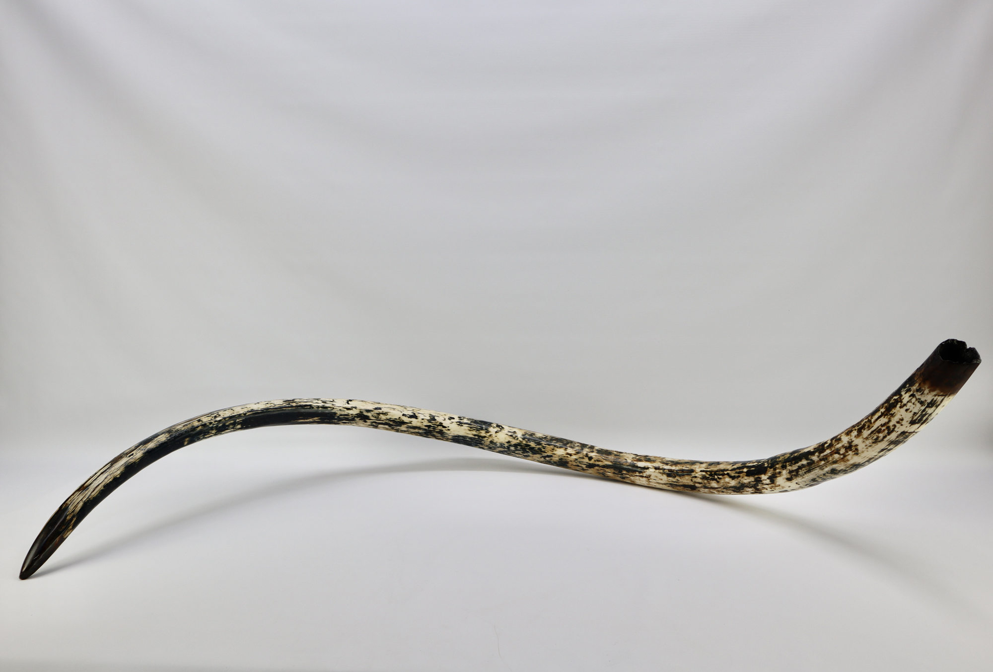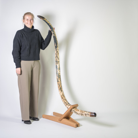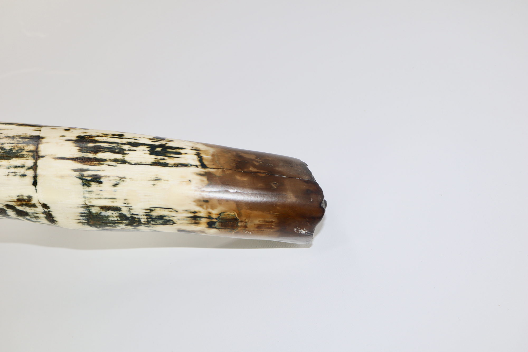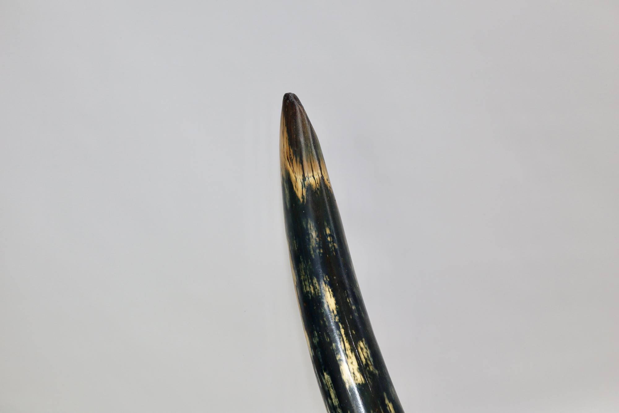 On offer is a complete, superb and very beautiful tusk of a Woolly Mammoth from the Pleistocene era. The tusk measures over 264ย cm (103.8 in) over the curve and is an exceptionally large and truly marvellous piece. The item has a beautiful curve and on top of that has some absolutely stunning white, grey, brown, gold and even some very beautiful and rare blue colouring and stunning patterning. The item will not only be the jewel of your collection, but will also make for a very impressive addition to your home. The pictures speak for themselves! This tusk would have belonged to an adult female Mammoth which was around 60 years of age at the time of death, and is in truly remarkable intact condition. No restoration whatsoever. Most interesting piece. This piece is truly exceptional and of great beauty which makes this a museum quality tusk. A matt finish has been applied to this piece, but it is also possible to order it with a glossy finish.