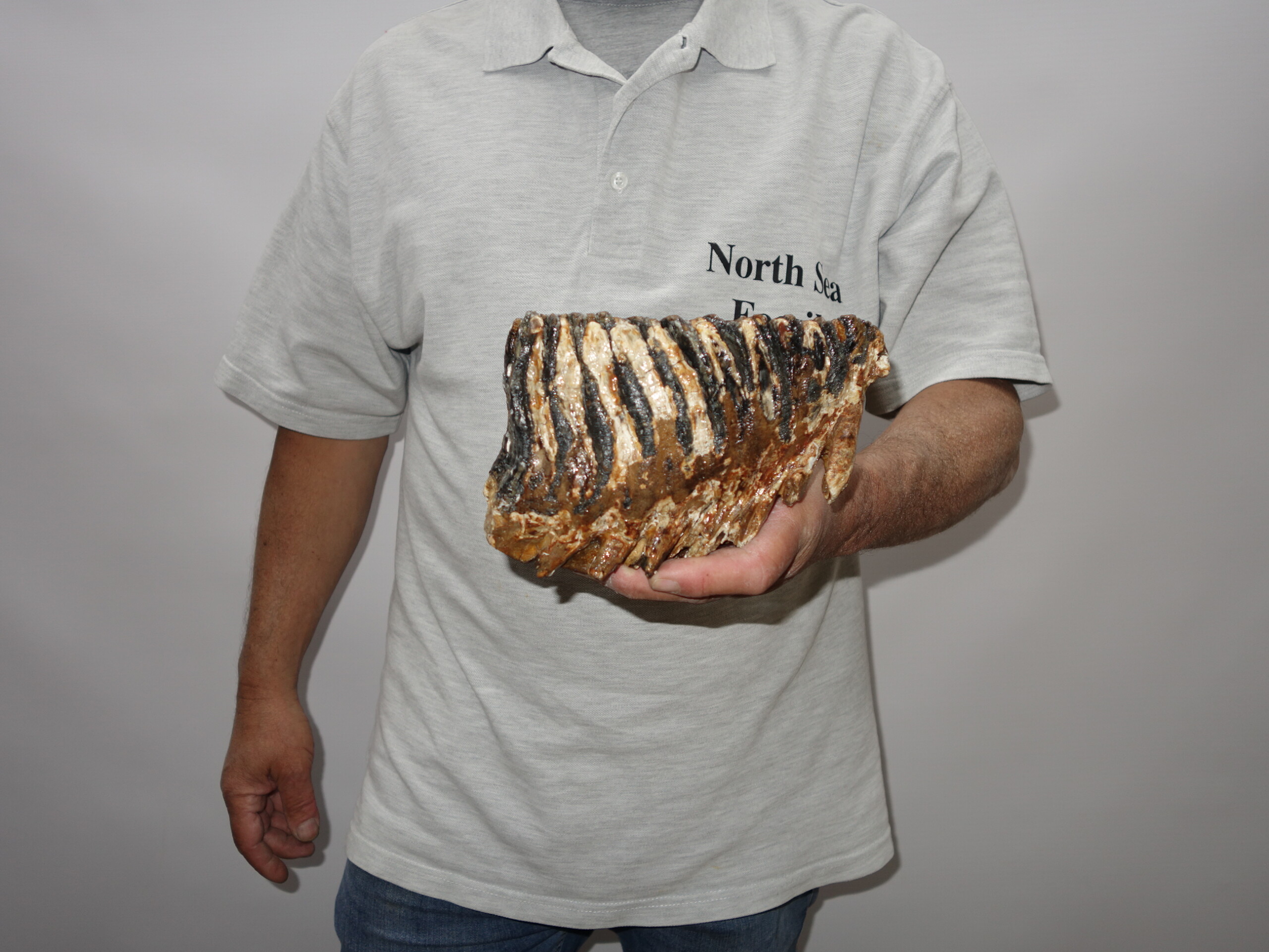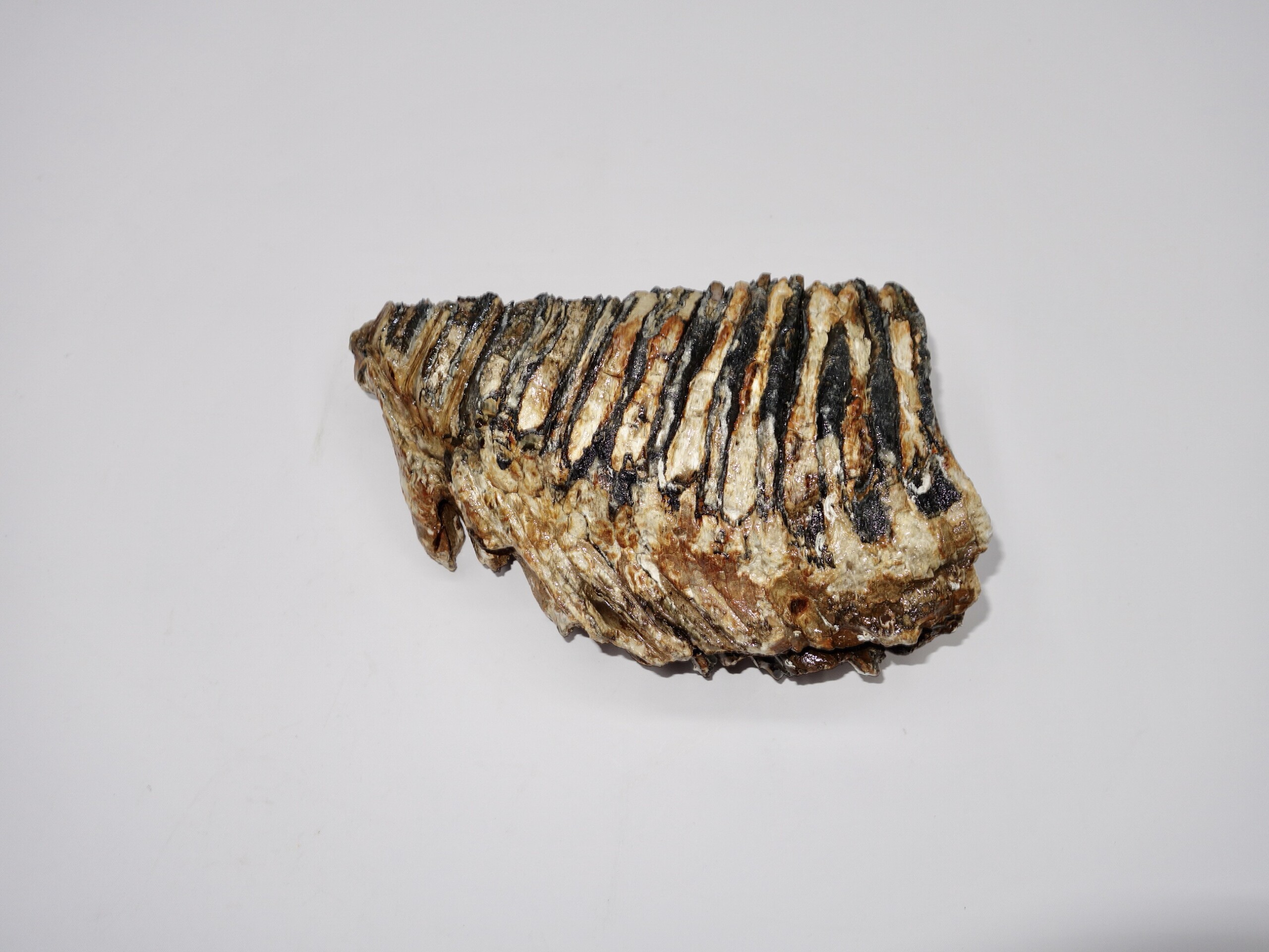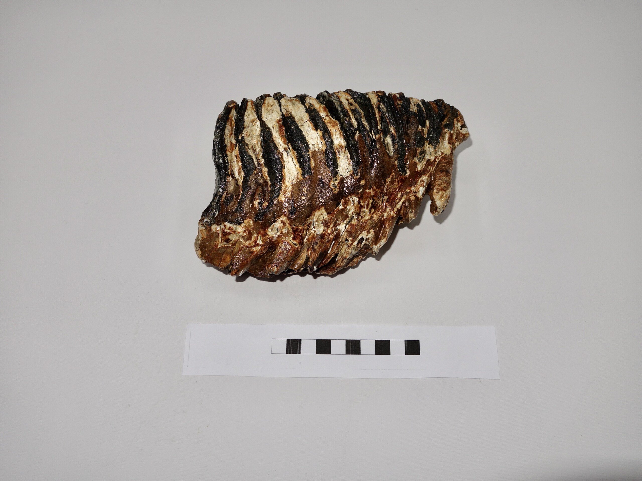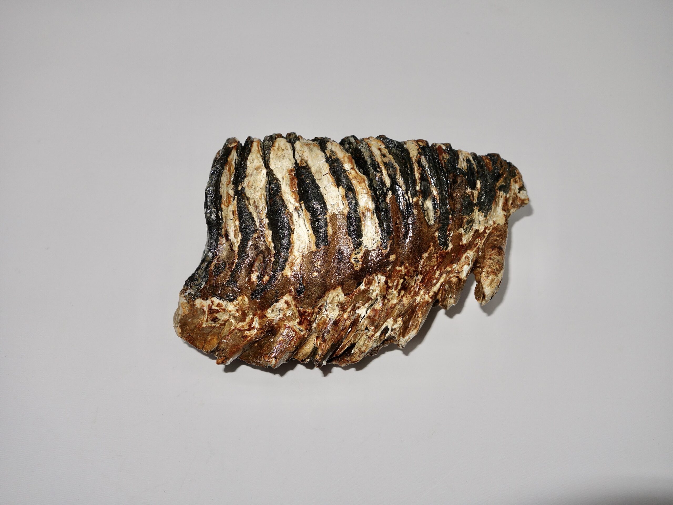 On offer is a nice partial M3 molar of an adult Woolly Mammoth from the Pleistocene era. This molar comes from the left lower jaw. This is in partial condition, missing a few ridges, but still a nice fossil, as seen in the images. No restoration whatsoever. The black and white section of the ruler in the image represents 10 cm / 3.9 inch.