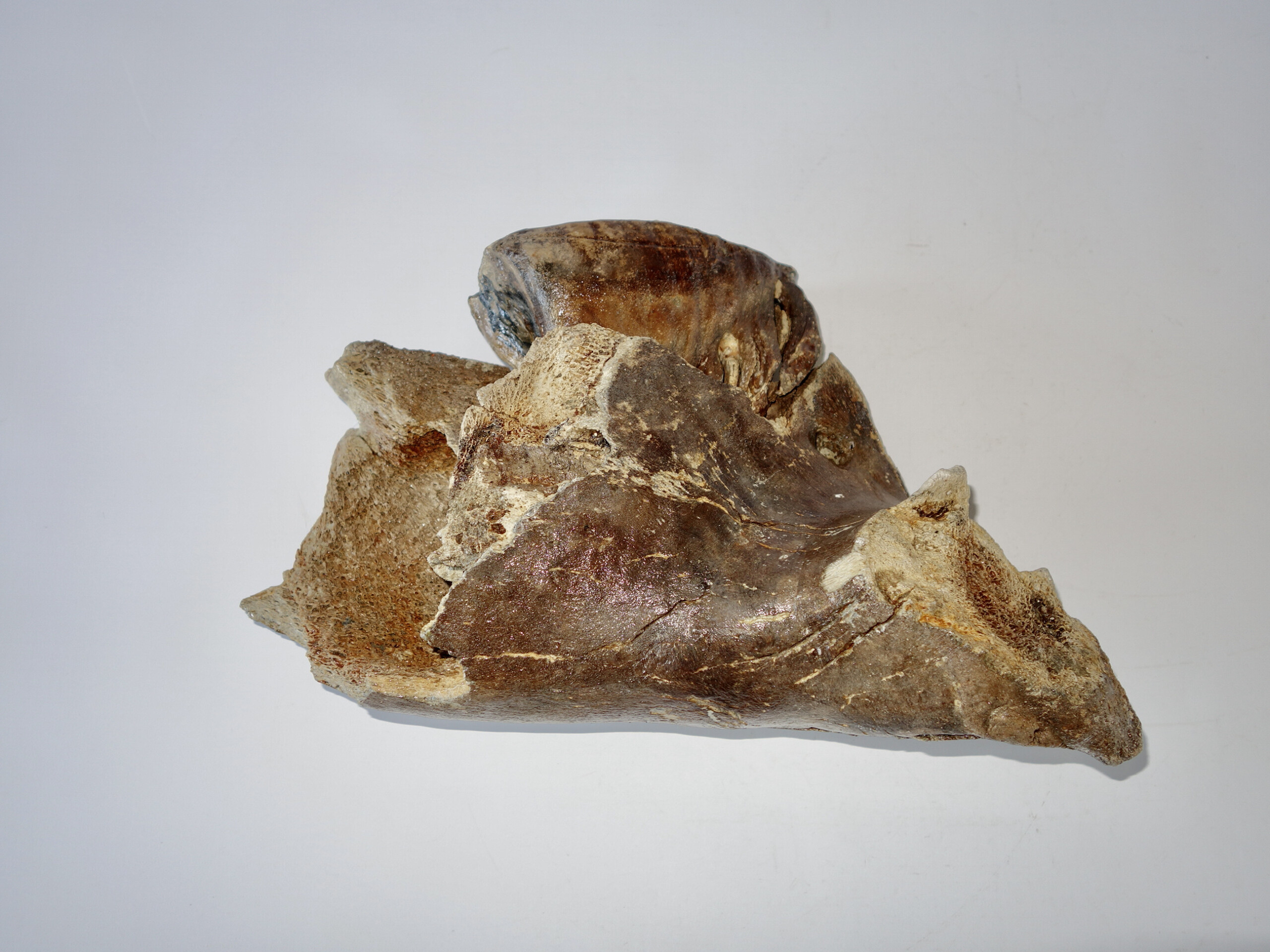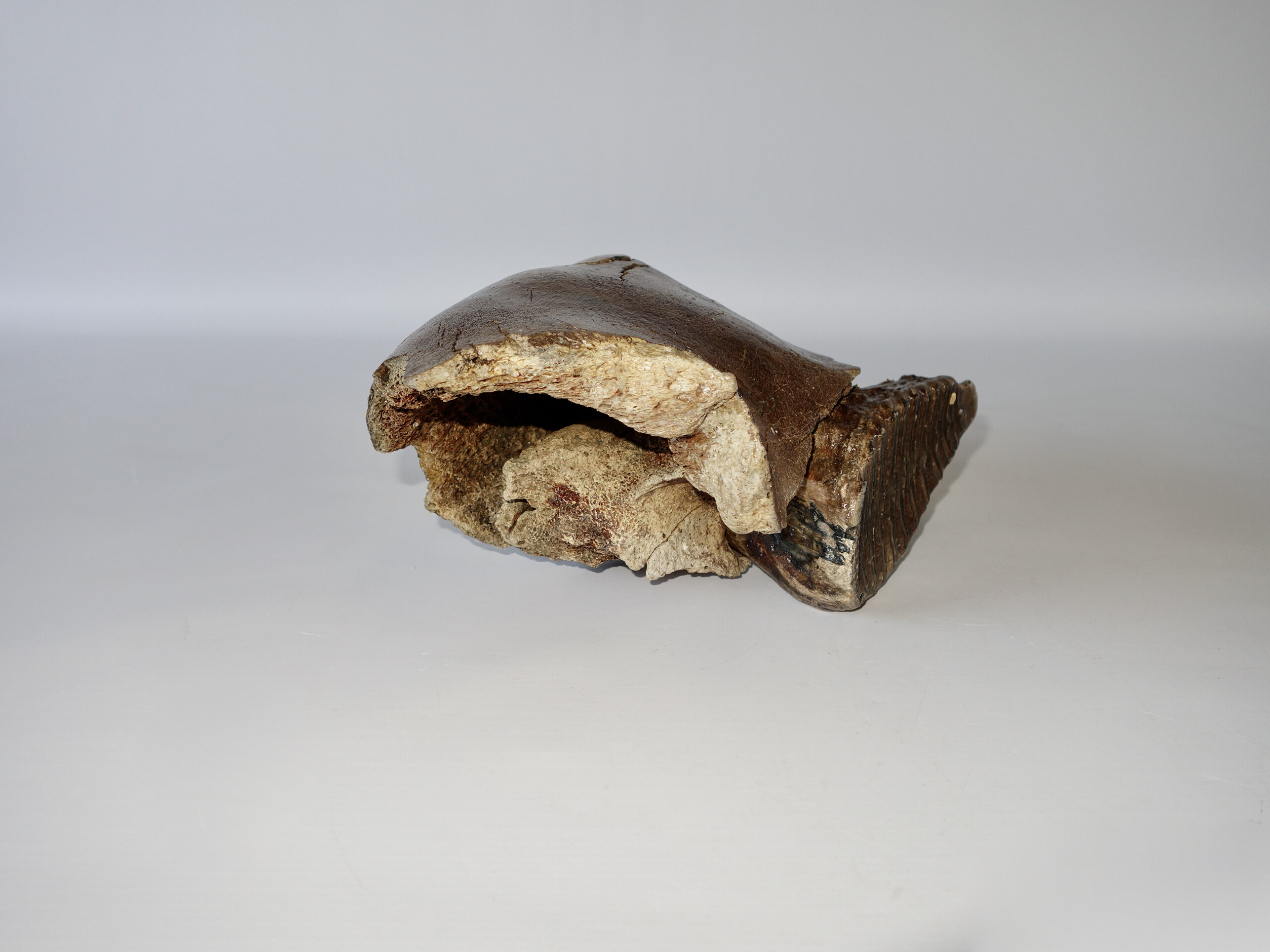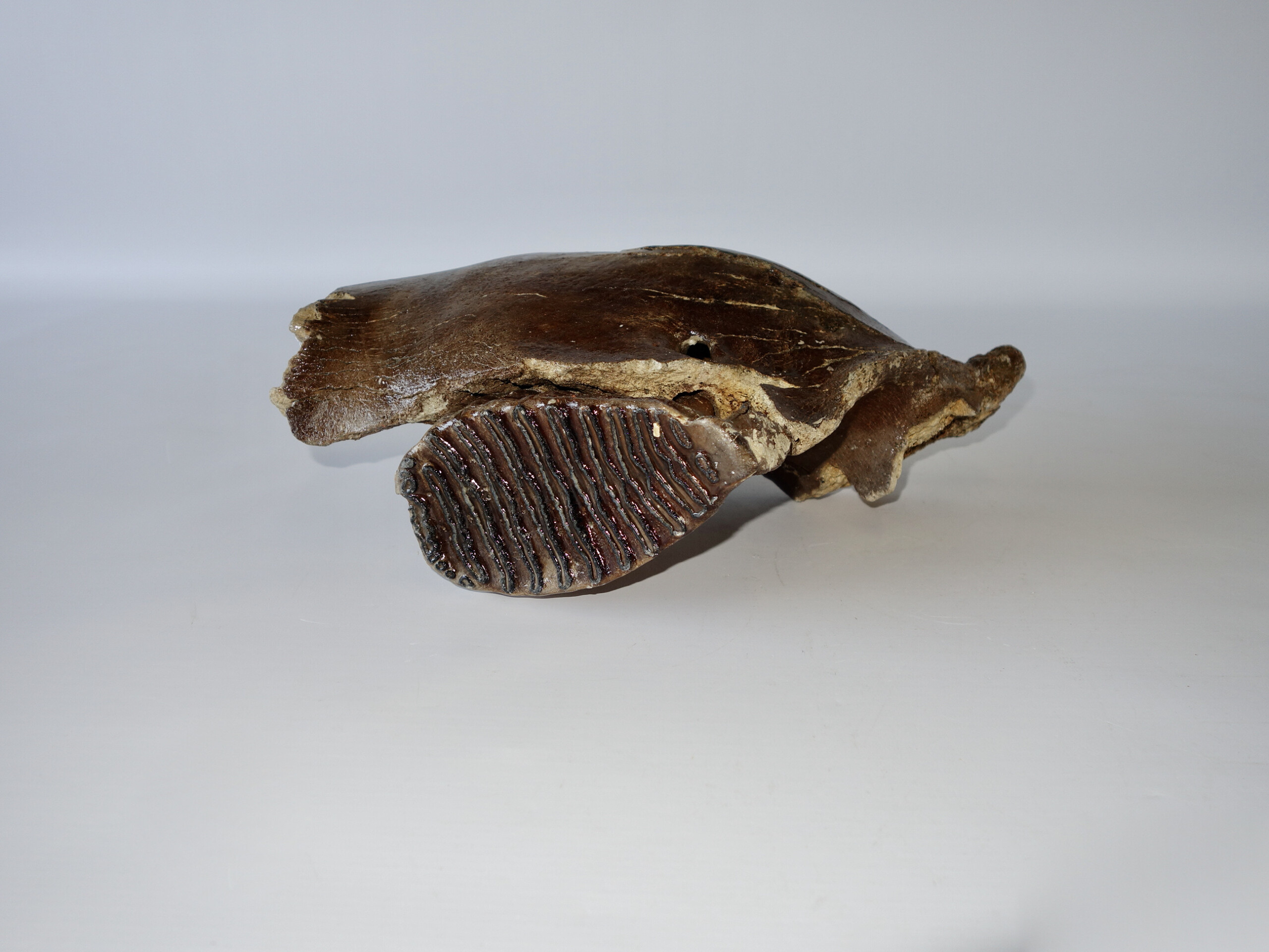 On offer is a partial lower jaw of a Woolly Mammoth from the Pleistocene era with a M2 molar still locked in the jaw tissue. This piece is well preserved as seen in the images. It must have come from an almost adult animal. The black and white section of the ruler in the image represents 10 cm / 3.9 inch.