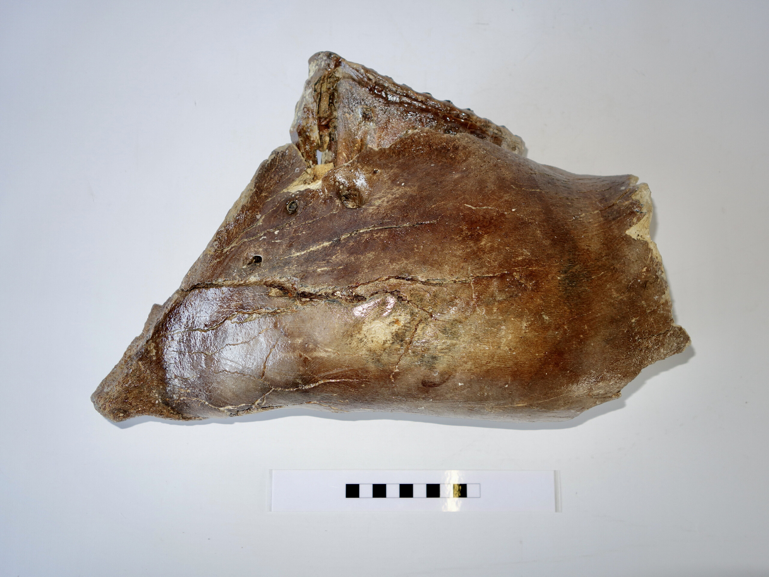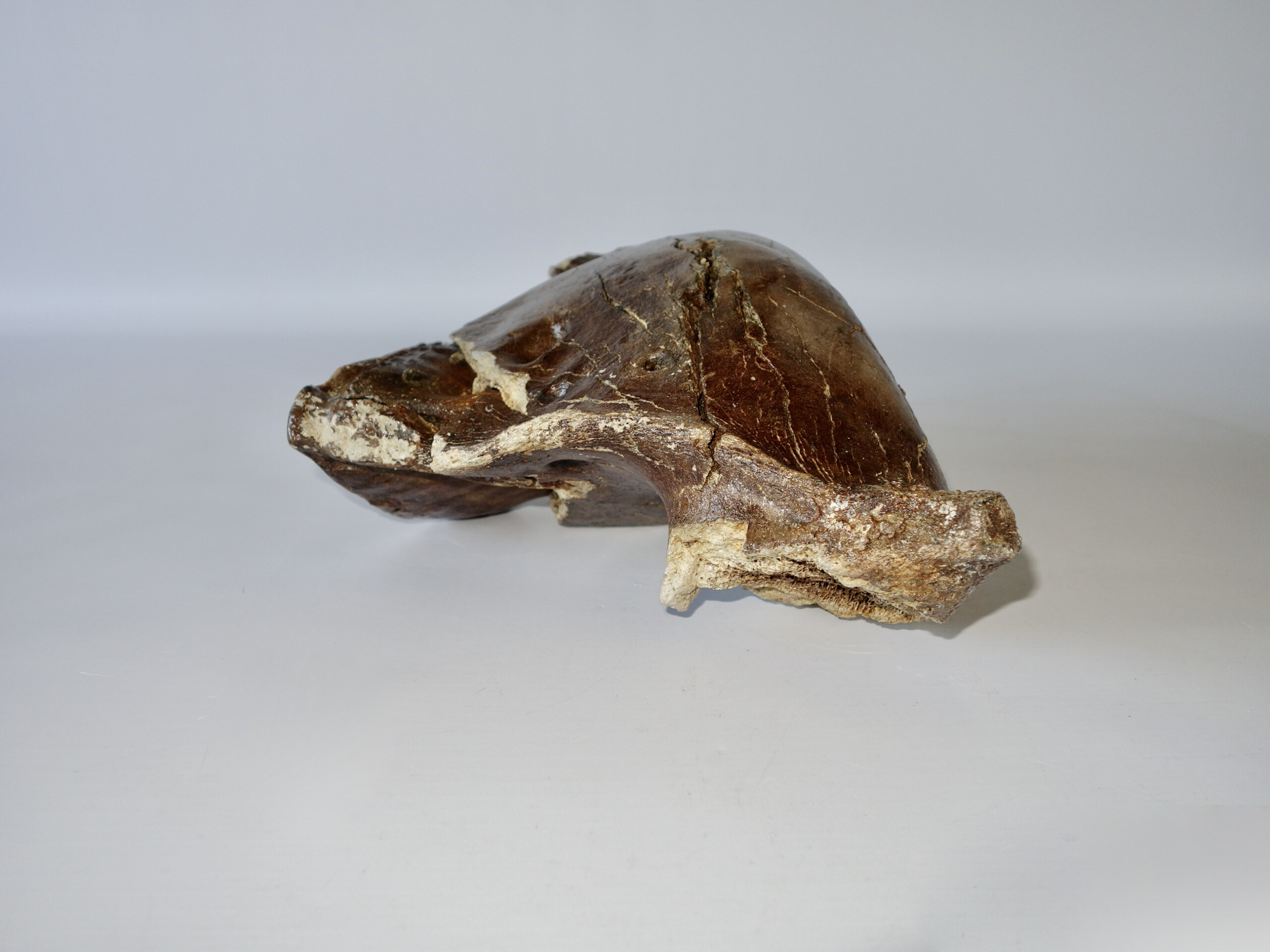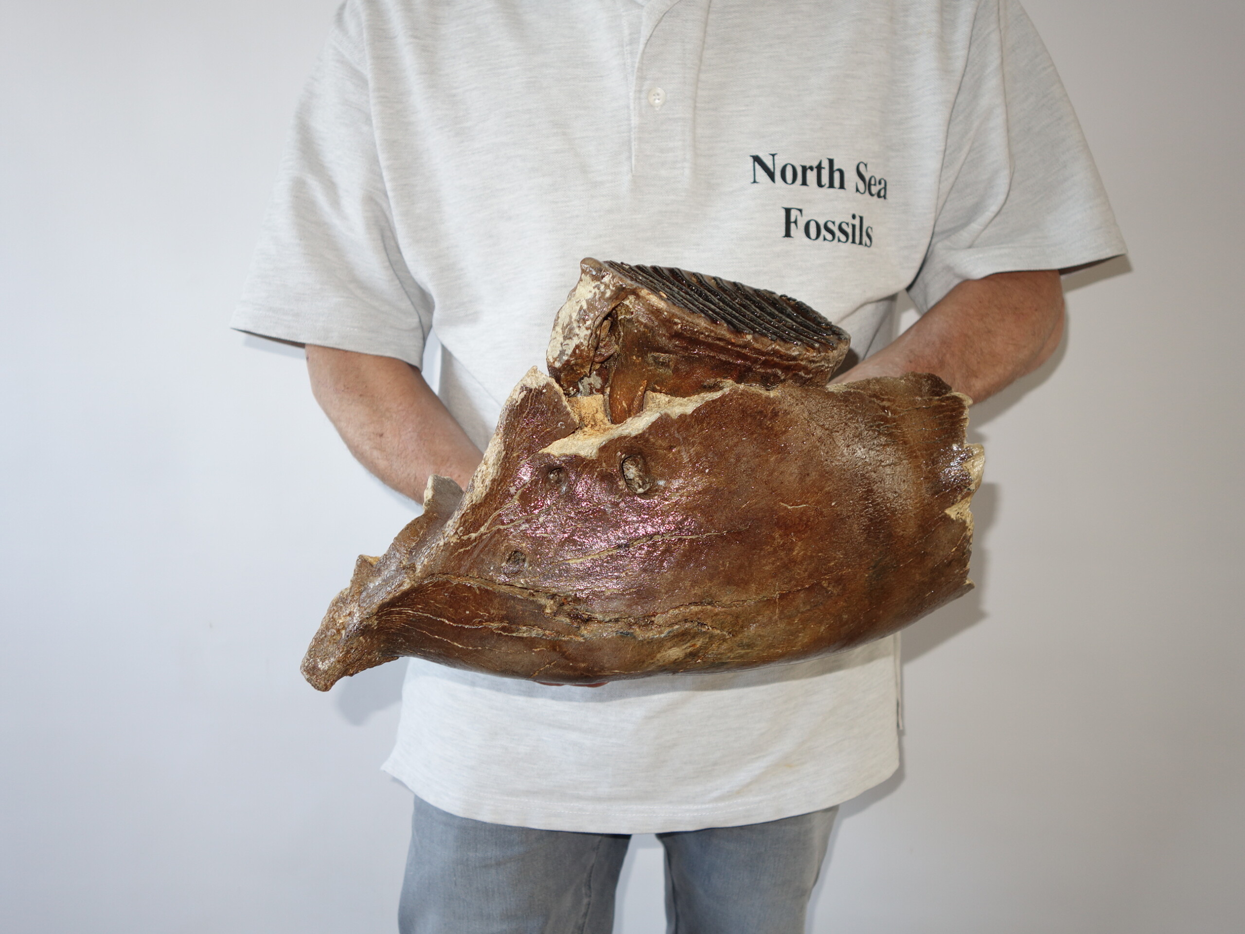 On offer is a partial lower jaw of a Woolly Mammoth from the Pleistocene era with a M2 molar still locked in the jaw tissue. This piece is well preserved as seen in the images. It must have come from an almost adult animal. The black and white section of the ruler in the image represents 10 cm / 3.9 inch.