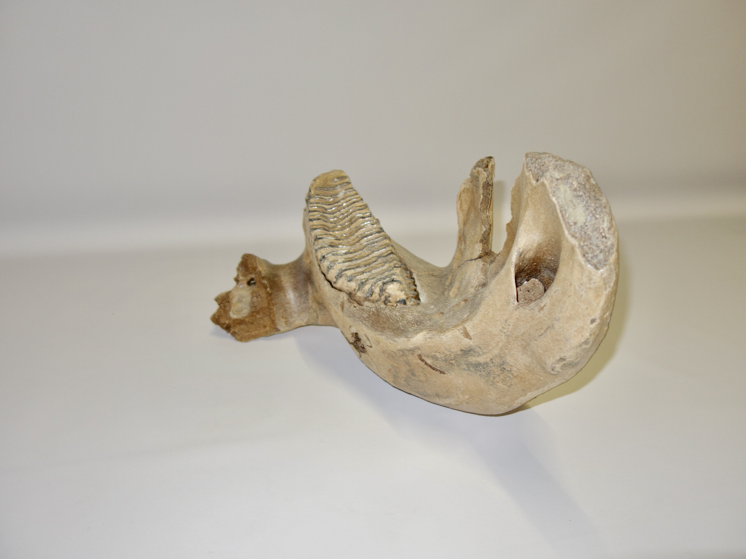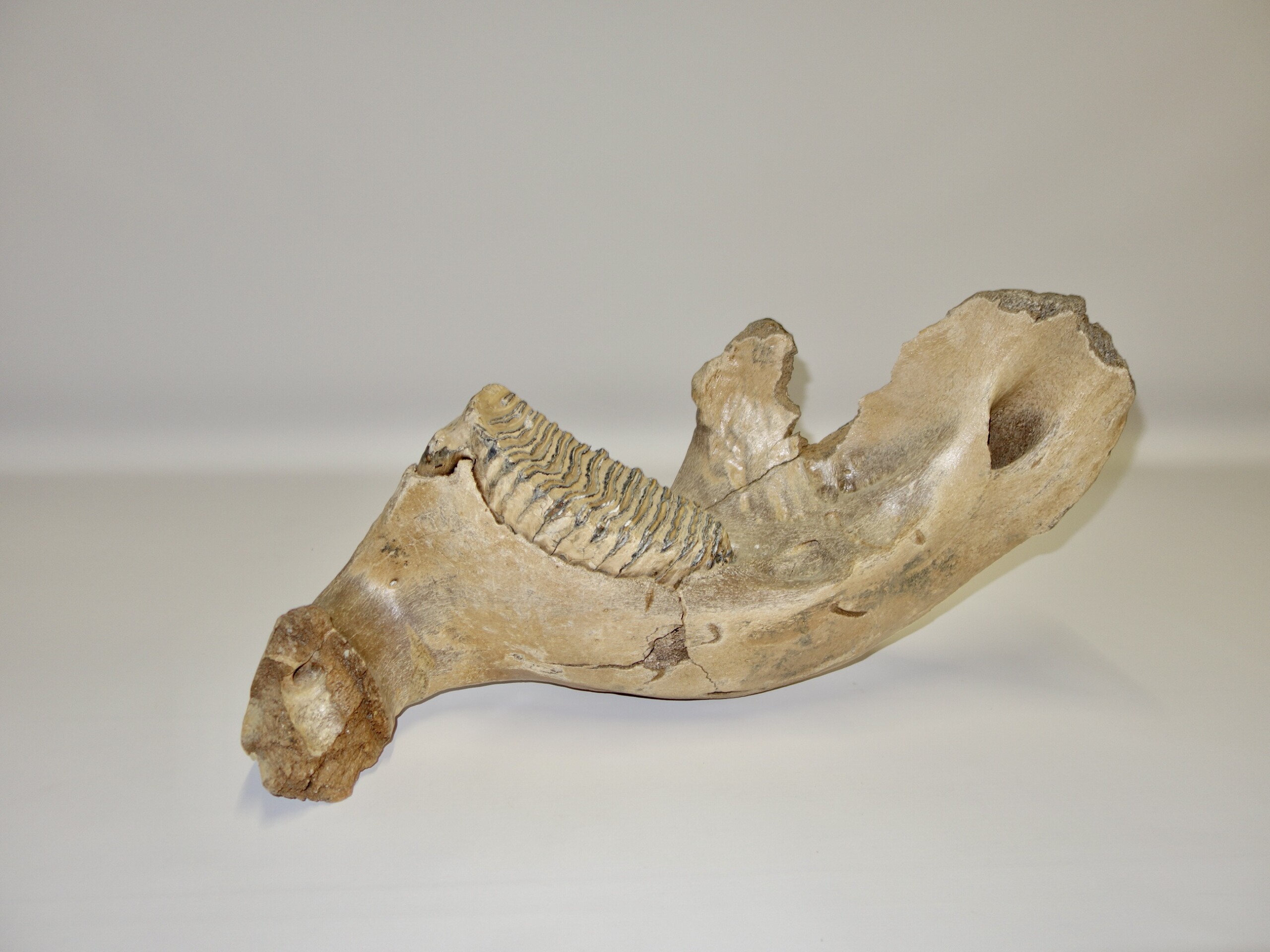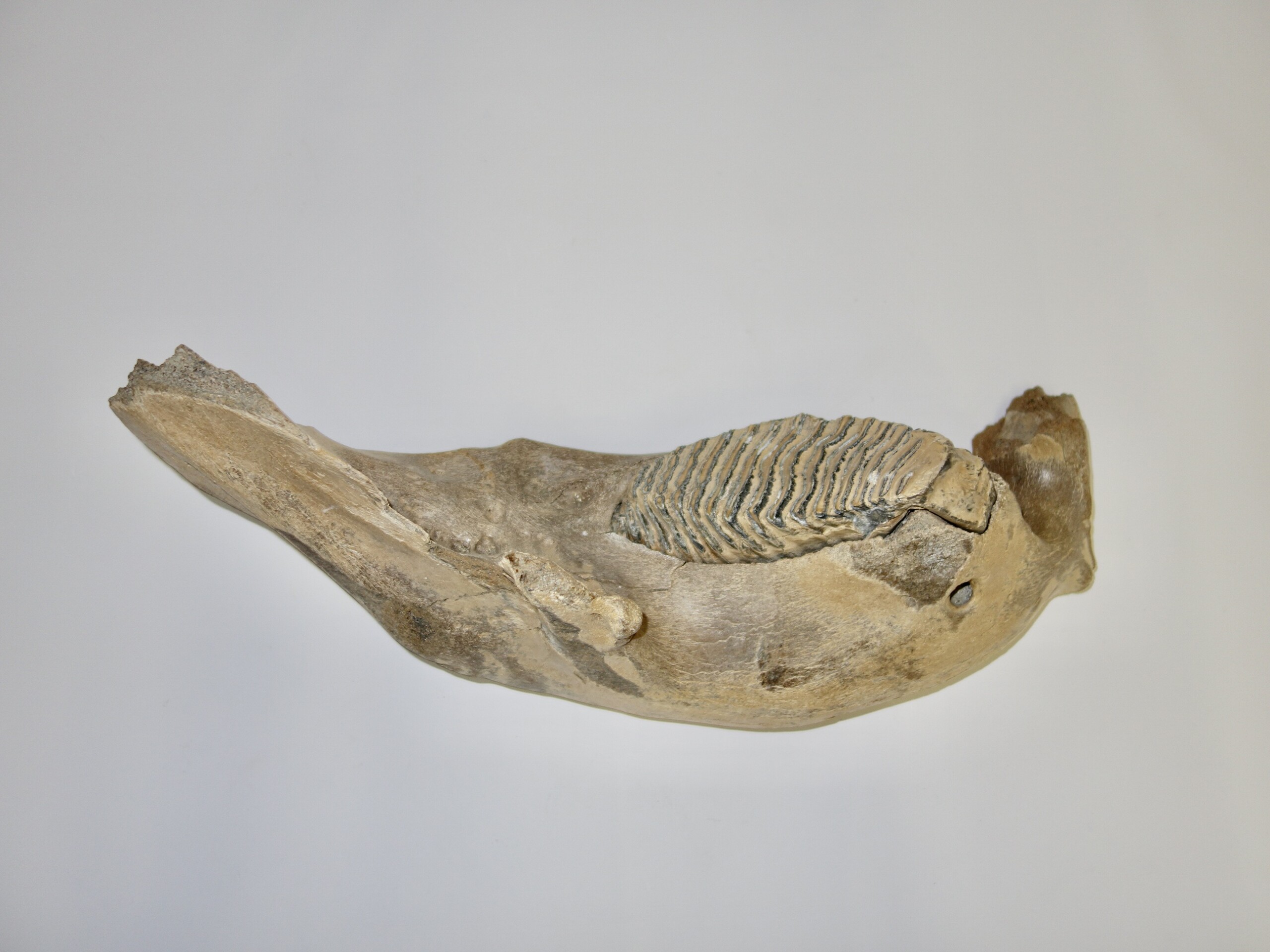 On offer is a partial lower jaw of an adult Woolly Mammoth from the Pleistocene era with a good and large M3 molar still locked in the jaw tissue. The piece is not completely intact, but otherwise still in good condition, as seen in the images, with the molar surviving in wonderful condition. No restoration whatsoever. Judging from the size, this must have come from a fully grown adult animal. The black and white section of the ruler in the image represents 10 cm / 3.9 inch.