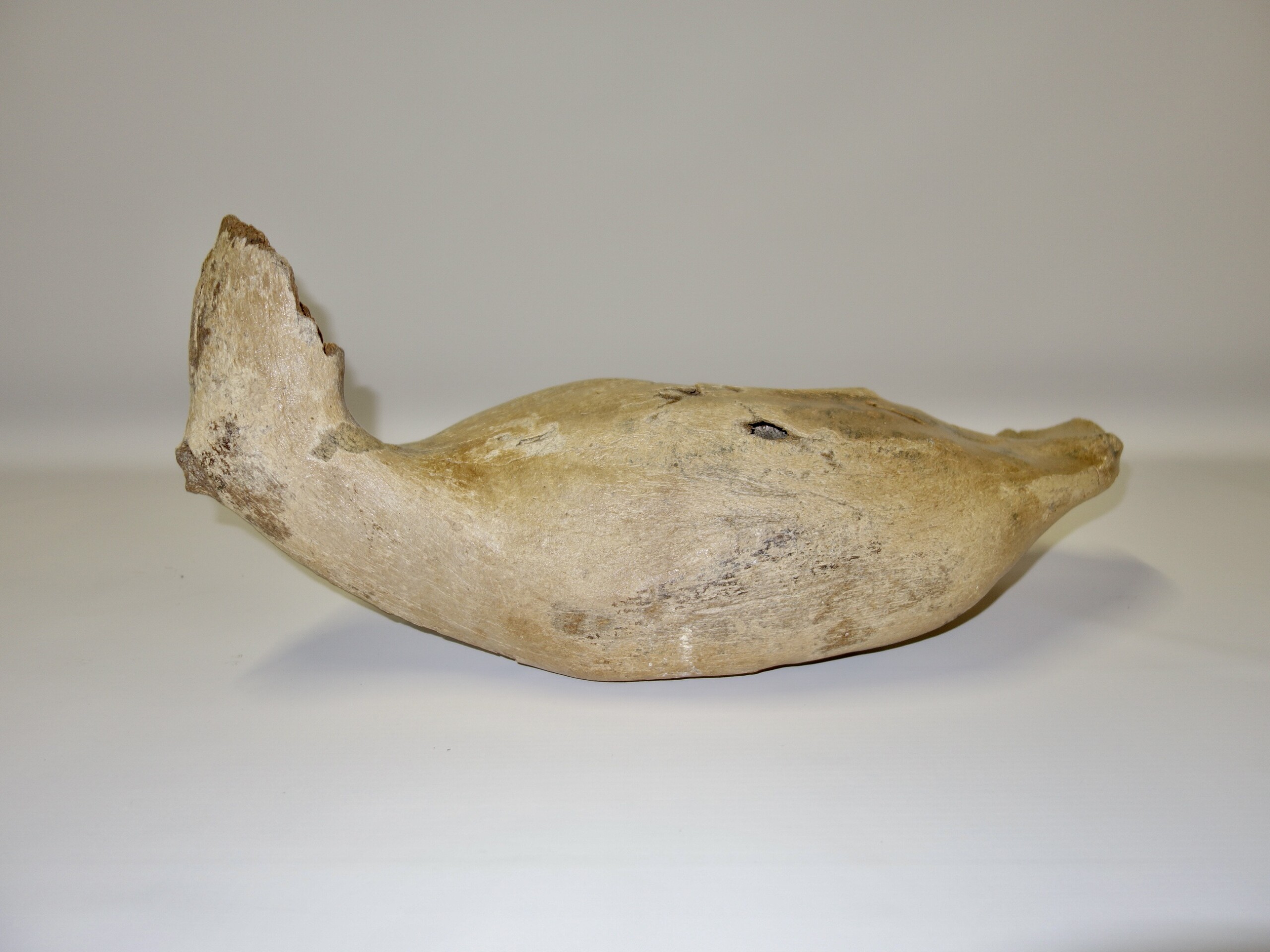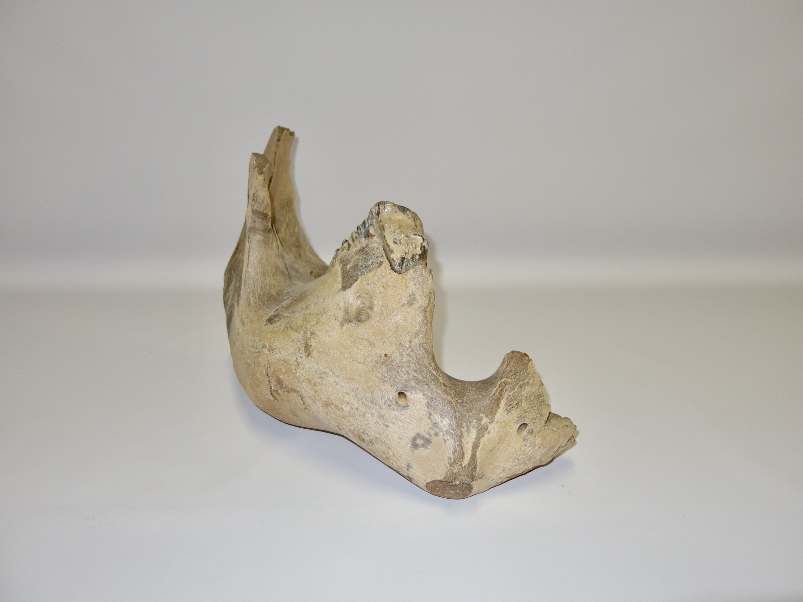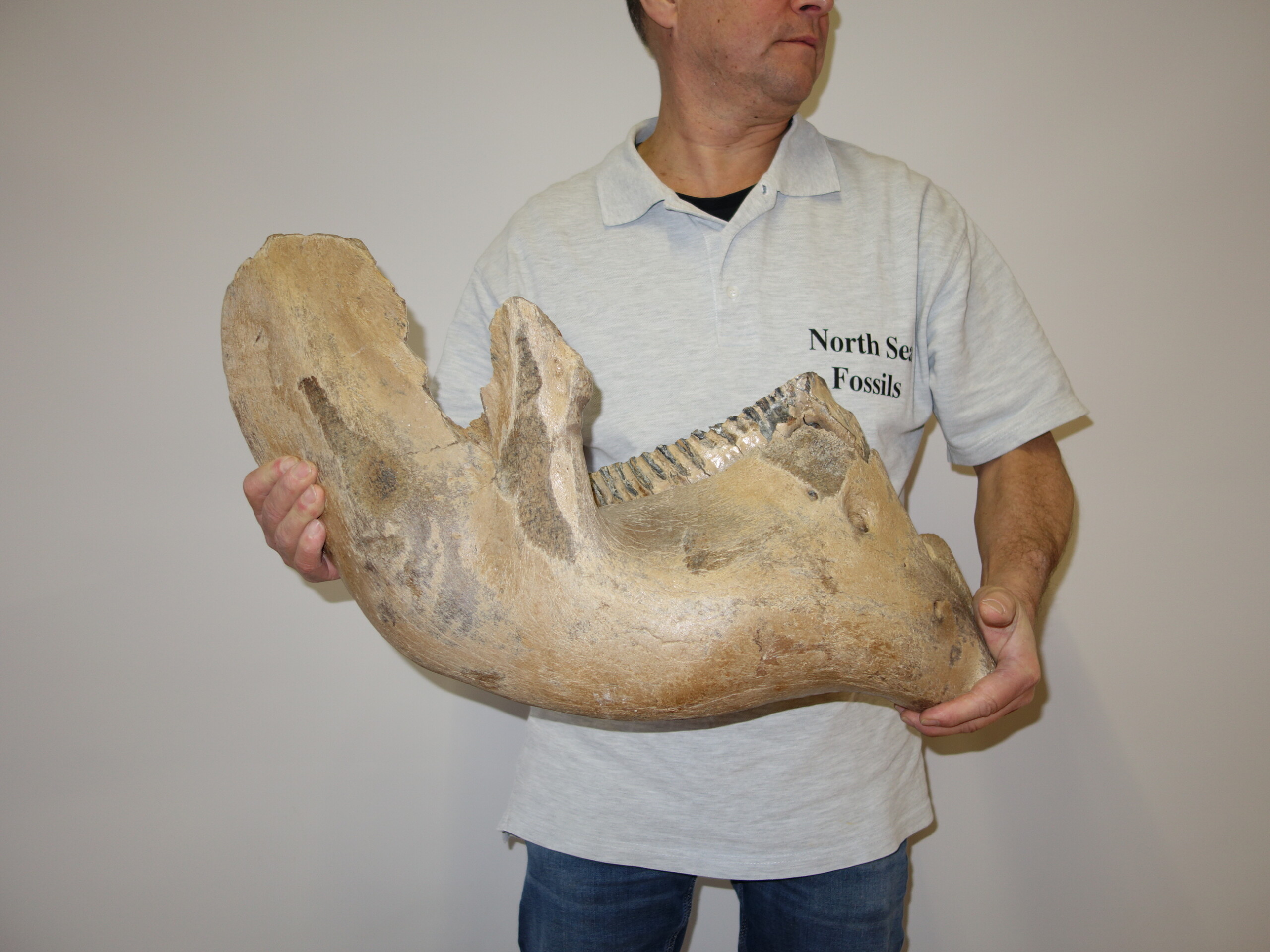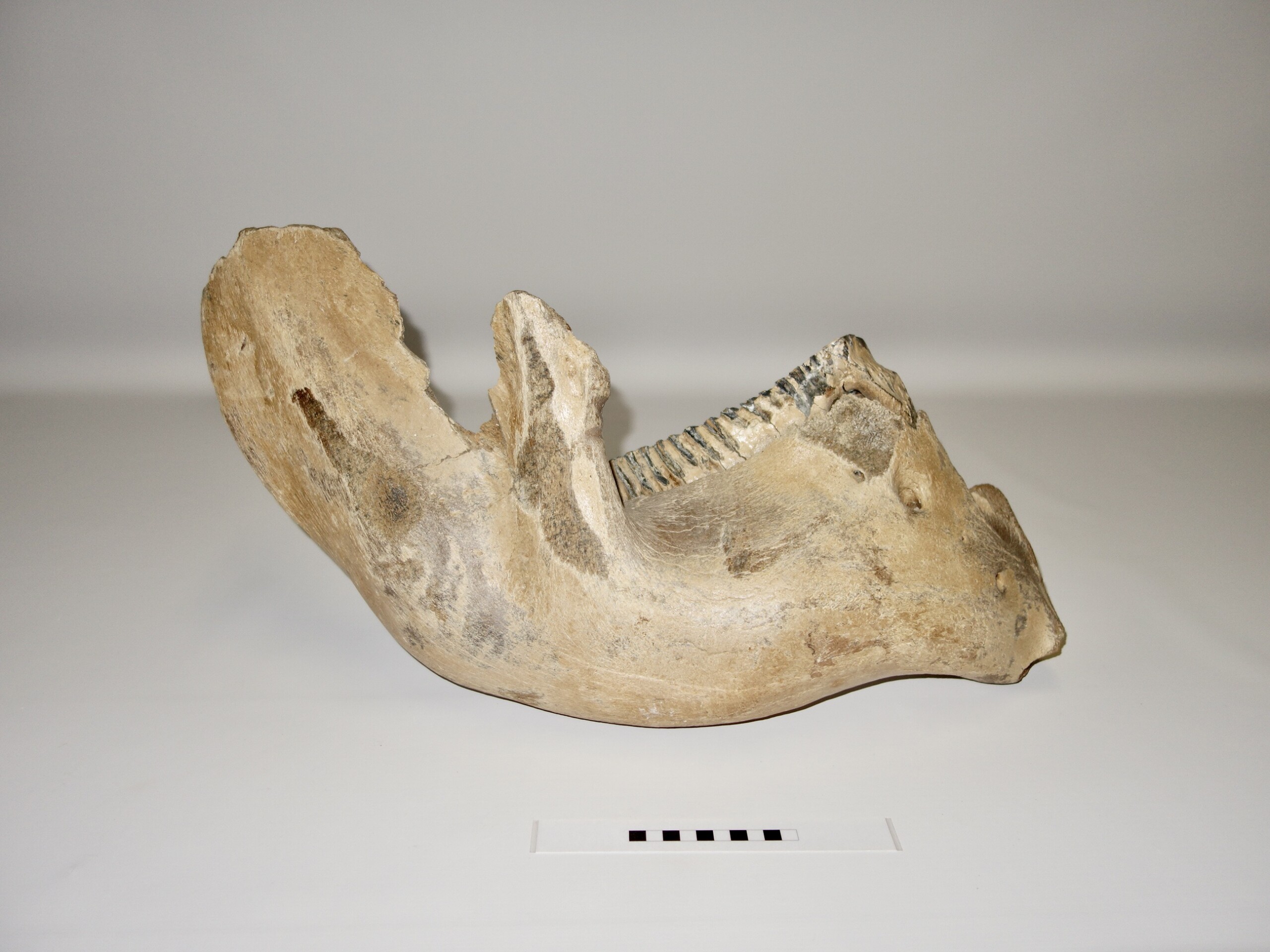 On offer is a partial lower jaw of an adult Woolly Mammoth from the Pleistocene era with a good and large M3 molar still locked in the jaw tissue. The piece is not completely intact, but otherwise still in good condition, as seen in the images, with the molar surviving in wonderful condition. No restoration whatsoever. Judging from the size, this must have come from a fully grown adult animal. The black and white section of the ruler in the image represents 10 cm / 3.9 inch.