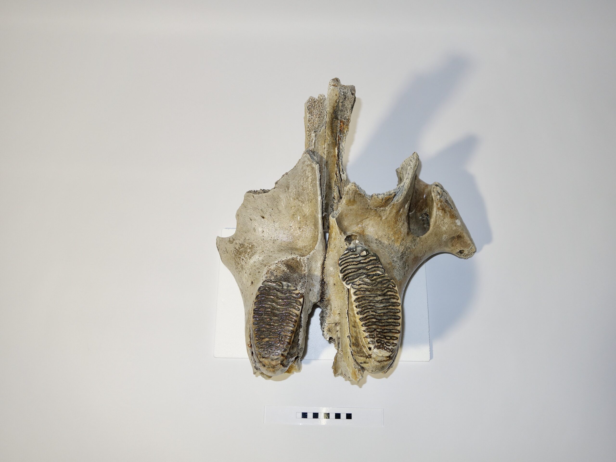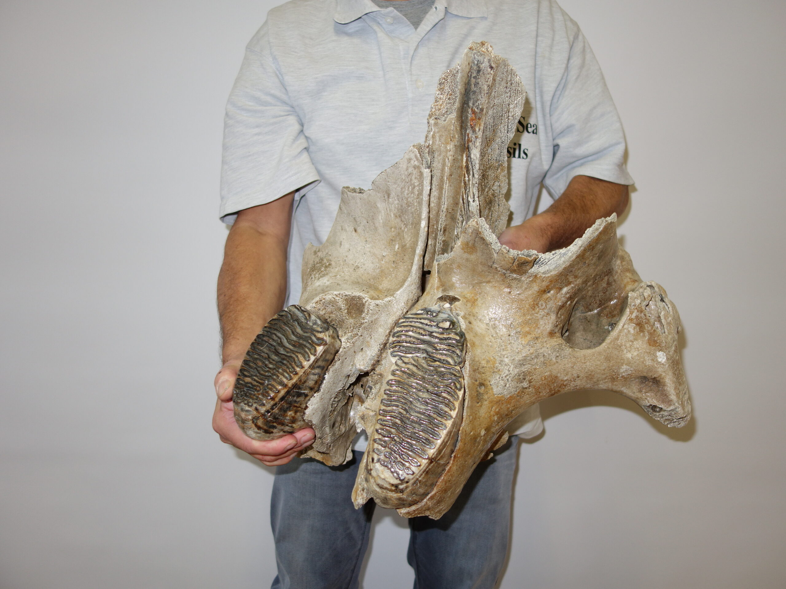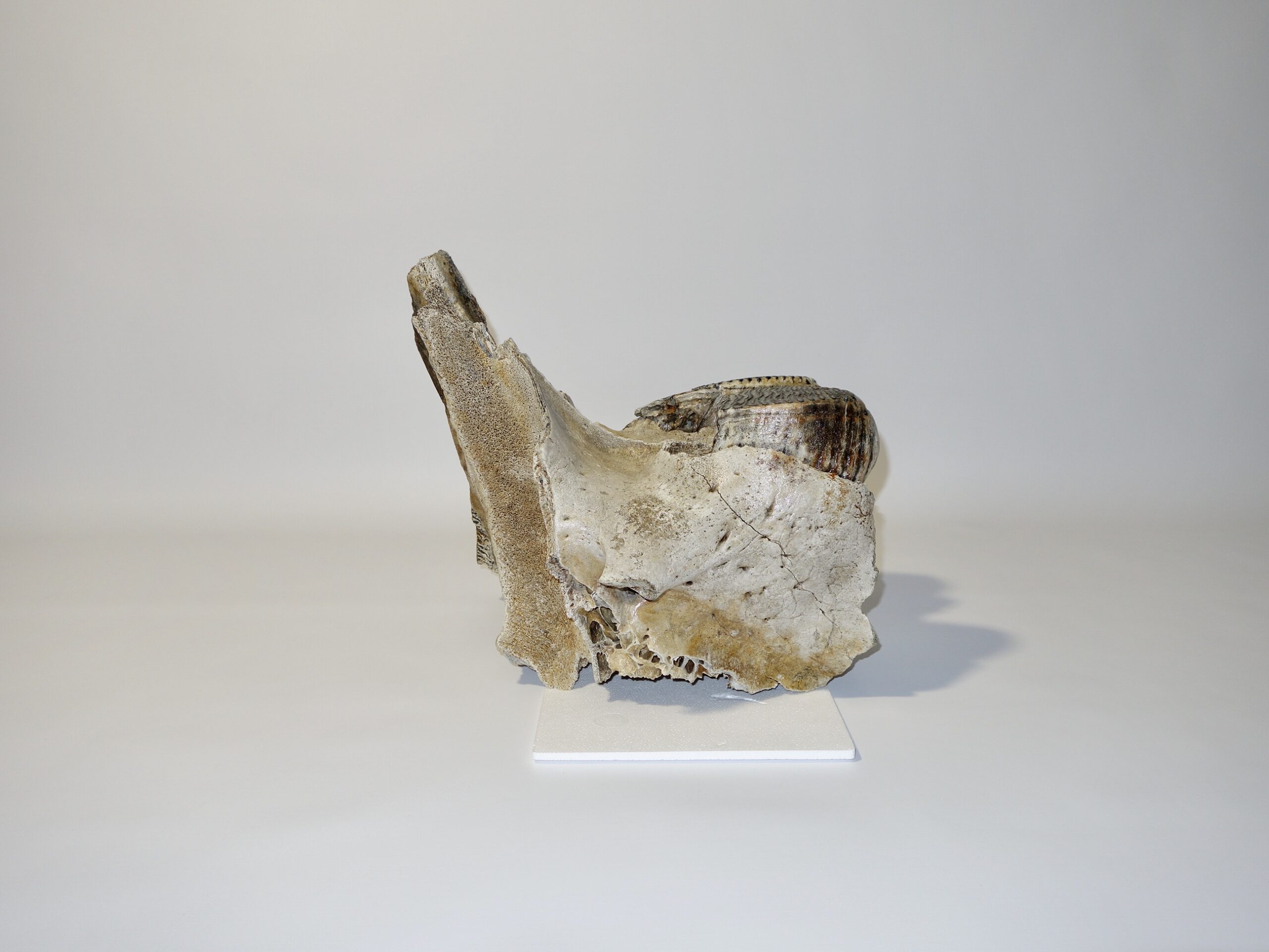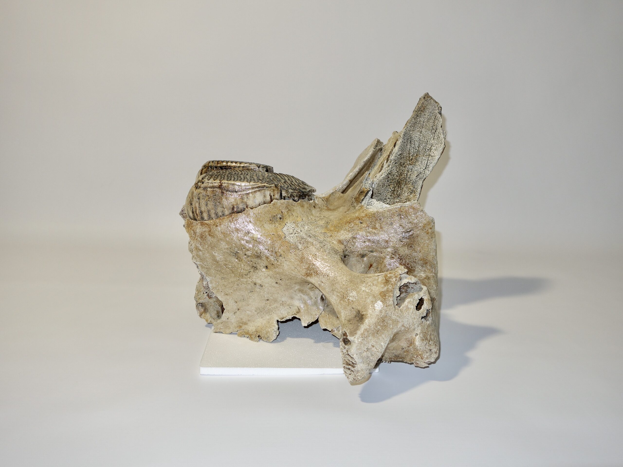 On offer is a wonderful partial skull including the partial upper jaw of a Woolly Mammoth. This piece includes one M1 molar and two M2 molars still locked in the jaw tissue. The molars have good chewing surfaces and beautiful colouring. Good state of preservation, as seen in the images. Interesting example that shows how the M1 molar was replaced by the M2 molar. This would have belonged to a juvenile Mammoth. The black and white section of the ruler in the image represents 10 cm / 3.9 inch.