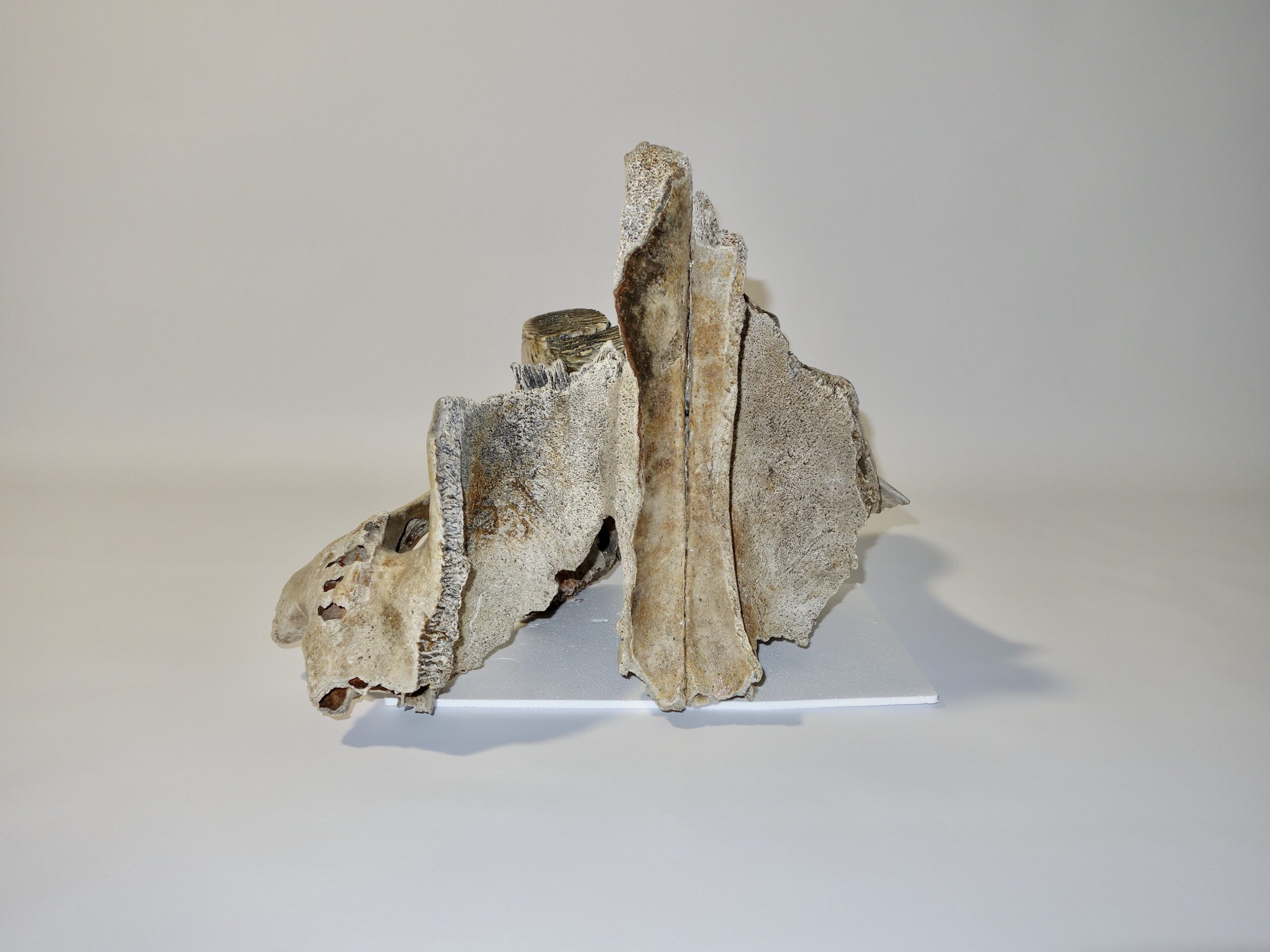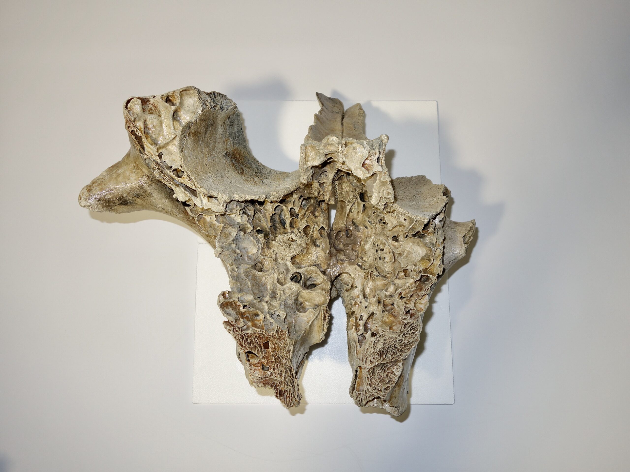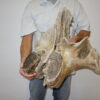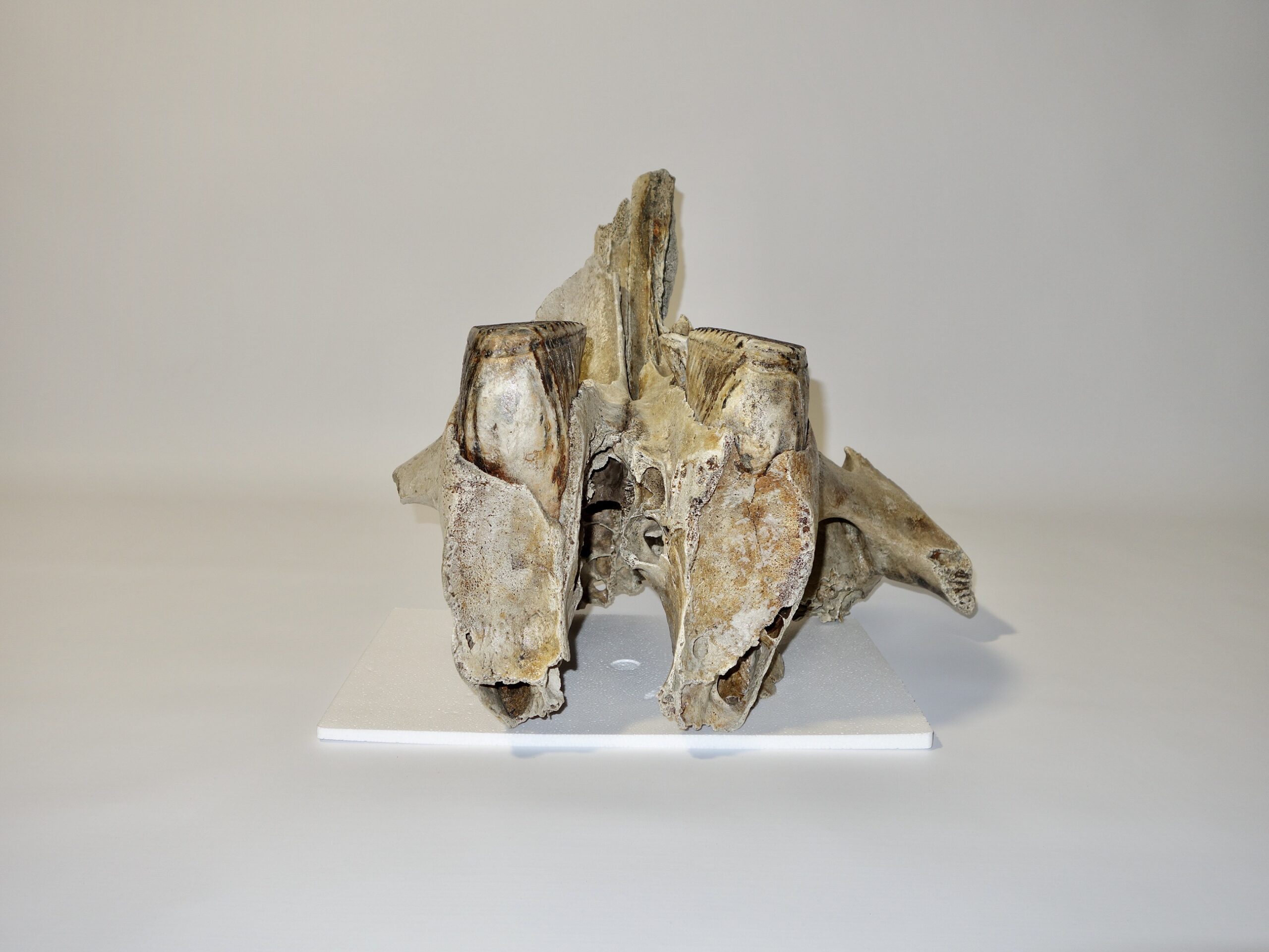 On offer is a wonderful partial skull including the partial upper jaw of a Woolly Mammoth. This piece includes one M1 molar and two M2 molars still locked in the jaw tissue. The molars have good chewing surfaces and beautiful colouring. Good state of preservation, as seen in the images. Interesting example that shows how the M1 molar was replaced by the M2 molar. This would have belonged to a juvenile Mammoth. The black and white section of the ruler in the image represents 10 cm / 3.9 inch.