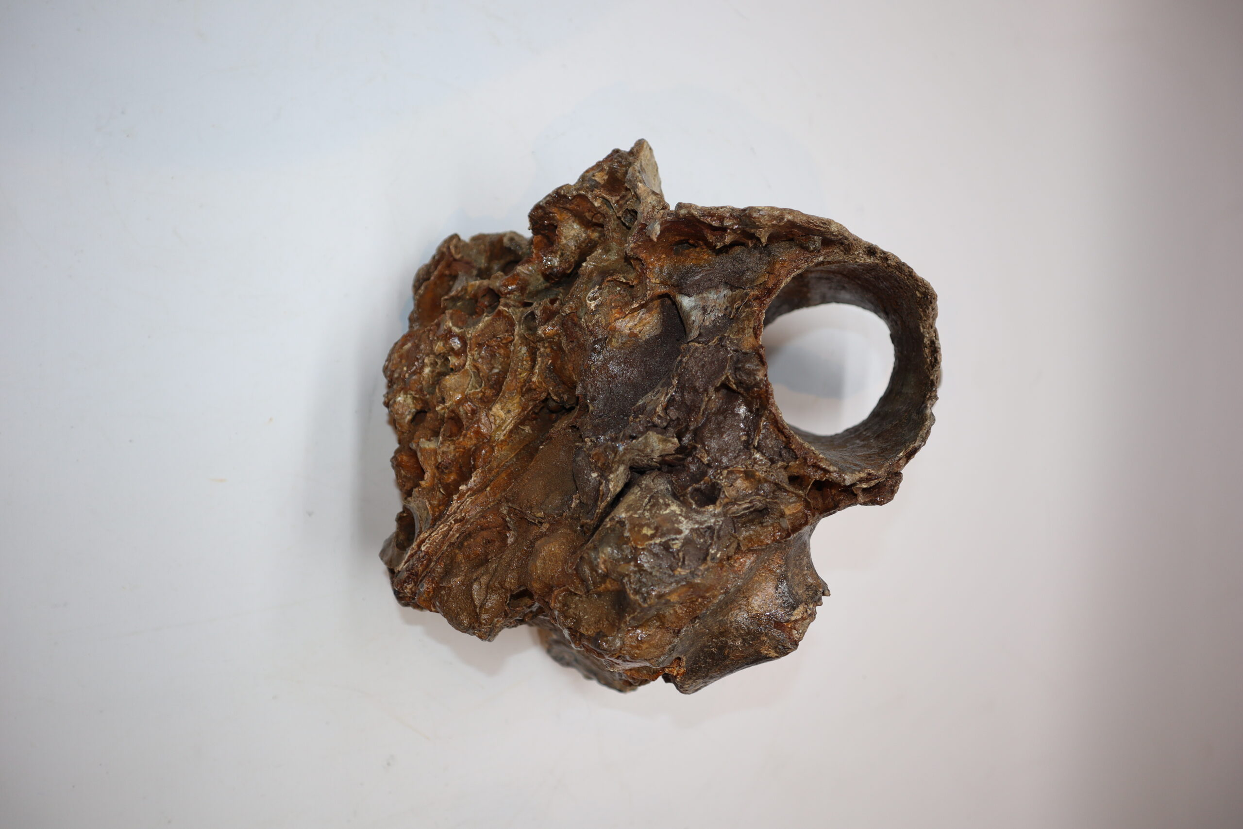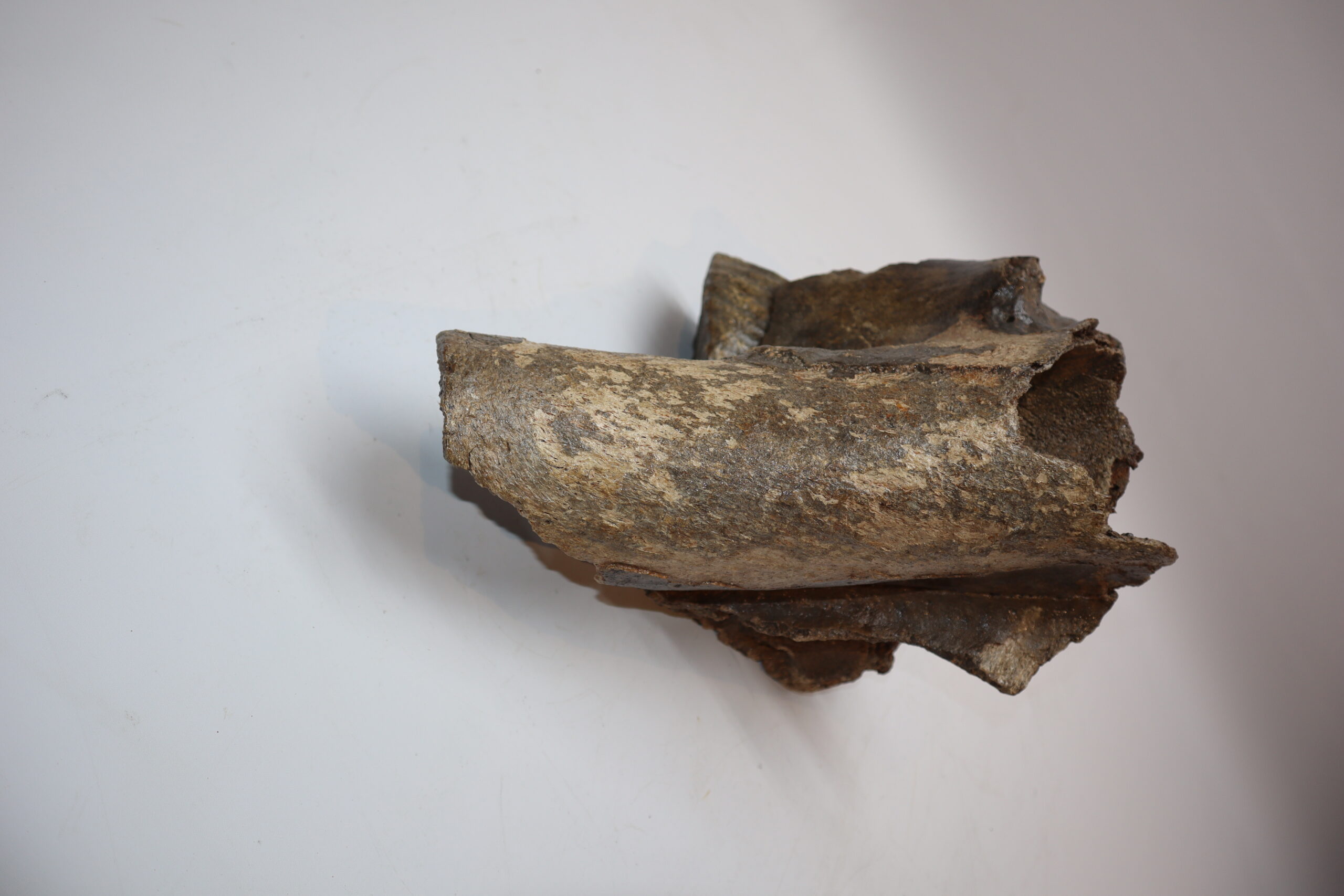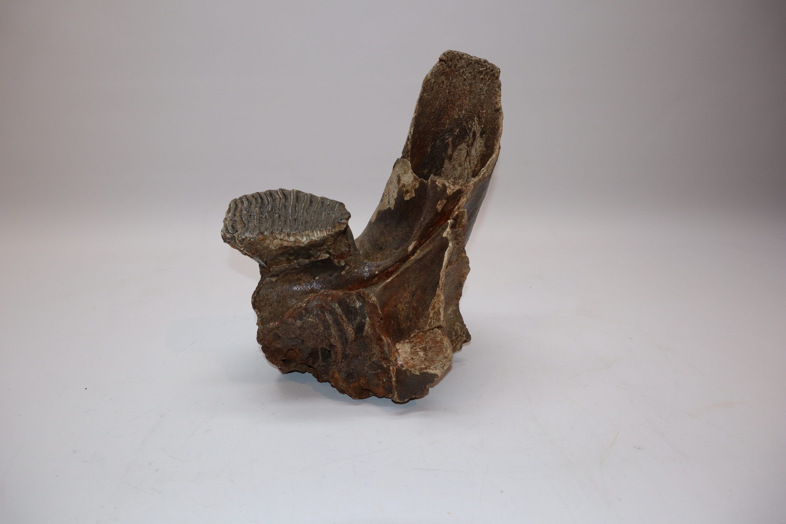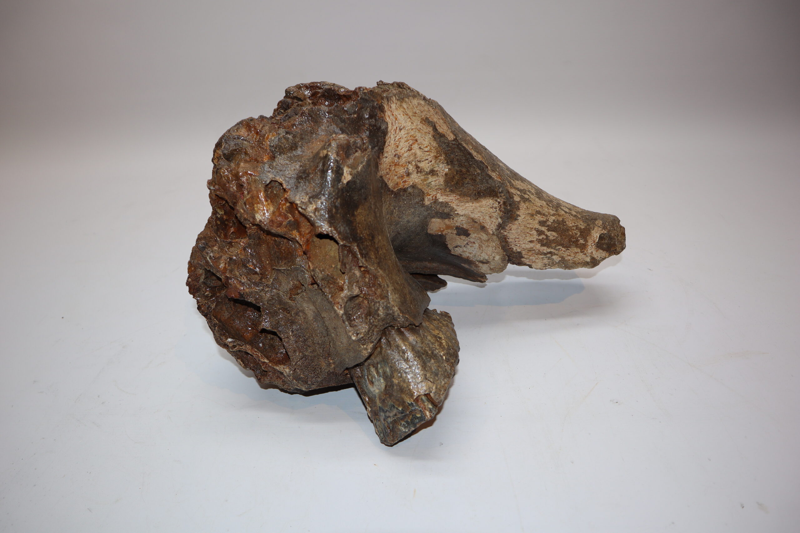 On offer is an interesting partial upper jaw of a juvenile Woolly Mammoth with a good M1 molar still locked in the jaw tissue, and also a partially surviving aviole, which contained the animals’s tusk. The piece must have come from a juvenile animal, judging from the size of the molar. These intricate fossils are almost never found intact, and although this is only a partial jaw it is well preserved with many details of anatomy still visible. No restoration whatsoever. The black and white section of the ruler in the image represents 10 cm / 3.9 inch. Very interesting shape and a work of art in its own right!