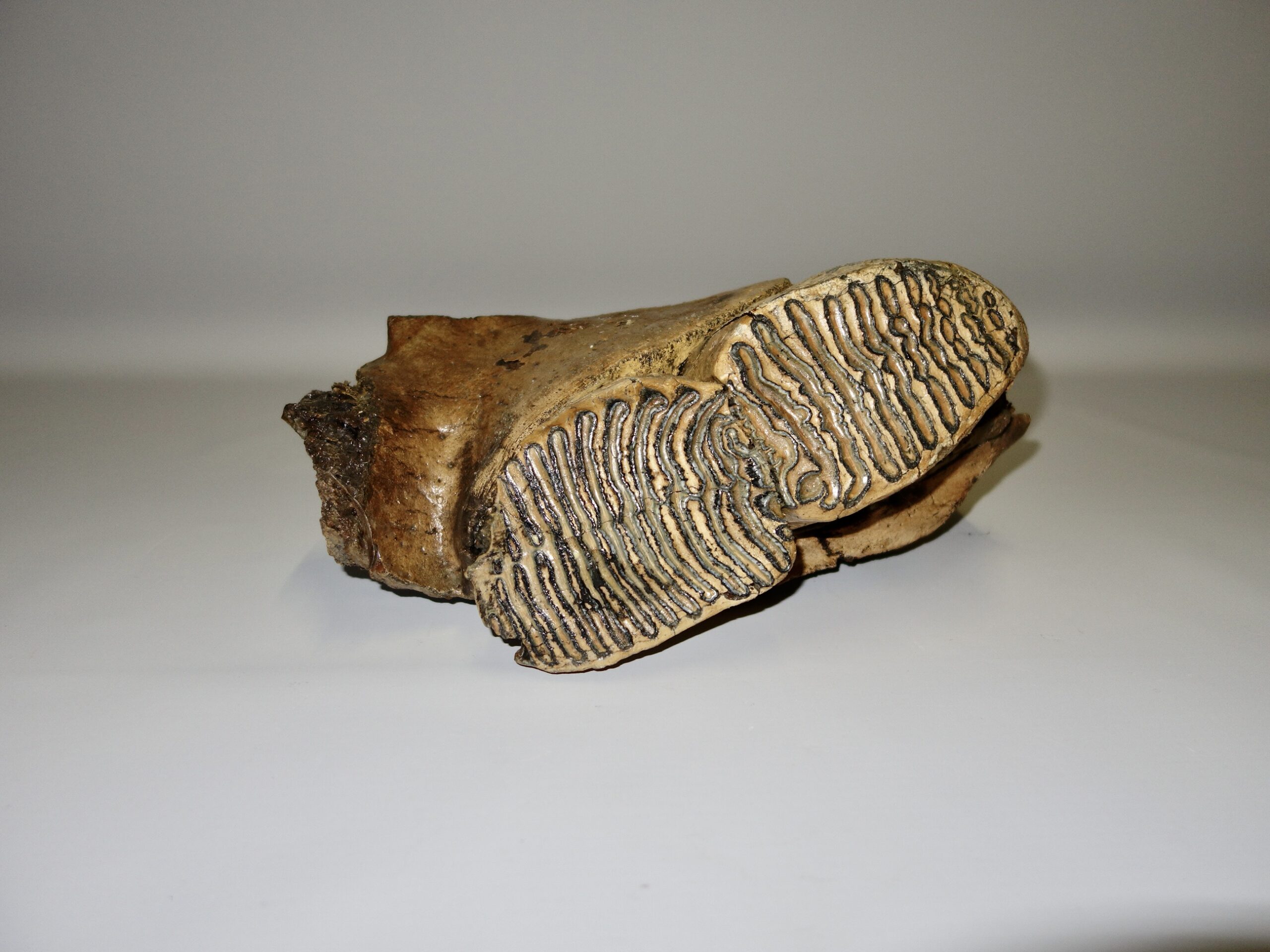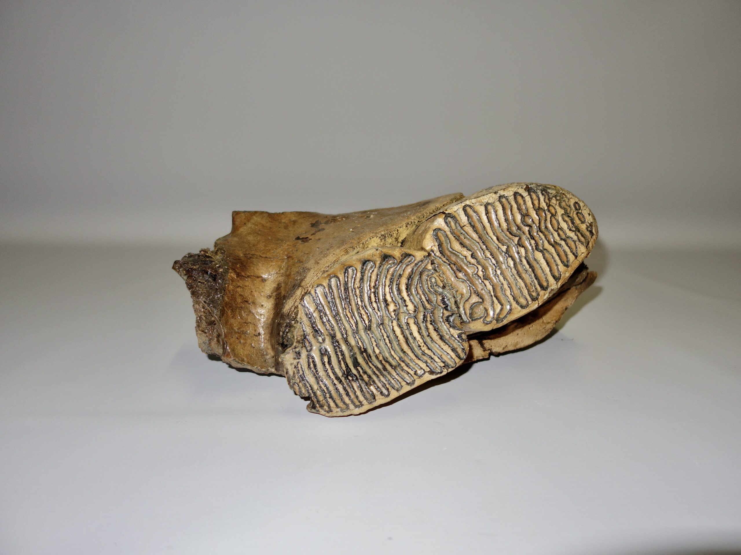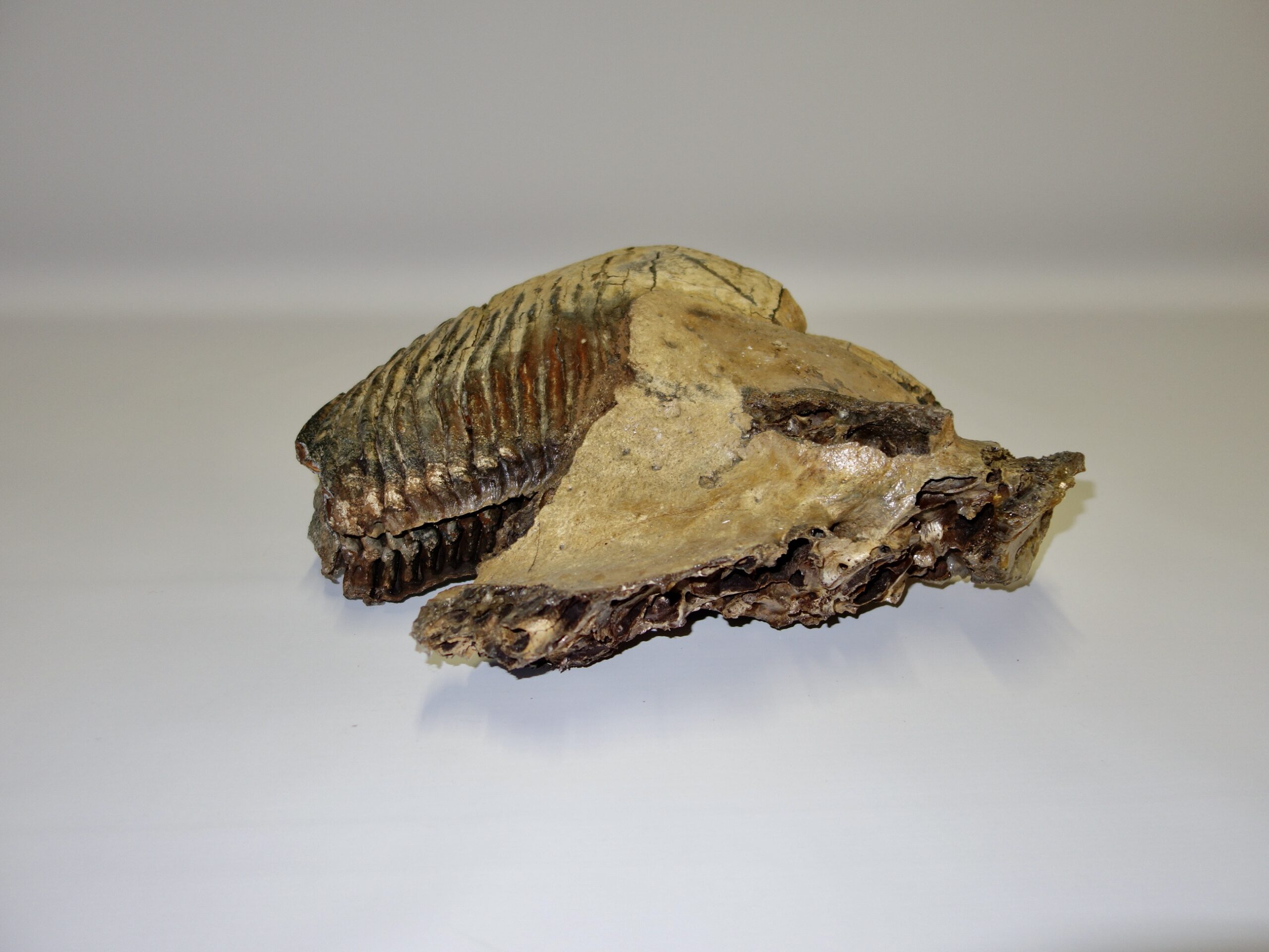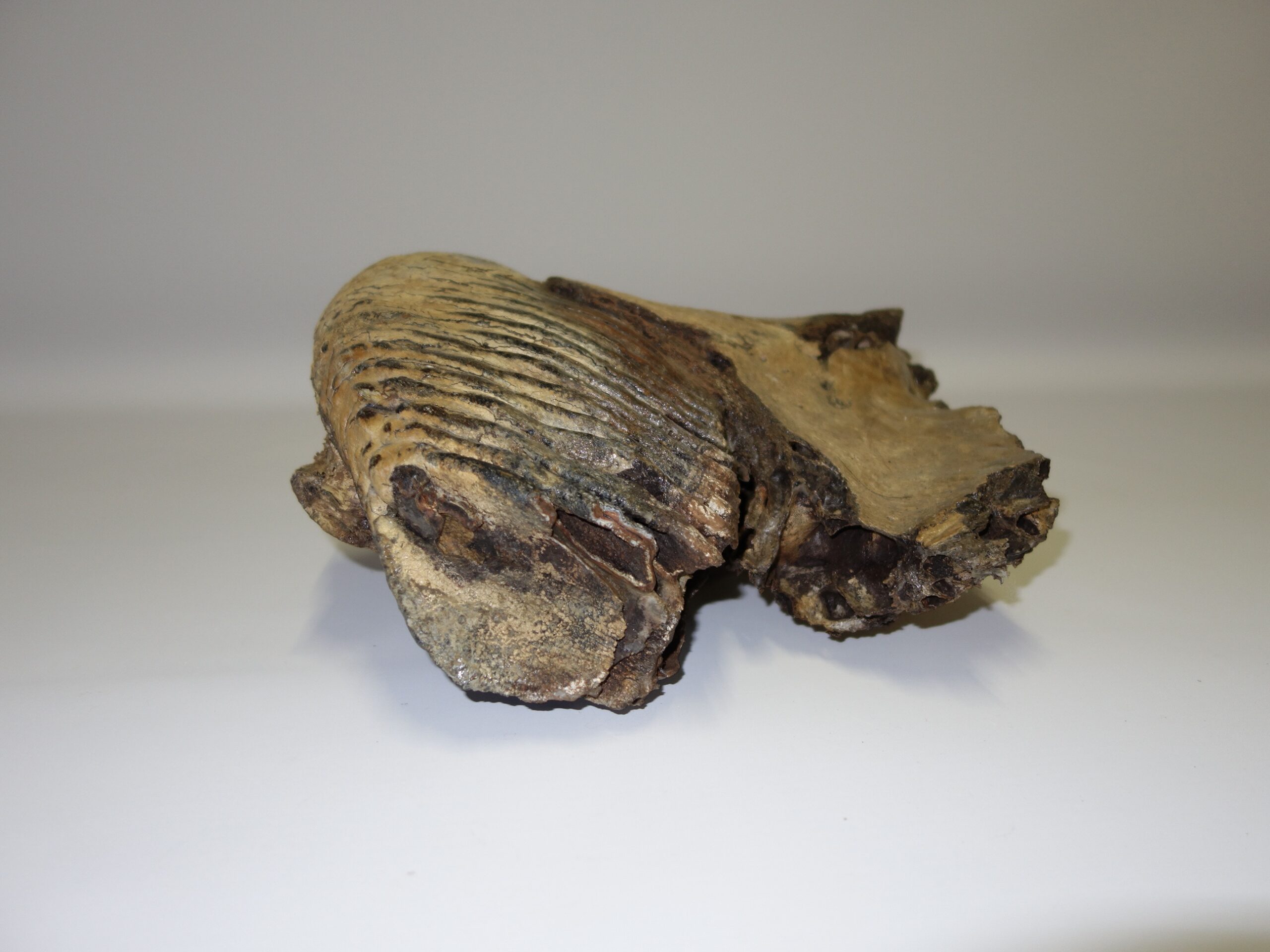 On offer is a fascinating partial upper jaw of a Woolly Mammoth from the Pleistocene period. This piece still includes a well preserved M2 molar still firmly locked in the jaw tissue, together with a developing M3 molar behind the M2. Good state of preservation, as seen in the images. No restoration whatsoever. This jaw must have come from an animal which was about 30 years old when it died. Rare piece for the real collector. The black and white section of the ruler in the image represents 10 cm / 3.9 inch.
