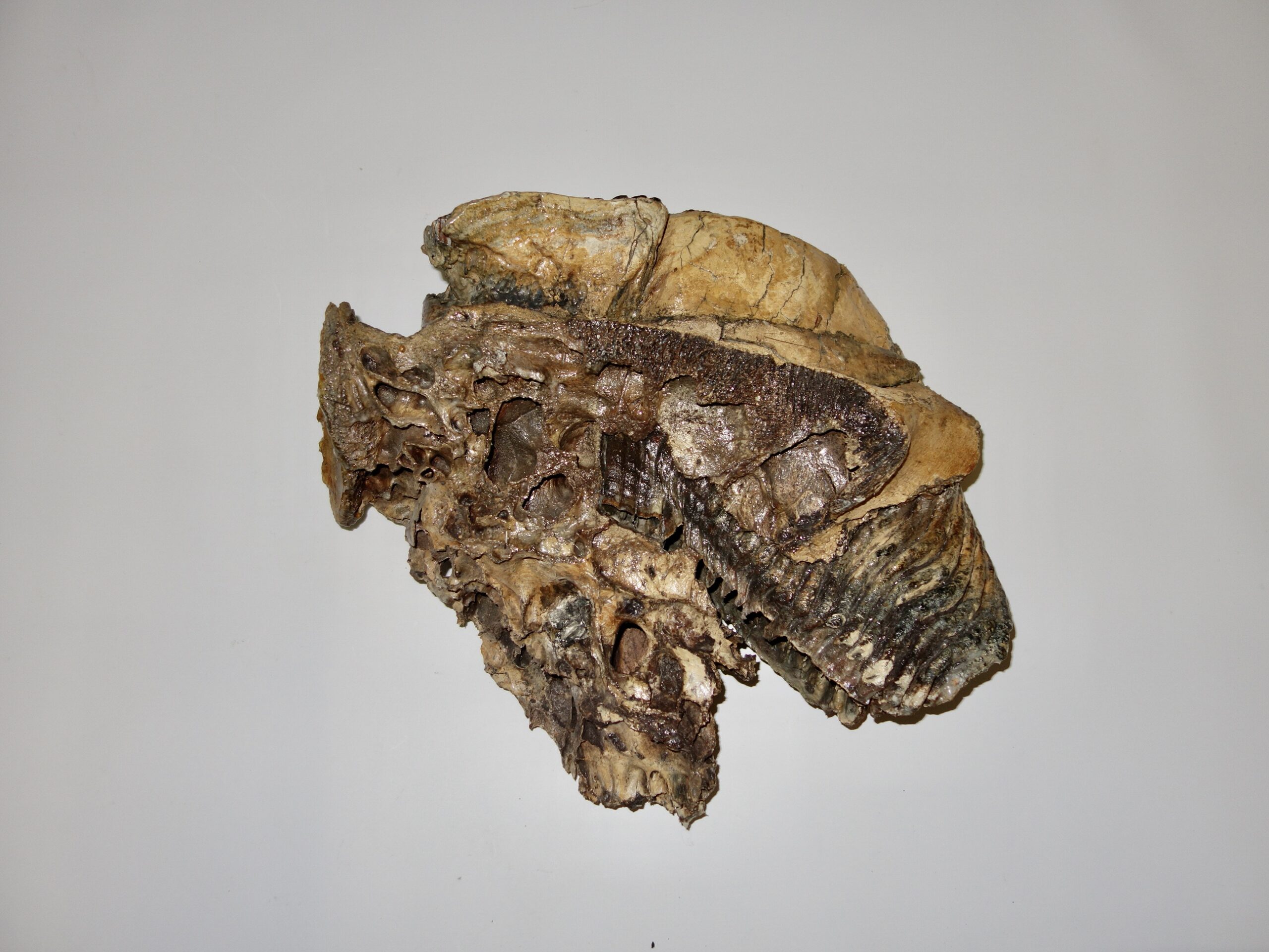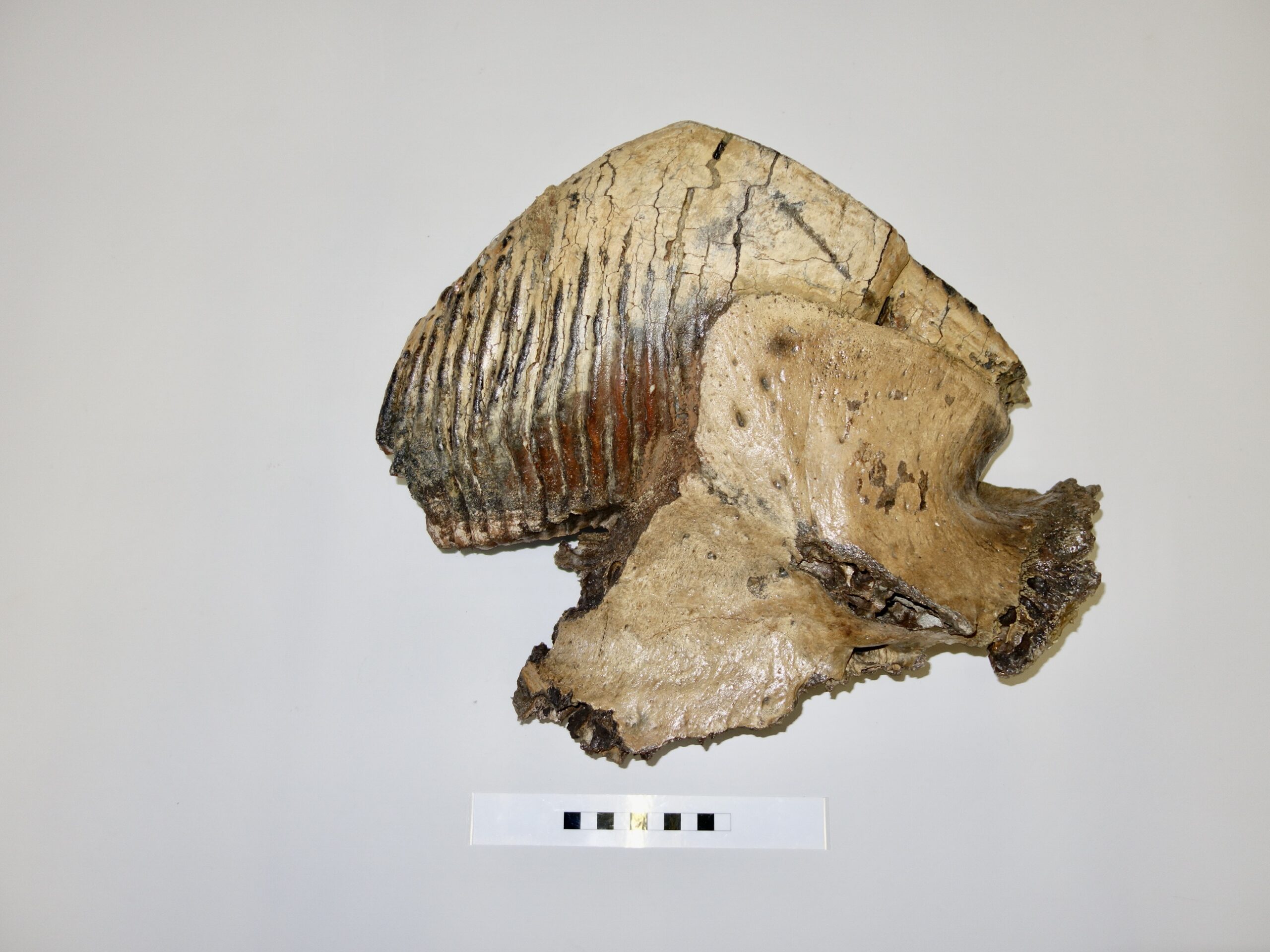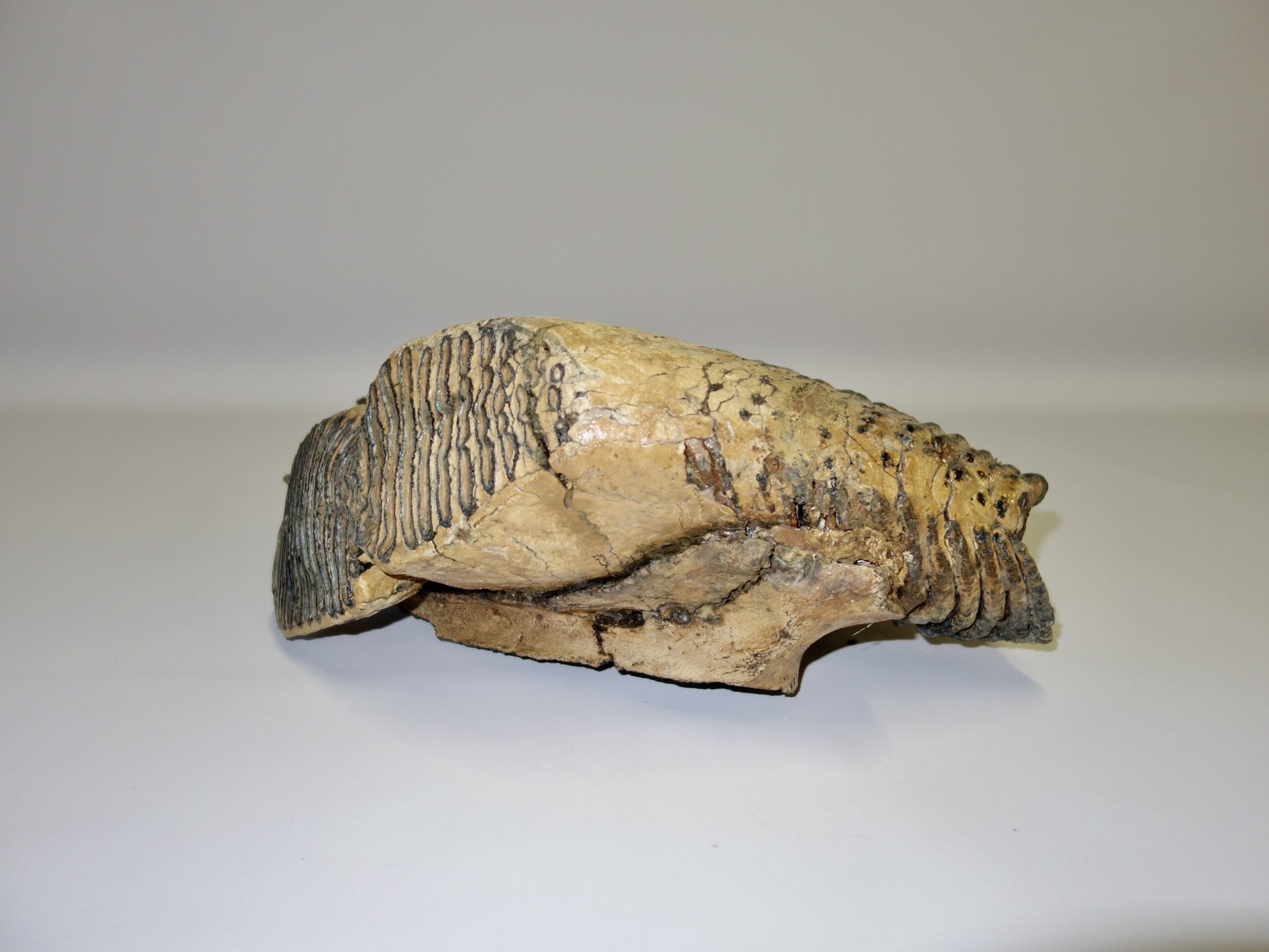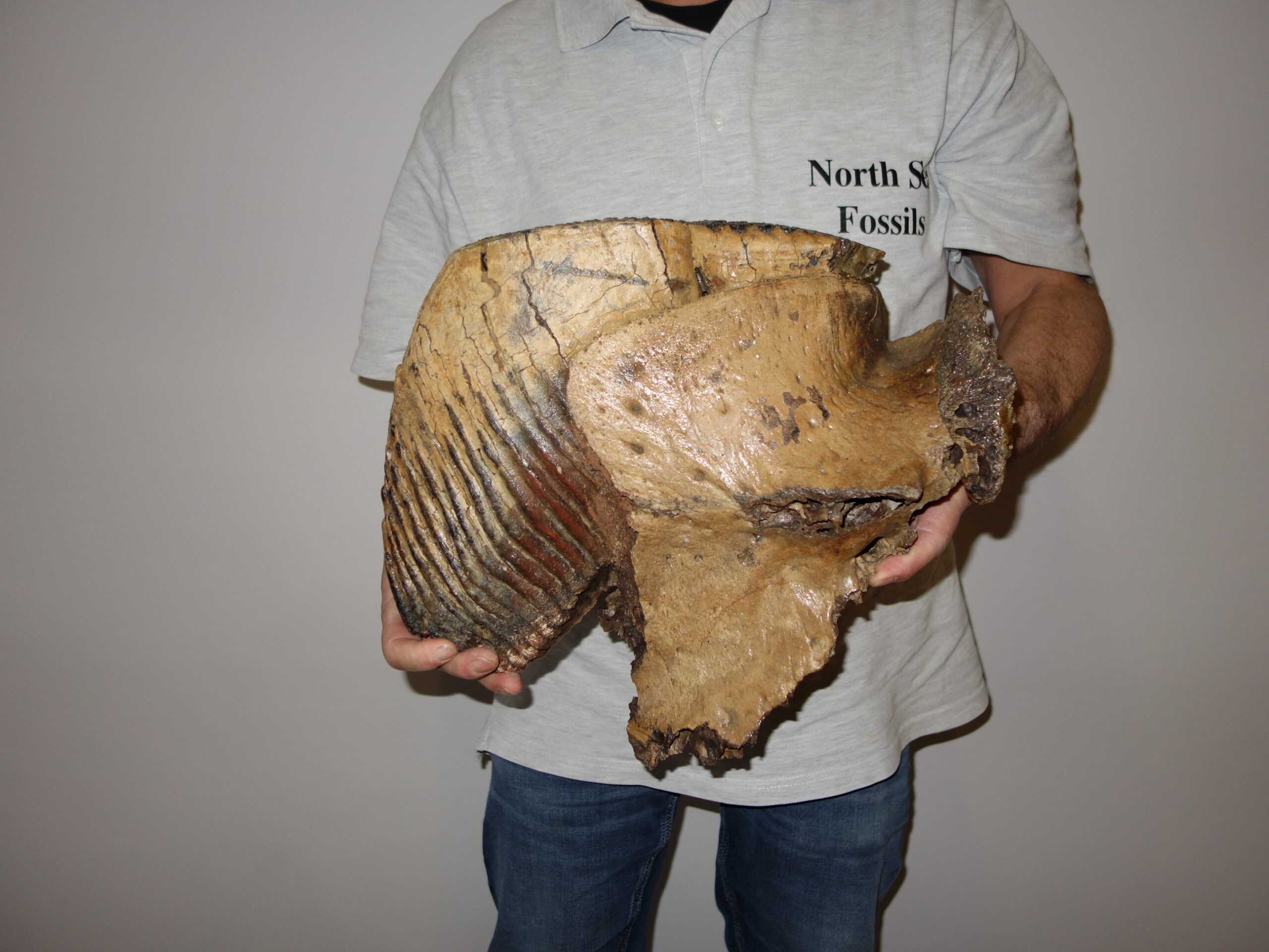 On offer is a fascinating partial upper jaw of a Woolly Mammoth from the Pleistocene period. This piece still includes a well preserved M2 molar still firmly locked in the jaw tissue, together with a developing M3 molar behind the M2. Good state of preservation, as seen in the images. No restoration whatsoever. This jaw must have come from an animal which was about 30 years old when it died. Rare piece for the real collector. The black and white section of the ruler in the image represents 10 cm / 3.9 inch.