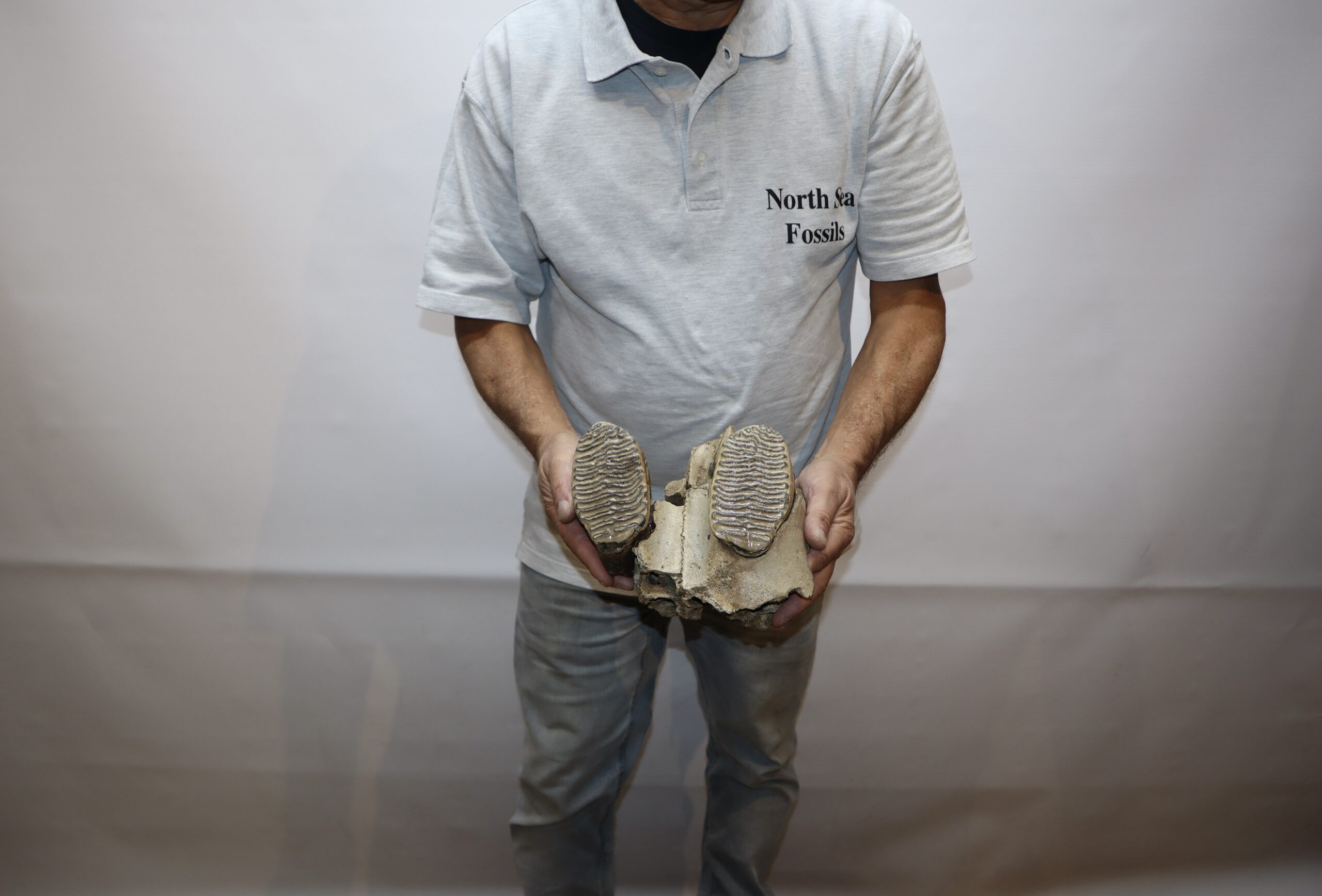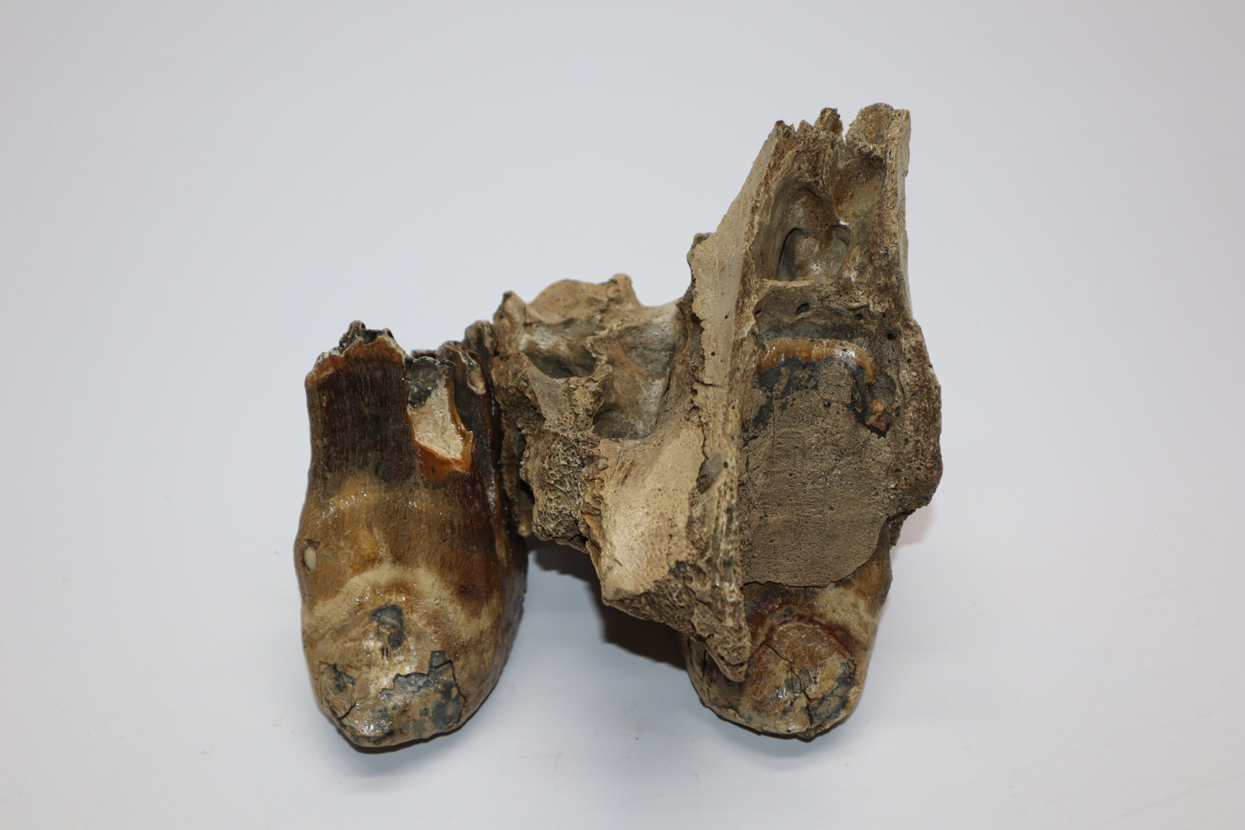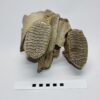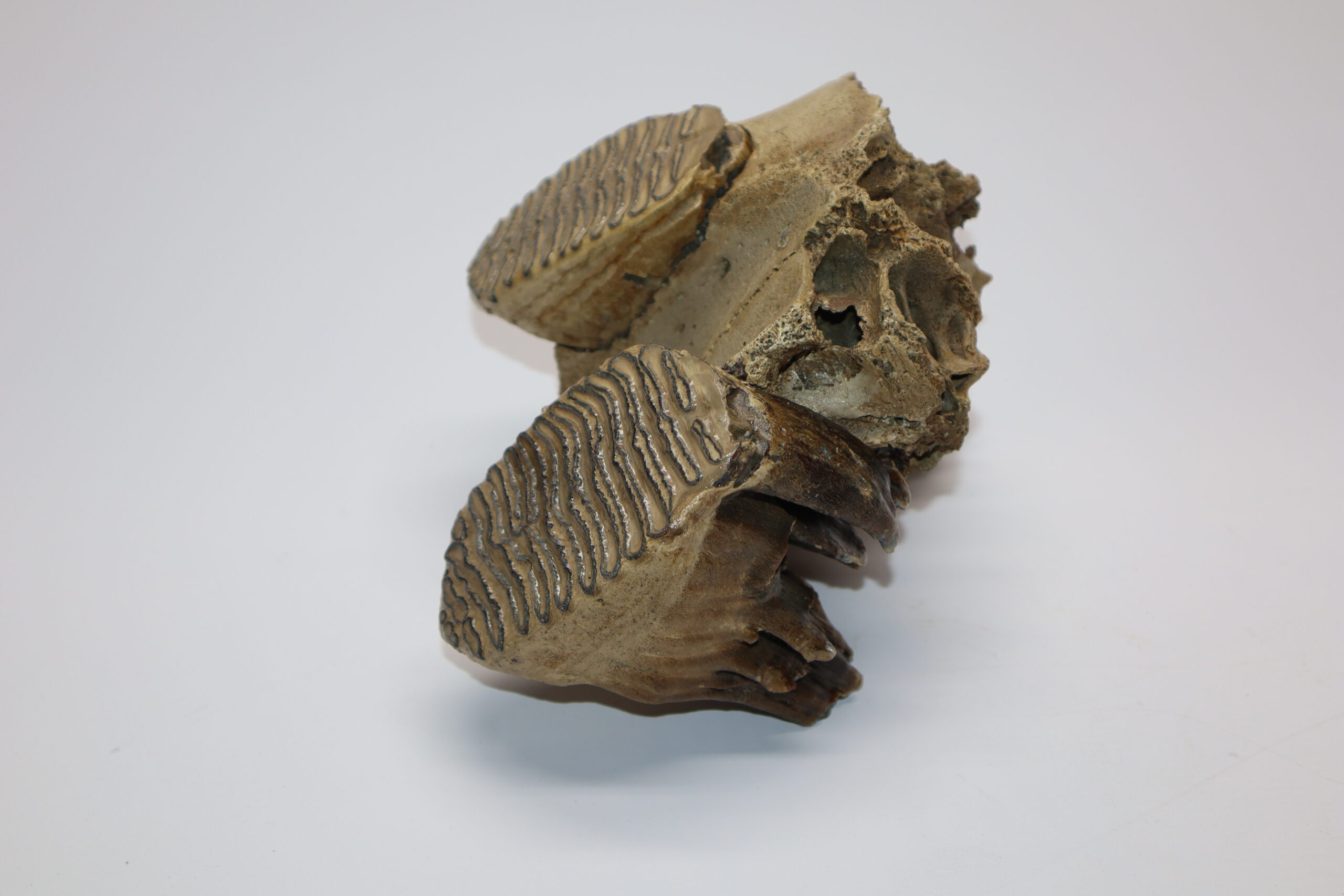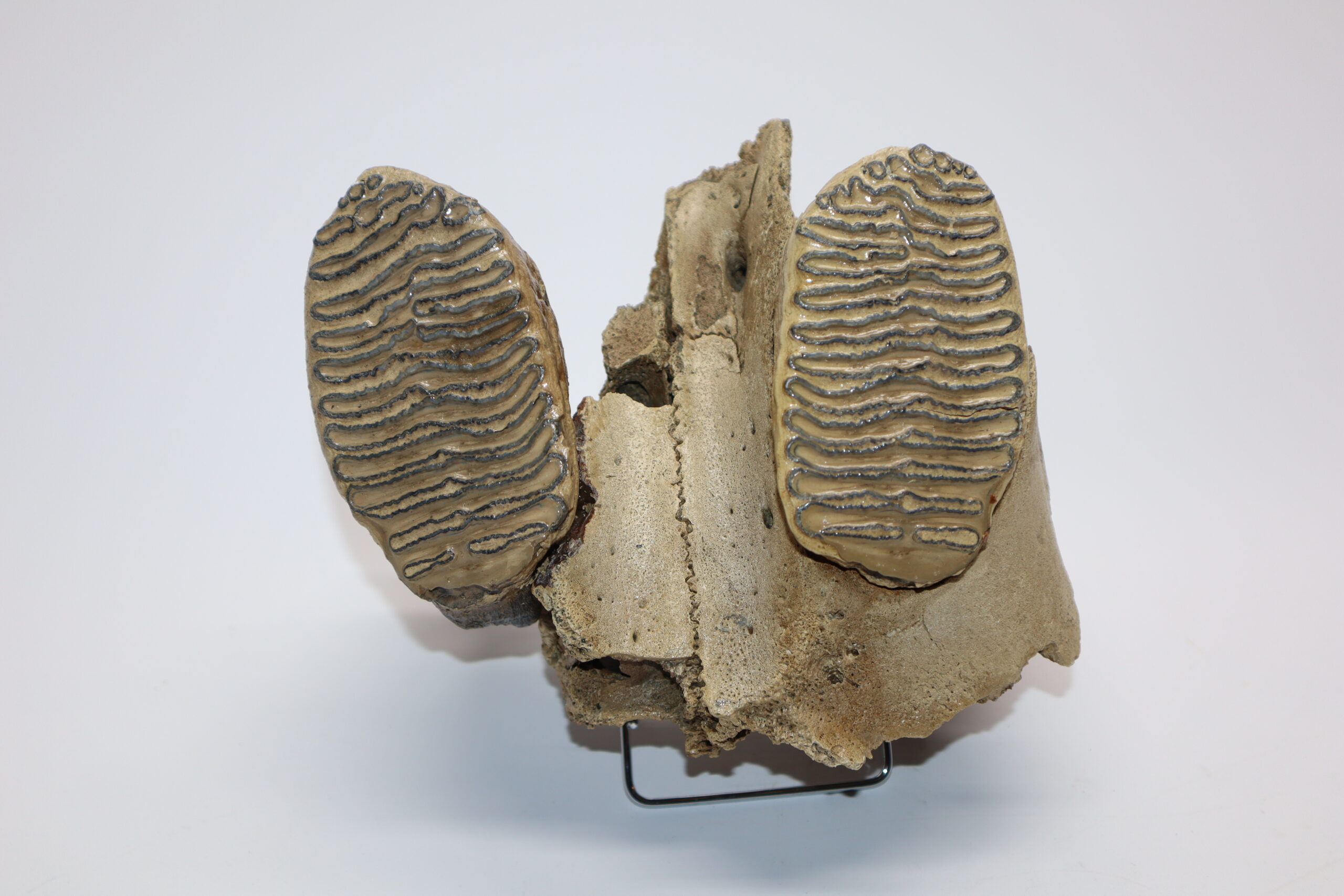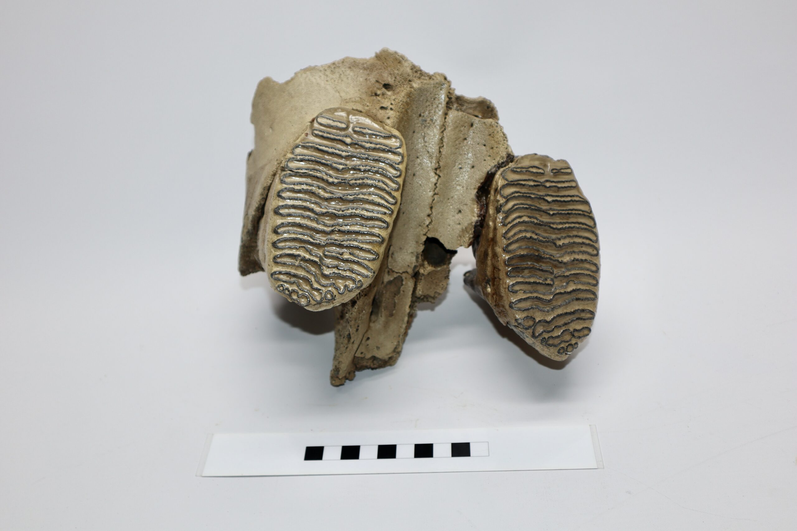 On offer is an upper jaw of a juvenile Woolly Mammoth from the Pleistocene era, with two beautiful M1 molars still locked in the jaw tissue. Very good condition, no restoration whatsoever. Rare piece, as fossils from juvenile animals are much rarer than those of adult specimens. The black-and-white section of the ruler in the image represents 10 cm / 3.9 inch.