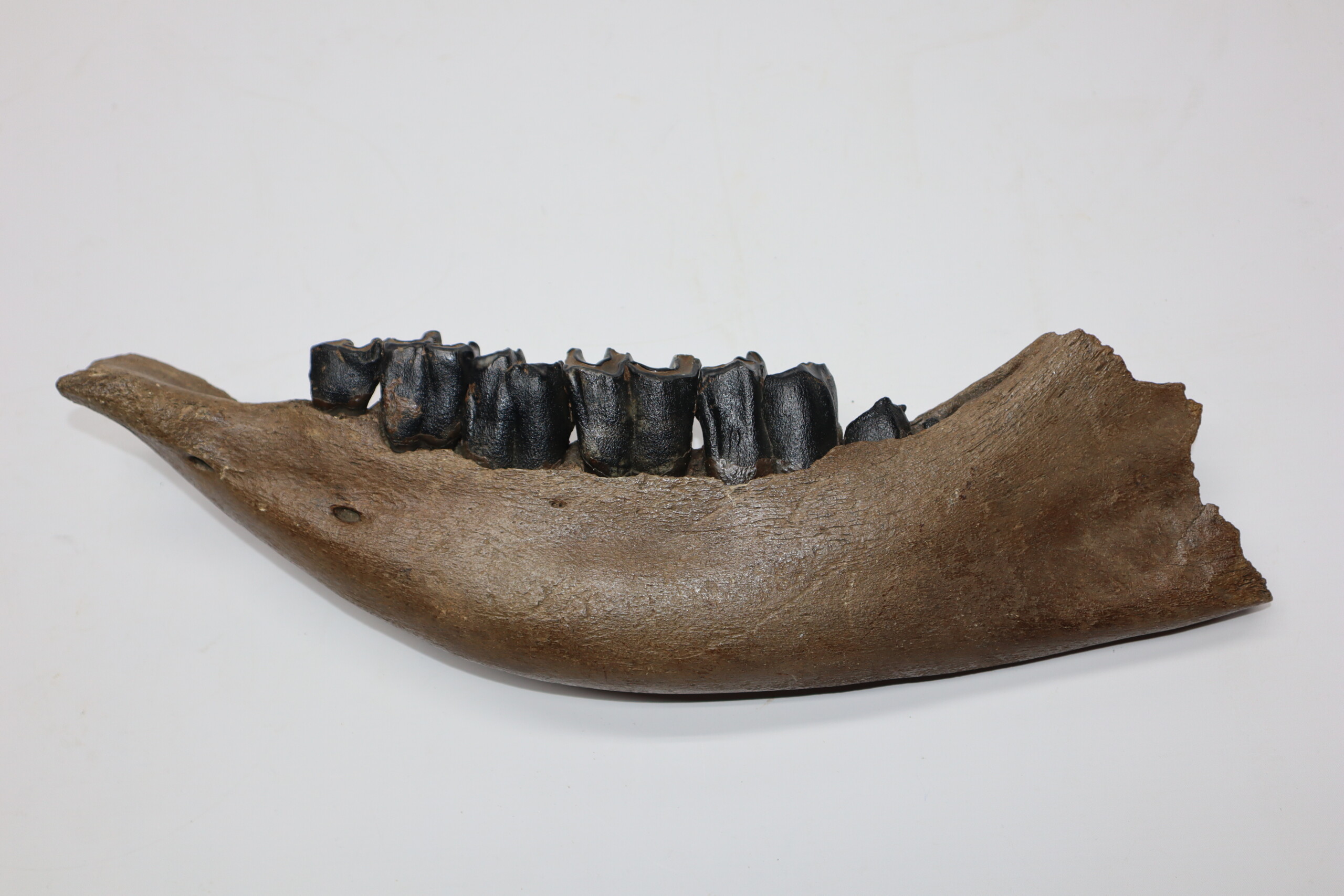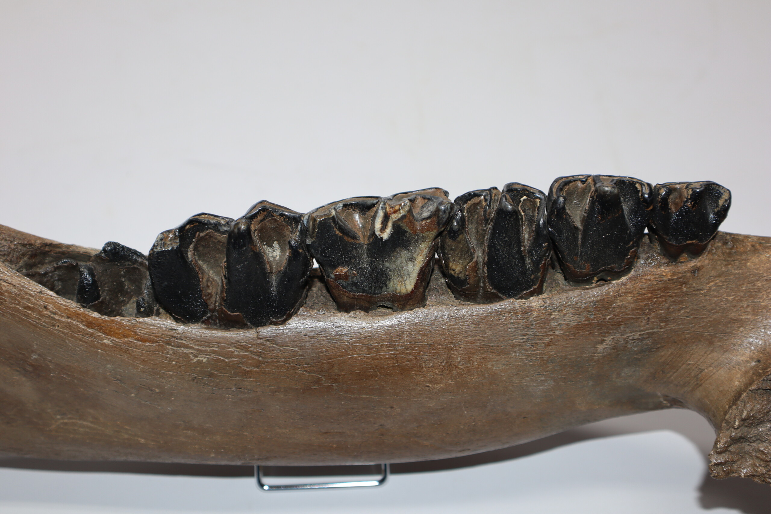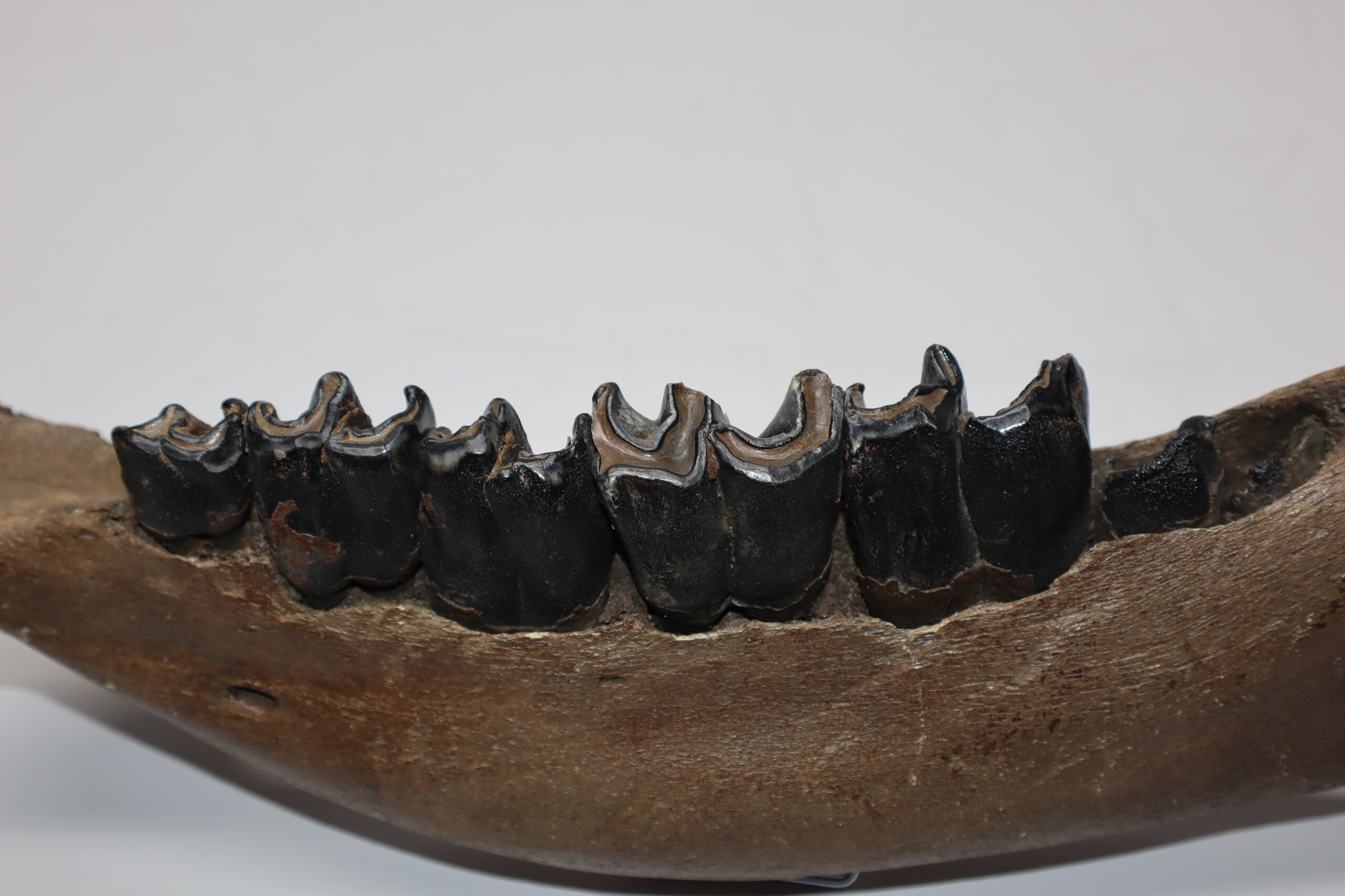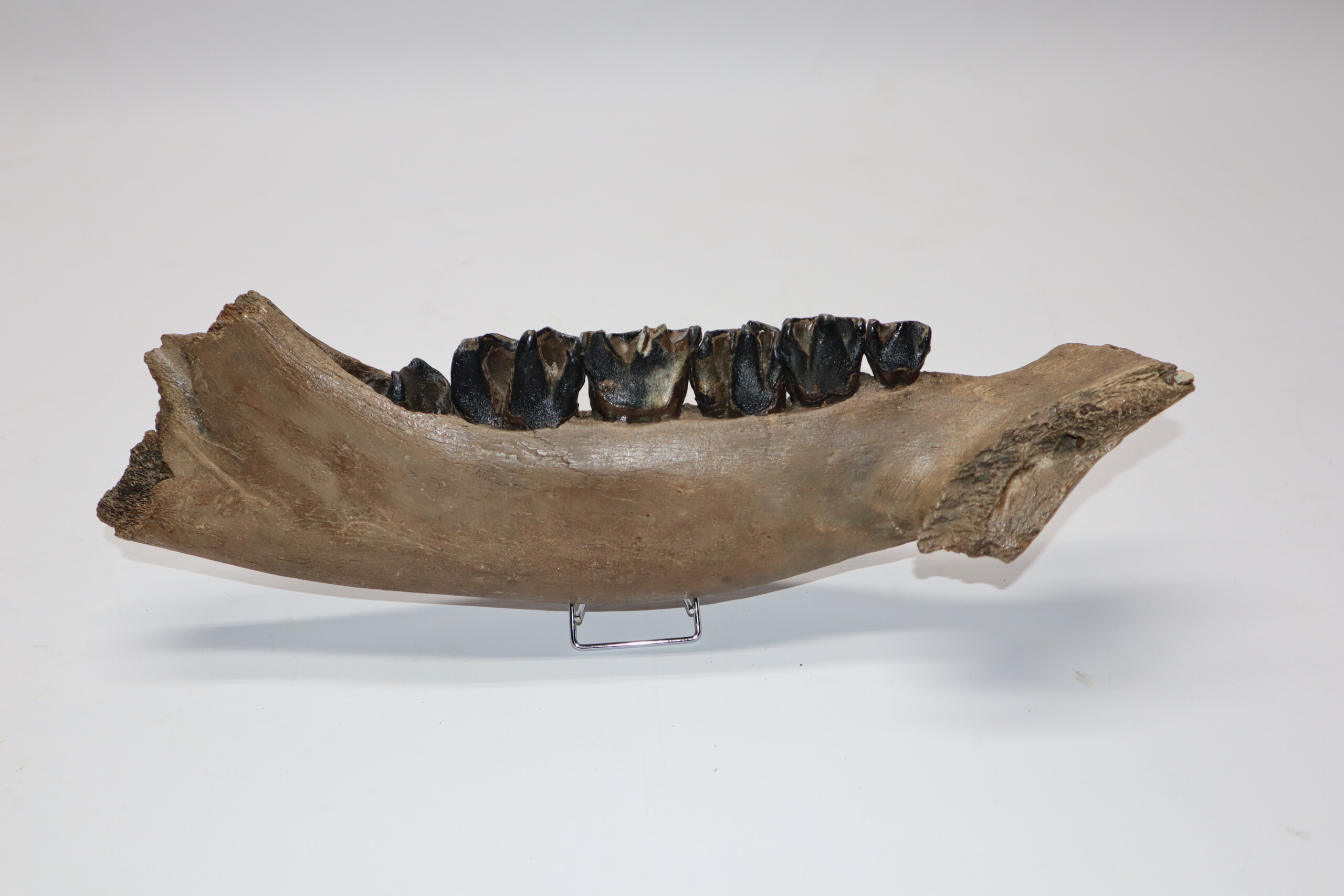 On offer is a fantastic half lower jaw of an adult Woolly Rhinoceros from the Pleistocene era. This jaw is still well preserved as seen in the images and still includes six original molars. Interesting and exceptionally rare item. Rhino material is much rarer than mammoth fossils. The black and white section of the ruler in the image represents 10 cm / 3.9 inch.