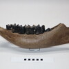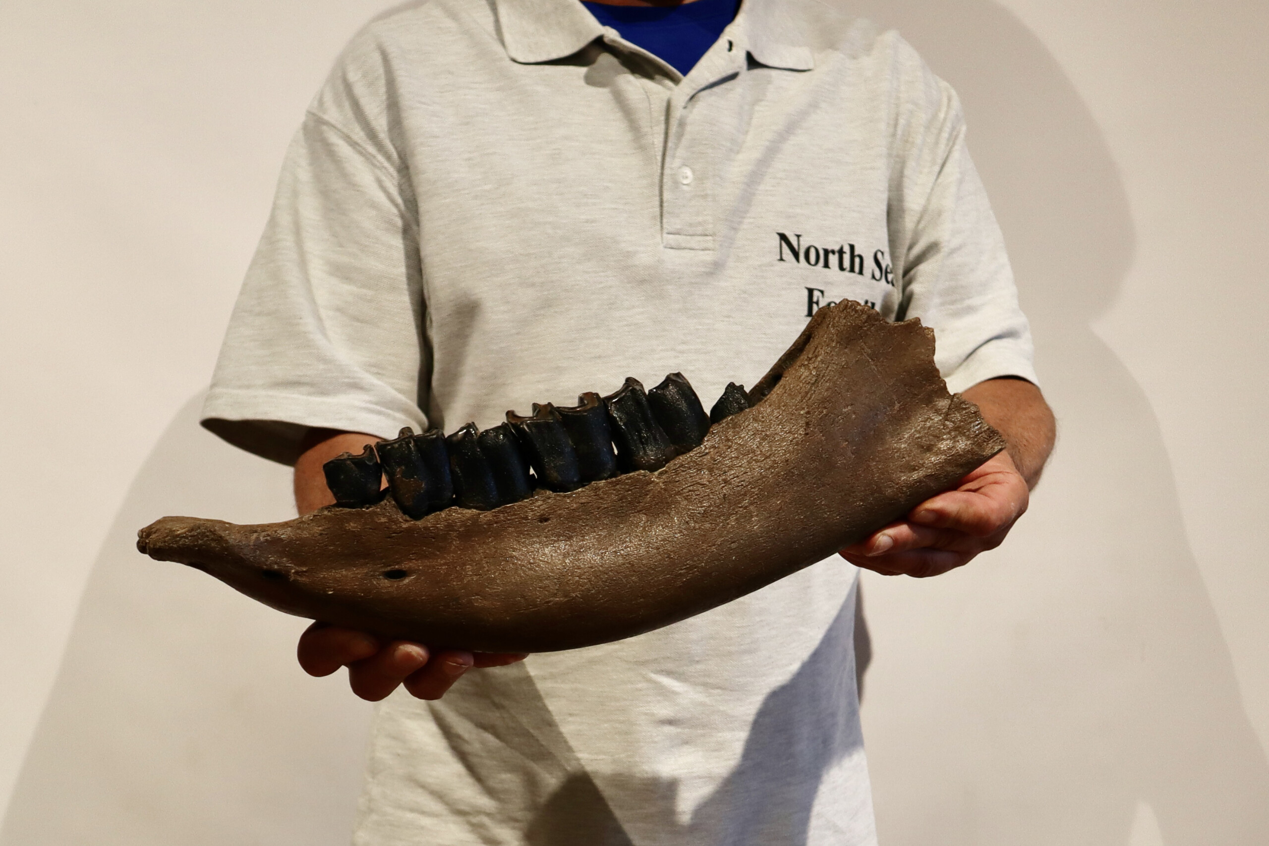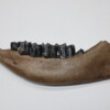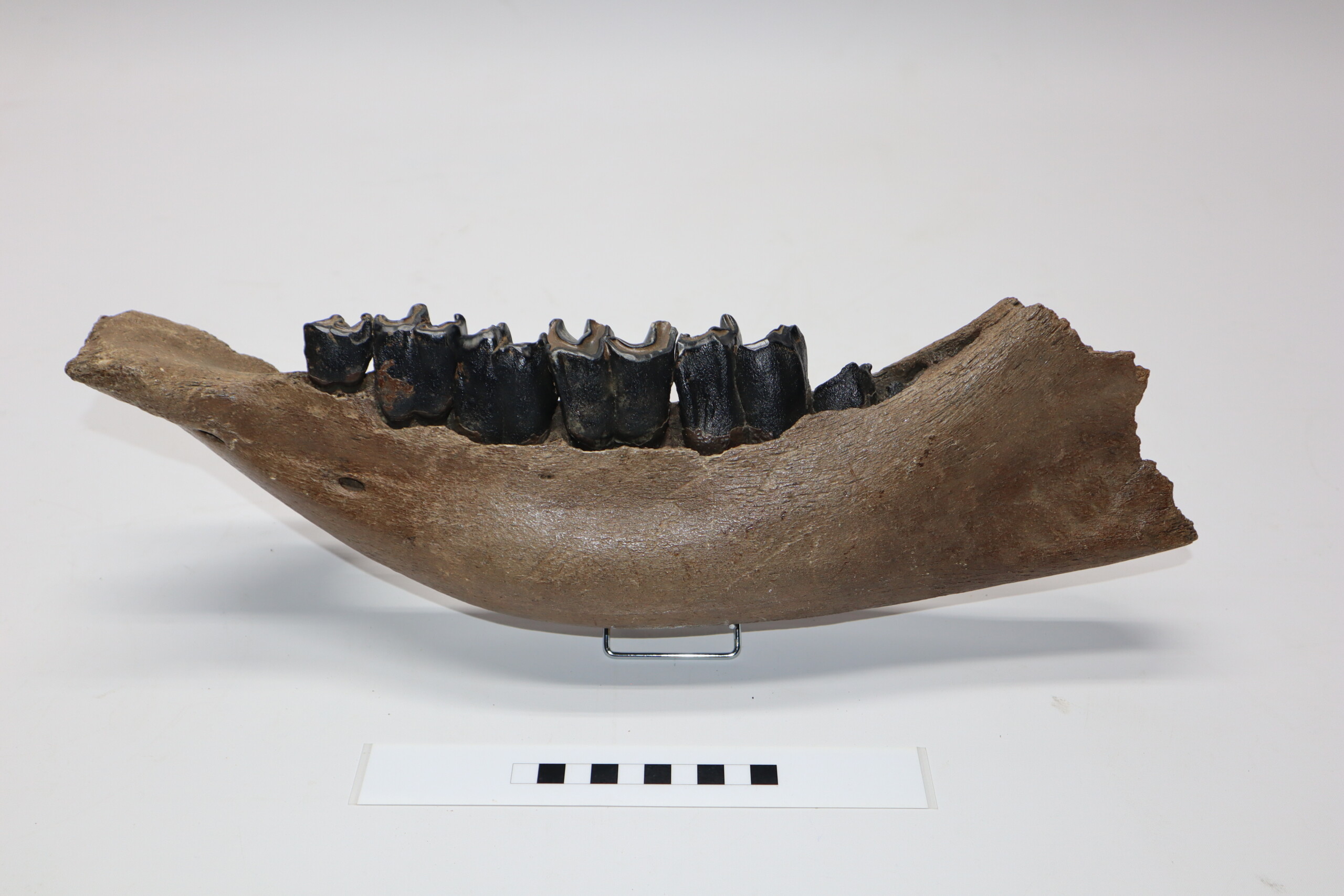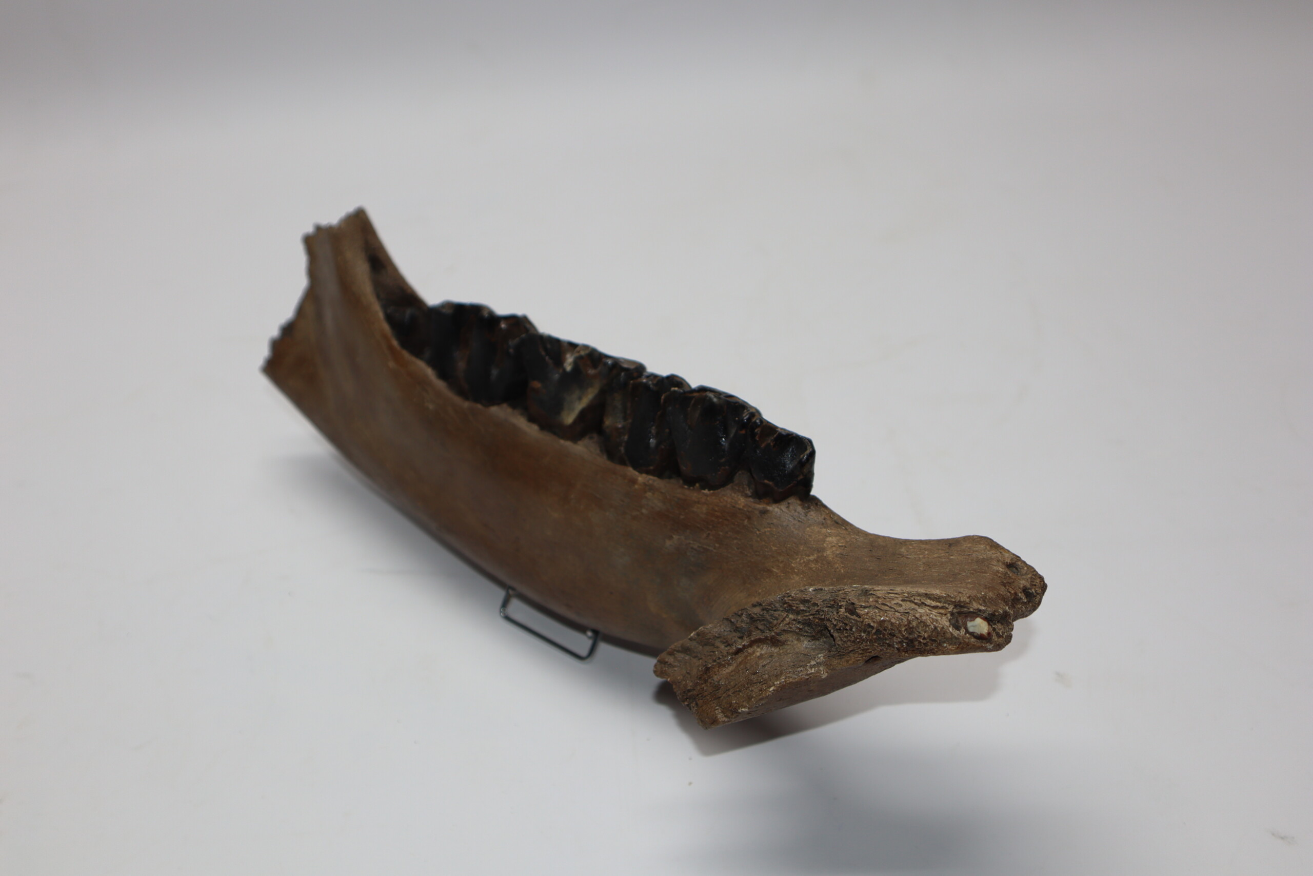 On offer is a fantastic half lower jaw of an adult Woolly Rhinoceros from the Pleistocene era. This jaw is still well preserved as seen in the images and still includes six original molars. Interesting and exceptionally rare item. Rhino material is much rarer than mammoth fossils. The black and white section of the ruler in the image represents 10 cm / 3.9 inch.