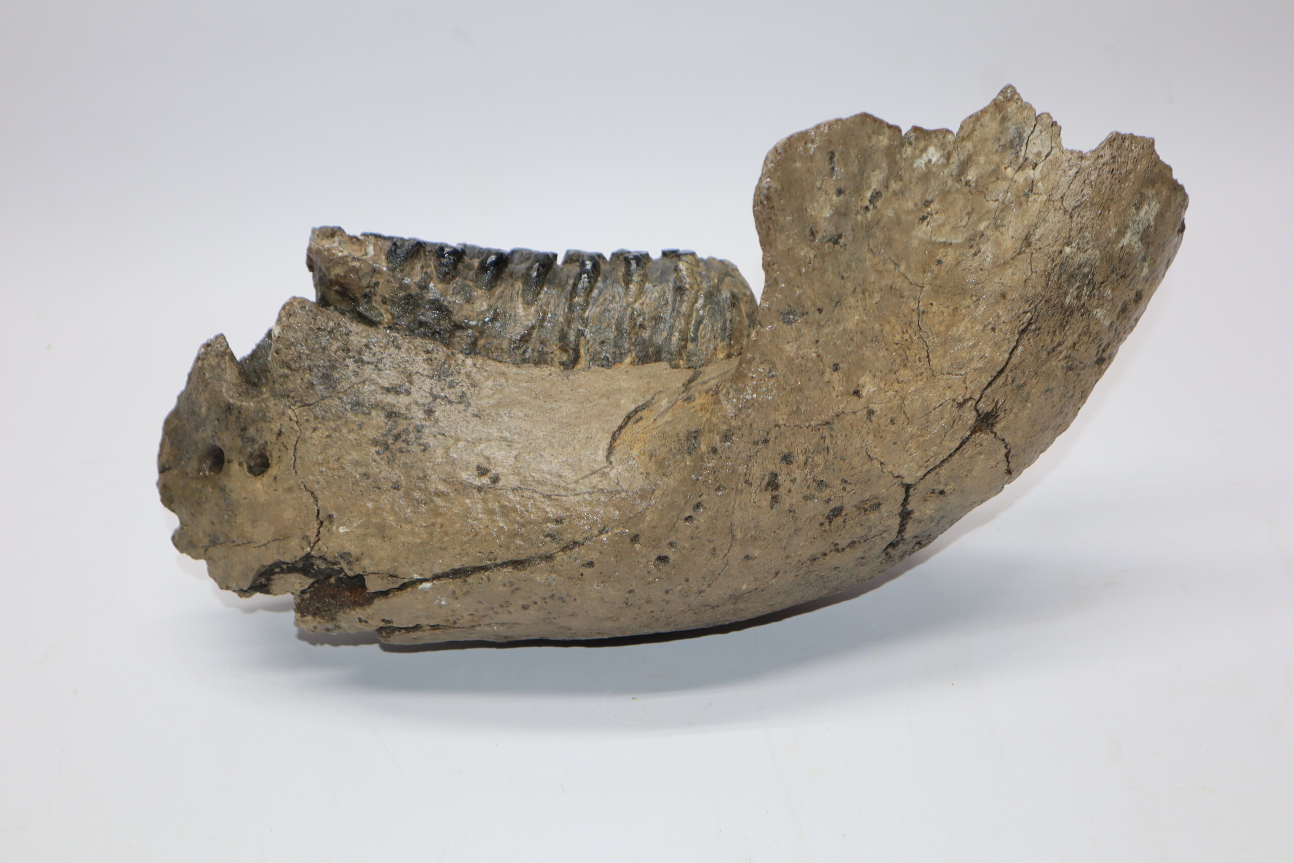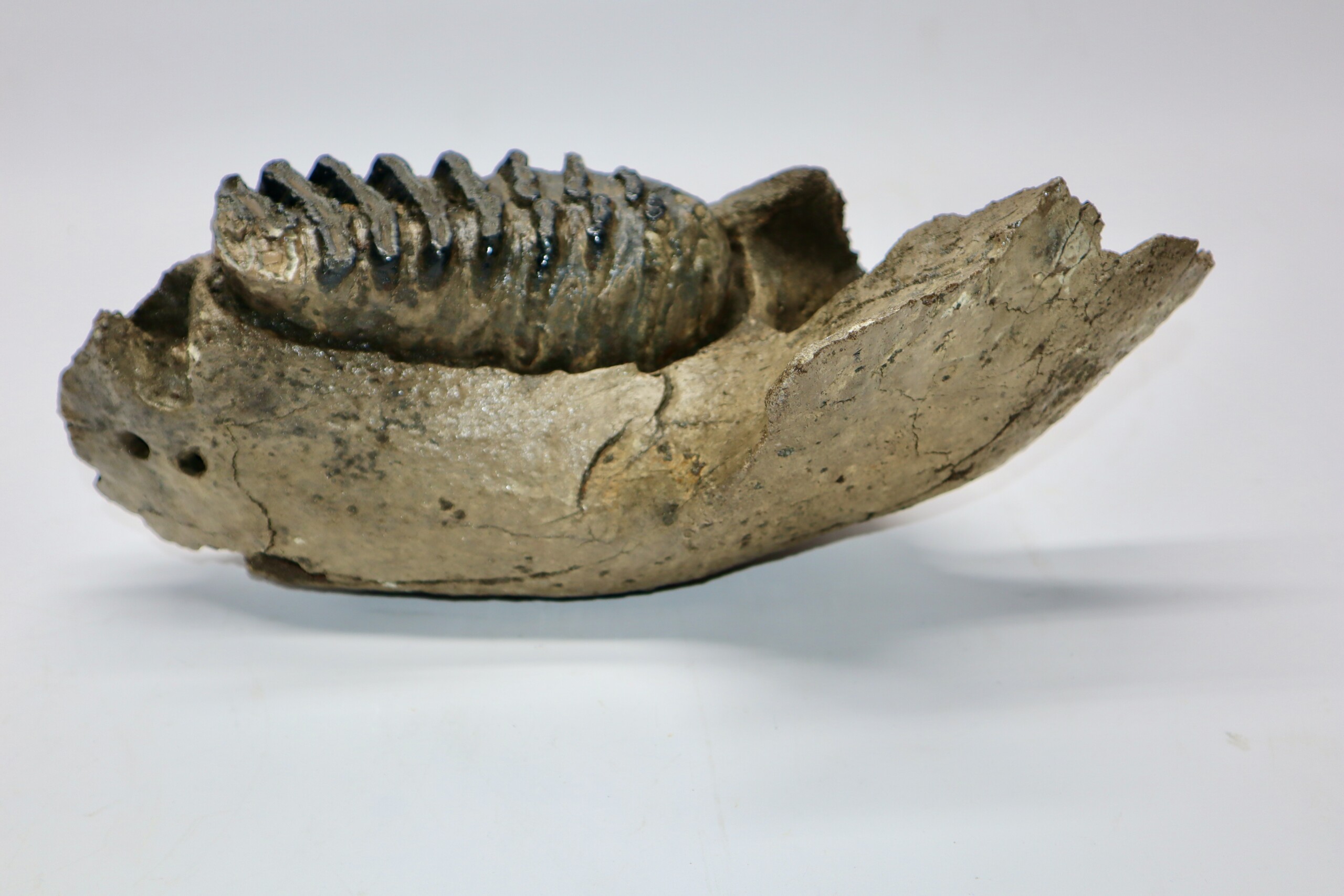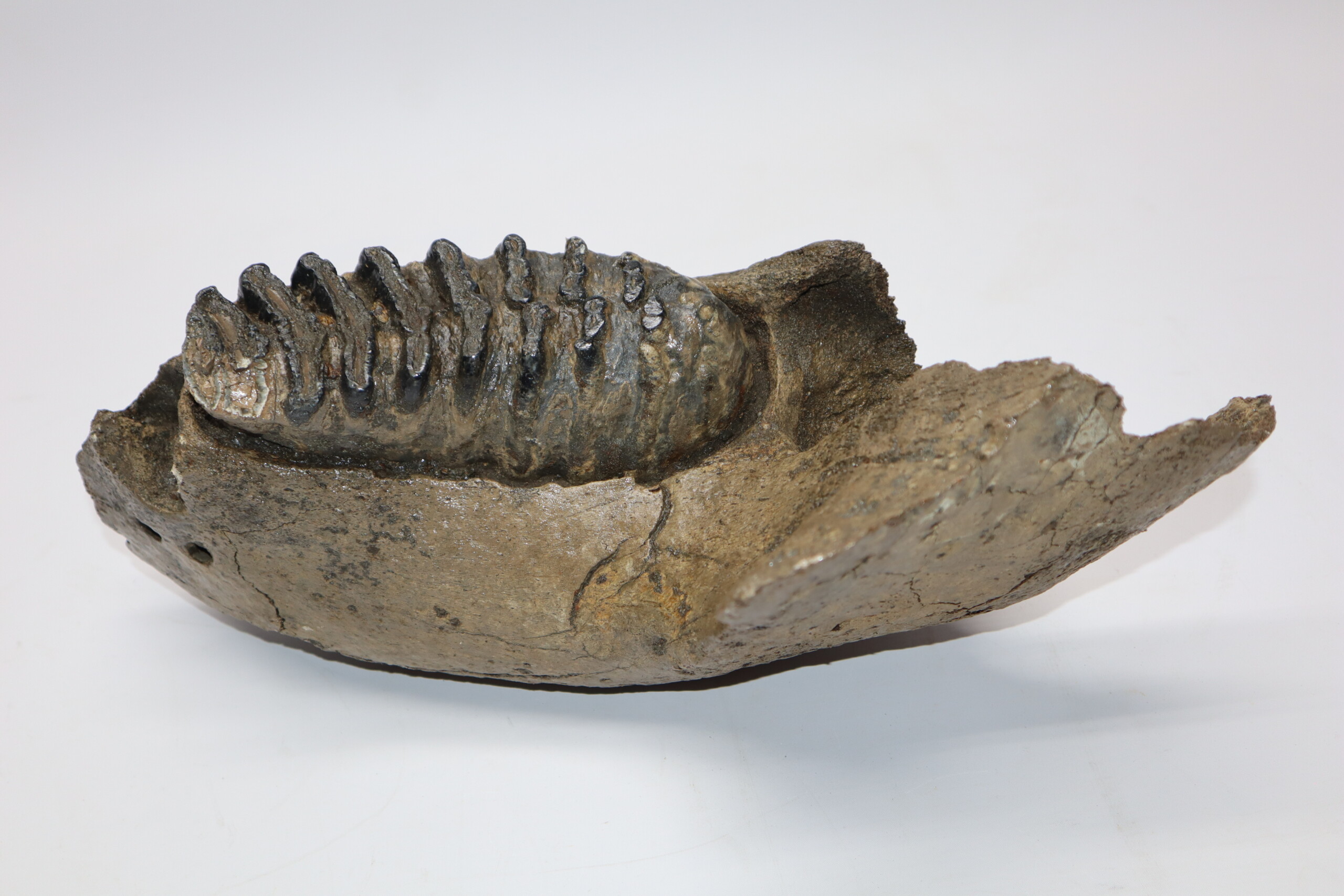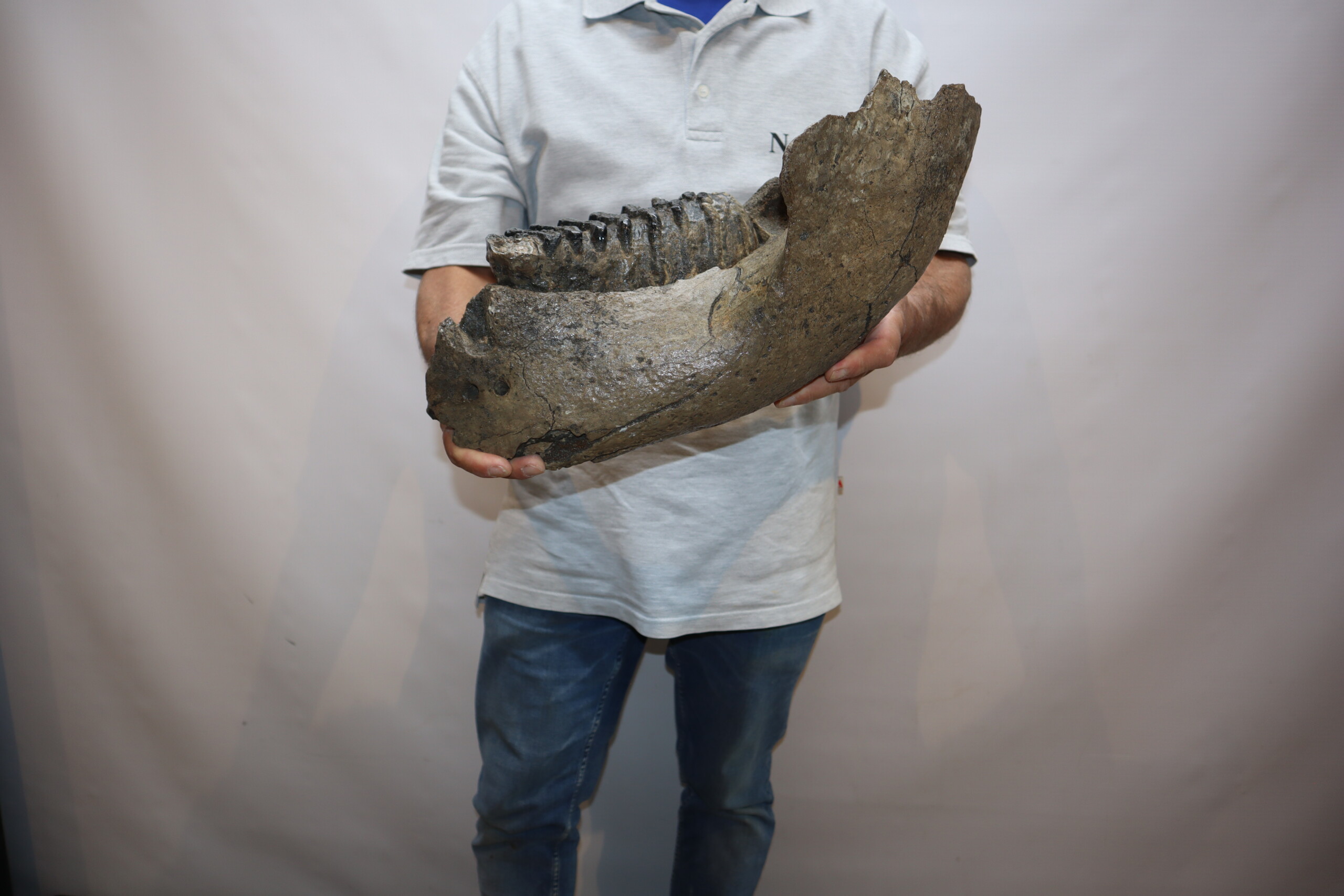 On offer is a very rare half lower jaw of a Southern Mammoth, or Mammuthus meridionalis. This piece includes the beautifully preserved M2 molar and belonged to a nearly adult animal. With a shoulder height of approx 4 metres (13 feet), this is one of the largest species of Mammoth to have ever lived. It is also much older and very much rarer than the more commonly encountered Woolly Mammoth. This piece is in good condition, as seen in the images. No restoration whatsoever. The black-and-white section of the ruler in the image represents 10 cm / 3.9 in.