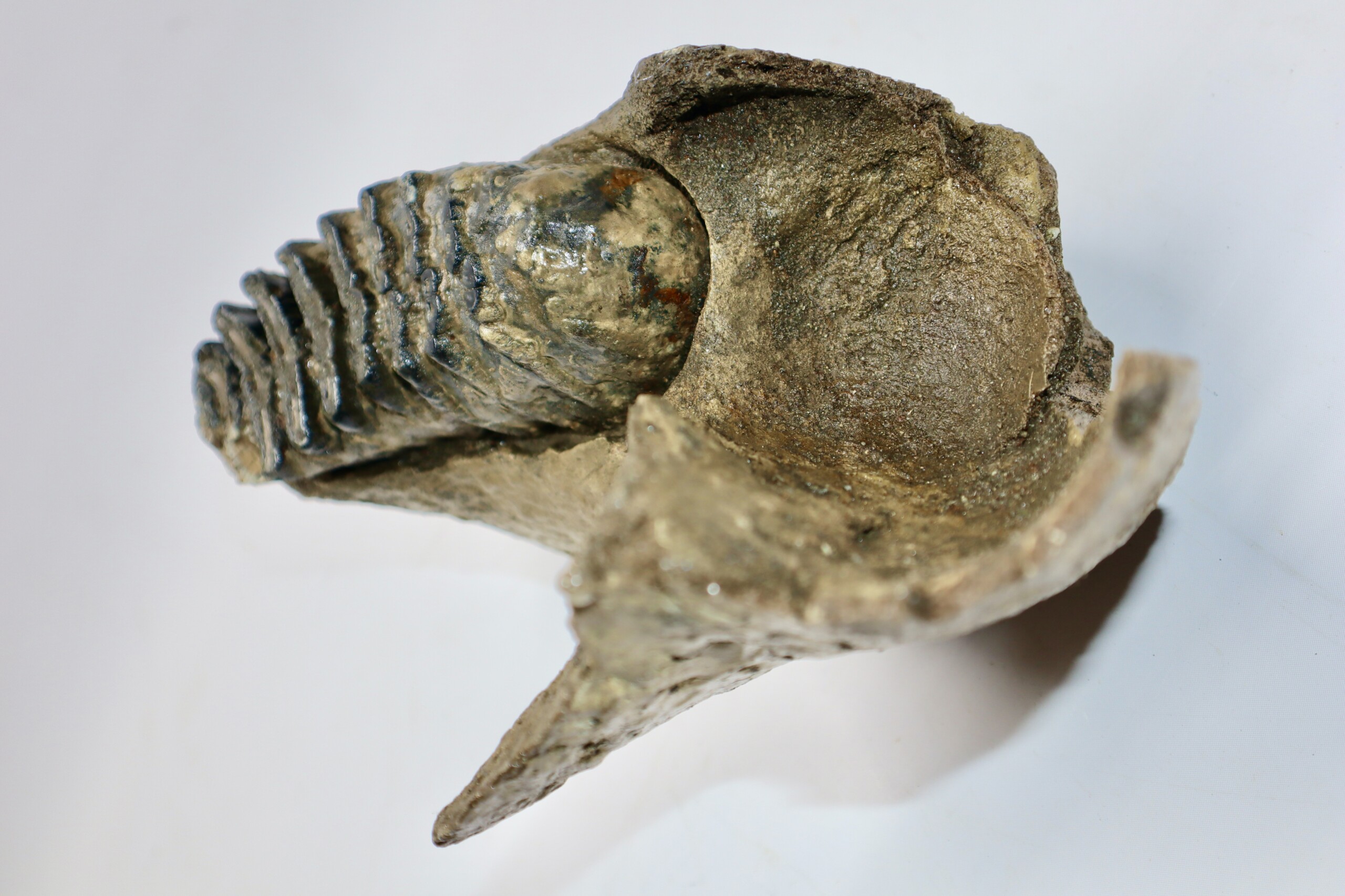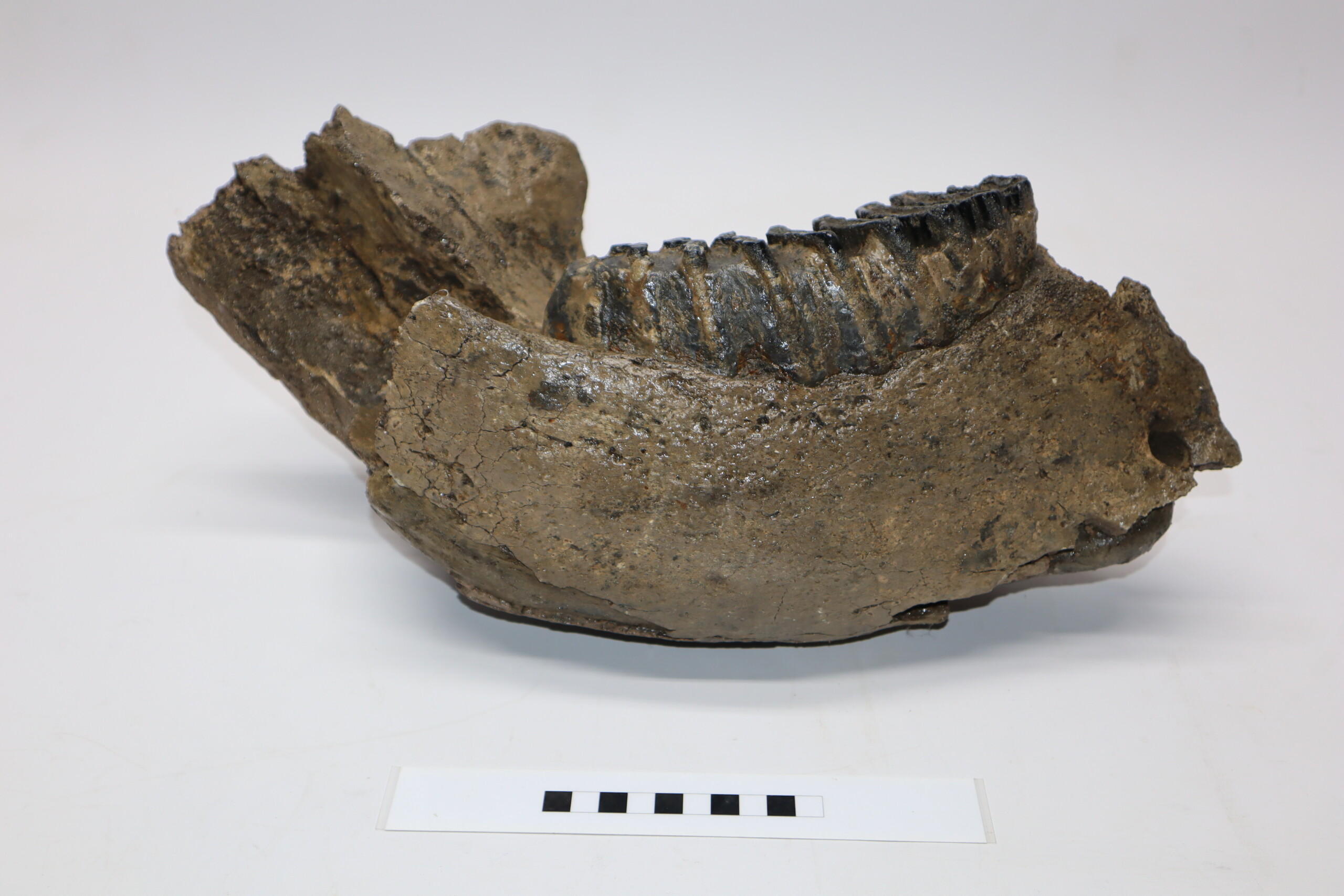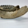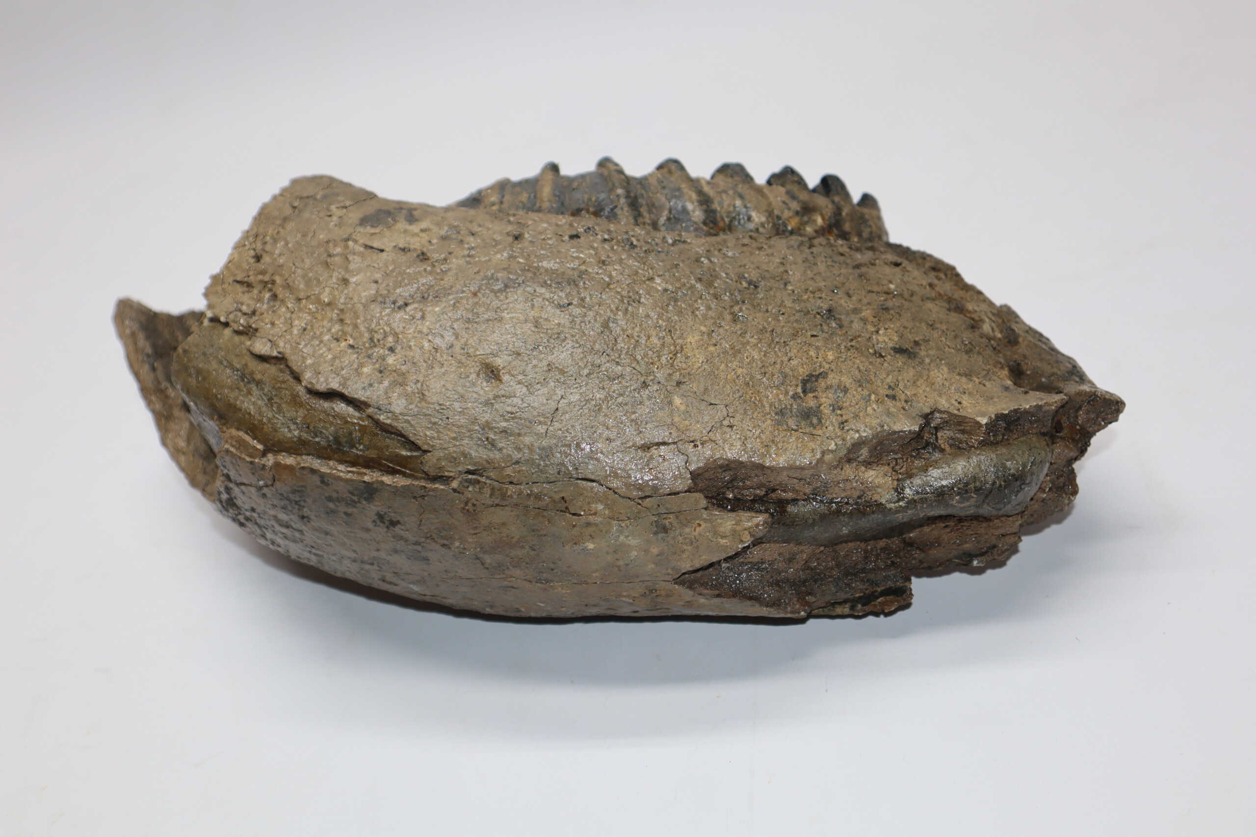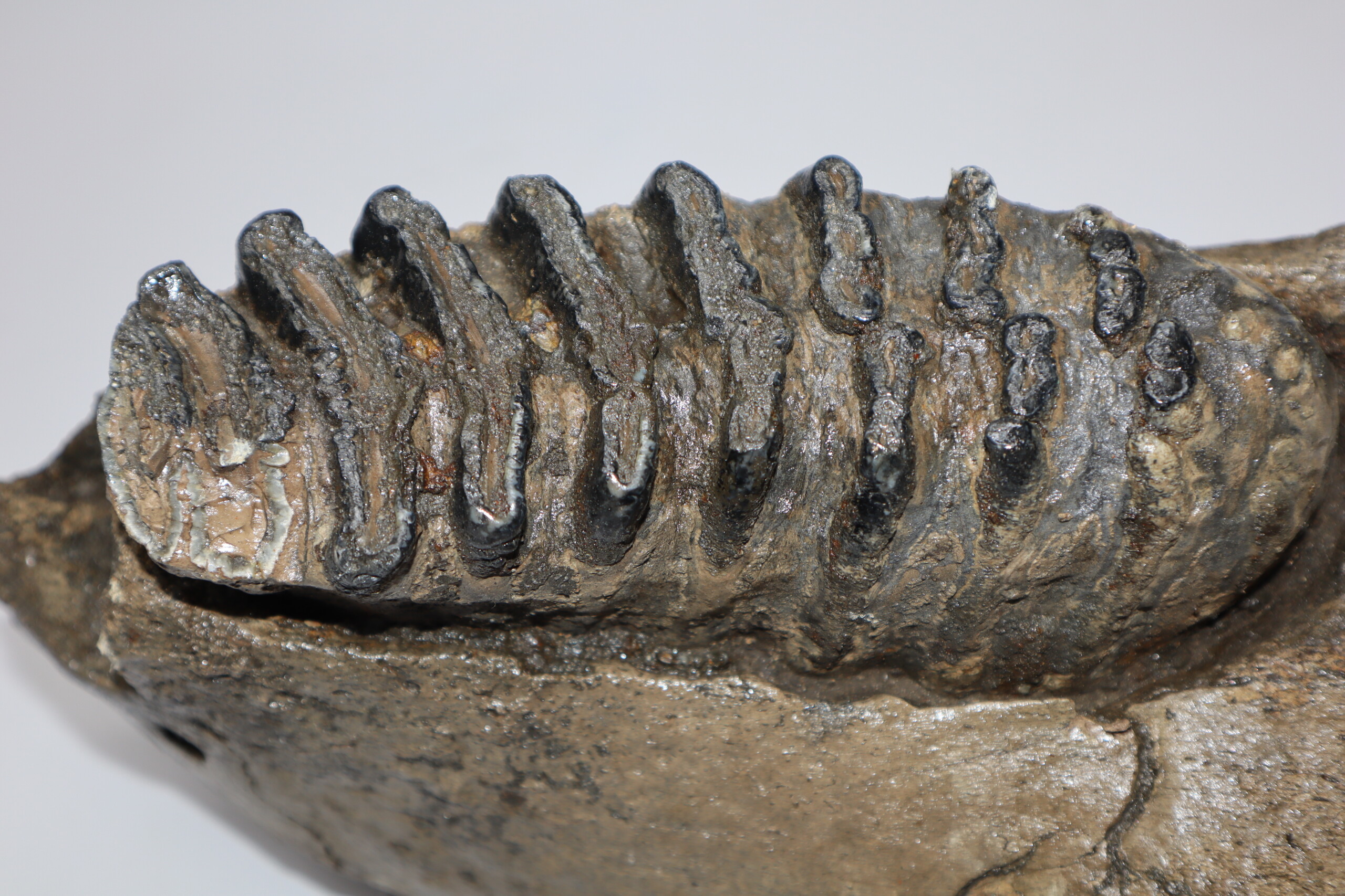 On offer is a very rare half lower jaw of a Southern Mammoth, or Mammuthus meridionalis. This piece includes the beautifully preserved M2 molar and belonged to a nearly adult animal. With a shoulder height of approx 4 metres (13 feet), this is one of the largest species of Mammoth to have ever lived. It is also much older and very much rarer than the more commonly encountered Woolly Mammoth. This piece is in good condition, as seen in the images. No restoration whatsoever. The black-and-white section of the ruler in the image represents 10 cm / 3.9 in.