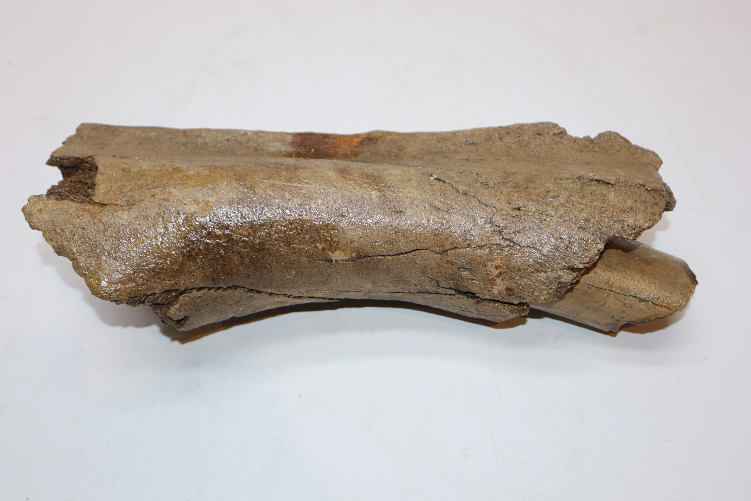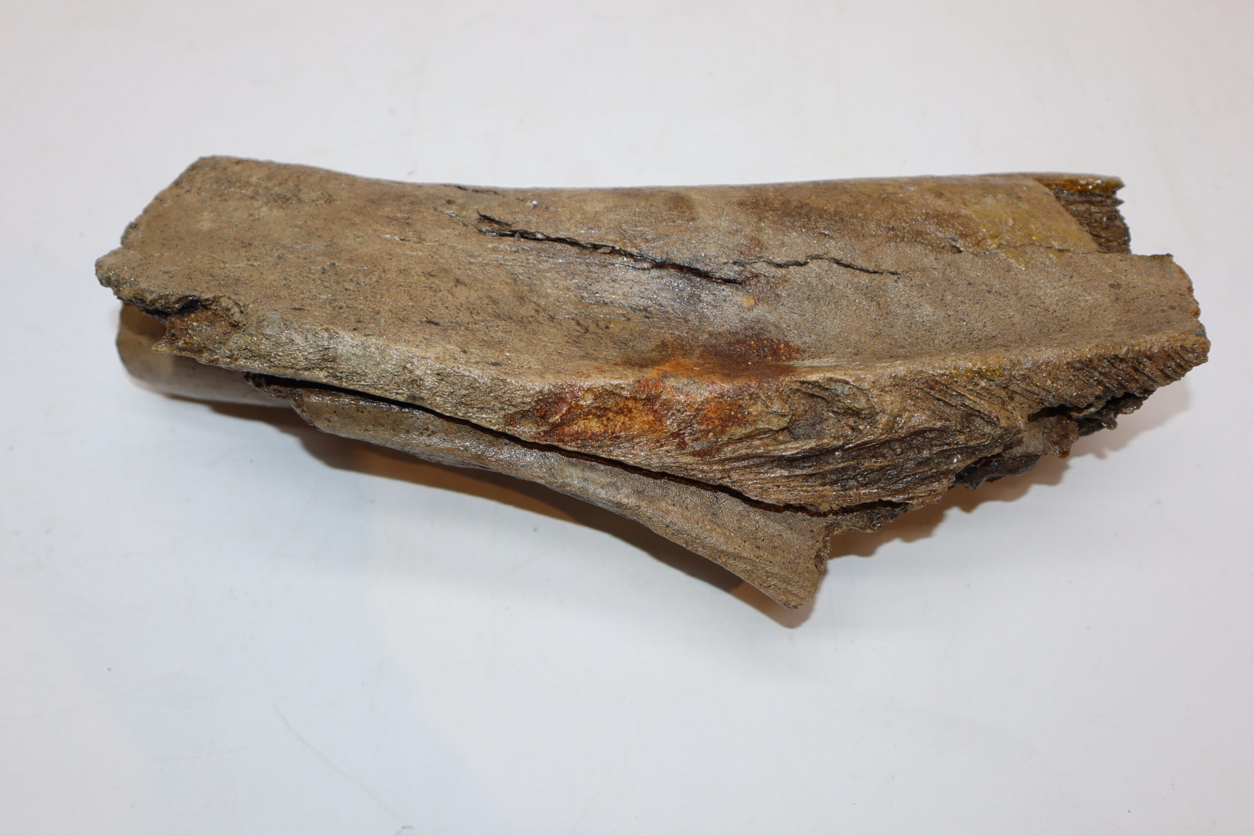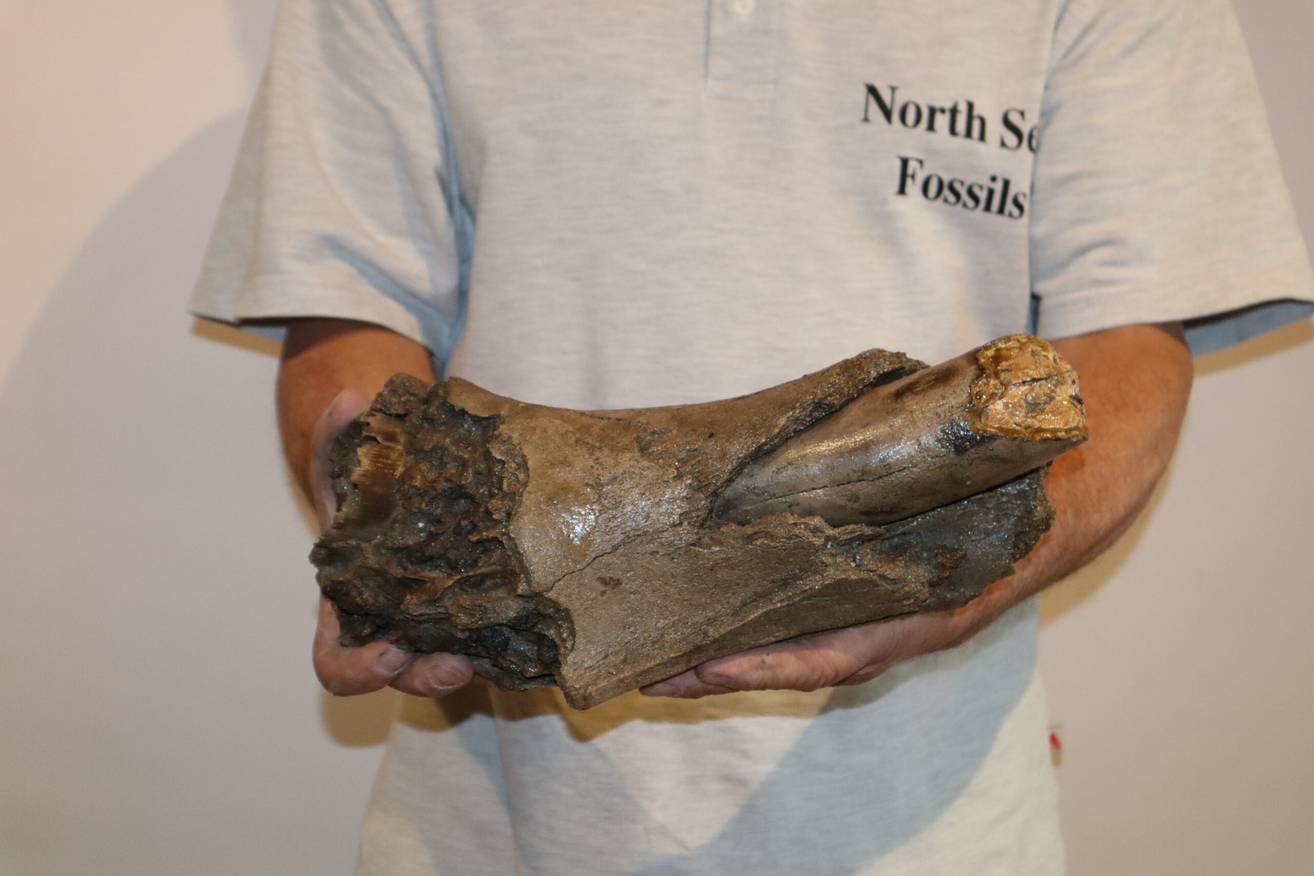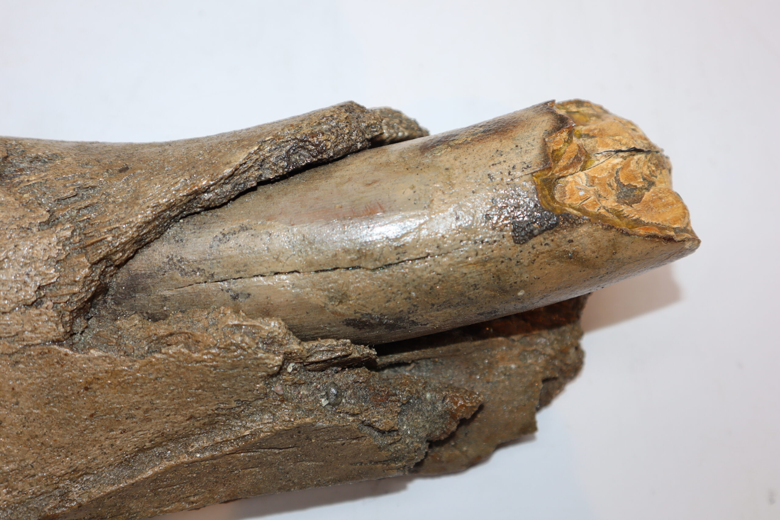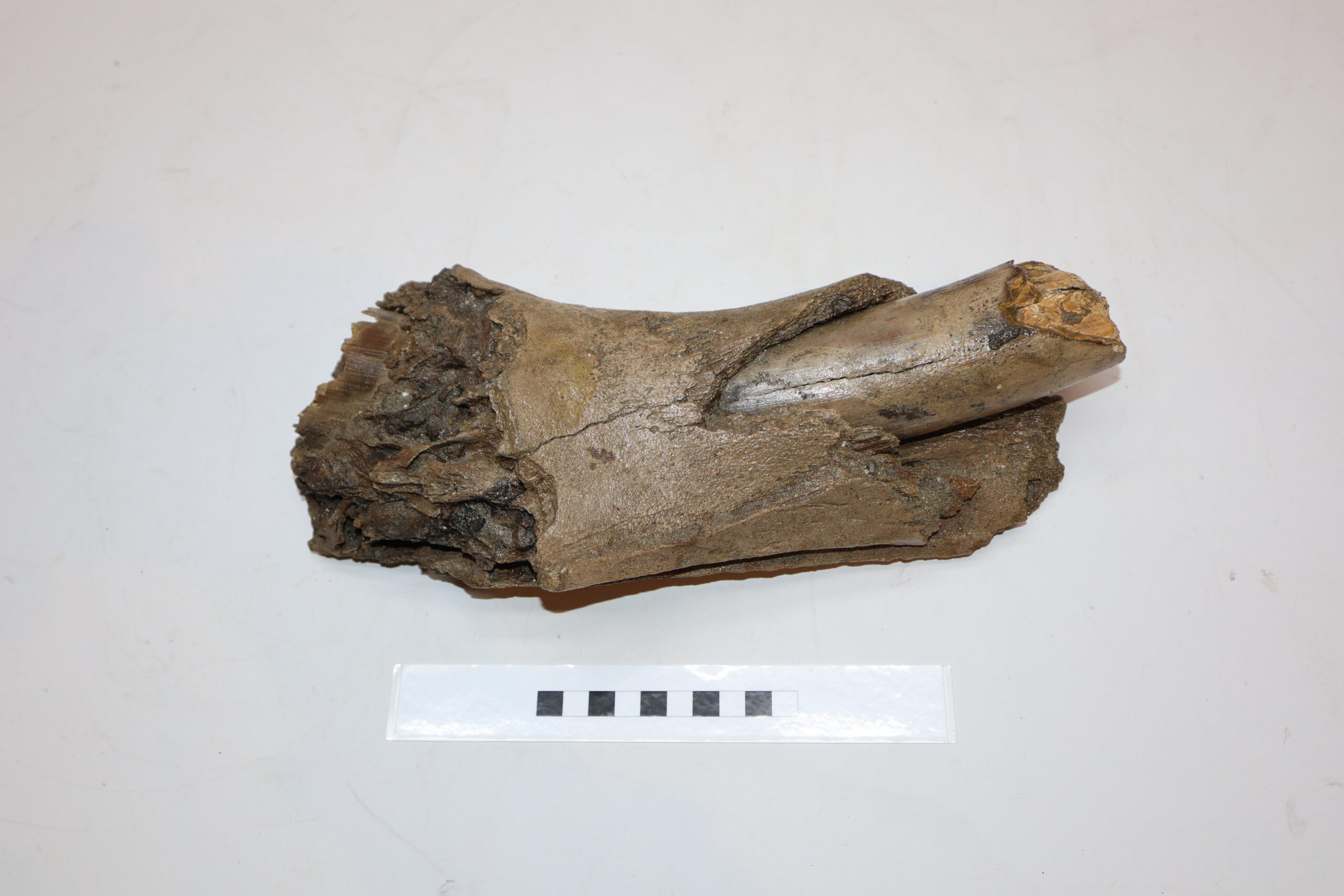 On offer is a wonderful and very rare partial aveole with a piece of tusk still inserted, belonging to a Woolly Mammoth from the Pleistocene era. Good condition, as seen in the images. No restoration whatsoever. The black and white section of the ruler in the image represents 10 cm / 3.9 inch. This piece has been applied with a matt finish, but it is also possible to order it with a glossy finish.