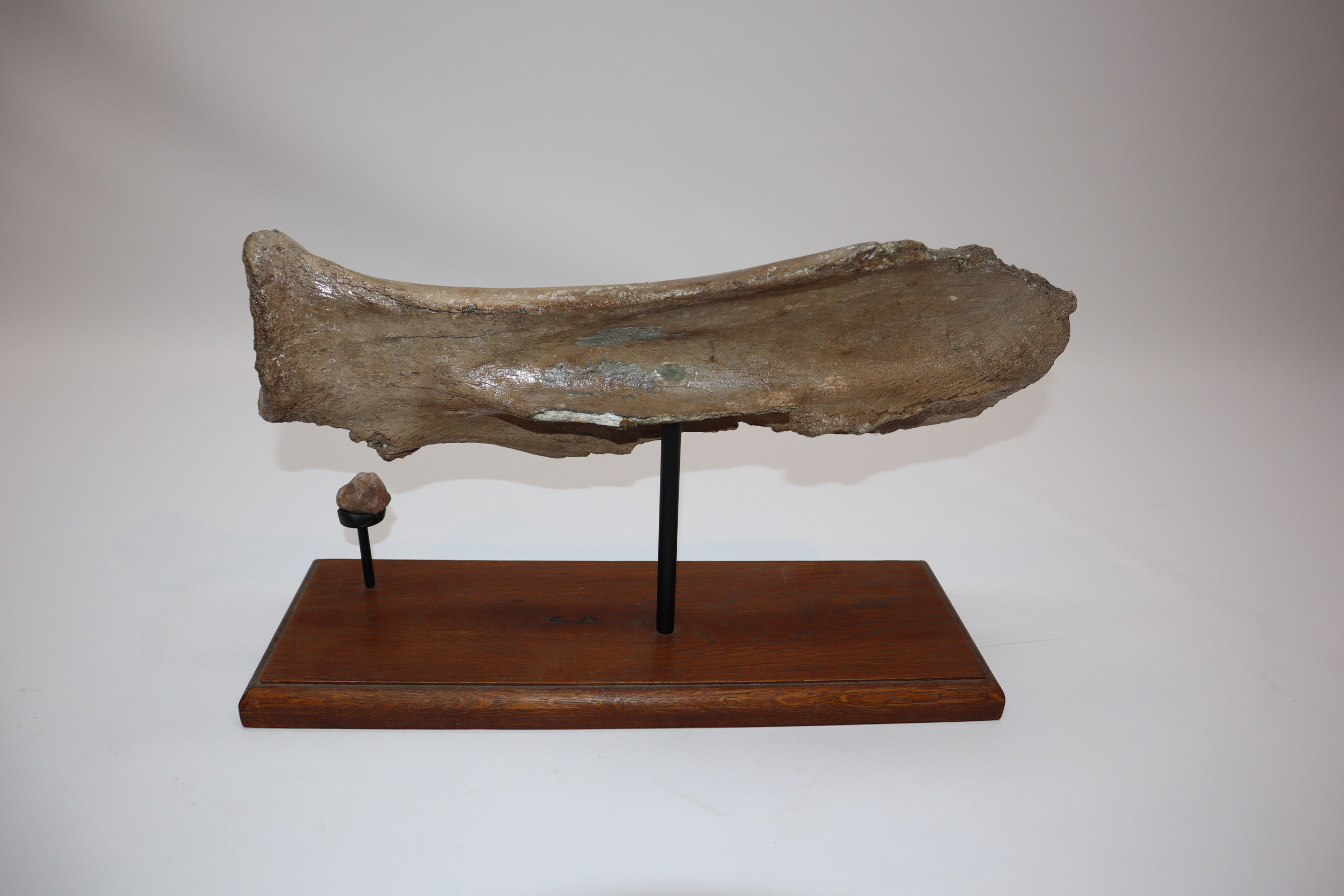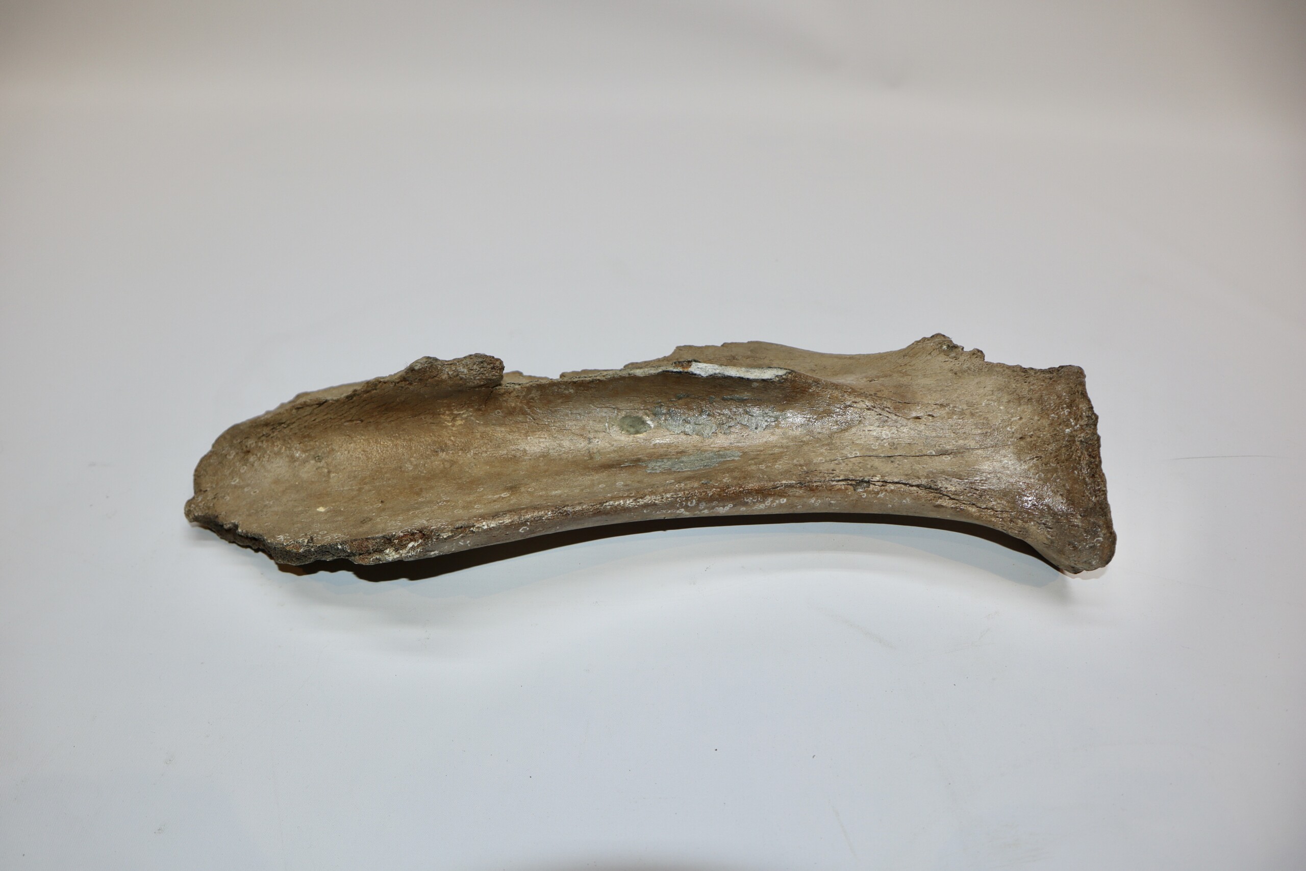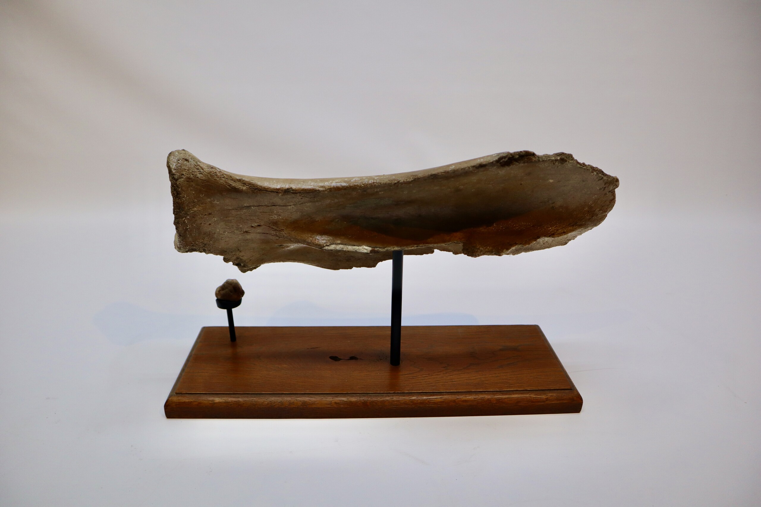 On offer is a beautiful scapula (shoulderblade) of a Wisent from the Pleistocene era. This pieceย isย in good condition, as seen in the photographs. Interestingly, there are bite marks of a Hyena, and this piece is presented with a cropolyte (fossilized feces) of a Hyena. The black and white ruler in the image represents 10 cm / 3.9 inch.