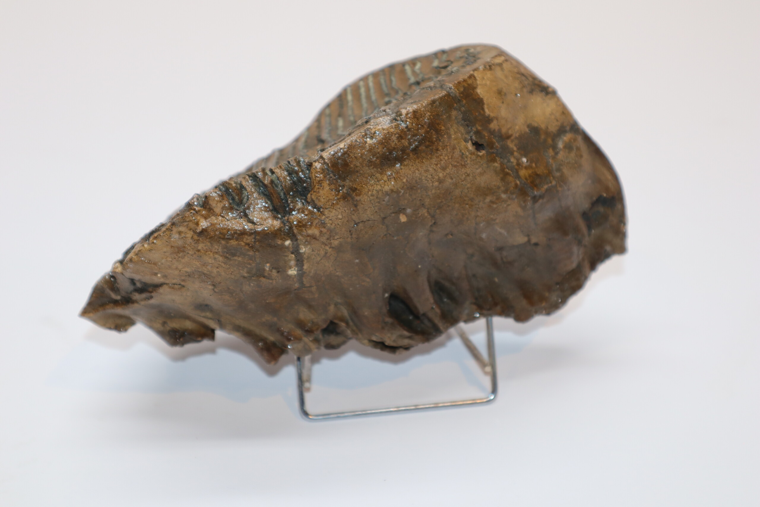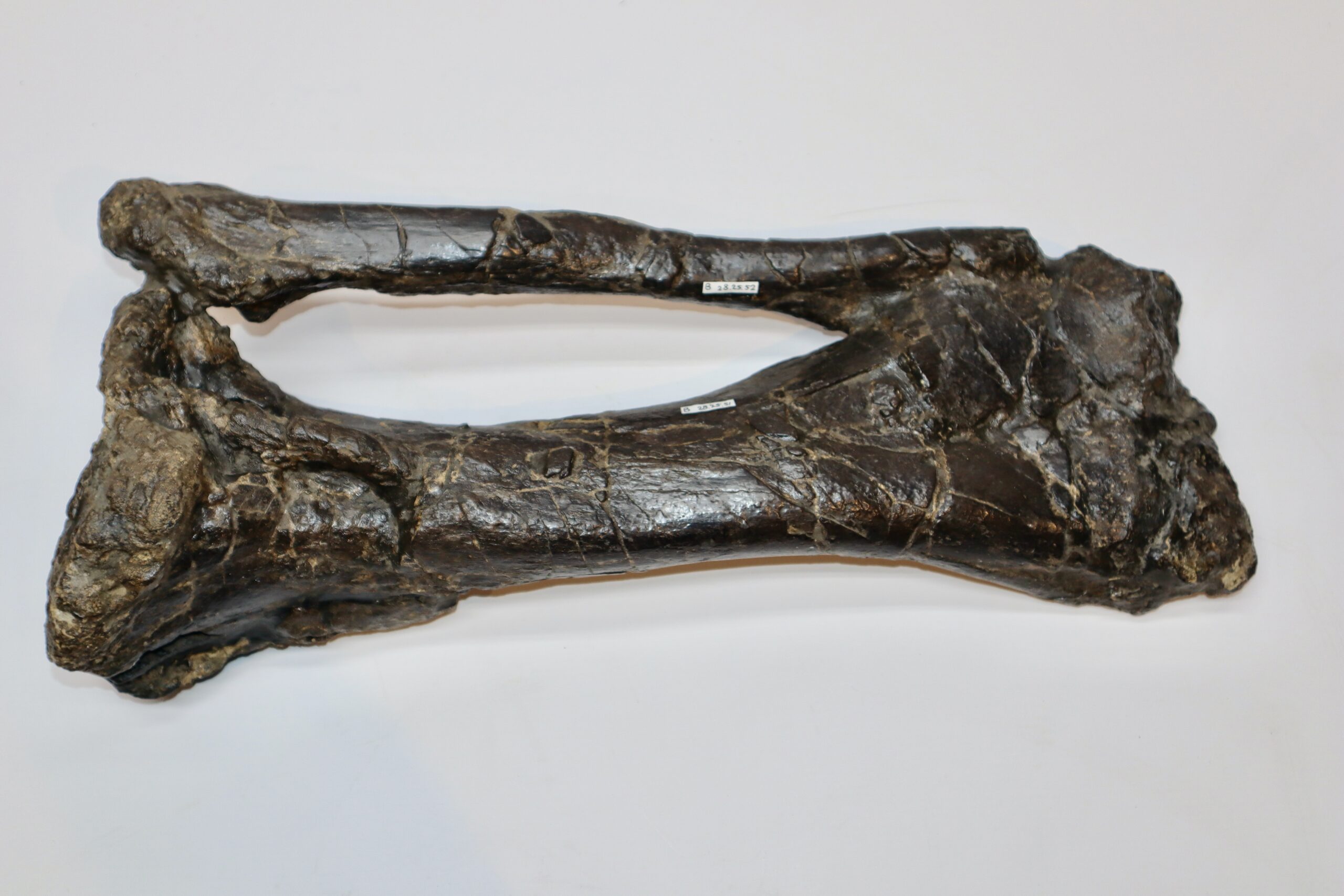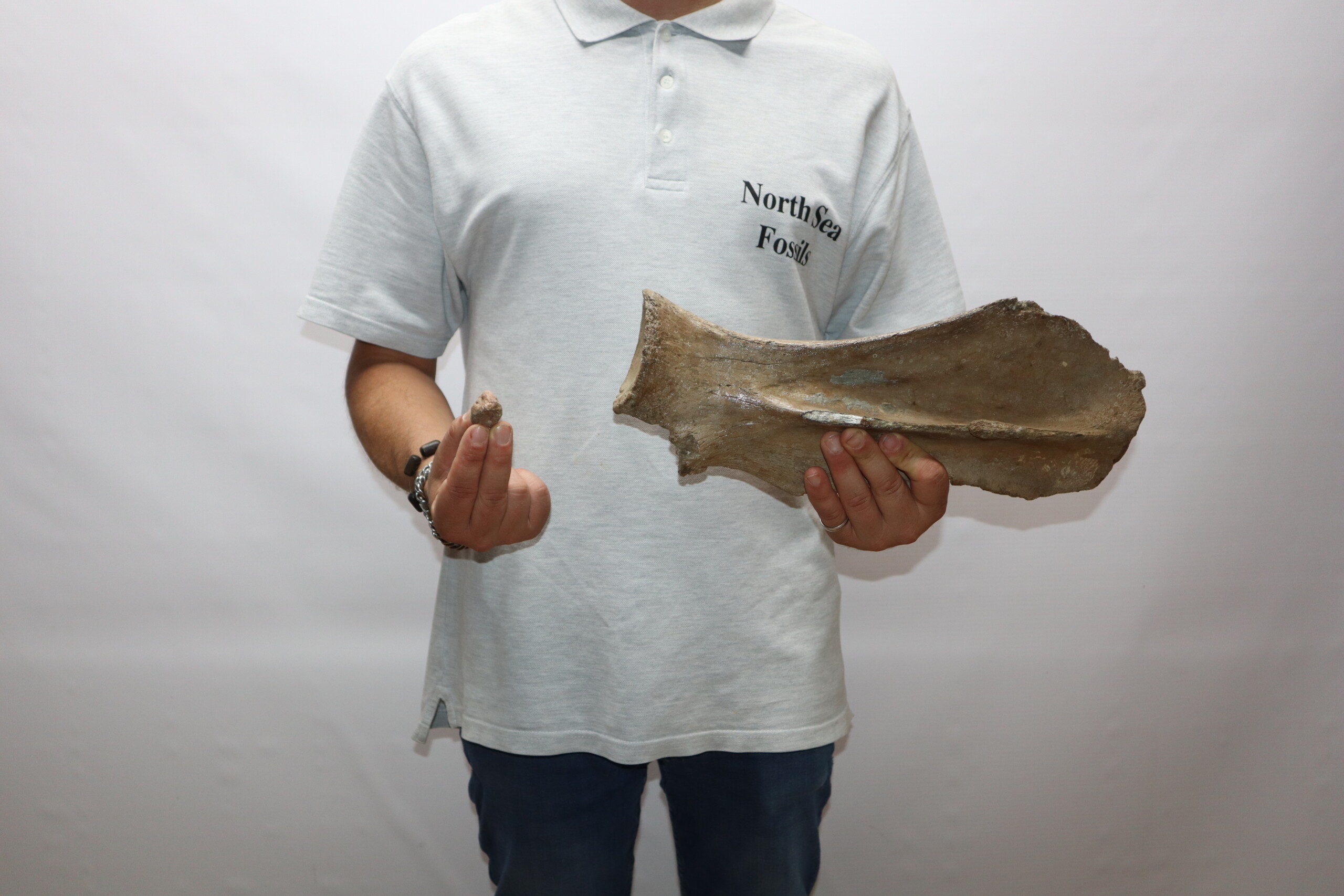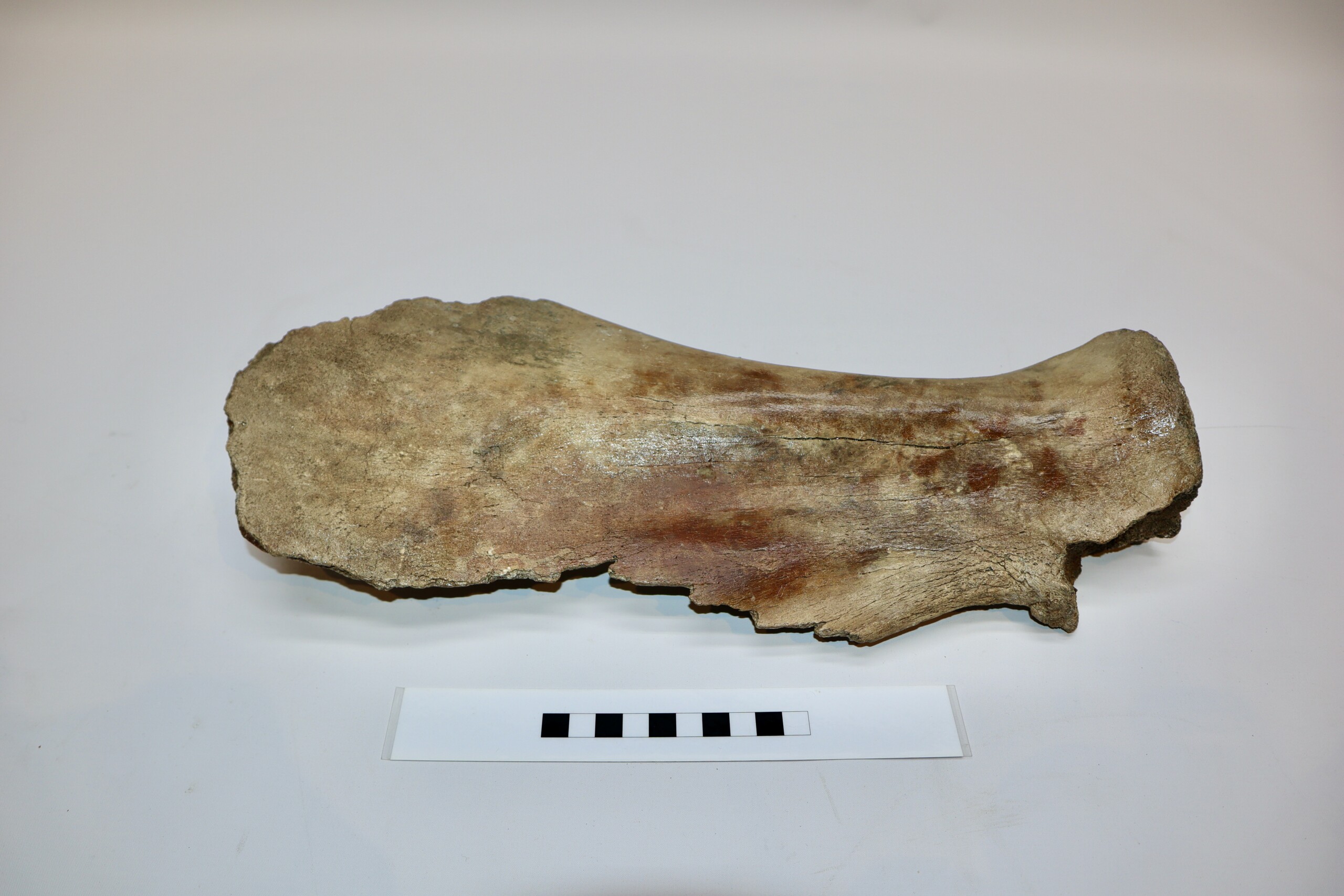 On offer is a beautiful scapula (shoulderblade) of a Wisent from the Pleistocene era. This pieceย isย in good condition, as seen in the photographs. Interestingly, there are bite marks of a Hyena, and this piece is presented with a cropolyte (fossilized feces) of a Hyena. The black and white ruler in the image represents 10 cm / 3.9 inch.