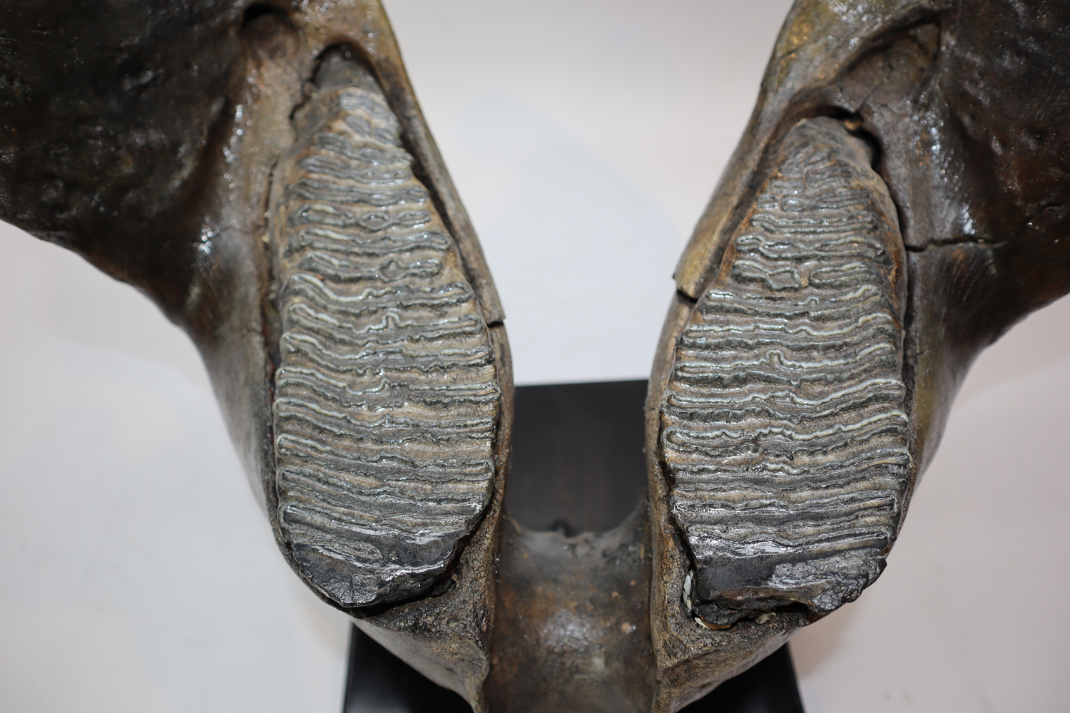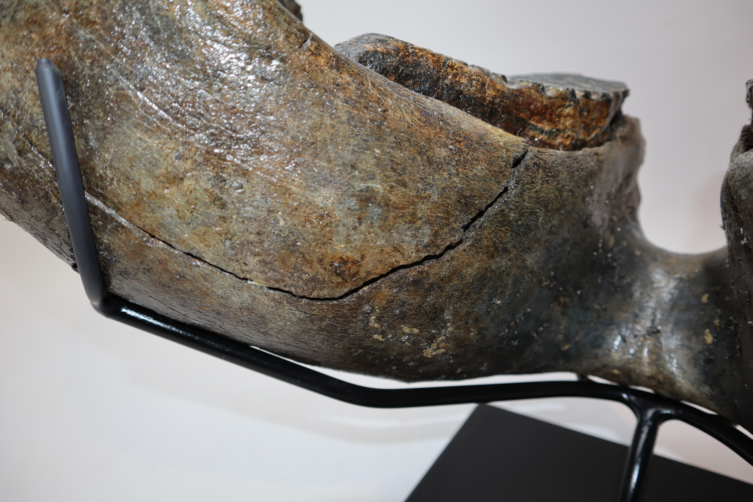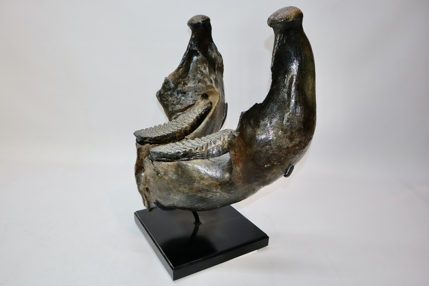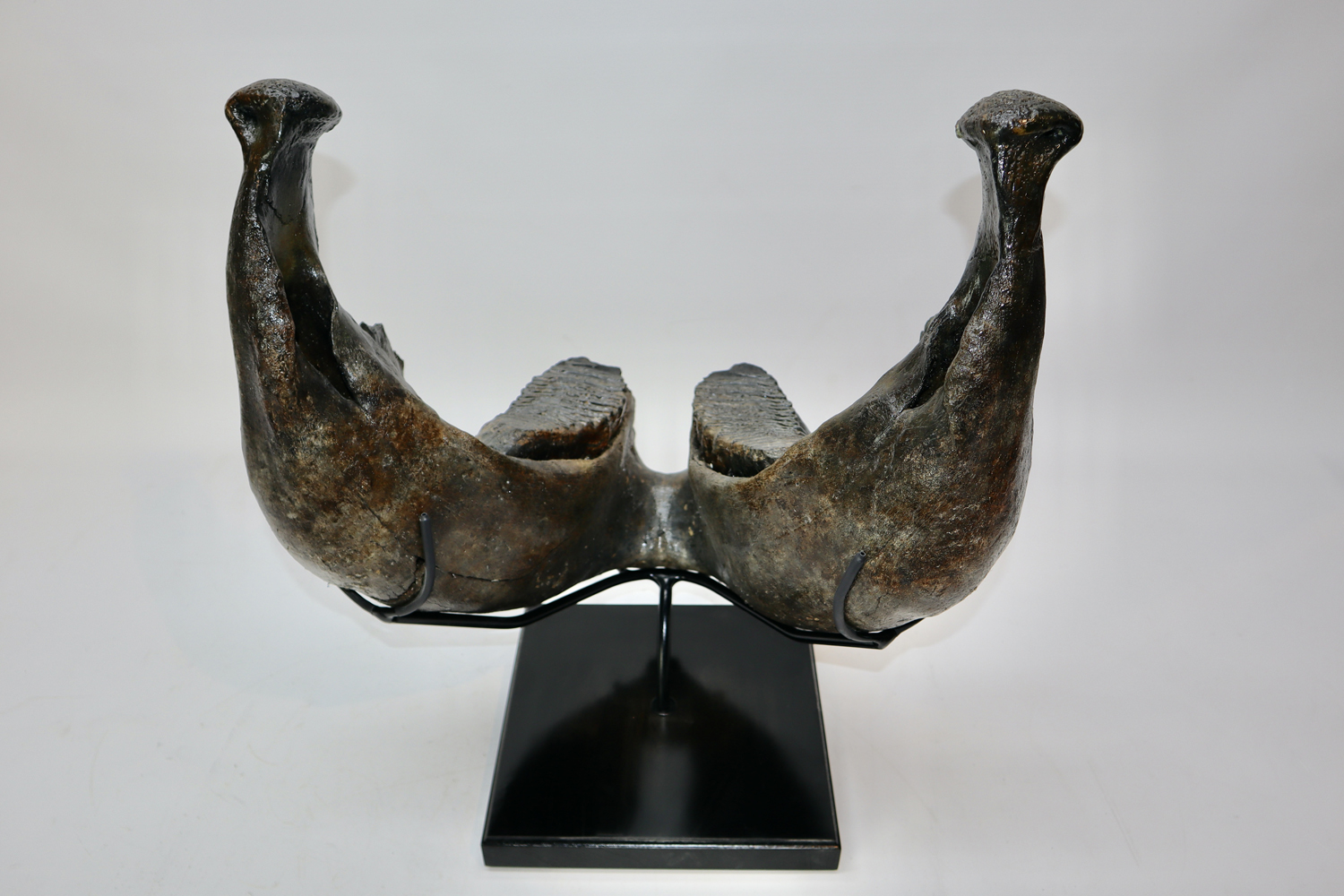 On offer is a superb lower jaw of an adult Woolly Mammoth from the Pleistocene era. This piece still includes the original two M3 molars, still locked in the jaw tissue. This piece is in very good condition, with many details of anatomy still intact and as such rare, as intricate pieces like this rarely survive intact. The condyles are added restorations, cast in resin; otherwise no restoration. The black-and-white section of the ruler in the image represents 10 cm / 3.9 inch.