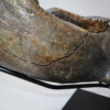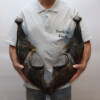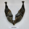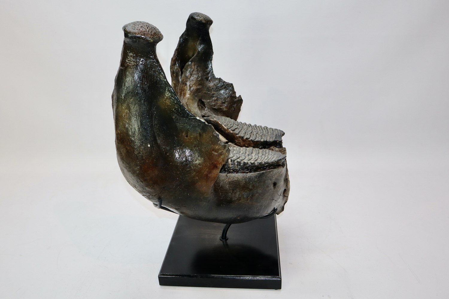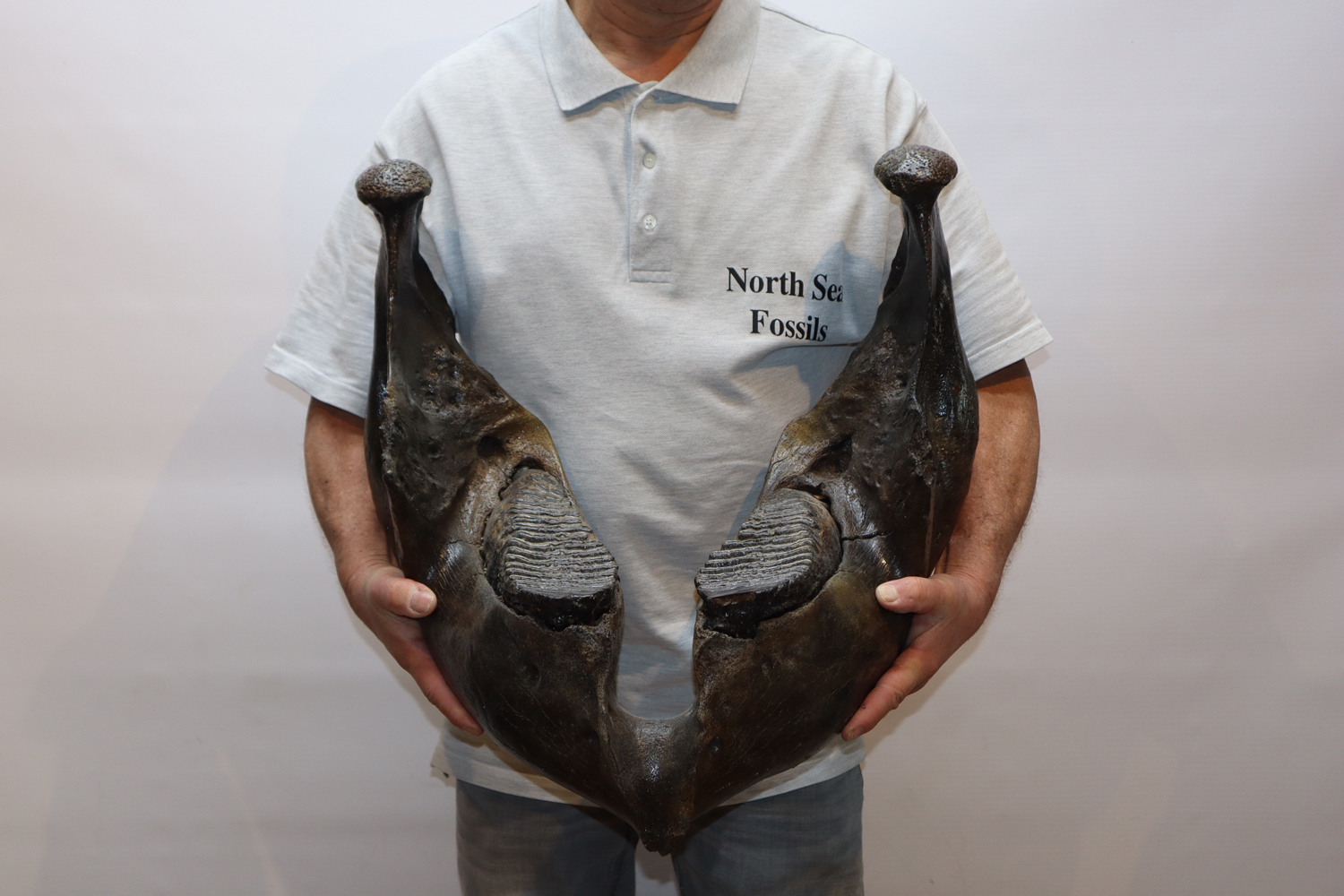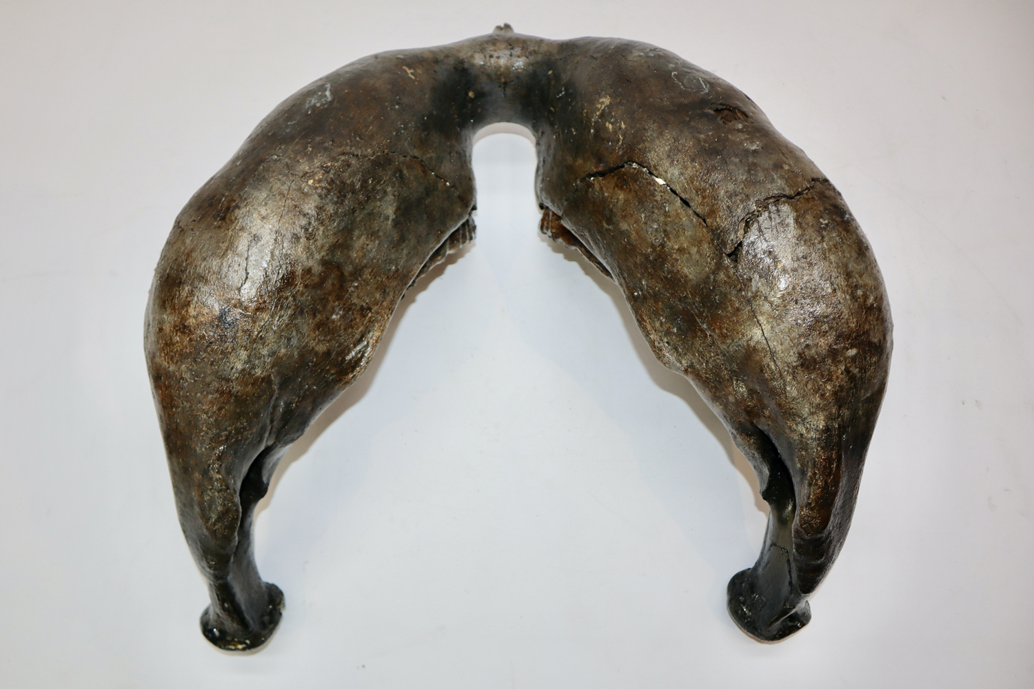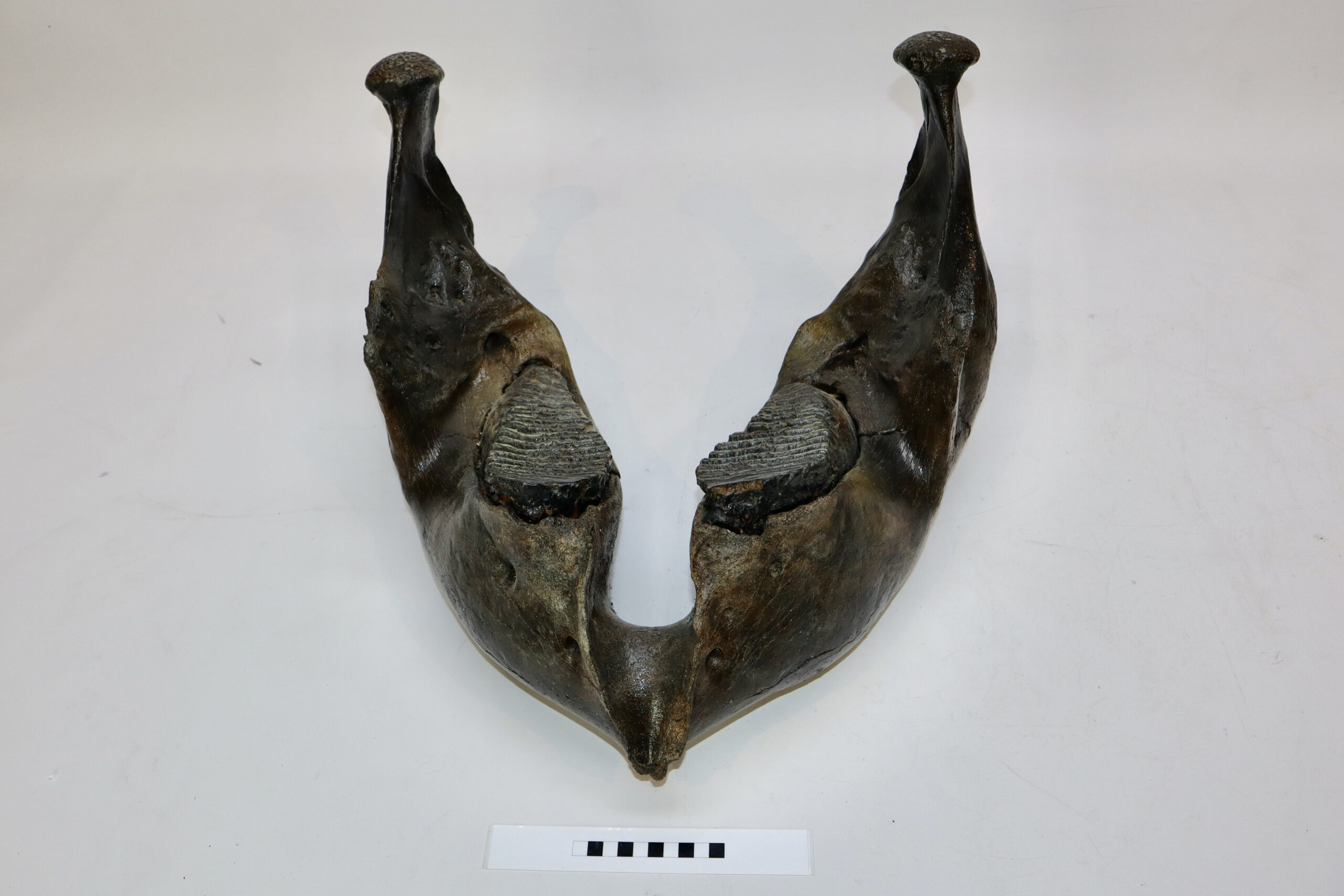 On offer is a superb lower jaw of an adult Woolly Mammoth from the Pleistocene era. This piece still includes the original two M3 molars, still locked in the jaw tissue. This piece is in very good condition, with many details of anatomy still intact and as such rare, as intricate pieces like this rarely survive intact. The condyles are added restorations, cast in resin; otherwise no restoration. The black-and-white section of the ruler in the image represents 10 cm / 3.9 inch.