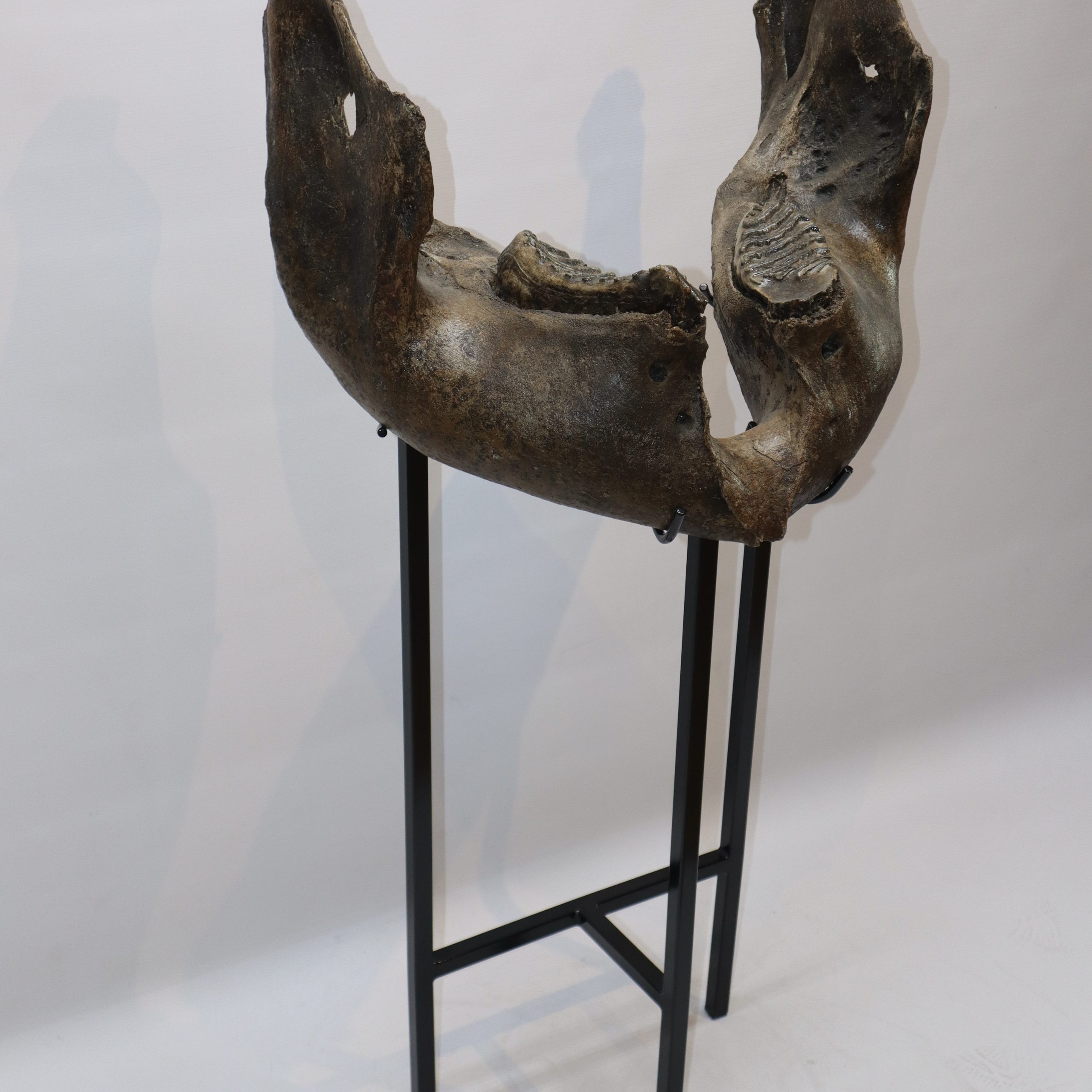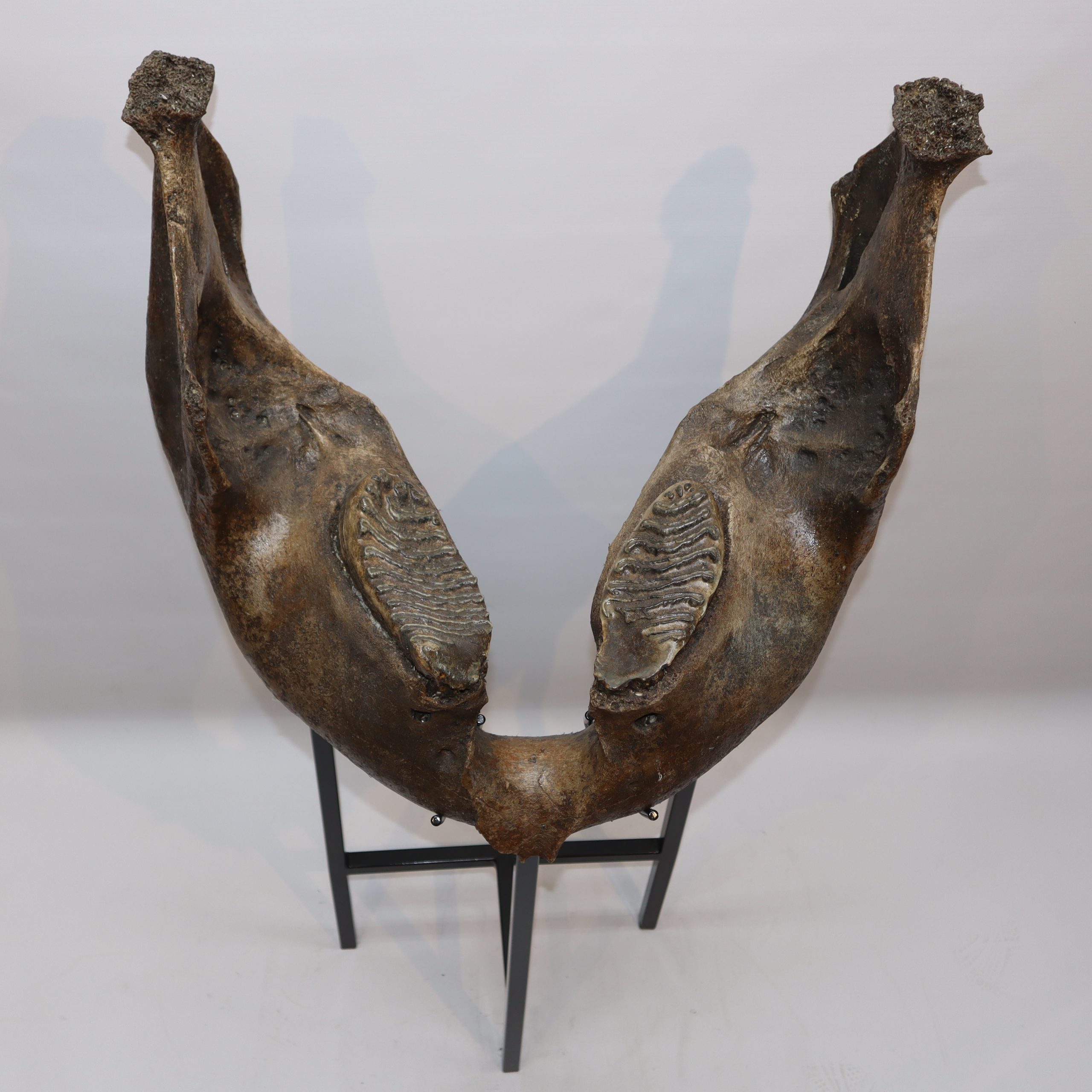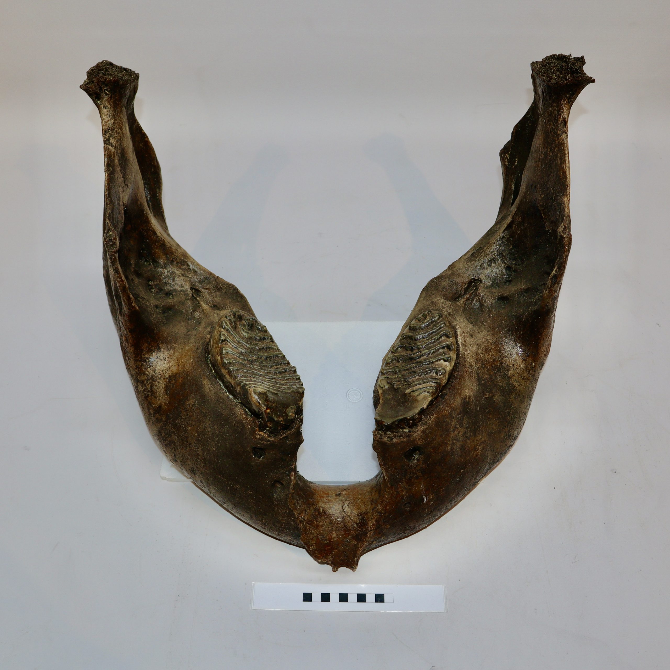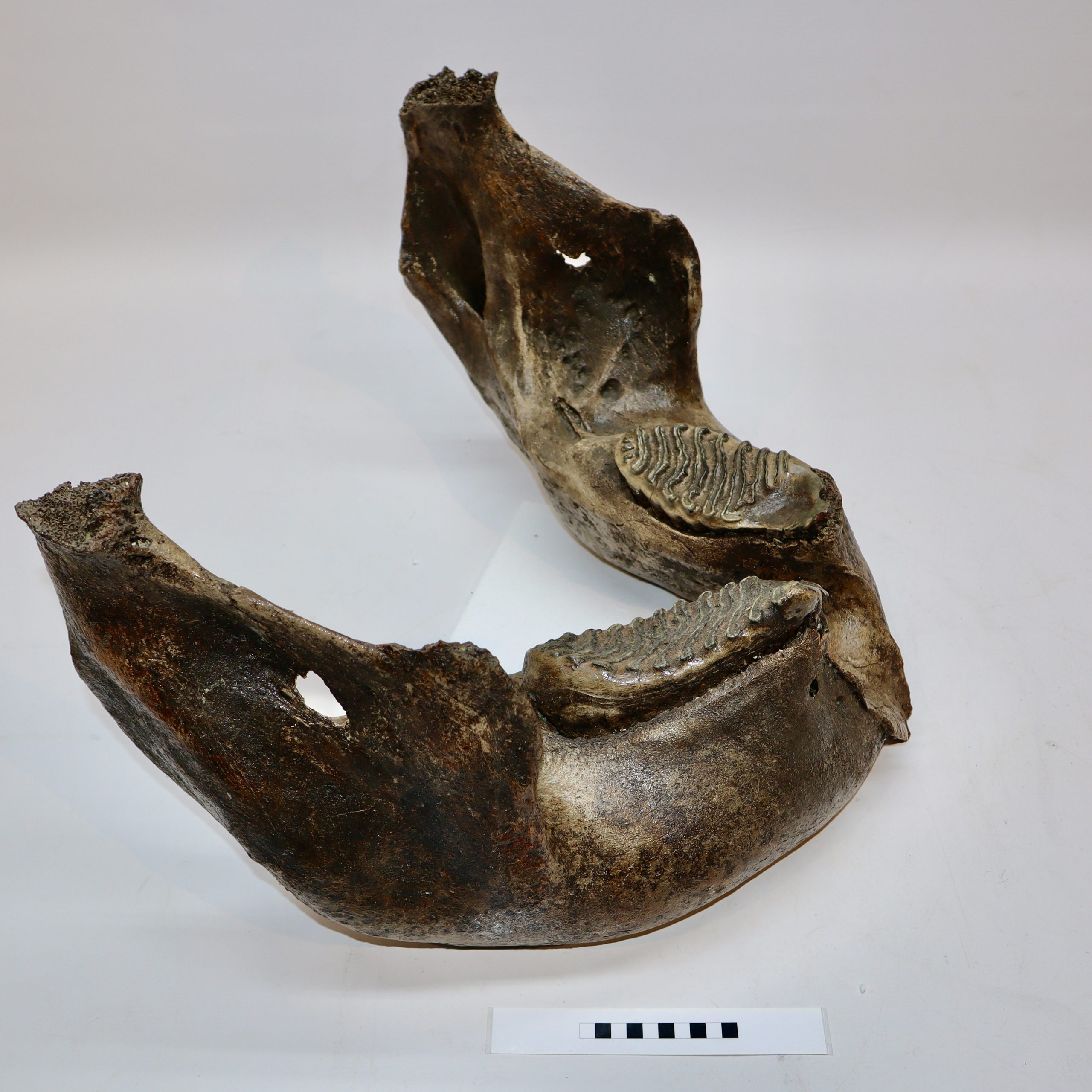 On offer is a superb lower jaw of an adult Woolly Mammoth from the Pleistocene era. This piece still includes the original two M3 molars, still locked in the jaw tissue. This piece is in very good and nearly completely intact condition, with many details of anatomy still intact and as such very rare as intricate pieces like this rarely survive in such good shape. No restoration whatesoever. This jaw must have belonged to a very old mammoth, which had reached the end of its natural life. The black-and-white section of the ruler in the image represents 10 cm / 3.9 inch.