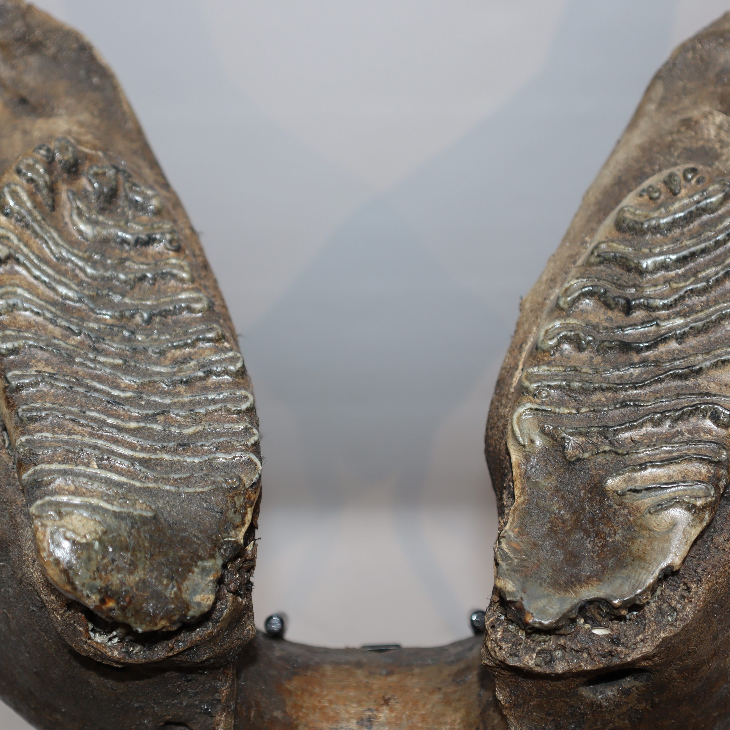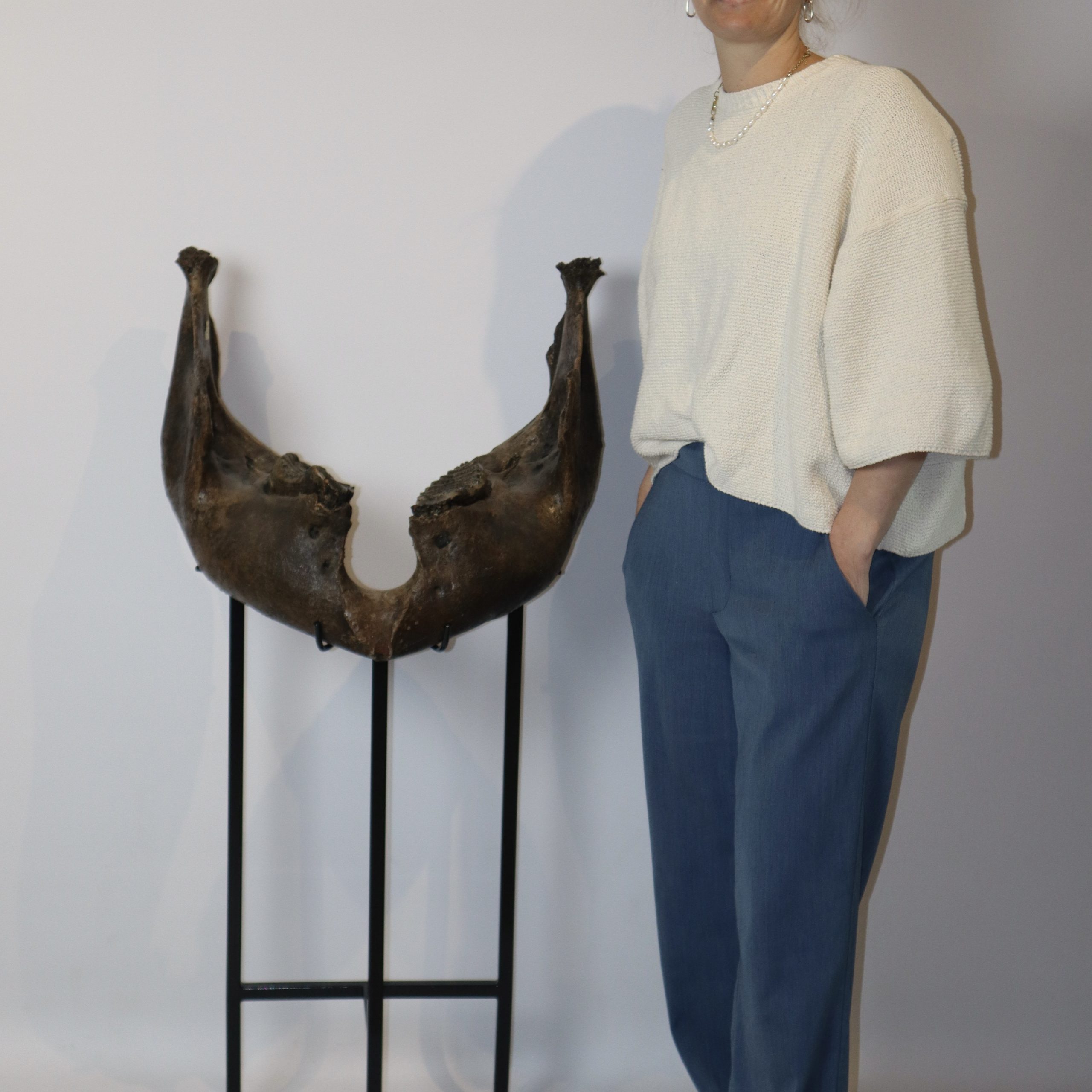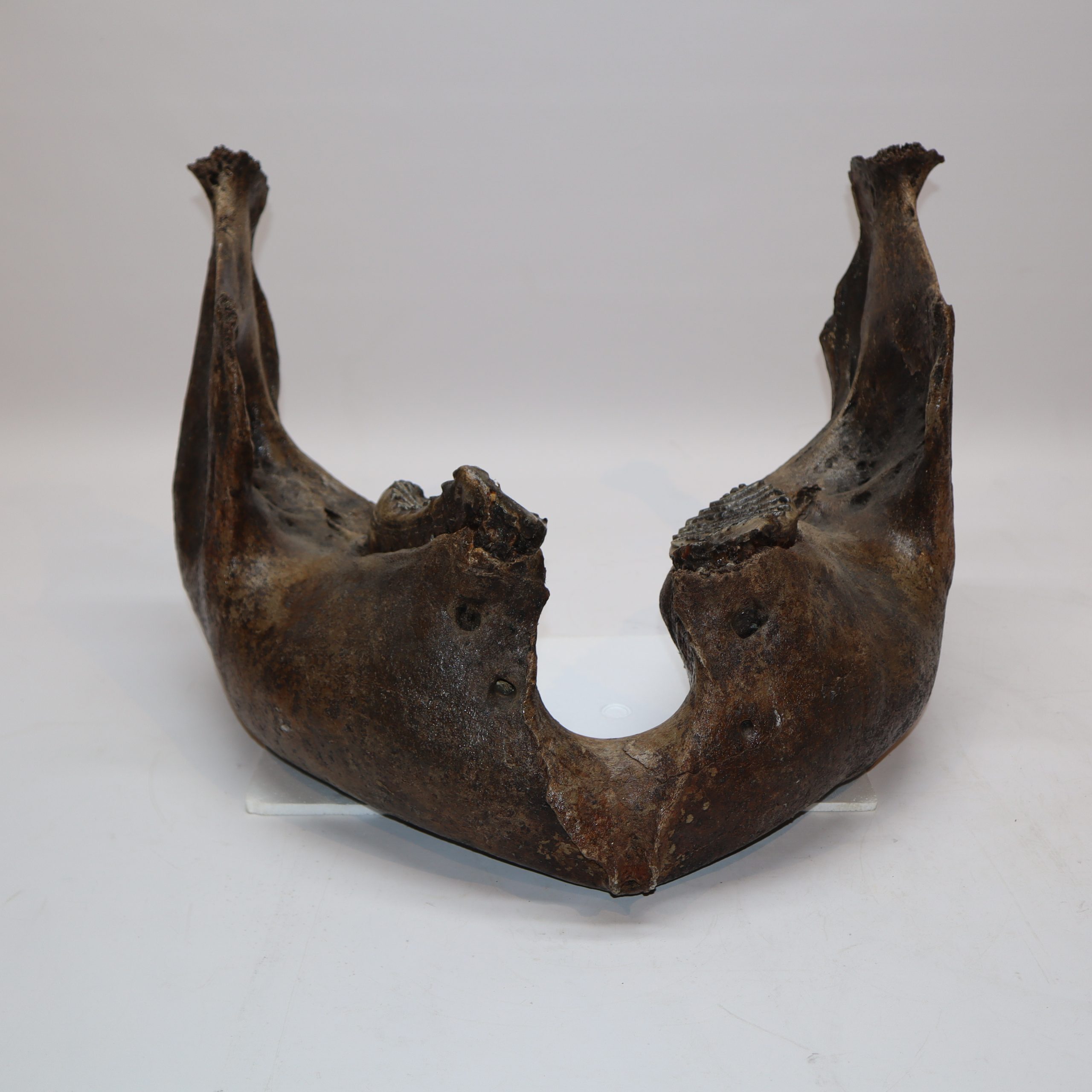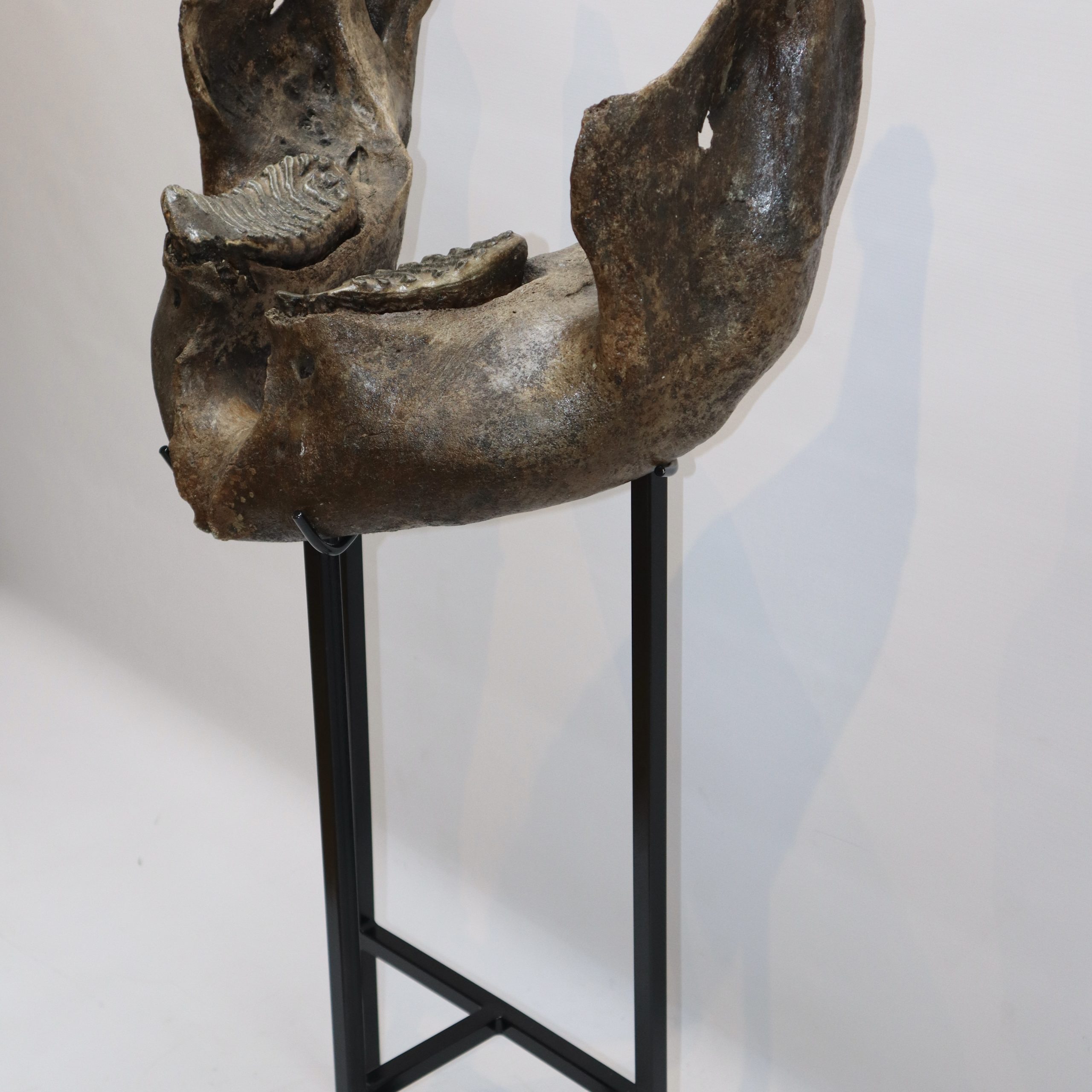 On offer is a superb lower jaw of an adult Woolly Mammoth from the Pleistocene era. This piece still includes the original two M3 molars, still locked in the jaw tissue. This piece is in very good and nearly completely intact condition, with many details of anatomy still intact and as such very rare as intricate pieces like this rarely survive in such good shape. No restoration whatesoever. This jaw must have belonged to a very old mammoth, which had reached the end of its natural life. The black-and-white section of the ruler in the image represents 10 cm / 3.9 inch.