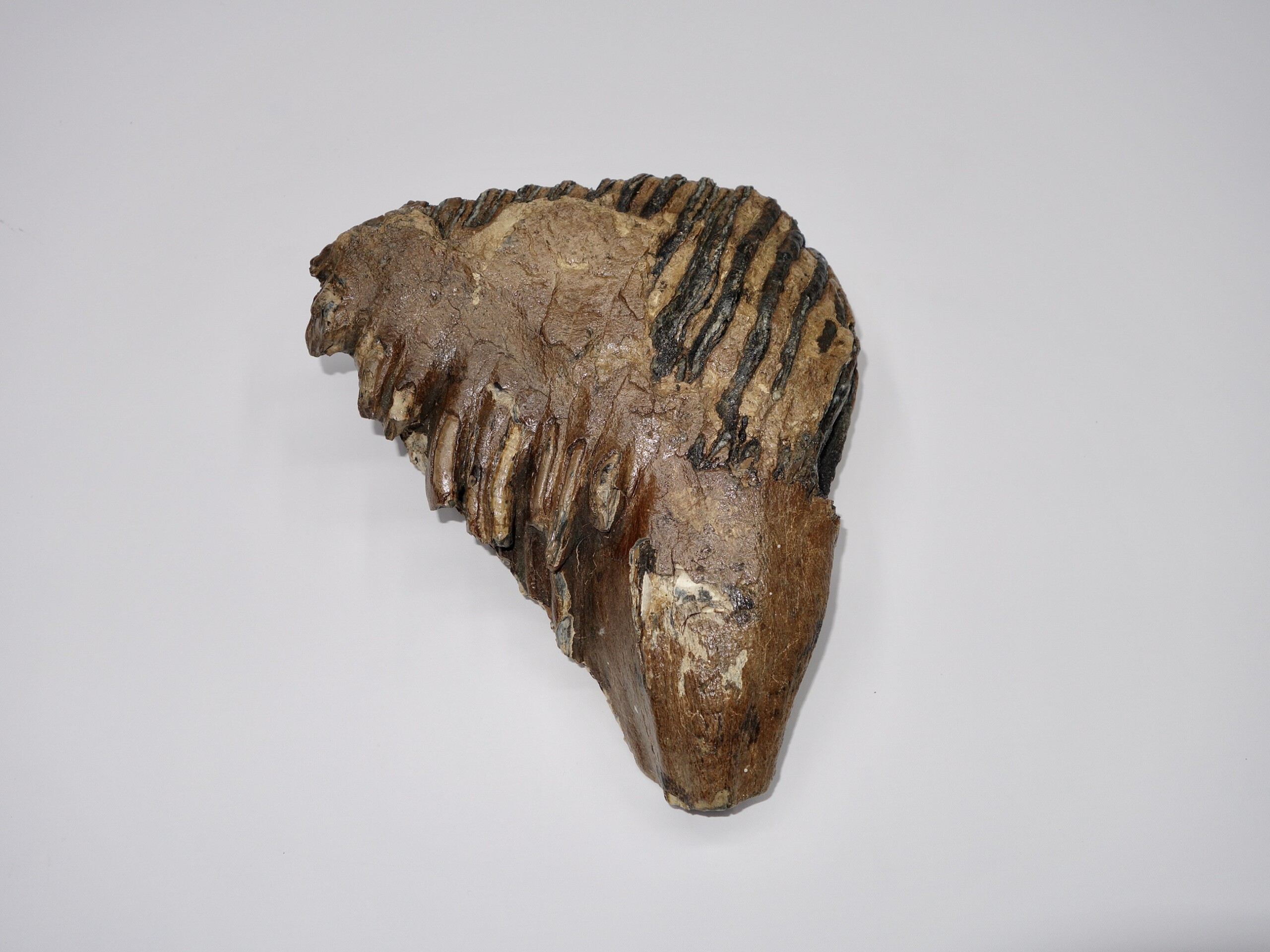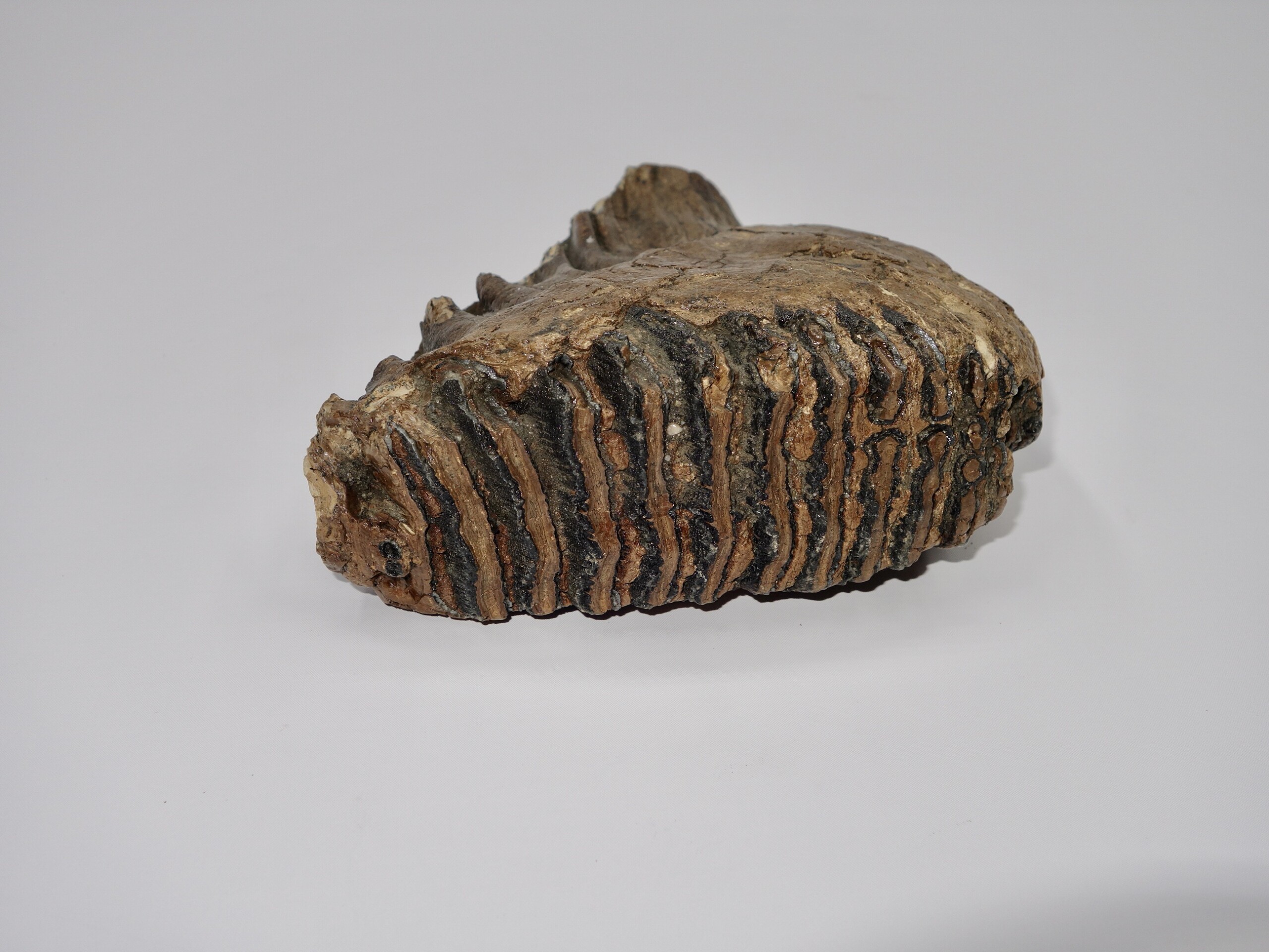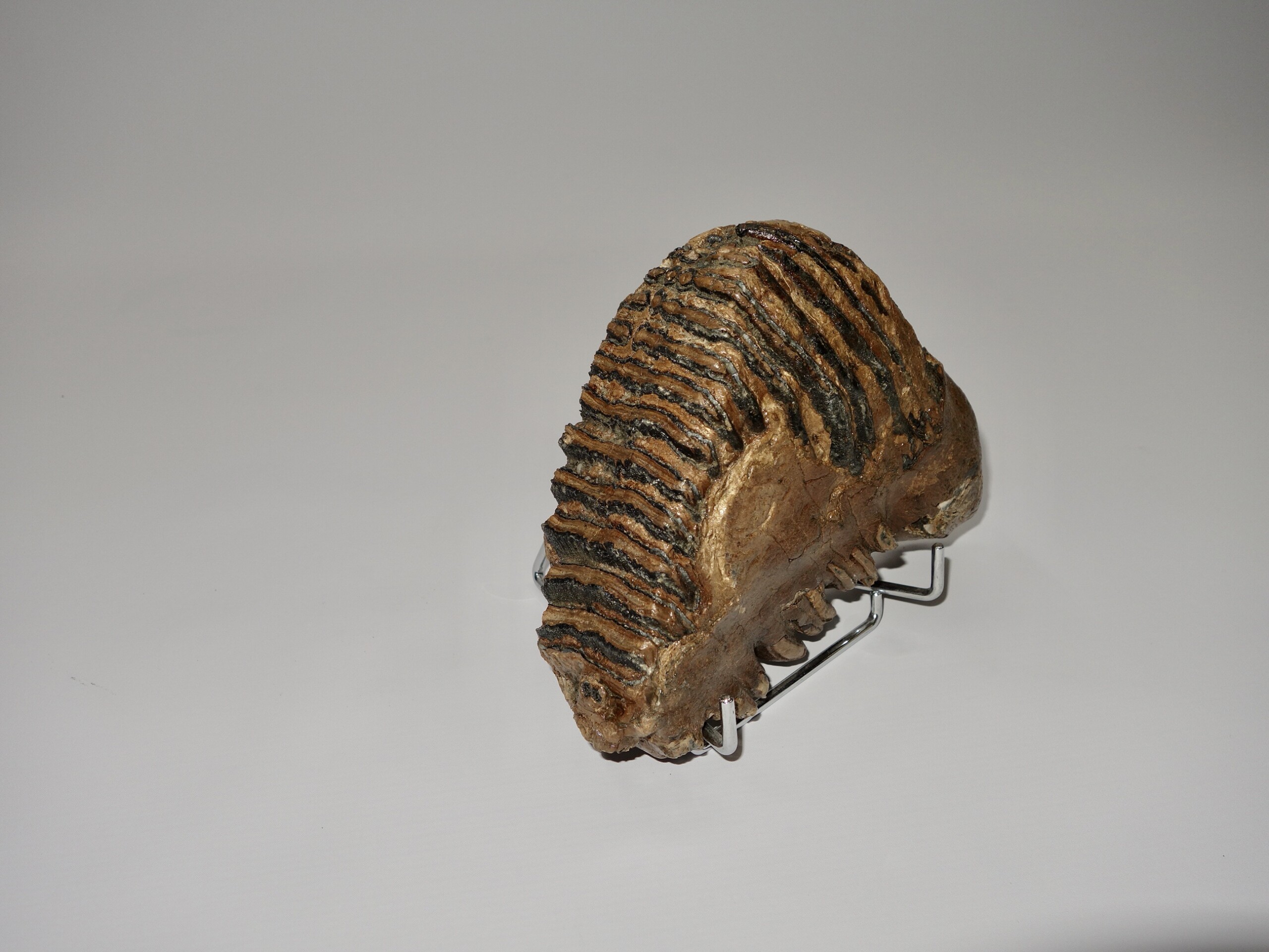 On offer is a superb M3 molar of aย Woolly Mammoth from the Pleistocene era. This molar comes from the left upper jaw and is a nice example of a fully grown animal, in good state of preservation and with a beautiful chewing surface as seen in the images. Judging from the size, this belonged to an adult Mammoth. The black and white section of the ruler in the image represents 10 cm / 3.9 inch. No restoration whatsoever.
