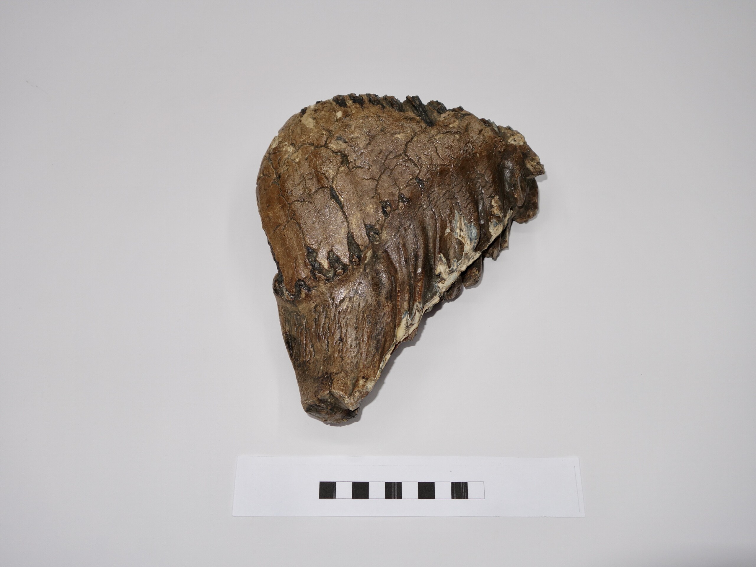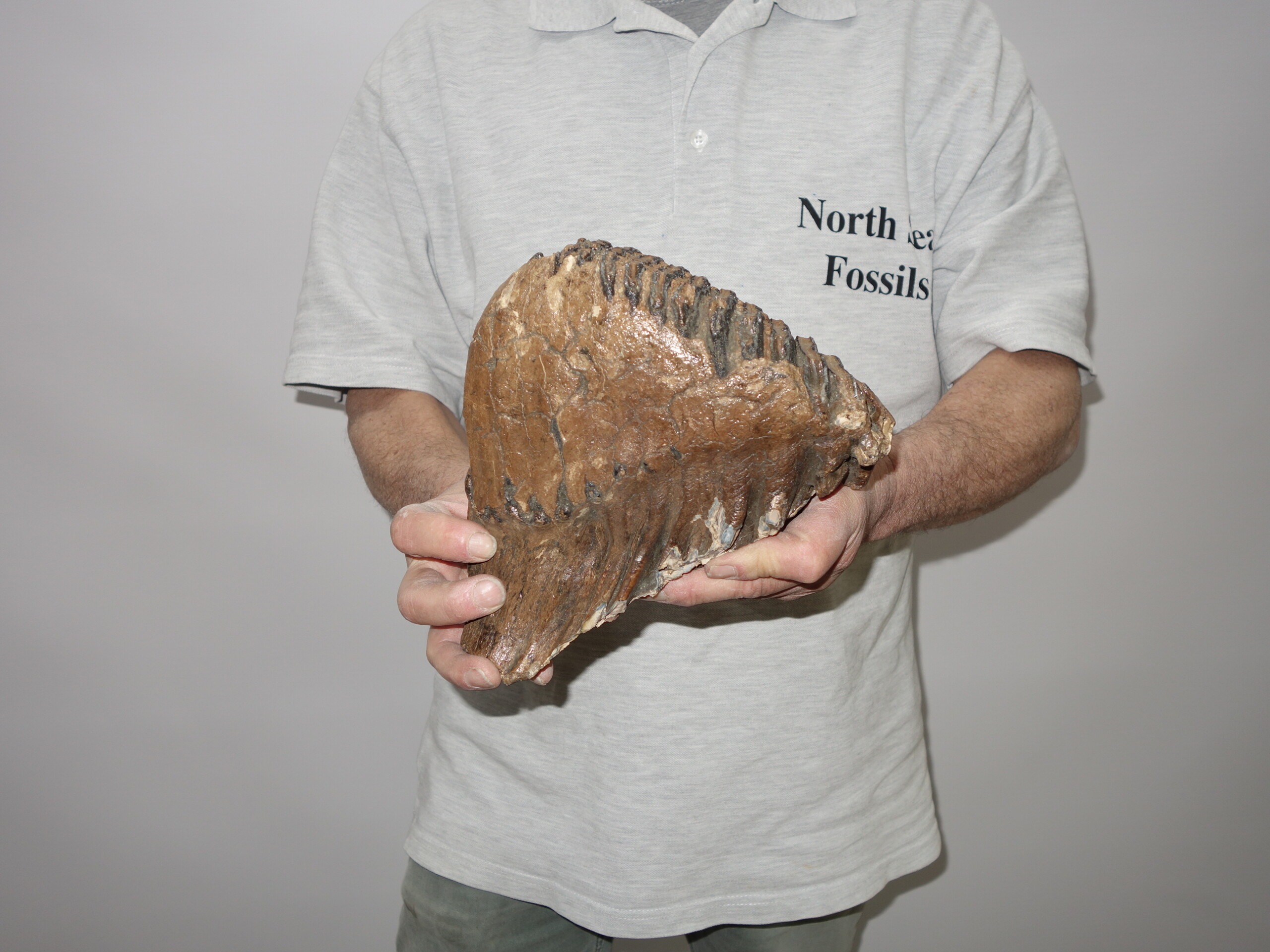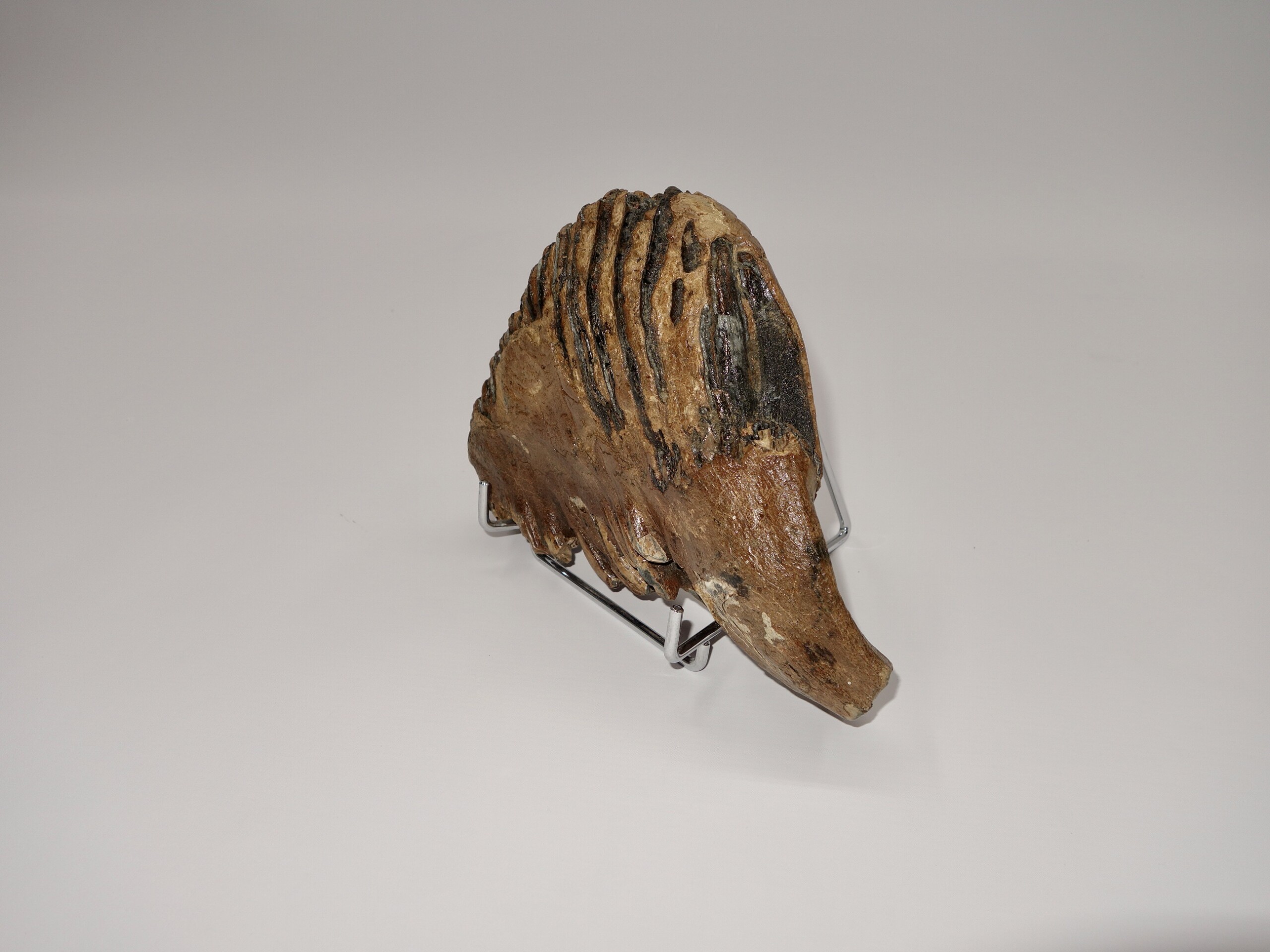 On offer is a superb M3 molar of aย Woolly Mammoth from the Pleistocene era. This molar comes from the left upper jaw and is a nice example of a fully grown animal, in good state of preservation and with a beautiful chewing surface as seen in the images. Judging from the size, this belonged to an adult Mammoth. The black and white section of the ruler in the image represents 10 cm / 3.9 inch. No restoration whatsoever.