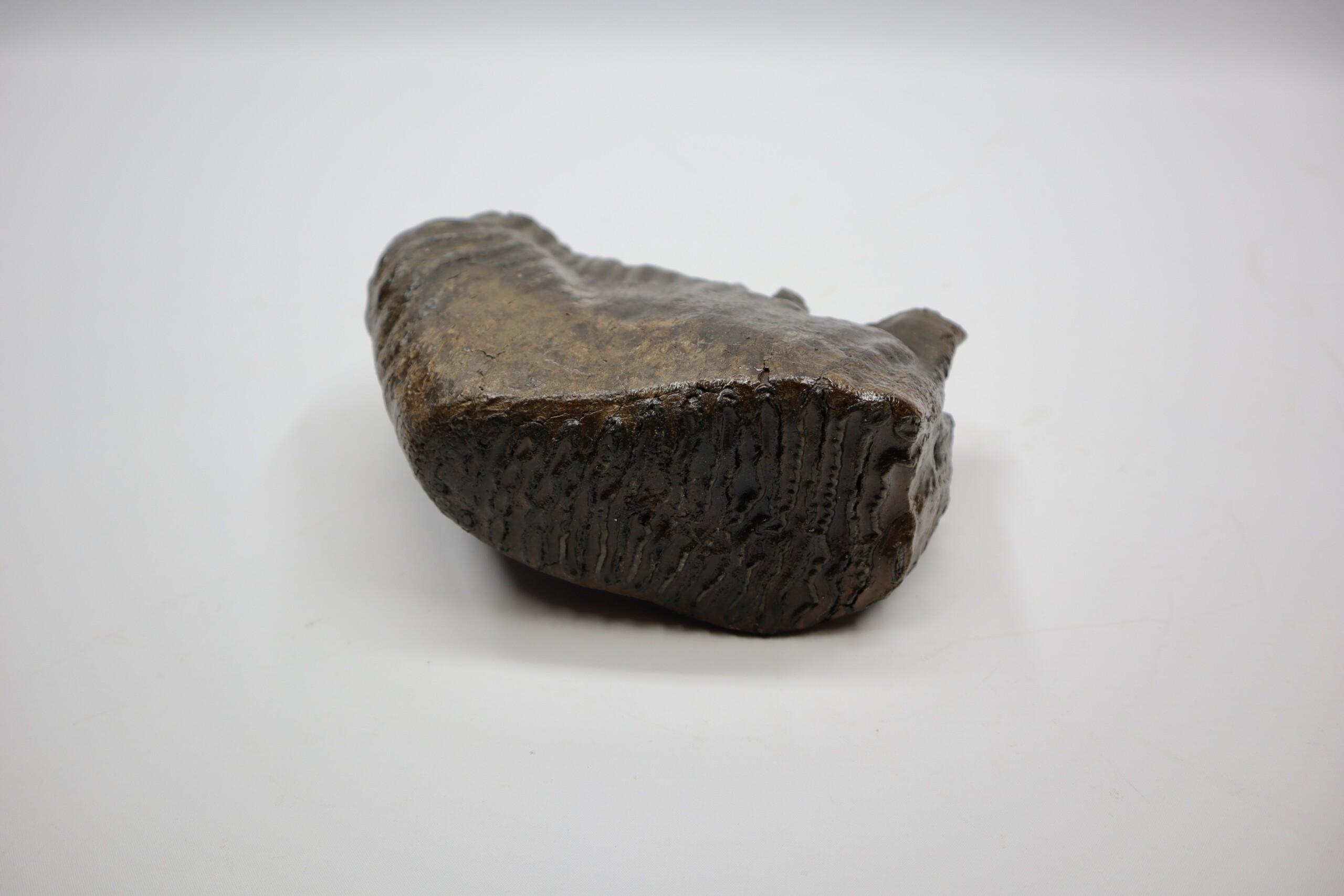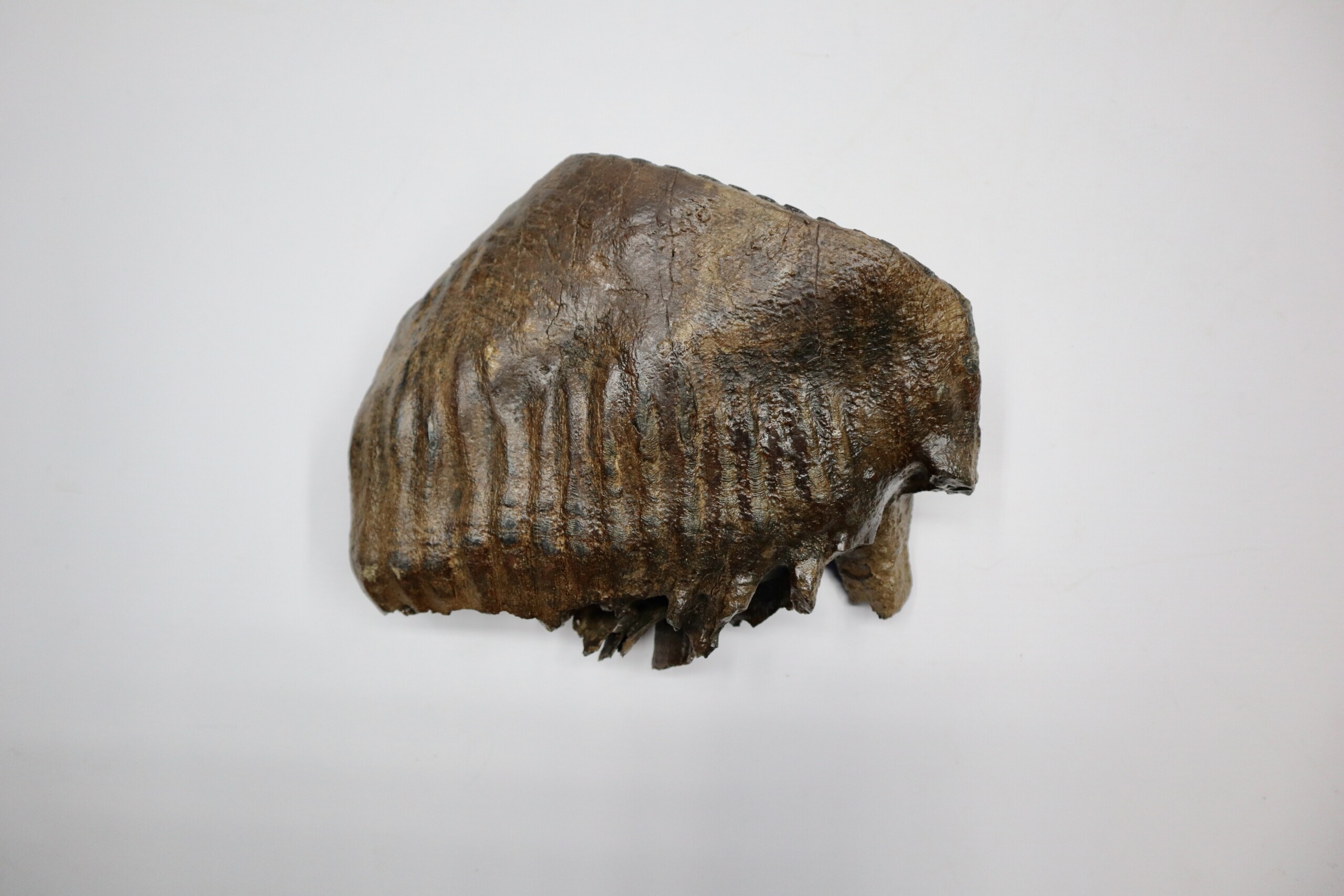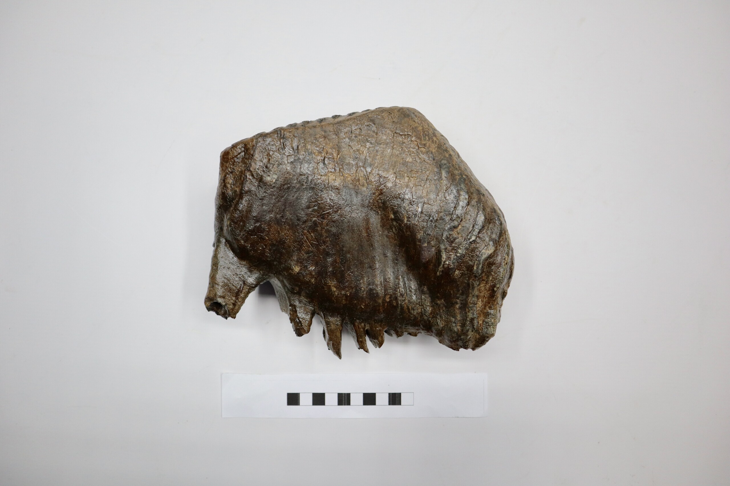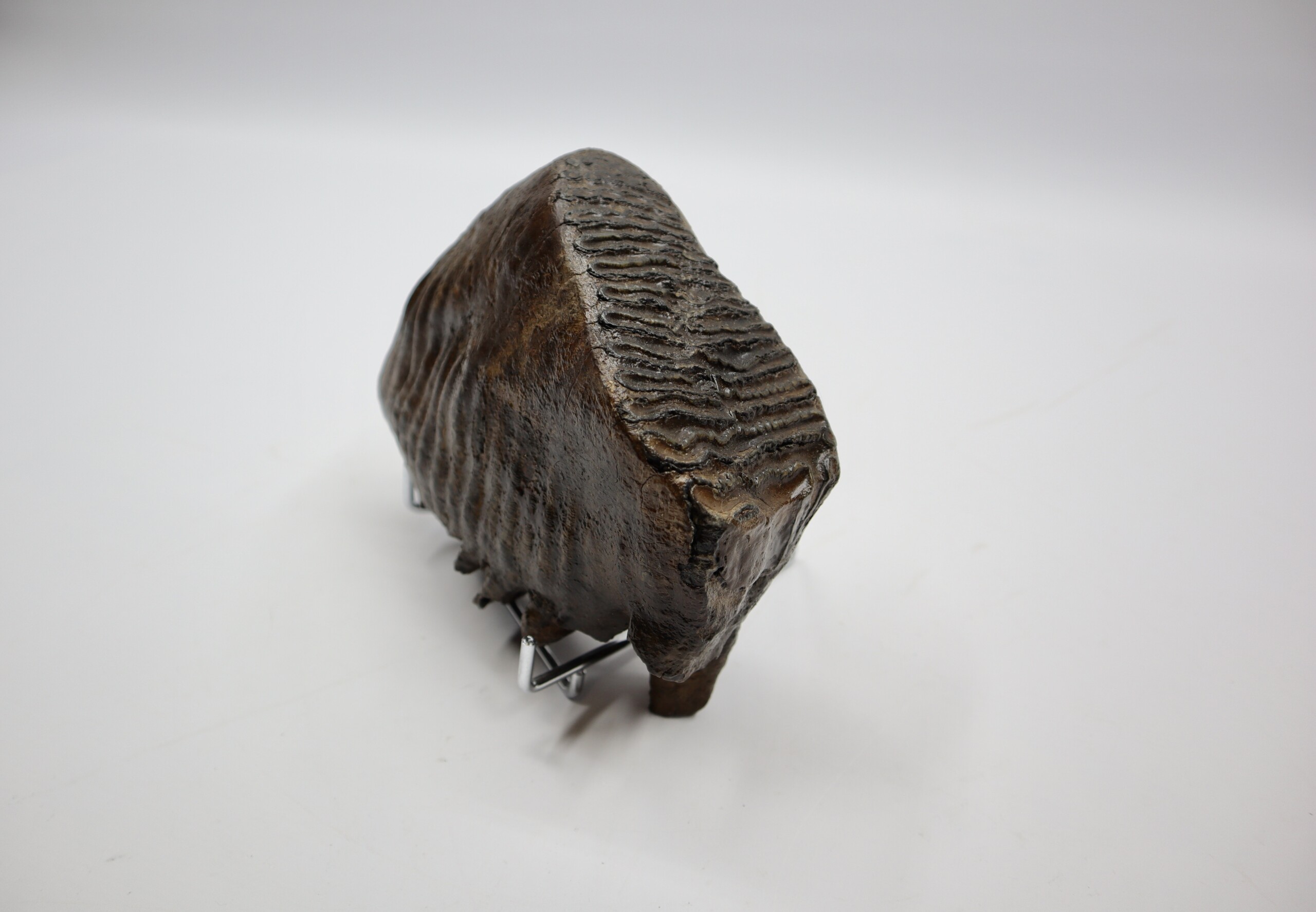 On offer is a superb M3 molar of aย Woolly Mammoth from the Pleistocene era. This molar comes from the left upper jaw and is a beautiful example of a fully grown animal, in fantastic state of preservation and with a beautiful chewing surface as seen in the images. Judging from the size, this belonged to an adult Mammoth. The black and white section of the ruler in the image represents 10 cm / 3.9 inch. No restoration whatsoever.