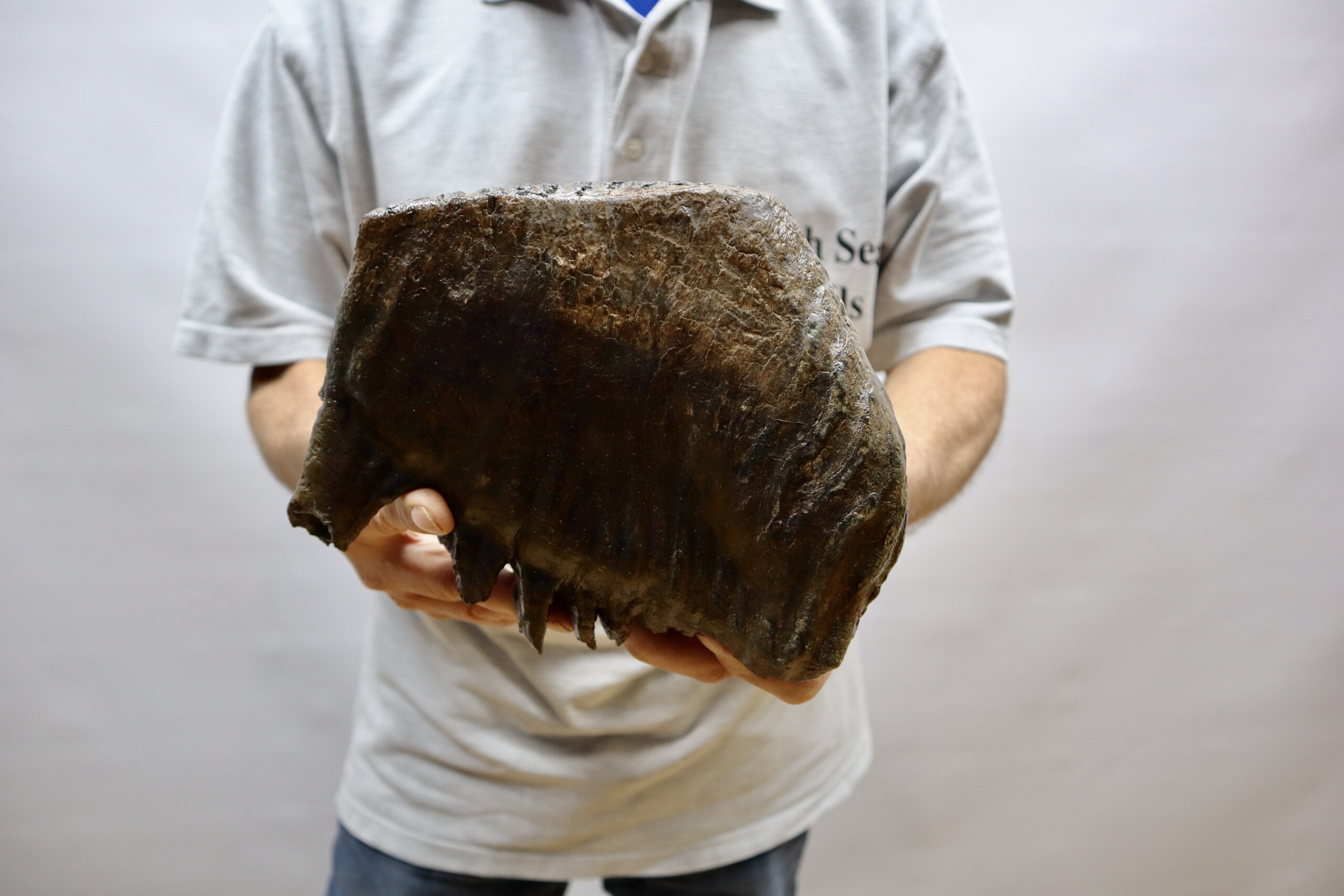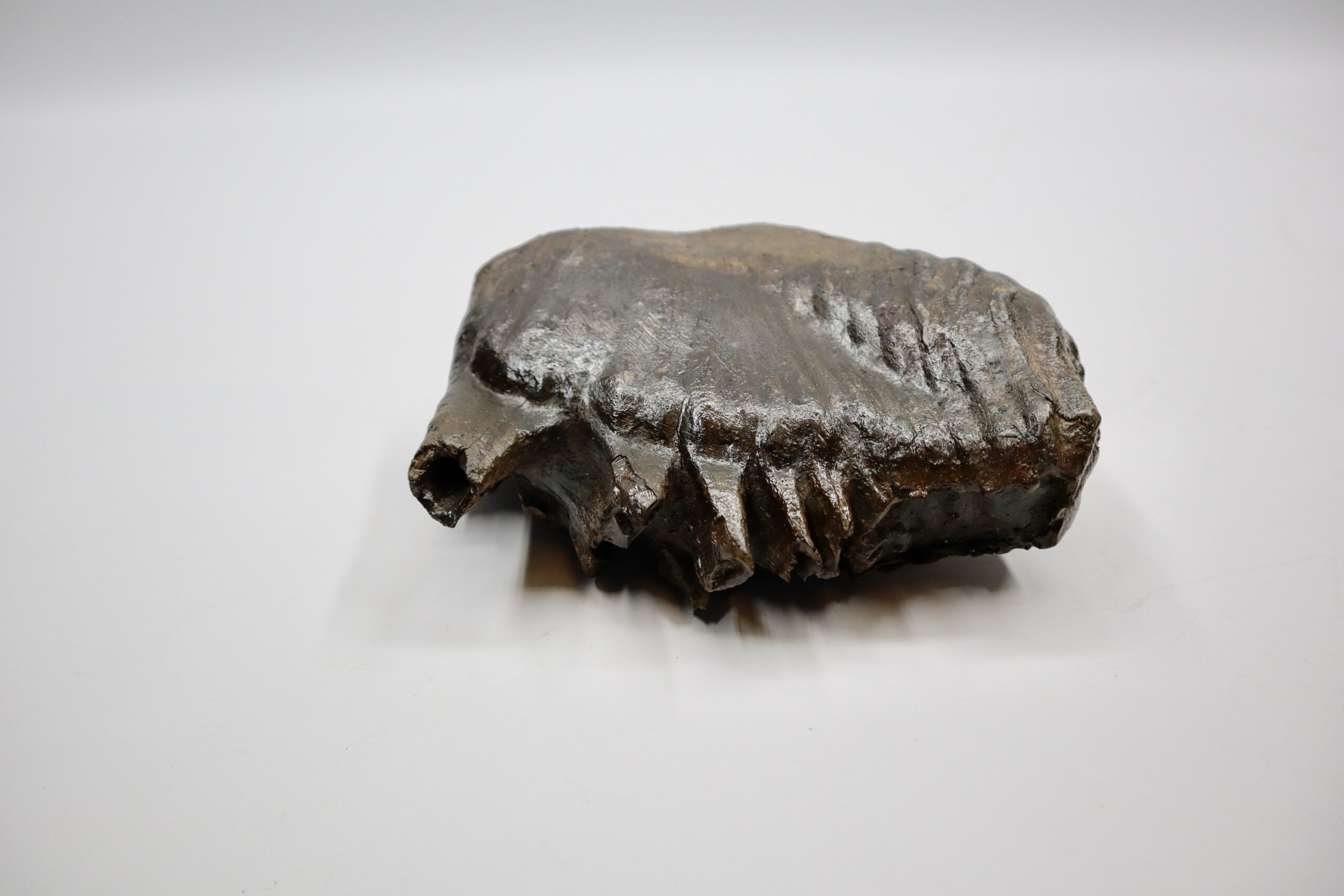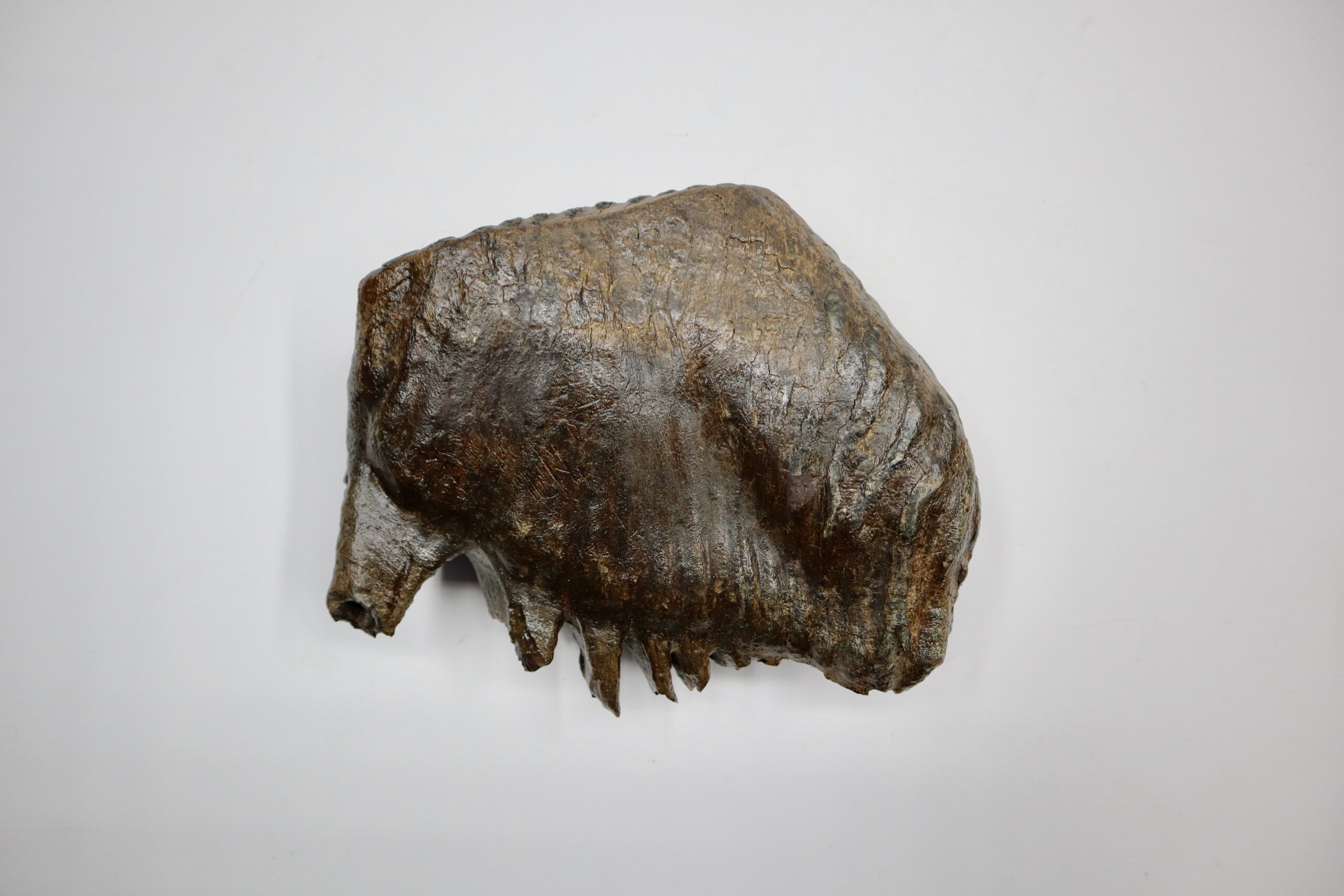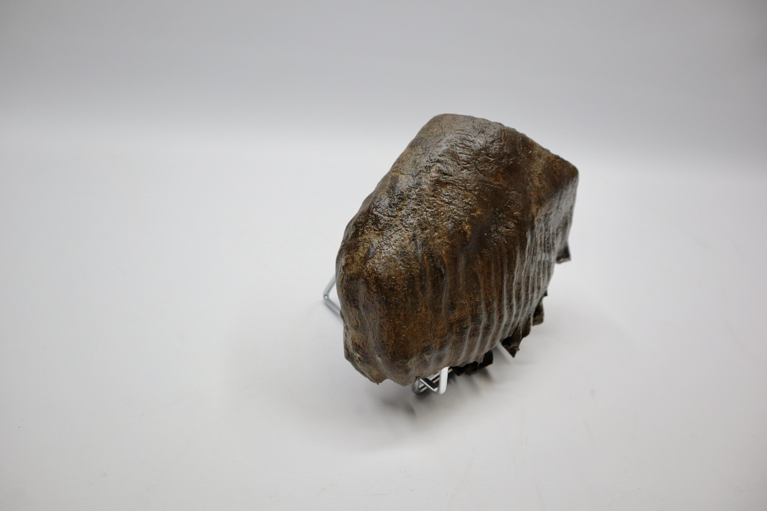 On offer is a superb M3 molar of aย Woolly Mammoth from the Pleistocene era. This molar comes from the left upper jaw and is a beautiful example of a fully grown animal, in fantastic state of preservation and with a beautiful chewing surface as seen in the images. Judging from the size, this belonged to an adult Mammoth. The black and white section of the ruler in the image represents 10 cm / 3.9 inch. No restoration whatsoever.