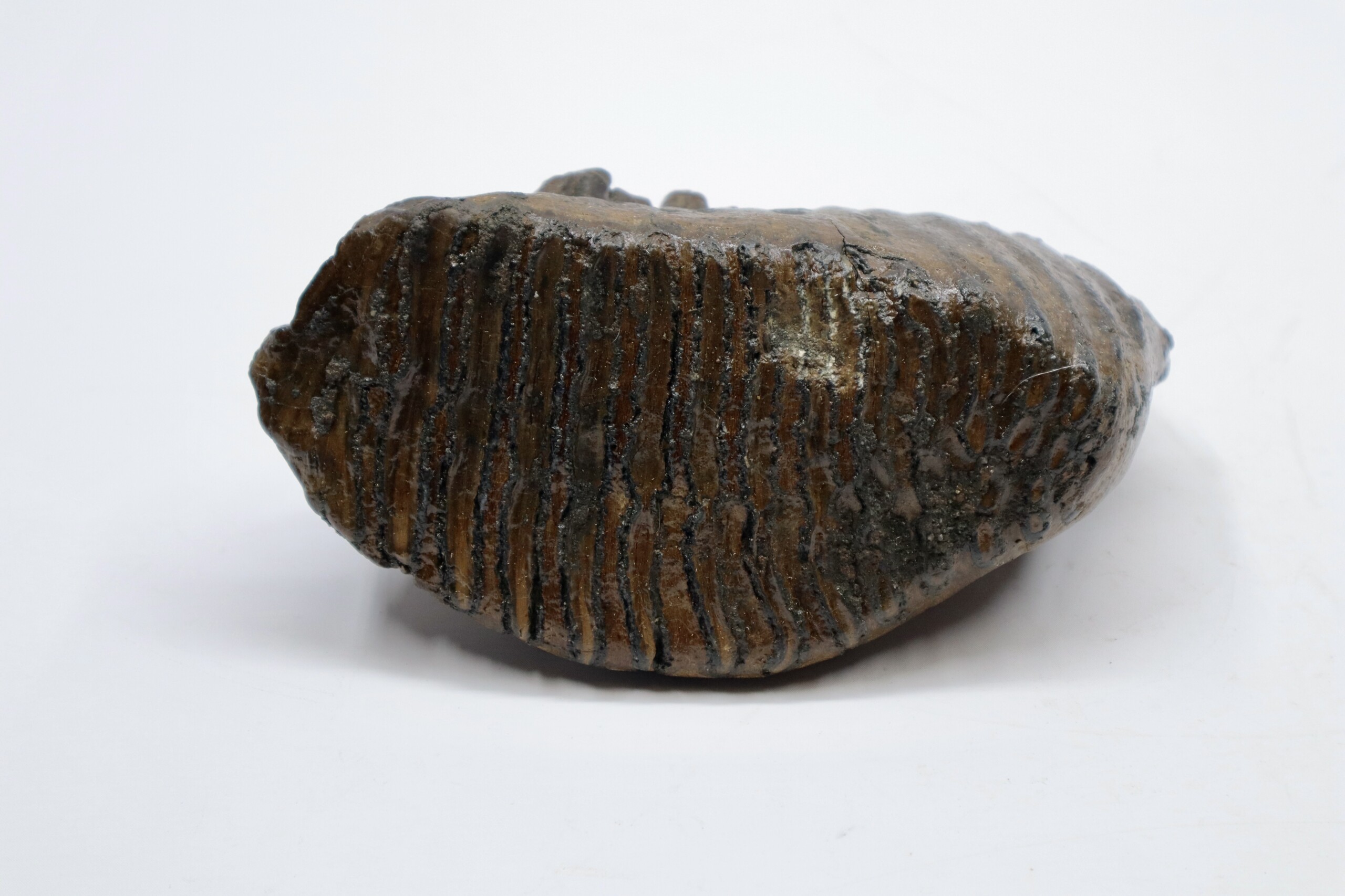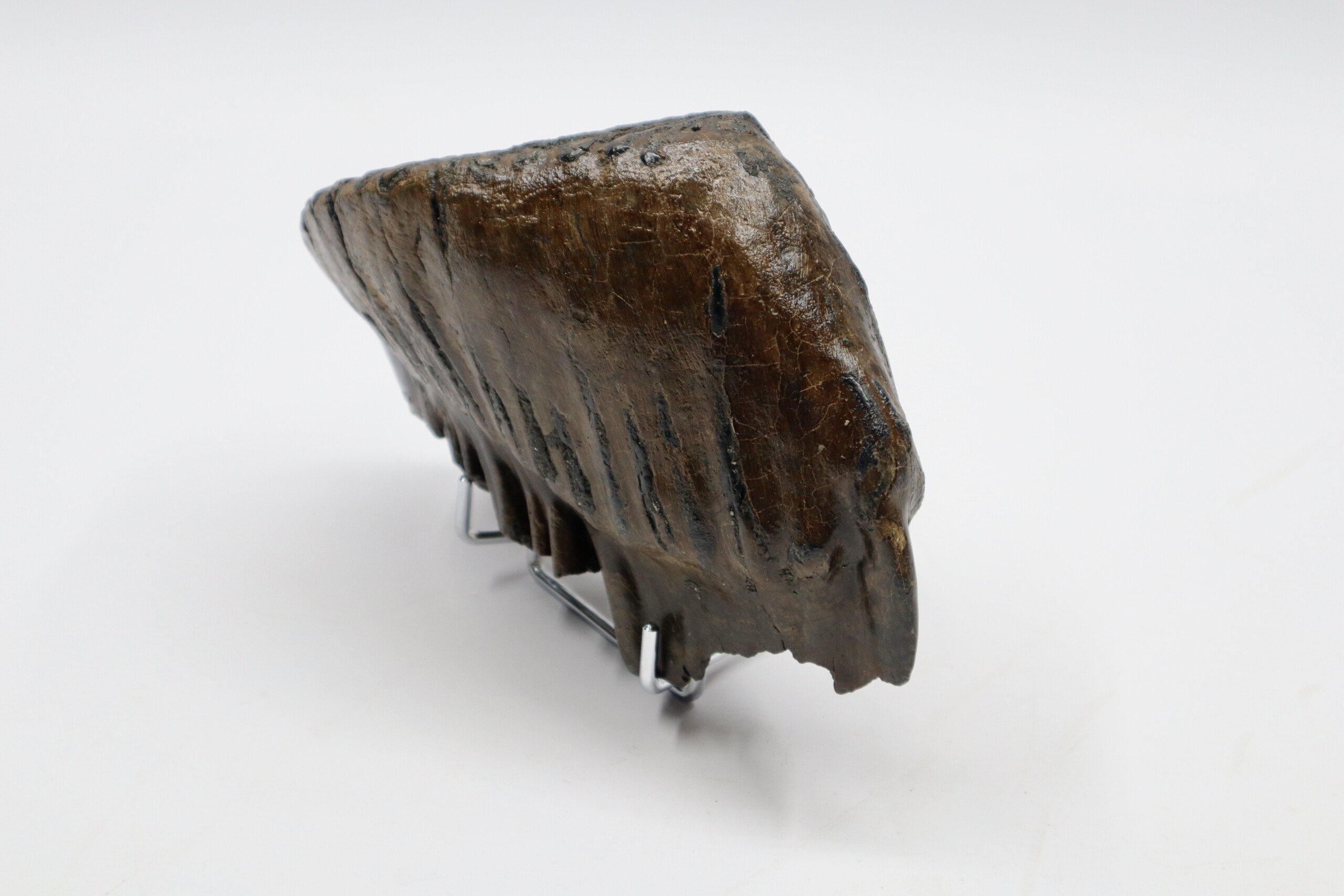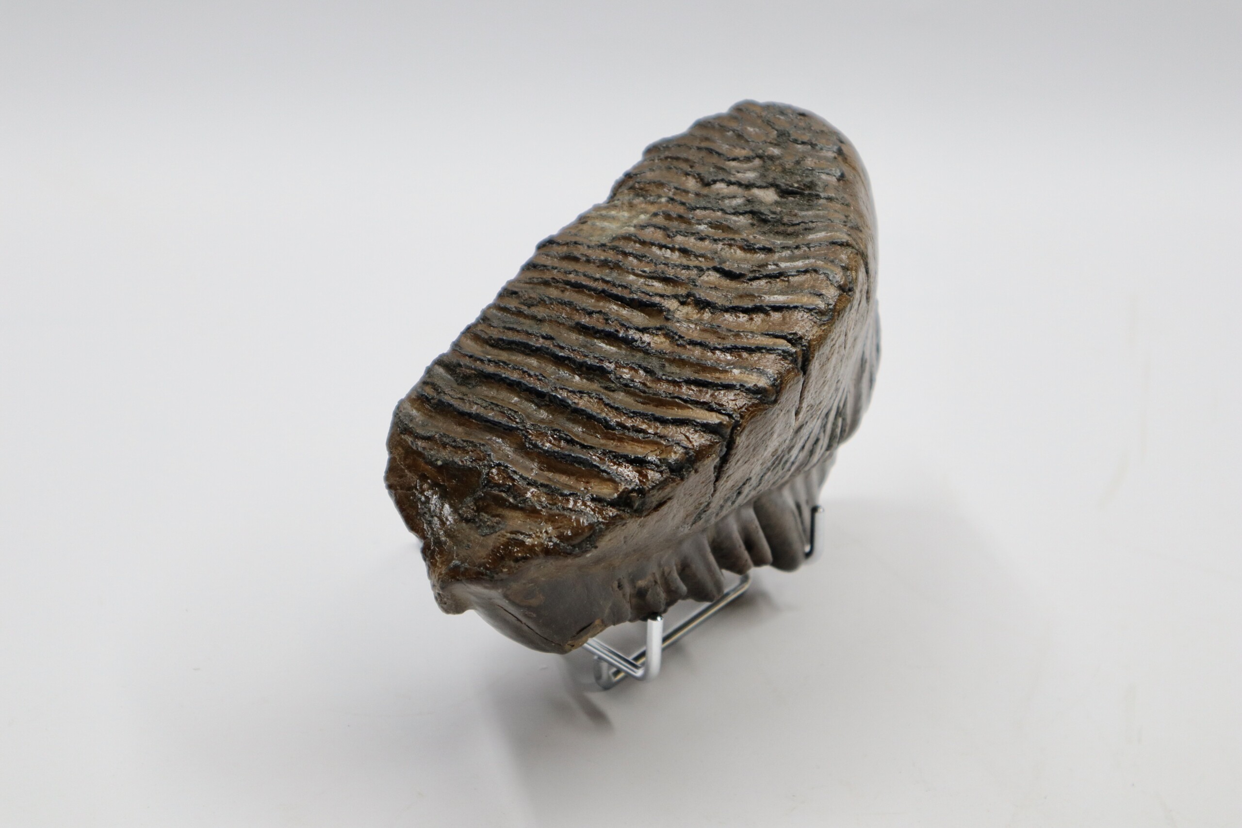 On offer is a superb M3 molar of aย Woolly Mammoth from the Pleistocene era. This molar comes from the right upper jaw and is a beautiful example of a fully grown animal, in fantastic state of preservation and with a beautiful chewing surface as seen in the images. Judging from the size, this belonged to an adult Mammoth. The black and white section of the ruler in the image represents 10 cm / 3.9 inch. No restoration whatsoever.