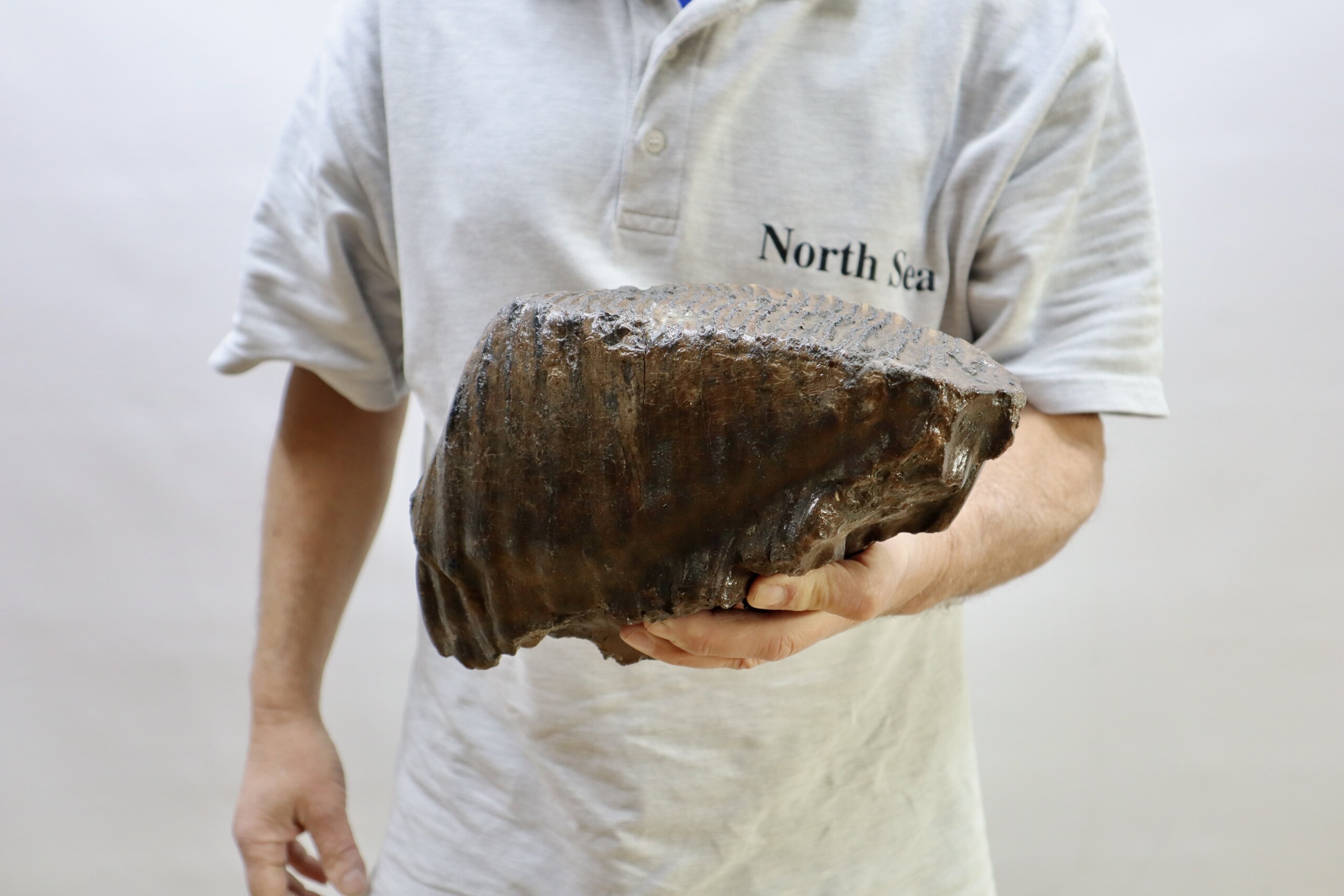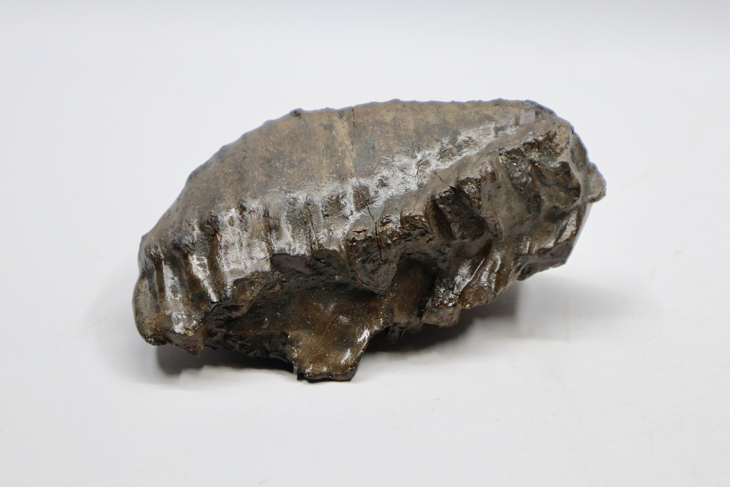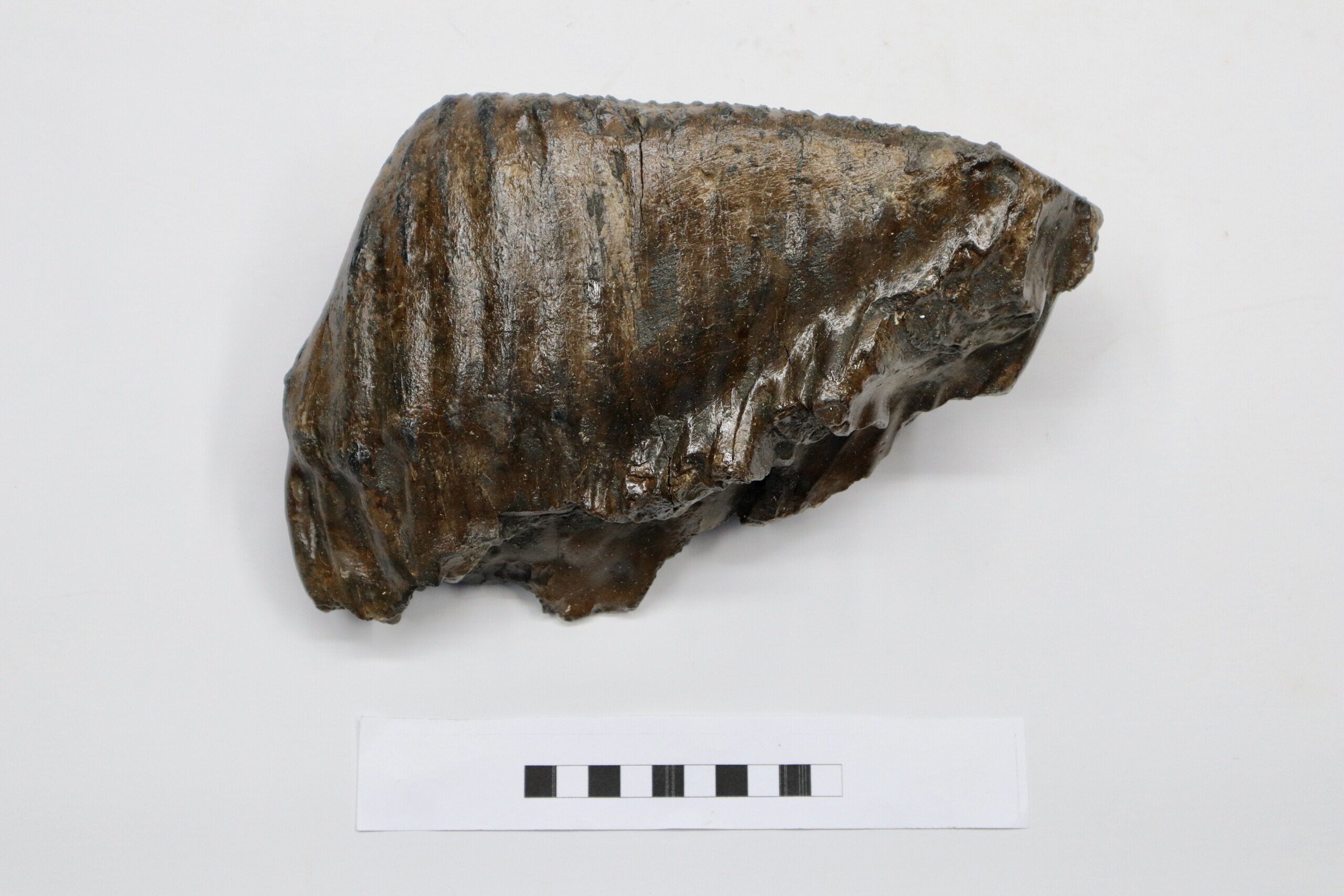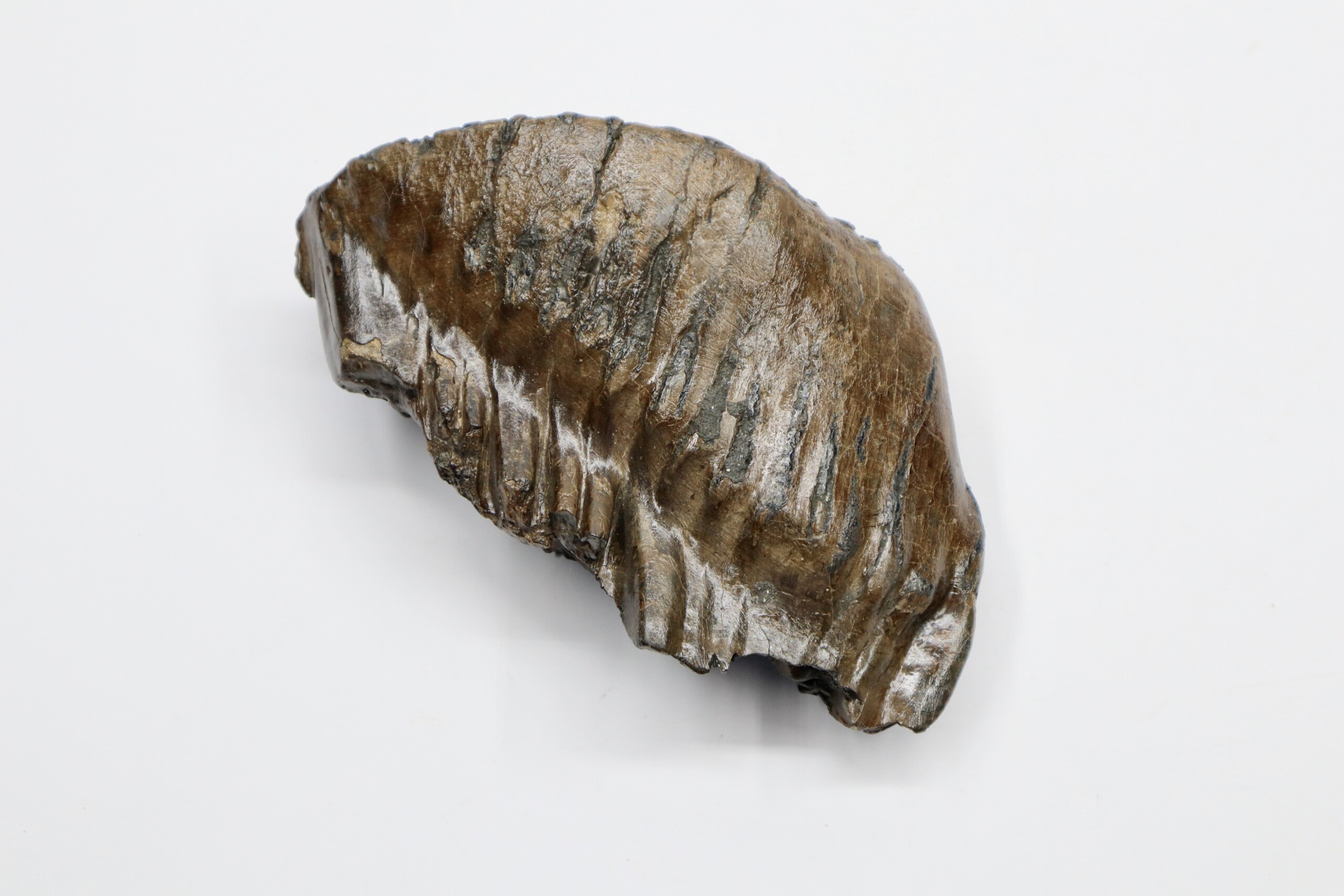 On offer is a superb M3 molar of aย Woolly Mammoth from the Pleistocene era. This molar comes from the right upper jaw and is a beautiful example of a fully grown animal, in fantastic state of preservation and with a beautiful chewing surface as seen in the images. Judging from the size, this belonged to an adult Mammoth. The black and white section of the ruler in the image represents 10 cm / 3.9 inch. No restoration whatsoever.