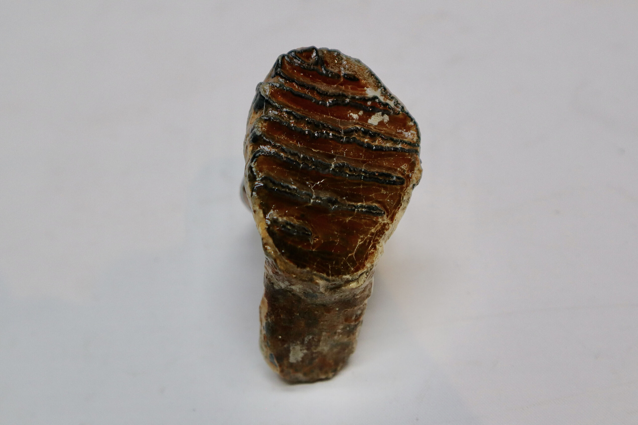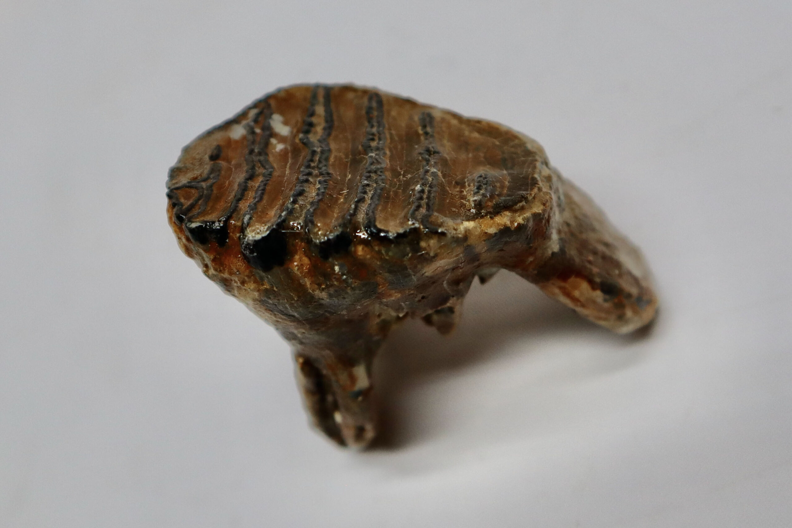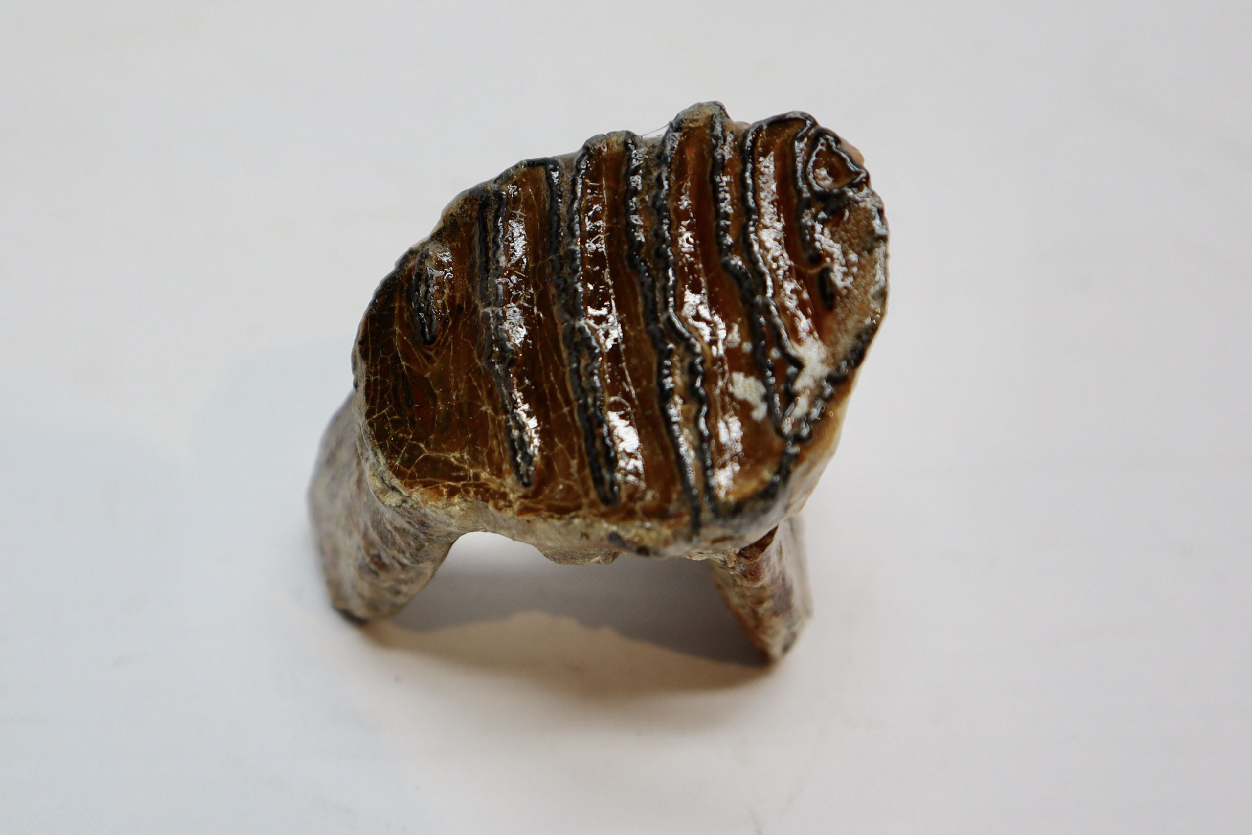 On offer is a superb and very rare P3 molar of a juvenile Woolly Mammoth from the Pleistocene era. This molar comes from the upper jaw. This molar is in beautiful state of preservation and with a good chewing surface, as seen in the images. No restoration whatsoever. The black and white section of the ruler in the image represents 10 cm (3.9 inch).