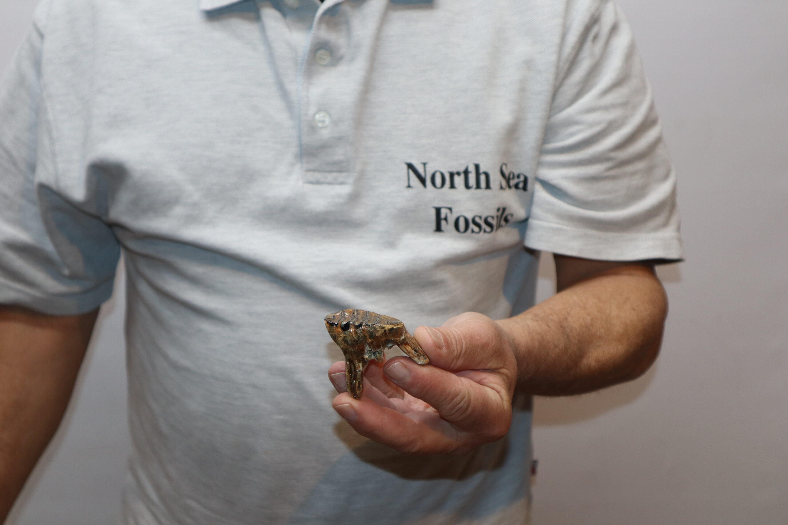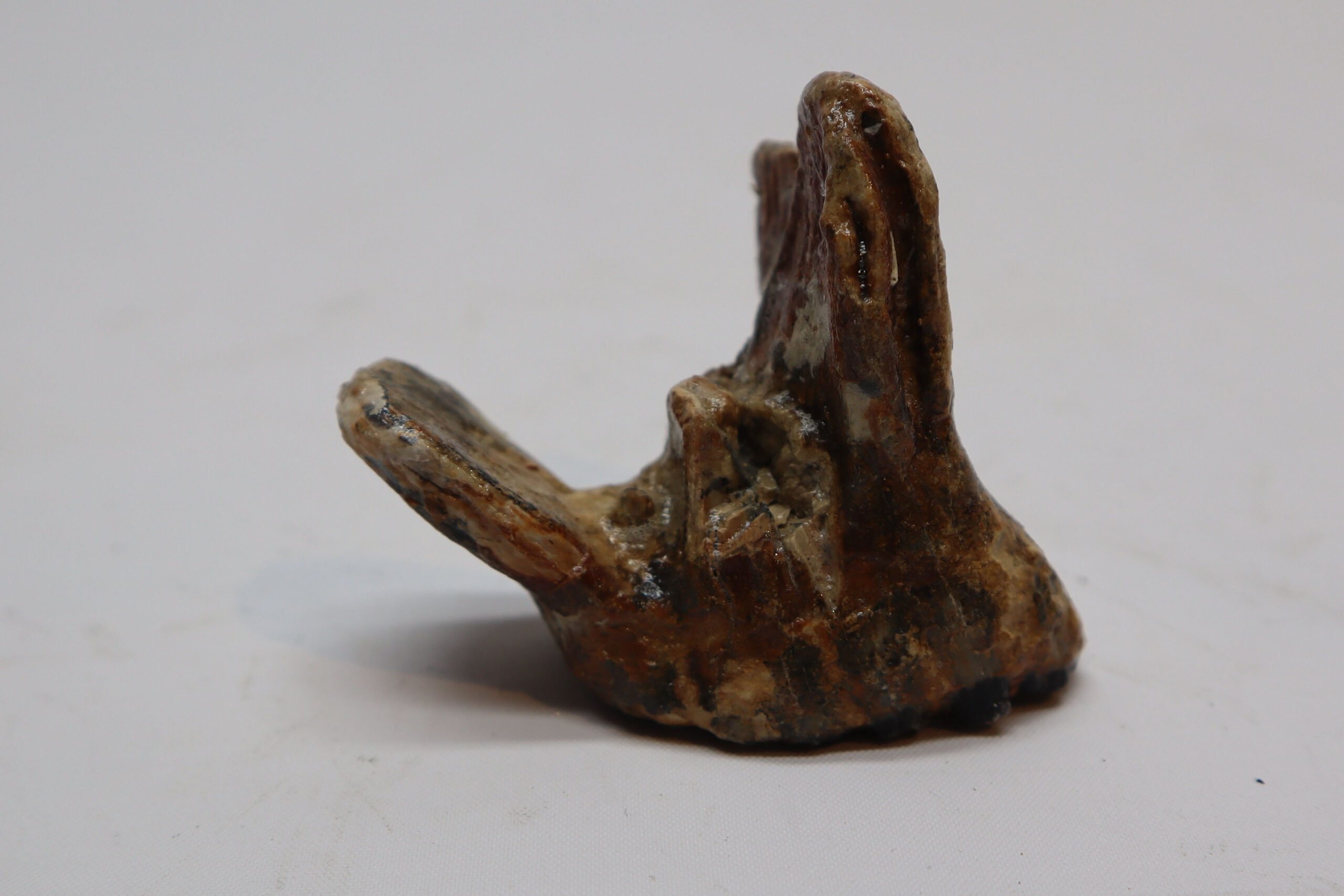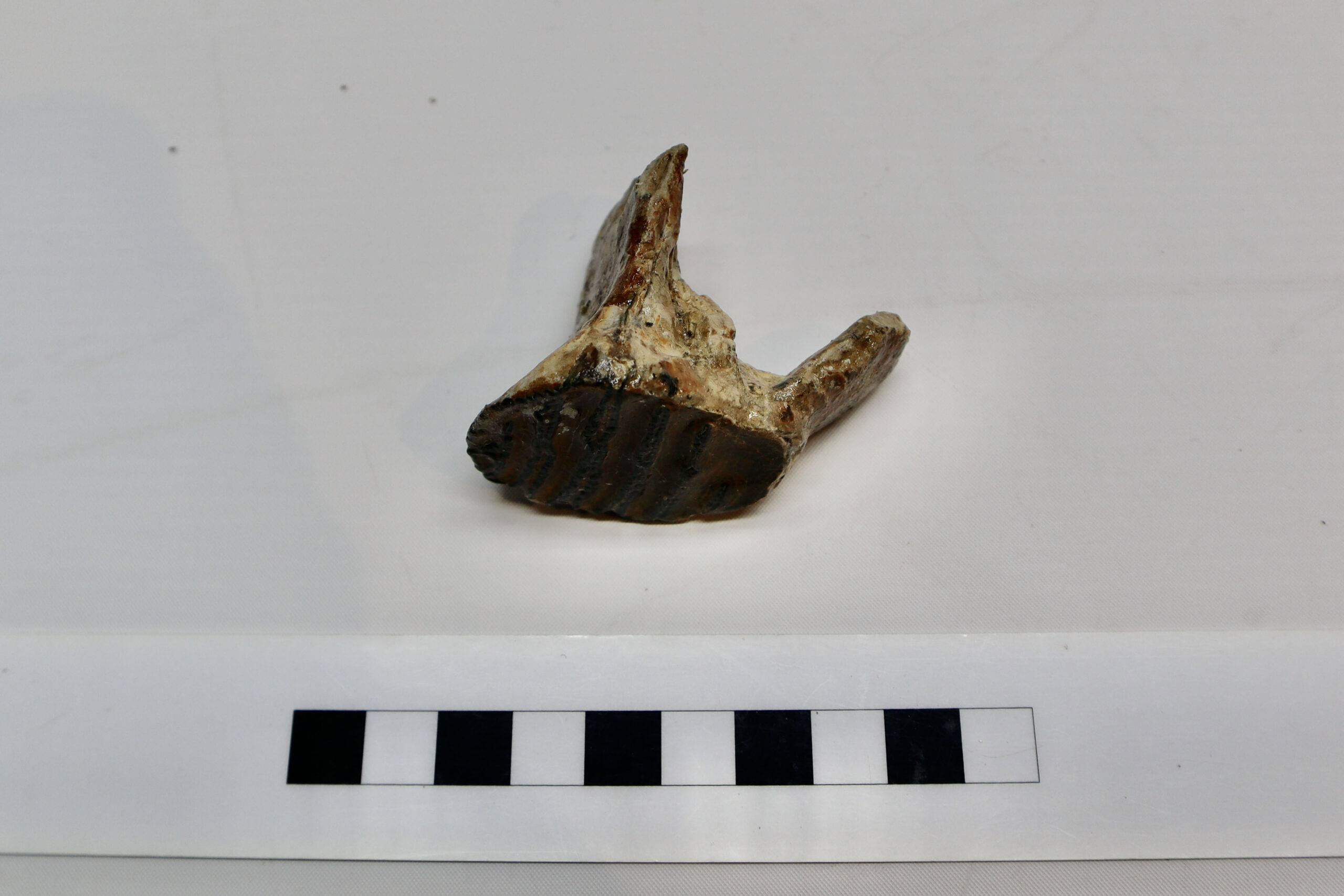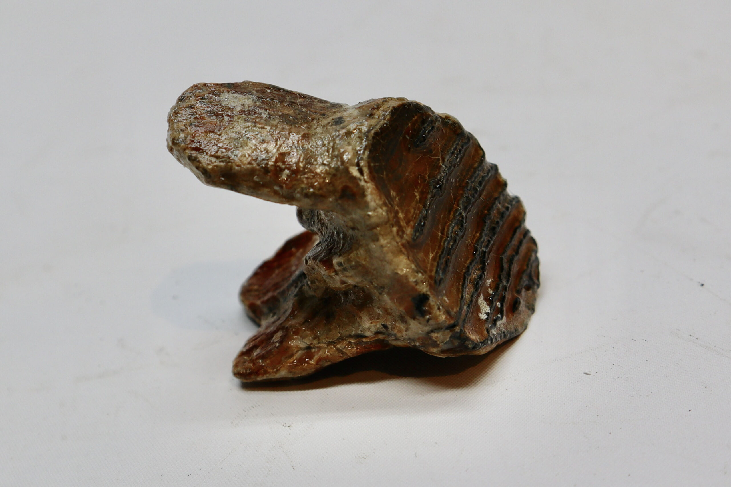 On offer is a superb and very rare P3 molar of a juvenile Woolly Mammoth from the Pleistocene era. This molar comes from the upper jaw. This molar is in beautiful state of preservation and with a good chewing surface, as seen in the images. No restoration whatsoever. The black and white section of the ruler in the image represents 10 cm (3.9 inch).