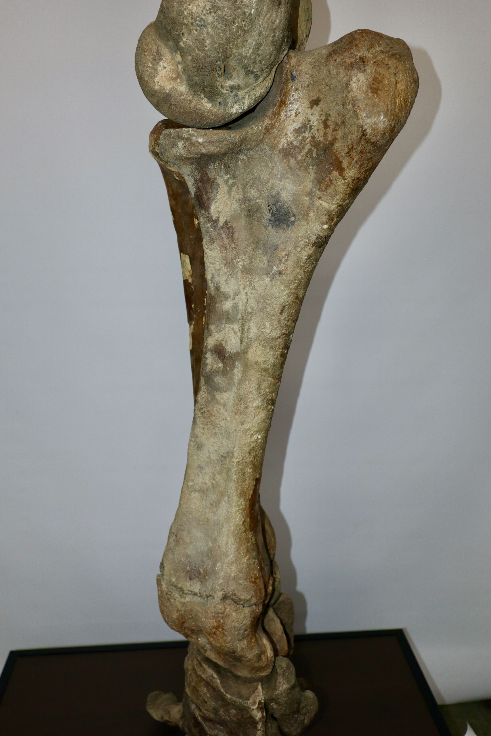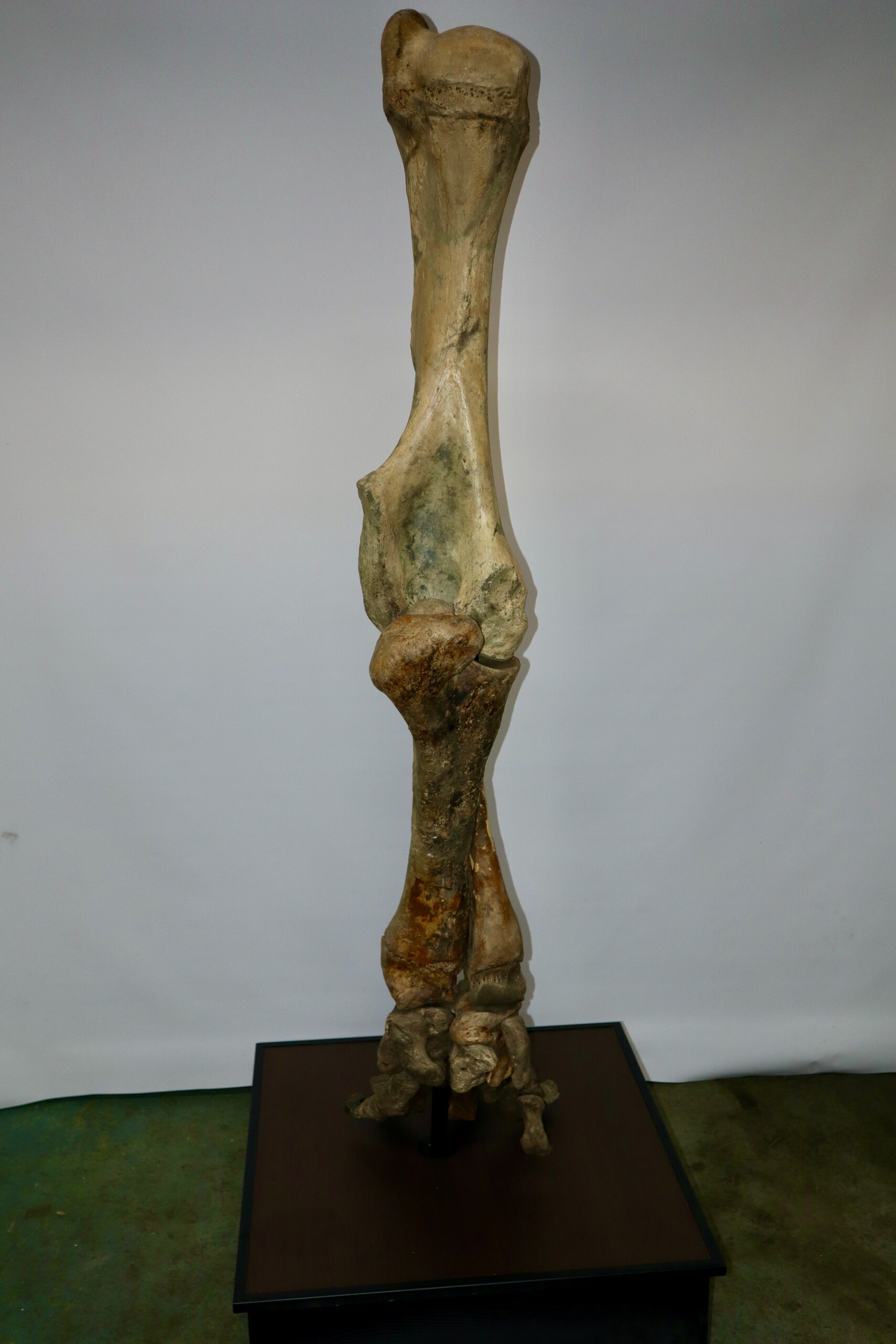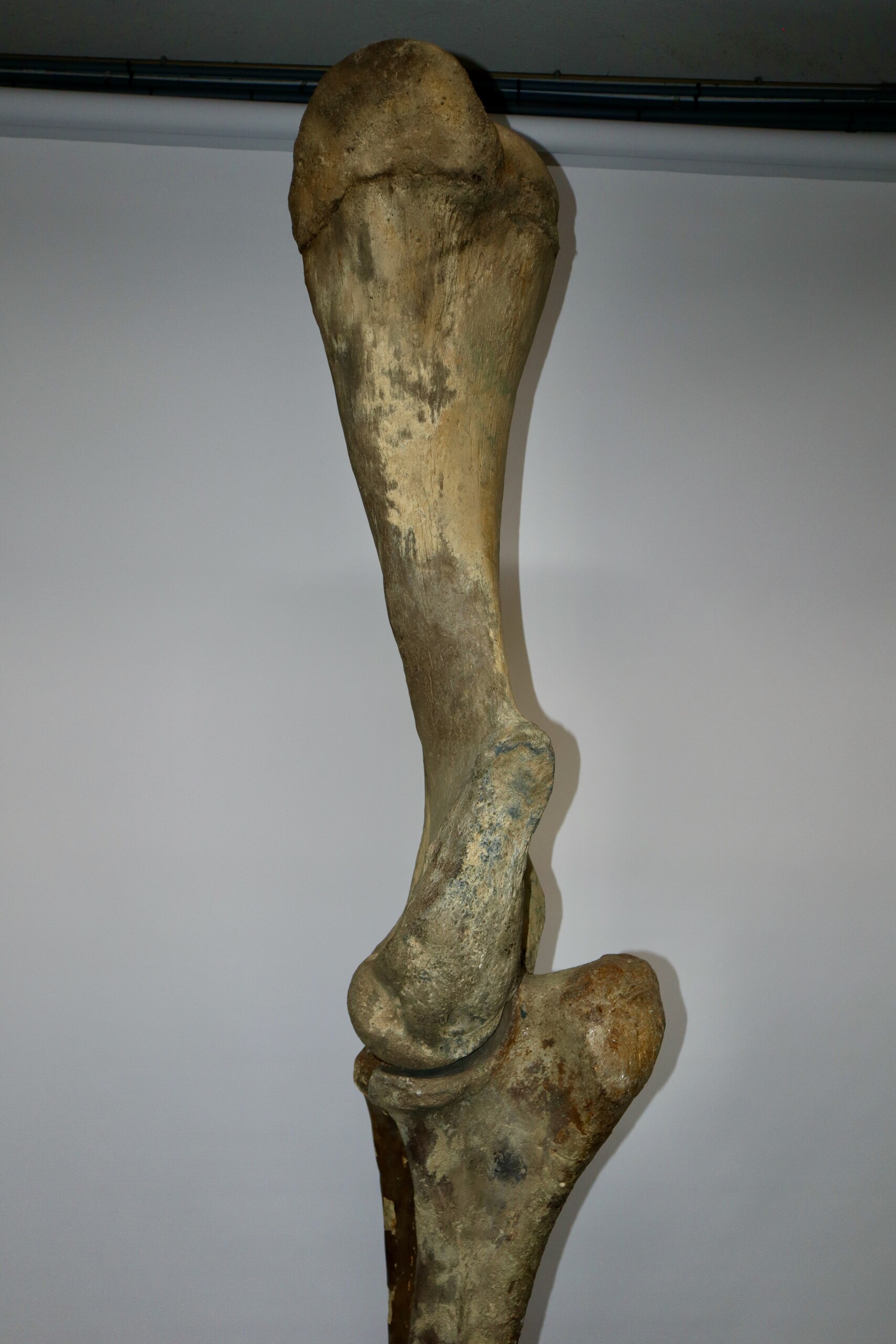 We are proud to present this exceptionally large and fantastic composite fore leg of a very large alpha male Woolly Mammoth from the Pleistocene era. The composite fore limb consisits of a humerus, a radius/ulna and the manus (hand). All skeletal elements used are original, though found in different places and originally belonging to different but similar animals. Certain missing pieces and areas have been professionally restored with resin casts (see condition chart, last image).