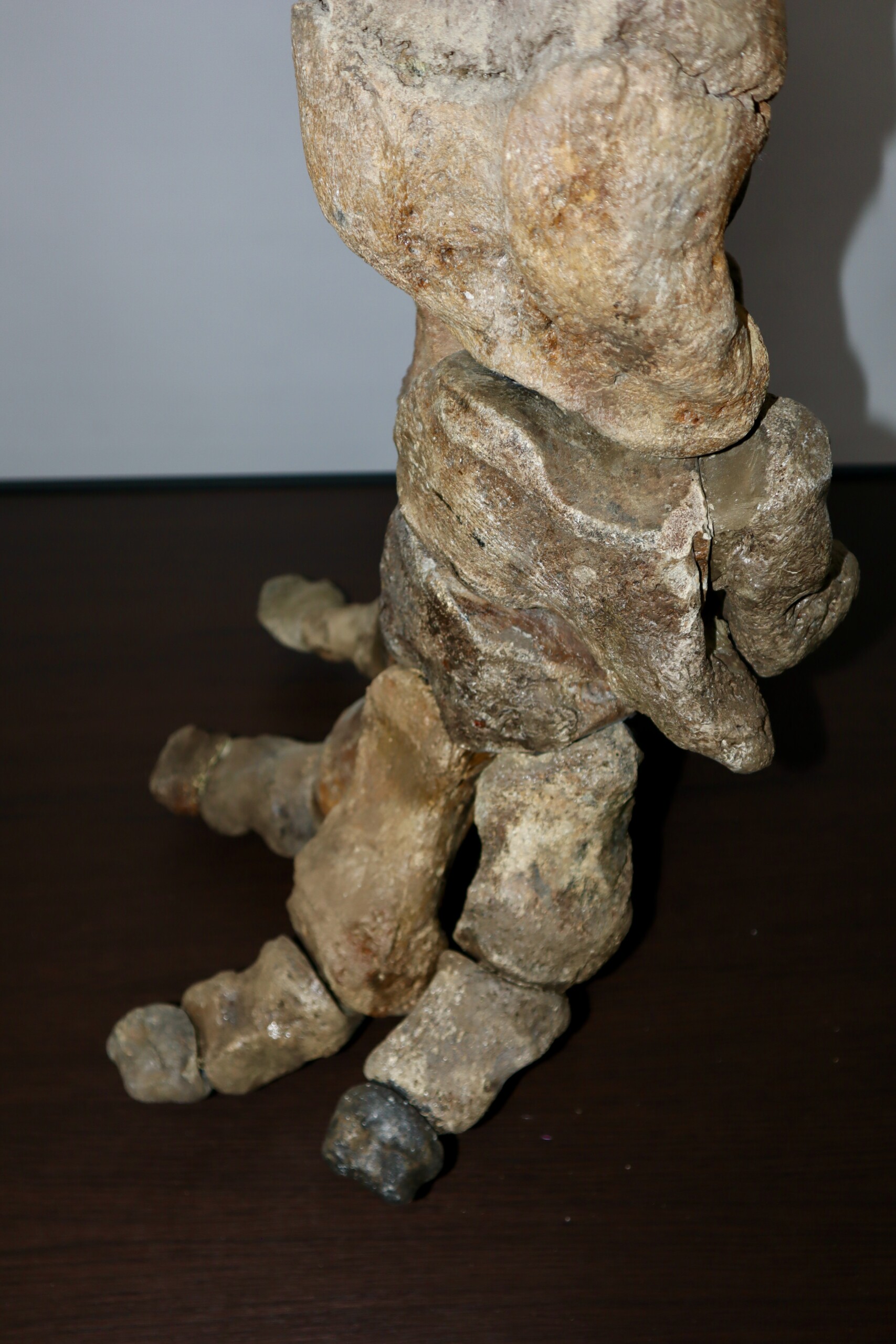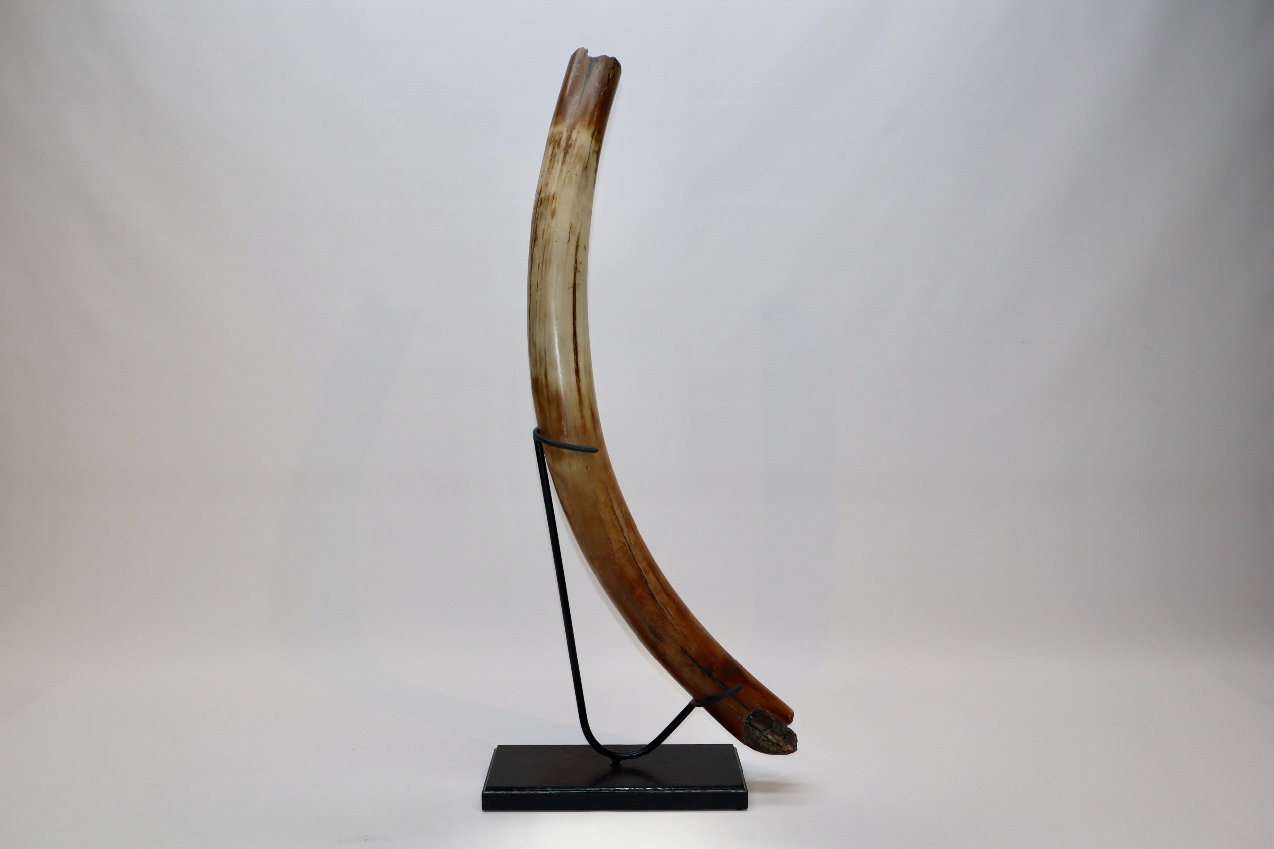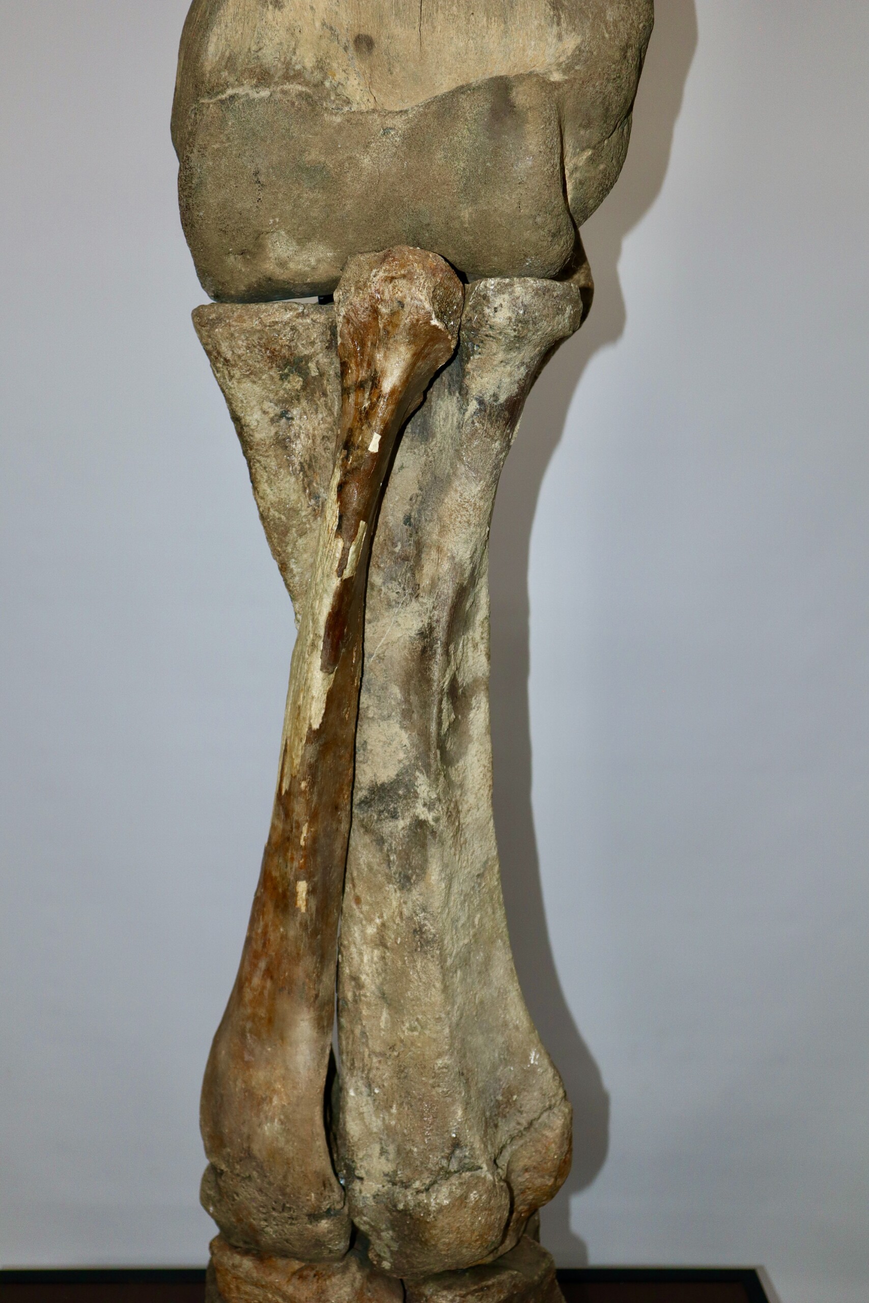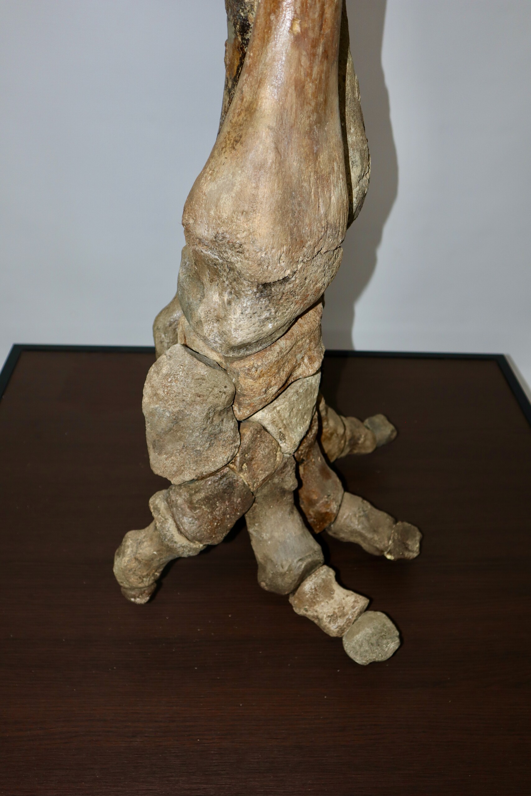 We are proud to present this exceptionally large and fantastic composite fore leg of a very large alpha male Woolly Mammoth from the Pleistocene era. The composite fore limb consisits of a humerus, a radius/ulna and the manus (hand). All skeletal elements used are original, though found in different places and originally belonging to different but similar animals. Certain missing pieces and areas have been professionally restored with resin casts (see condition chart, last image).