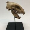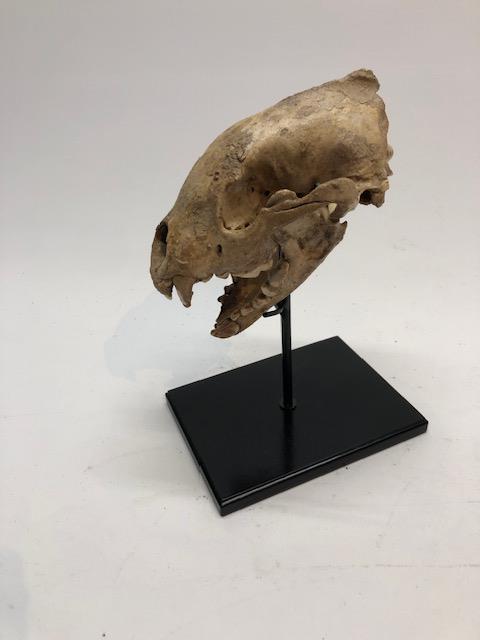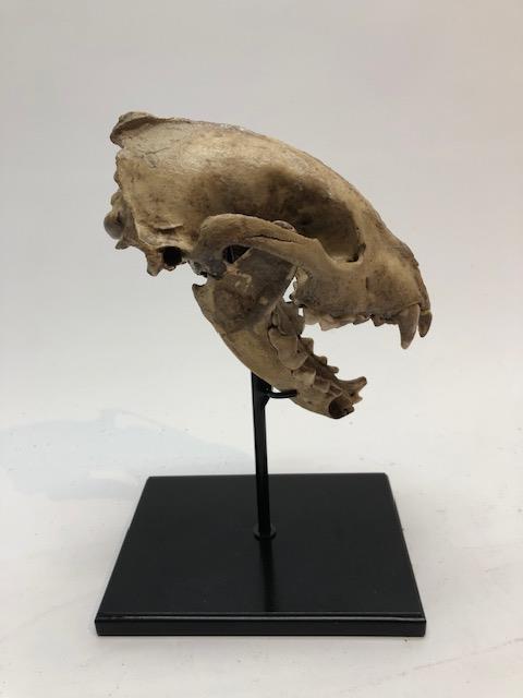 On offer is an exceptionally rare and very beautiful skull with lower jaw of a European wolverine (Gulo gulo) from the Pleistocene era. The Gulo gulo wolverine or glutton was the largest terrestrial mustelid, belonging to the order of Carnivores, dating from the late middle Pliocene. We cannot stress enough how rare fossils of this interesting species are. These fossils belonged to an adult animal and are exceptionally rare and very beautifully preserved: there is one incisor missing on the right side, but otherwise it is in fantastic state of preservation, with many details of anatomy beautifully preserved, as seen in the images. No restoration whatsoever. Very rare piece, wonderful for the specialized collector or for university or museum collections The black-and-white section of the ruler in the image represents 10 cm / 3.9 inch. Presented on a custom-made metal stand with black finish and ready to display.