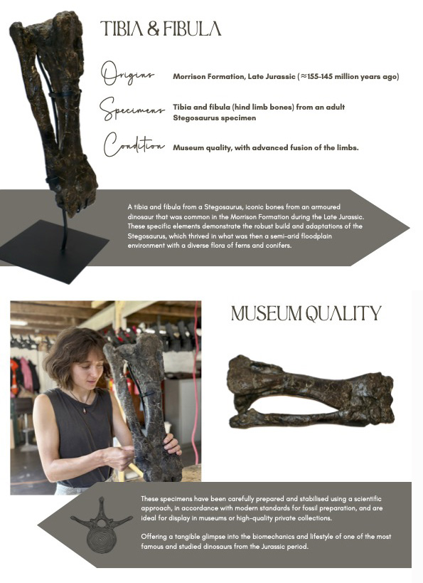 This is a museum-quality specimen, with advanced fusion of the limbs. These iconic bones belonged to an armoured dinosaur that was common in the Morrison Formation during the late Jurassic period, approximately 145-155 million years ago. These specific elements demonstrate the robust build and adaptations of the Stegosaurus, which thrived in what was then a semi-arid floodplain environment with a diverse flora of ferns and conifers.