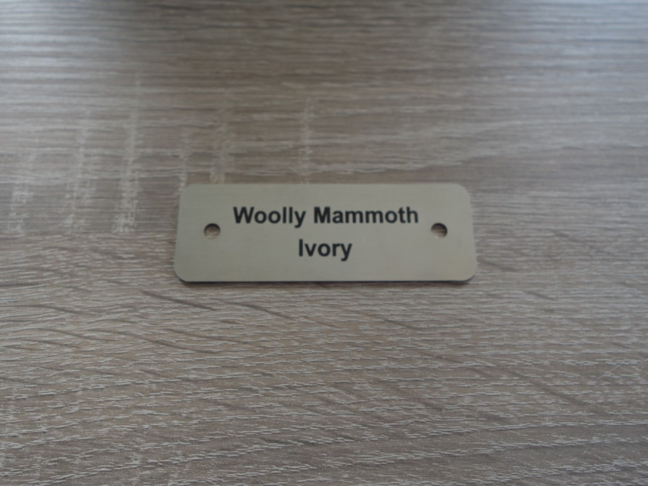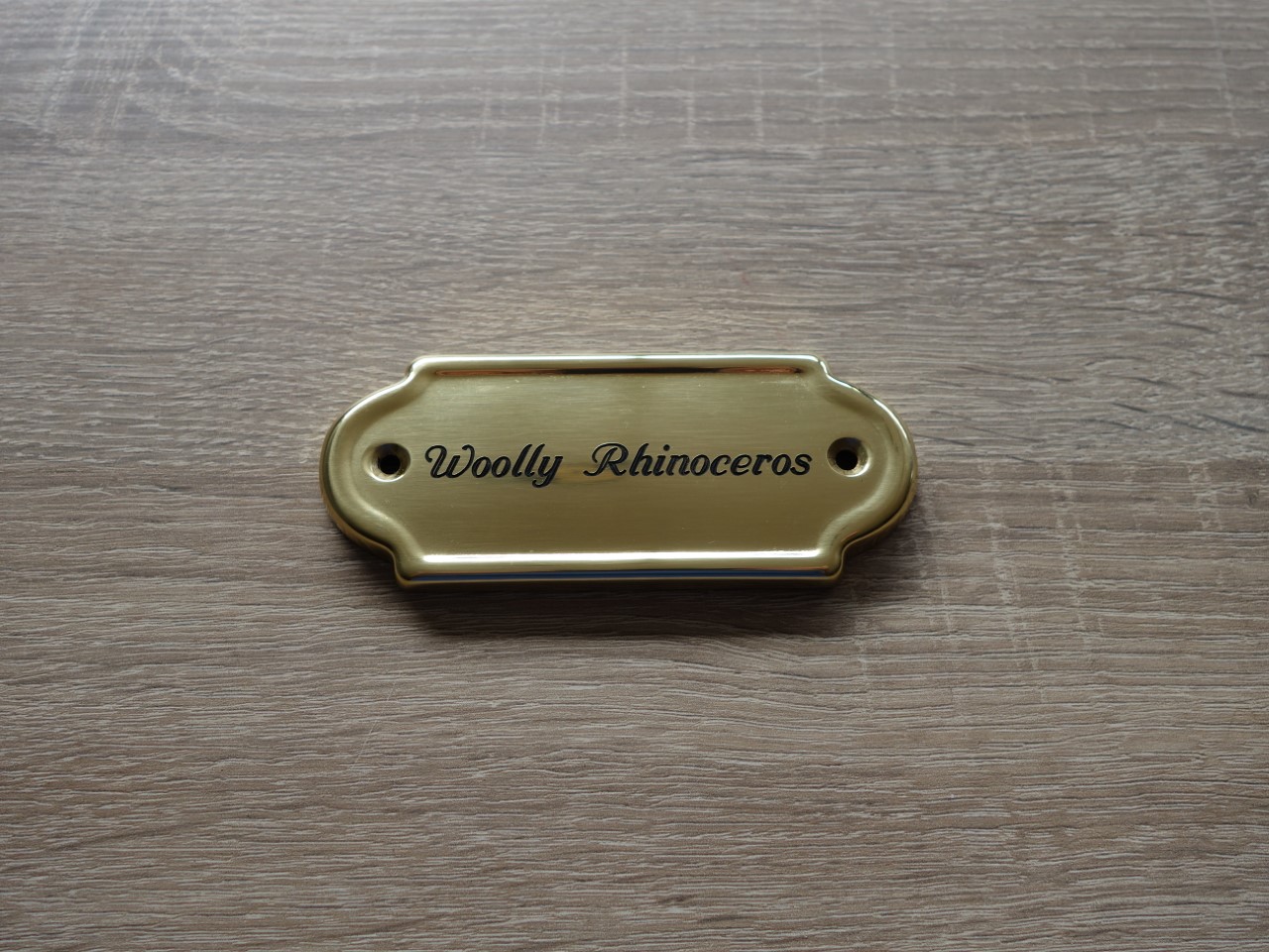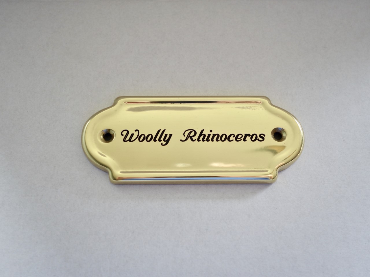 We can supply these custom-made brass plaques to various designs, both classical and contemporary, and in various fonts. A text can be engraved upon them exactly according to your wishes and specifications. They are especially suitable to be affixed to wooden stands, or to sit alongside fossils in showcases. They make each fossil into a museum piece and are wonderful to record and convey information.